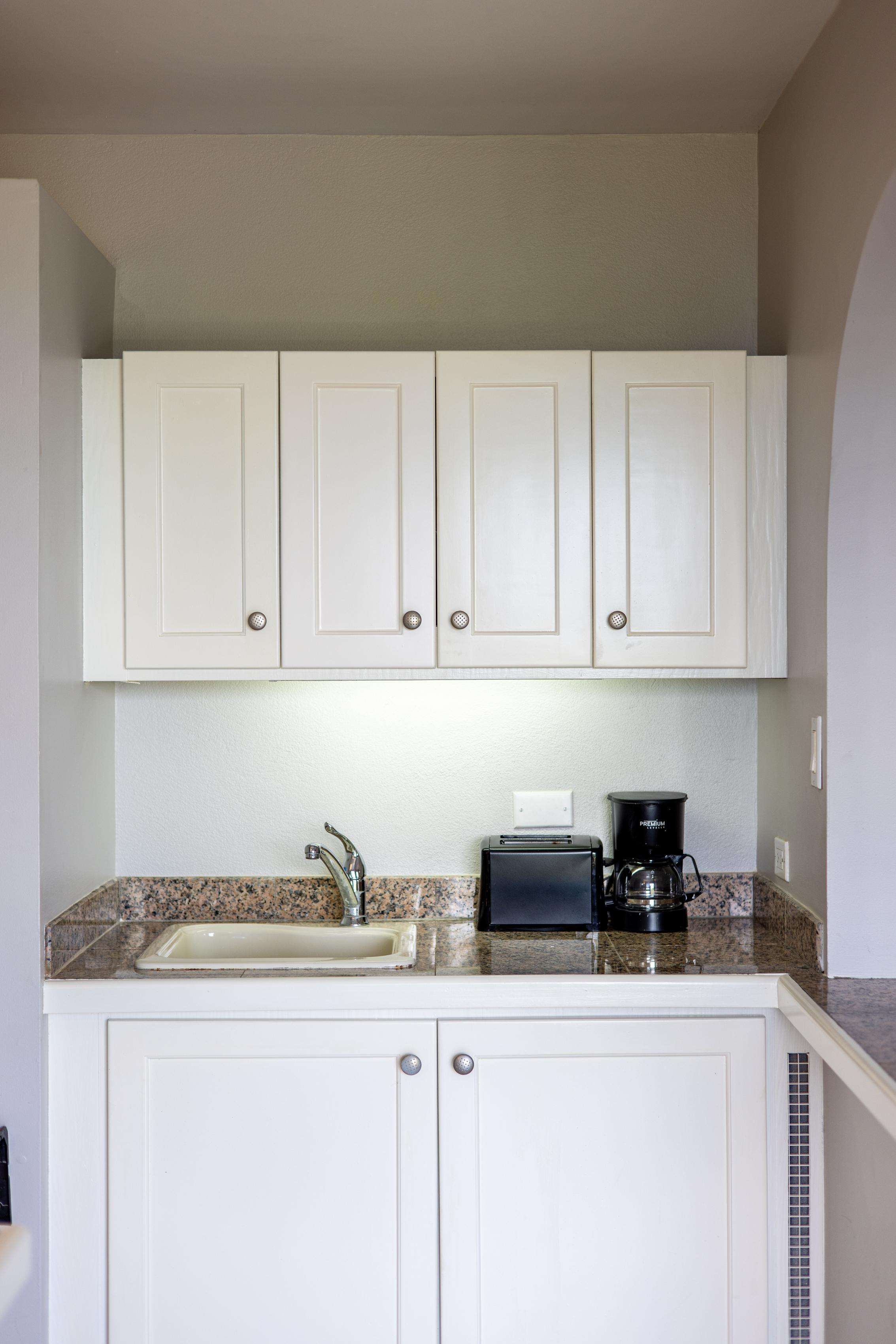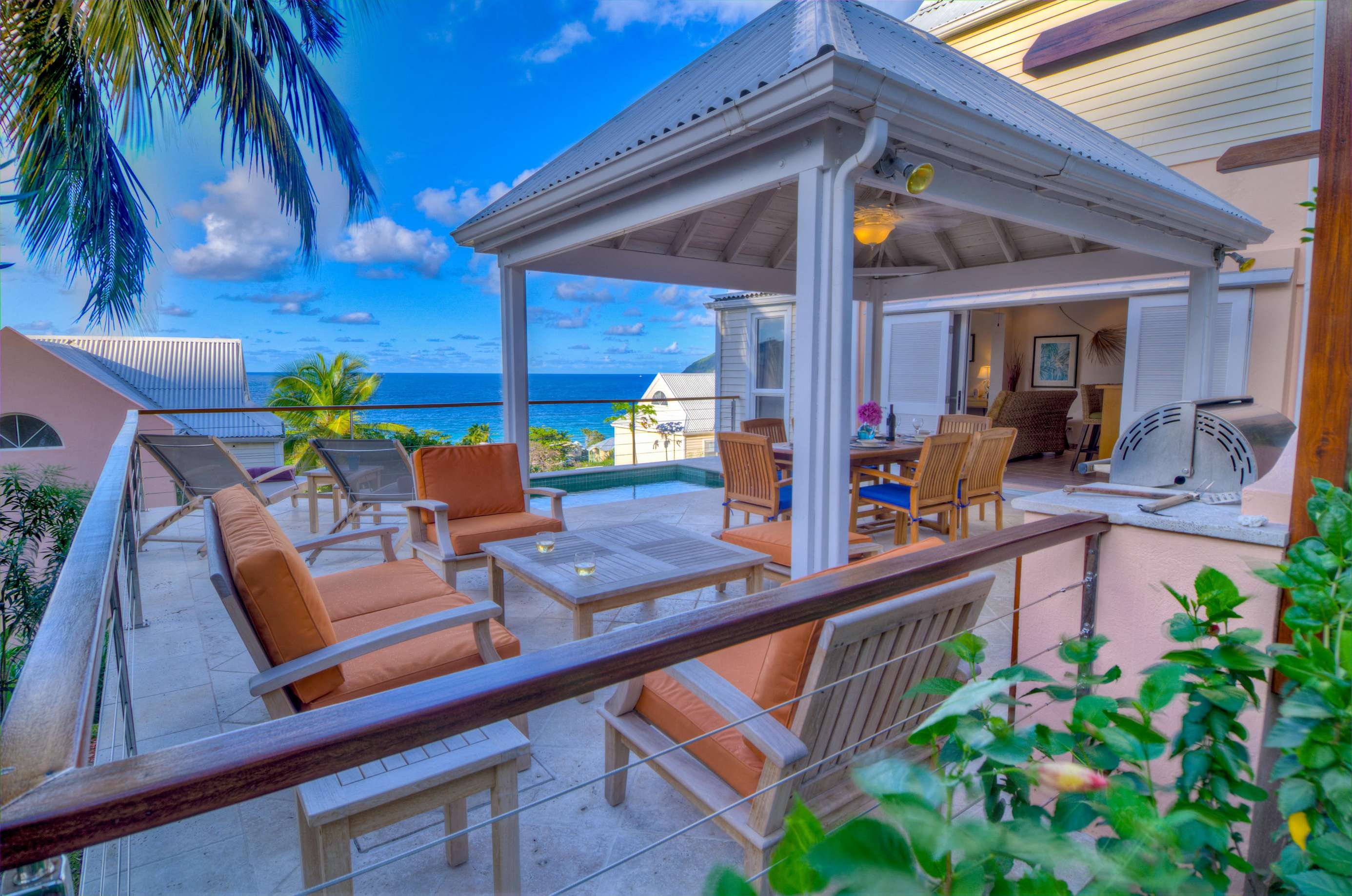 On the Ground floor, you’ll find an airy open-plan kitchen and living room filled with sunlight and comfortable Caribbean furnishings. They’re only separated by a sociable breakfast bar and island, perfect for chatting whilst preparing meals. The well-equipped kitchen area has all the essentials for self-catering (note there is cooktop only, no oven). The living room offers comfortable seating for those moments of downtime, ample work space and, if you can bear to tear your eyes away from the glistening ocean view, SmartTV with FLOW cable and hi-speed WIFI.