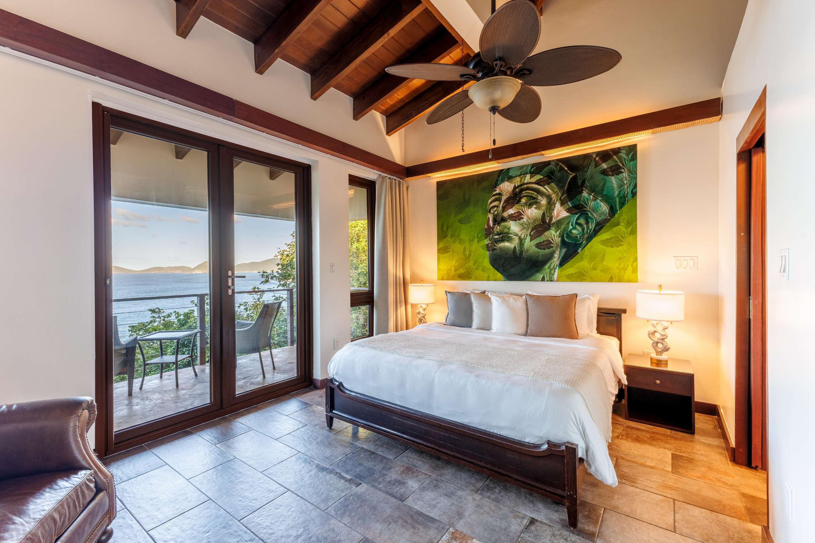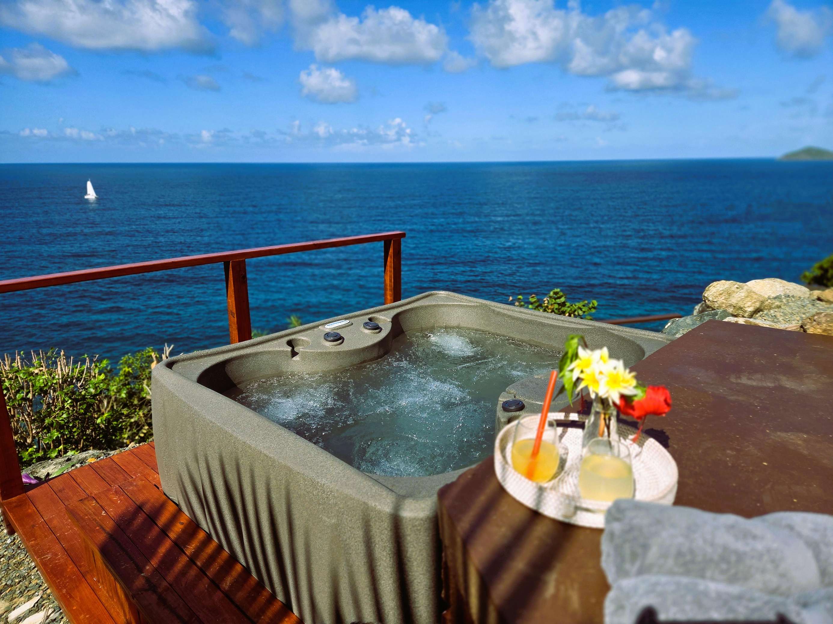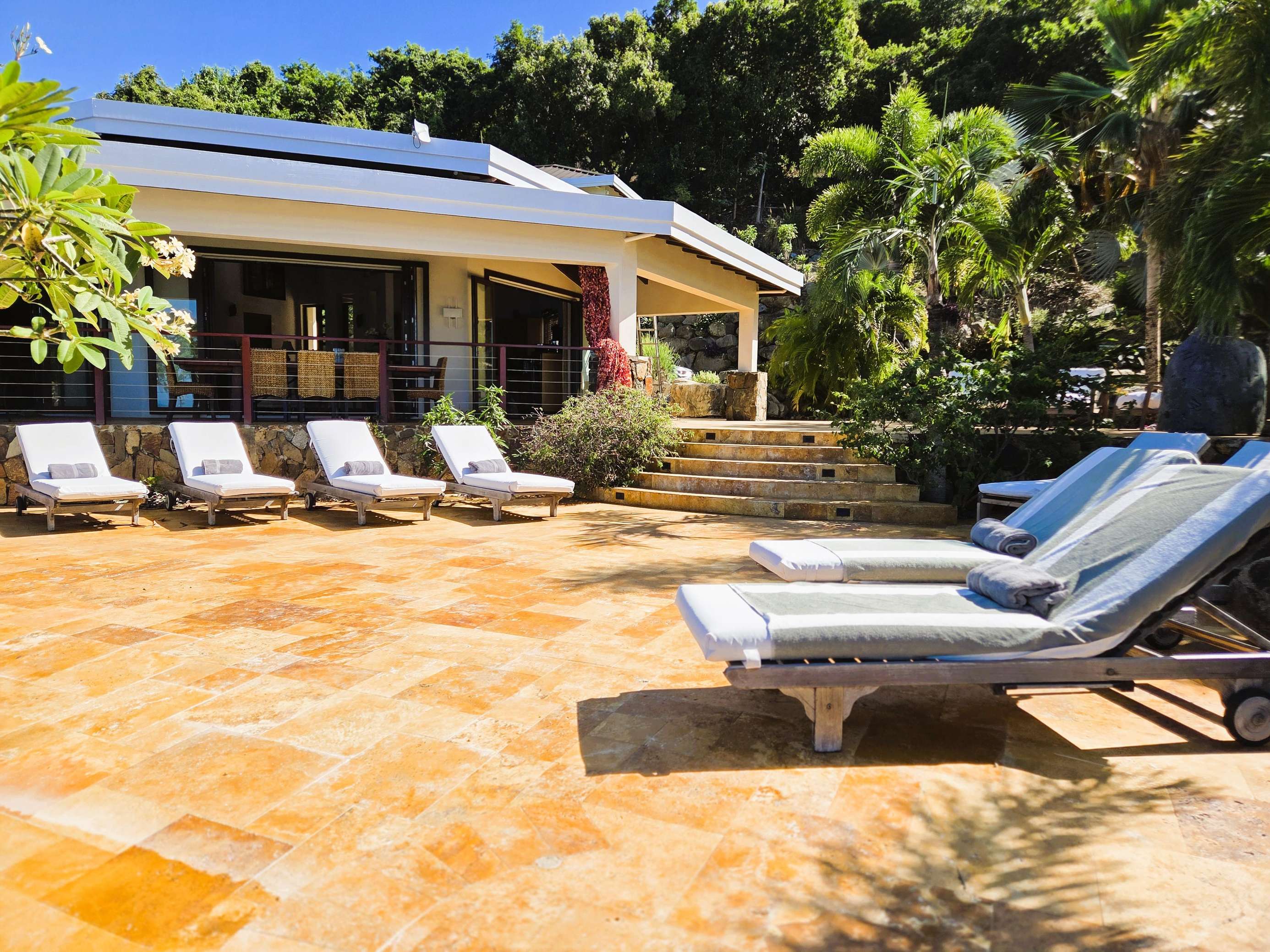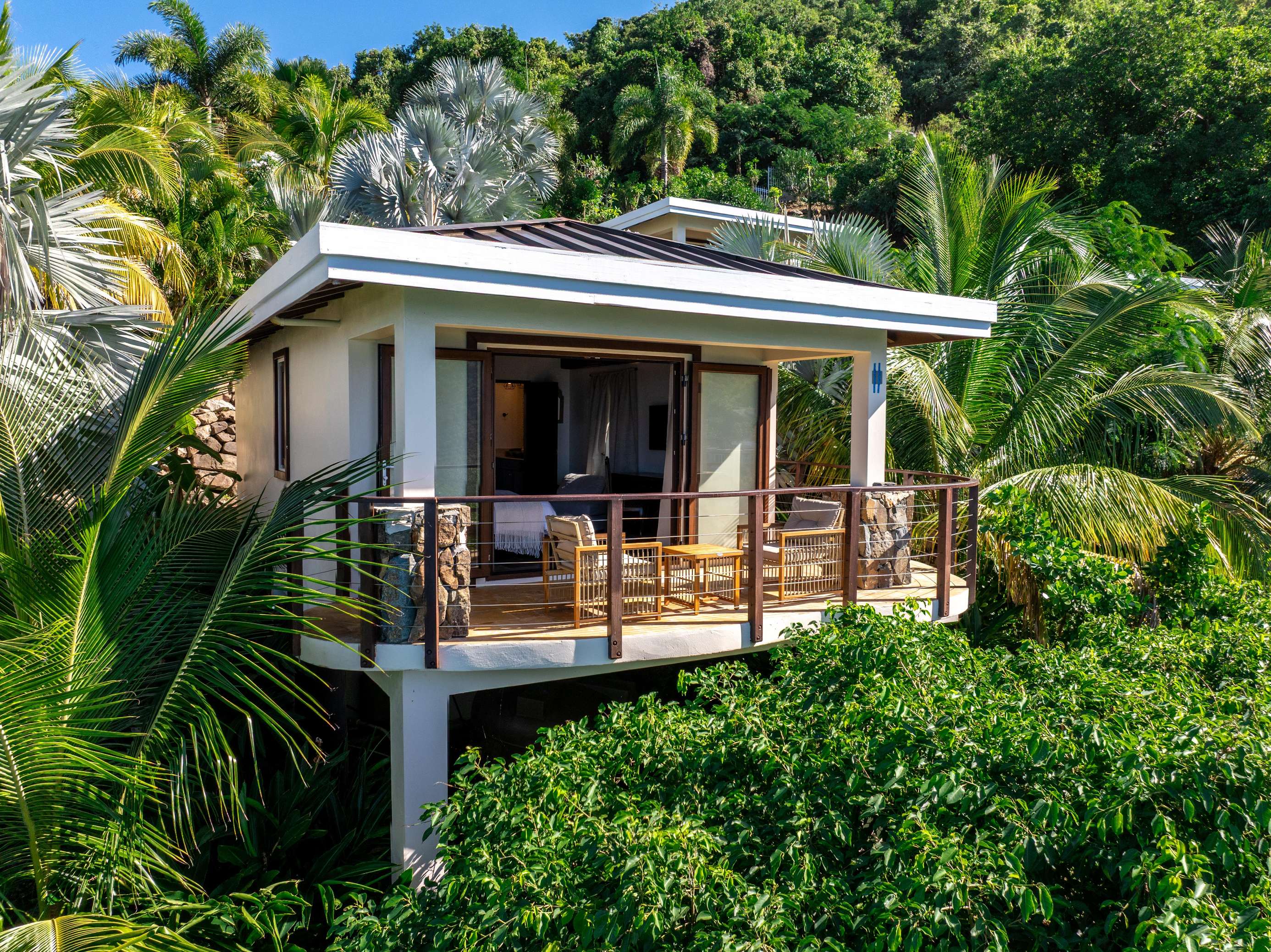 4, 5 & 6) The remaining 3 bedrooms are in separate bungalows. They are named after the the night sky that is so clear and bright in BVI – Jupiter, Venus and Neptune. Each bungalow is a private oasis, with their own private deck, indoor and outdoor shower, en suite bathroom, wardrobe, safe, mini-fridge, and tea, and coffee tray. All three bungalows have king-sized beds and 2/3 can be made up as twins. Theres’s also an additional option to use the fold-out chair to sleep a child in each bungalow. (Max occupancy 12 adults + 2 children under 12)