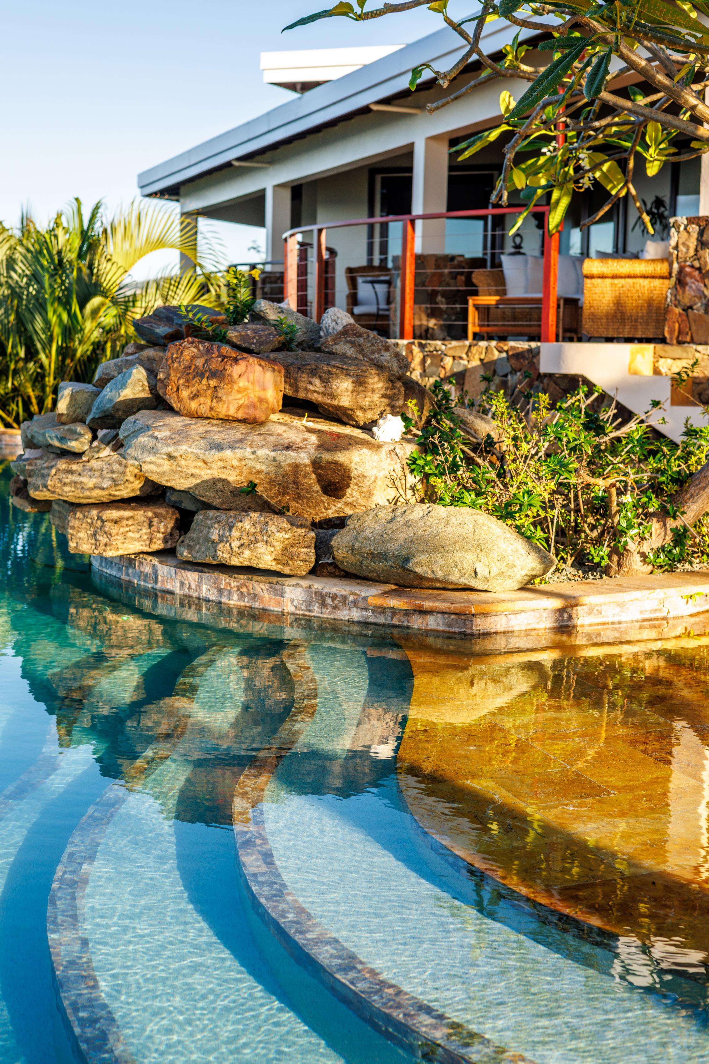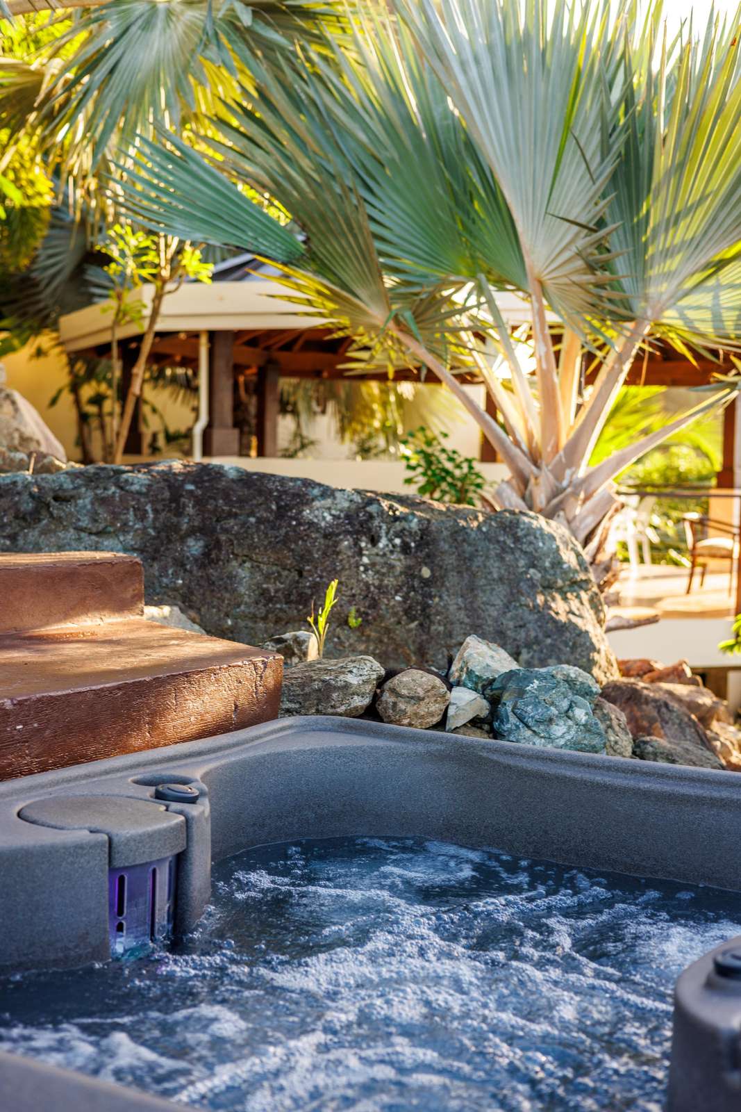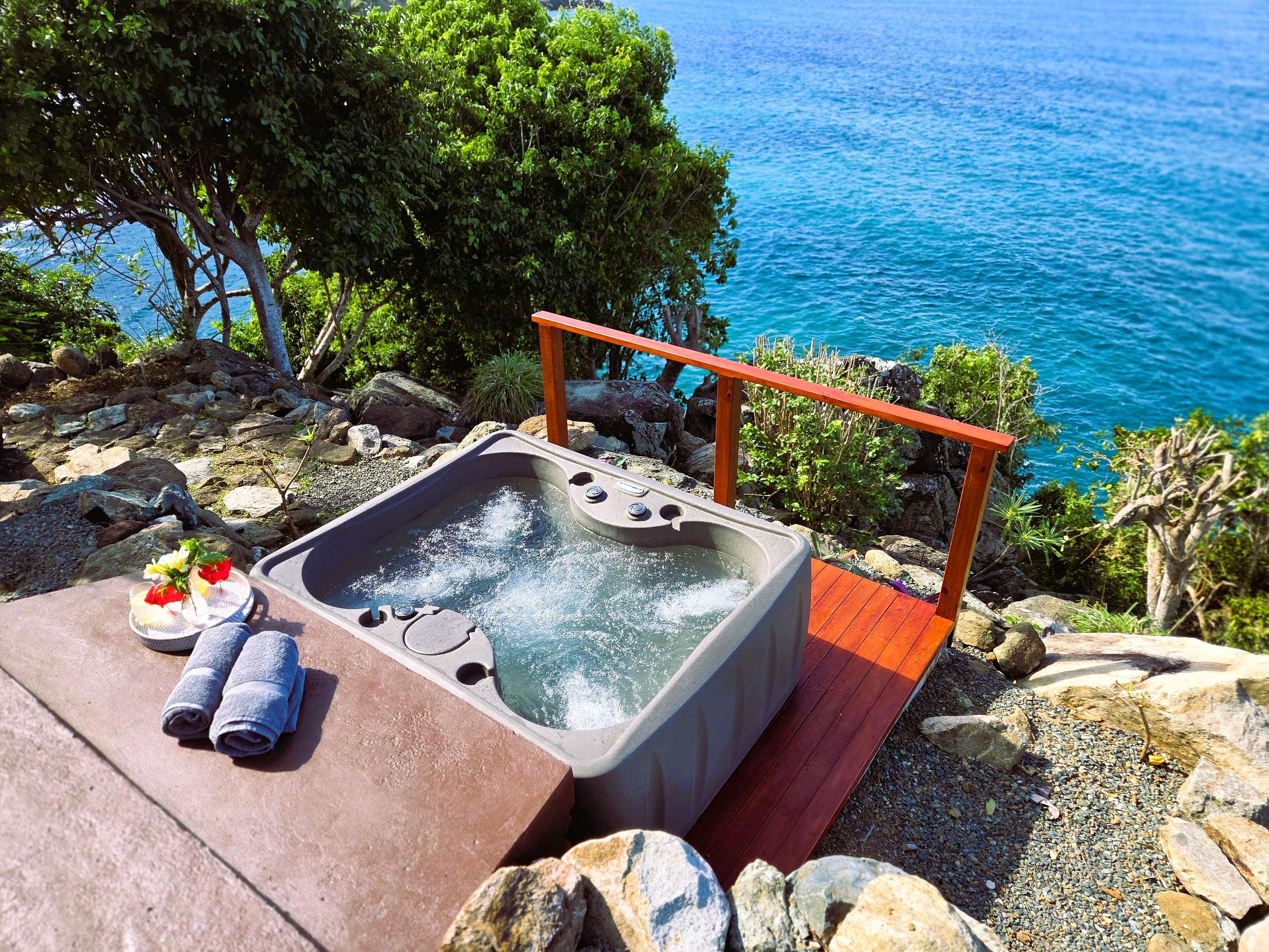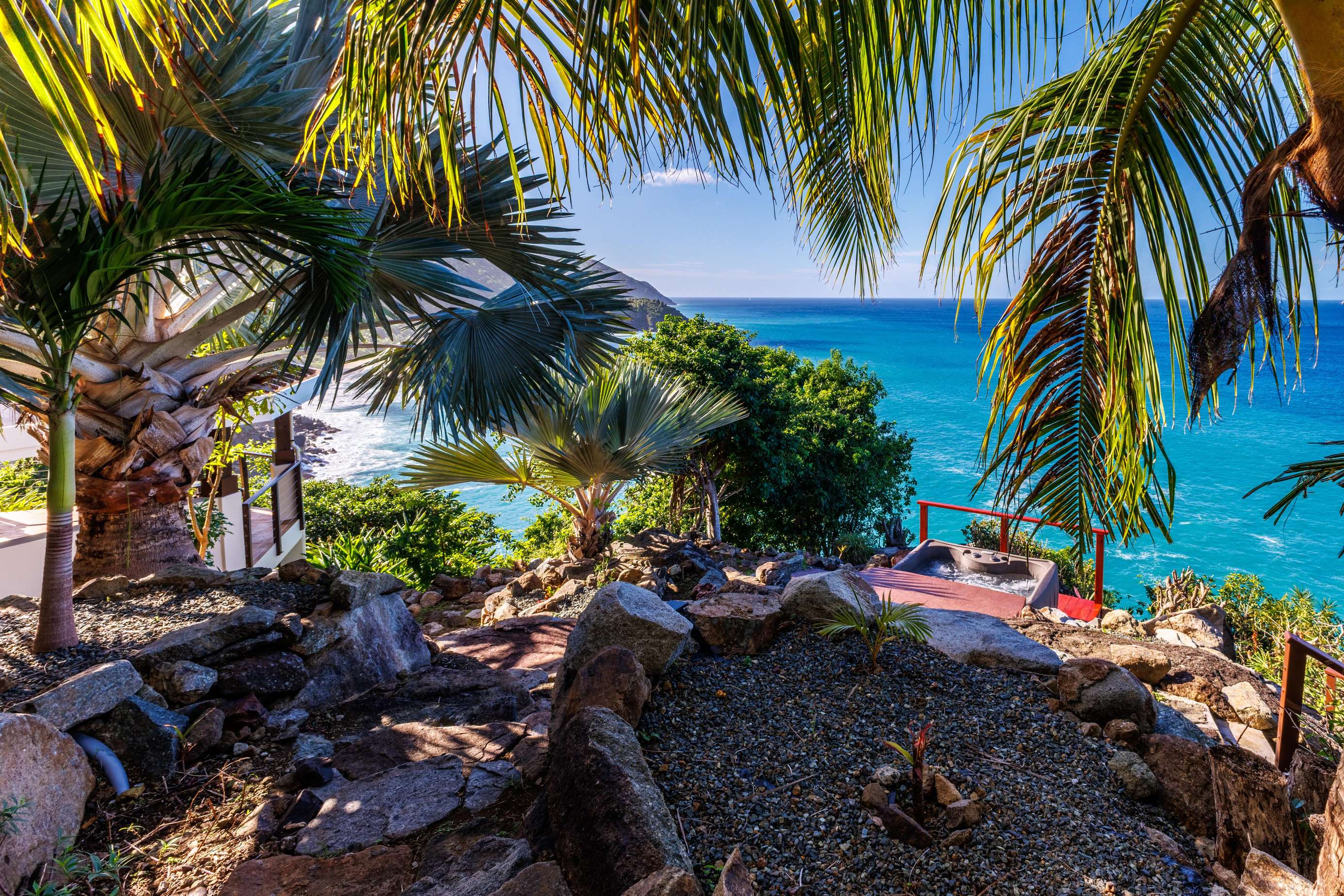 If you follow the winding paths around the beautifully landscaped tropical gardens, you’ll arrive at the 4th pavilion. This houses the outdoor kitchen with sun loungers and swinging seat. It’s a truly spectacular place to watch the sun sink below the horizon and set the sky alight. A short palm-fringed walk past it will take you to a hot-tub set into the rocks, right on the edge of the headland. What a spot to enjoy a sundowner.