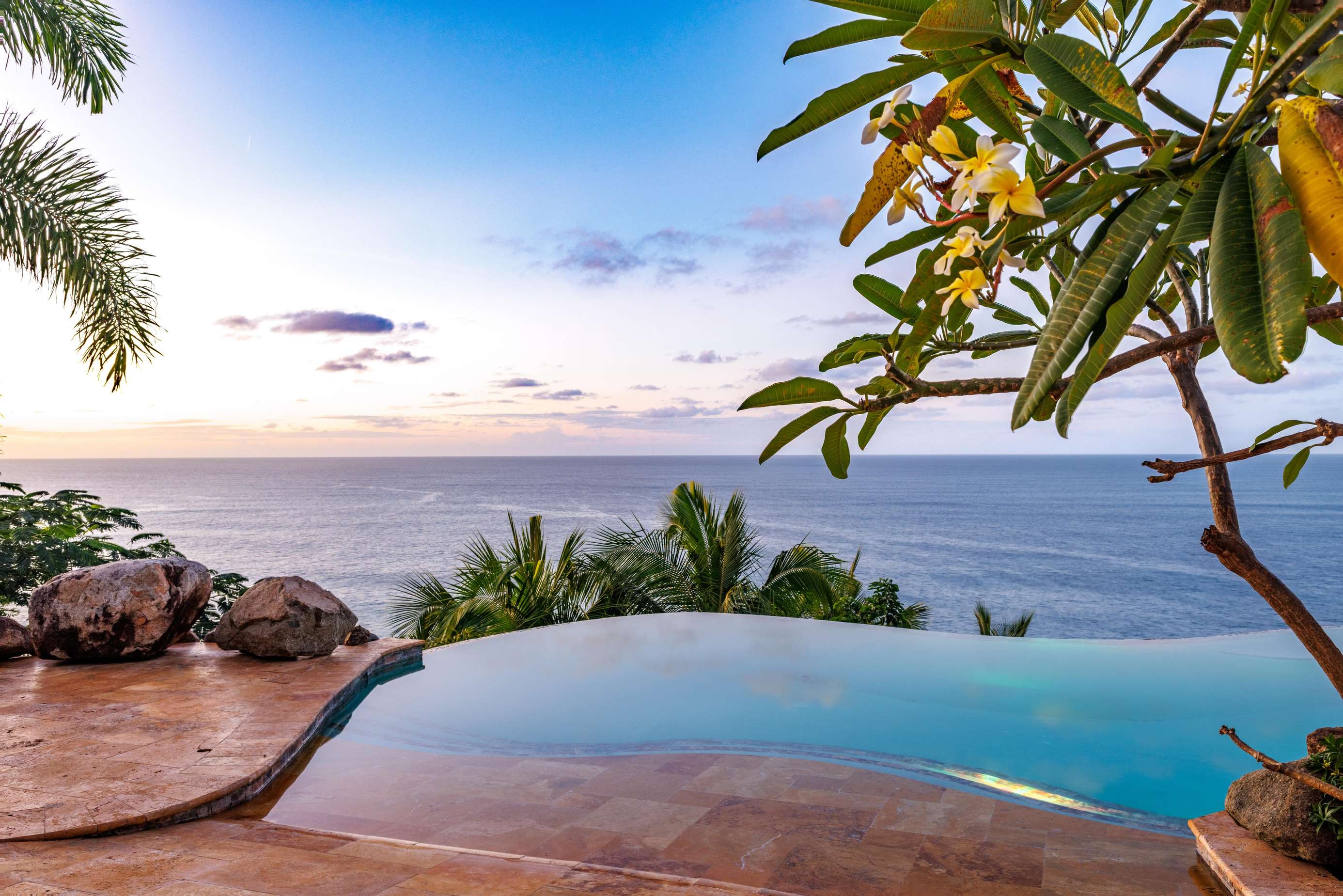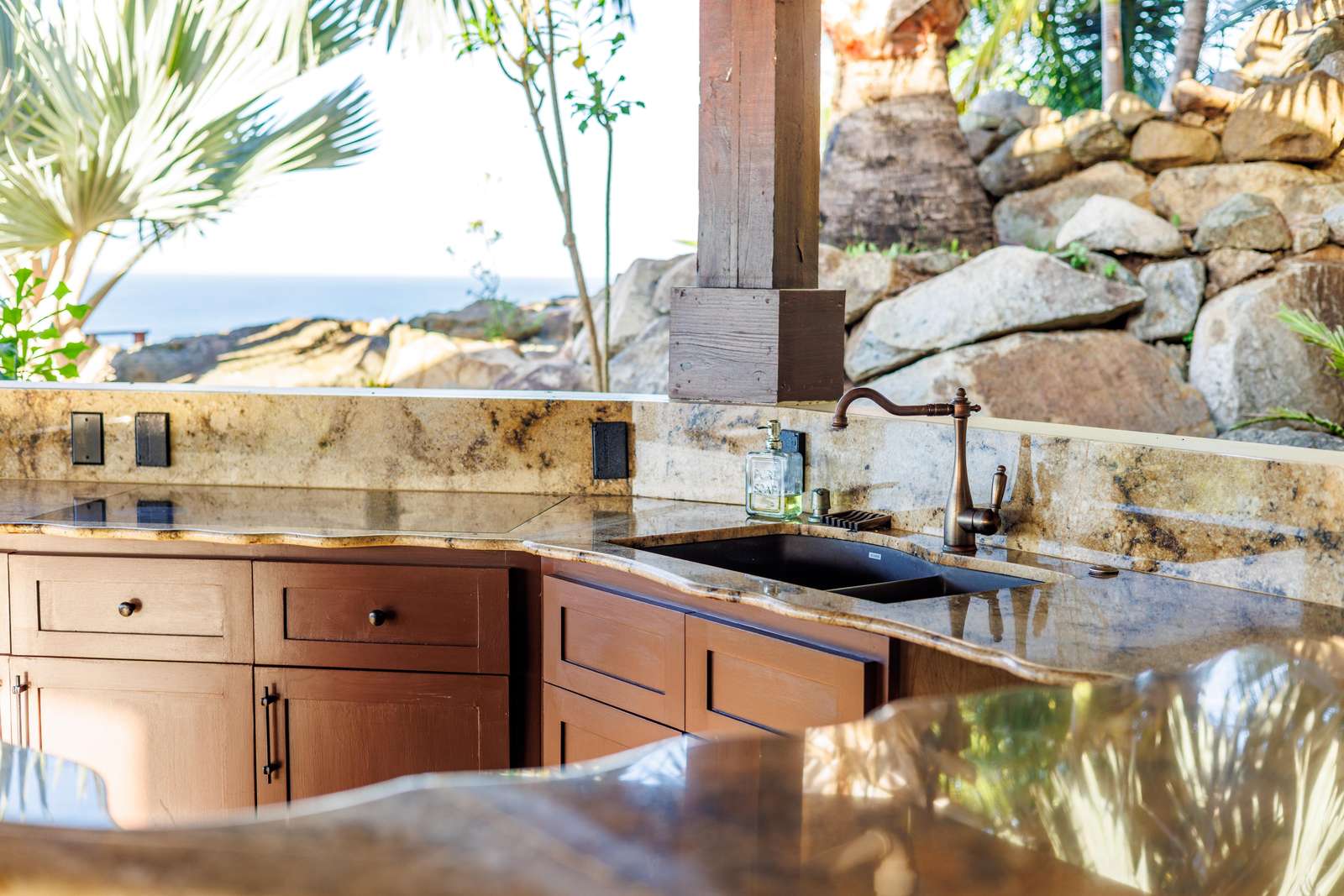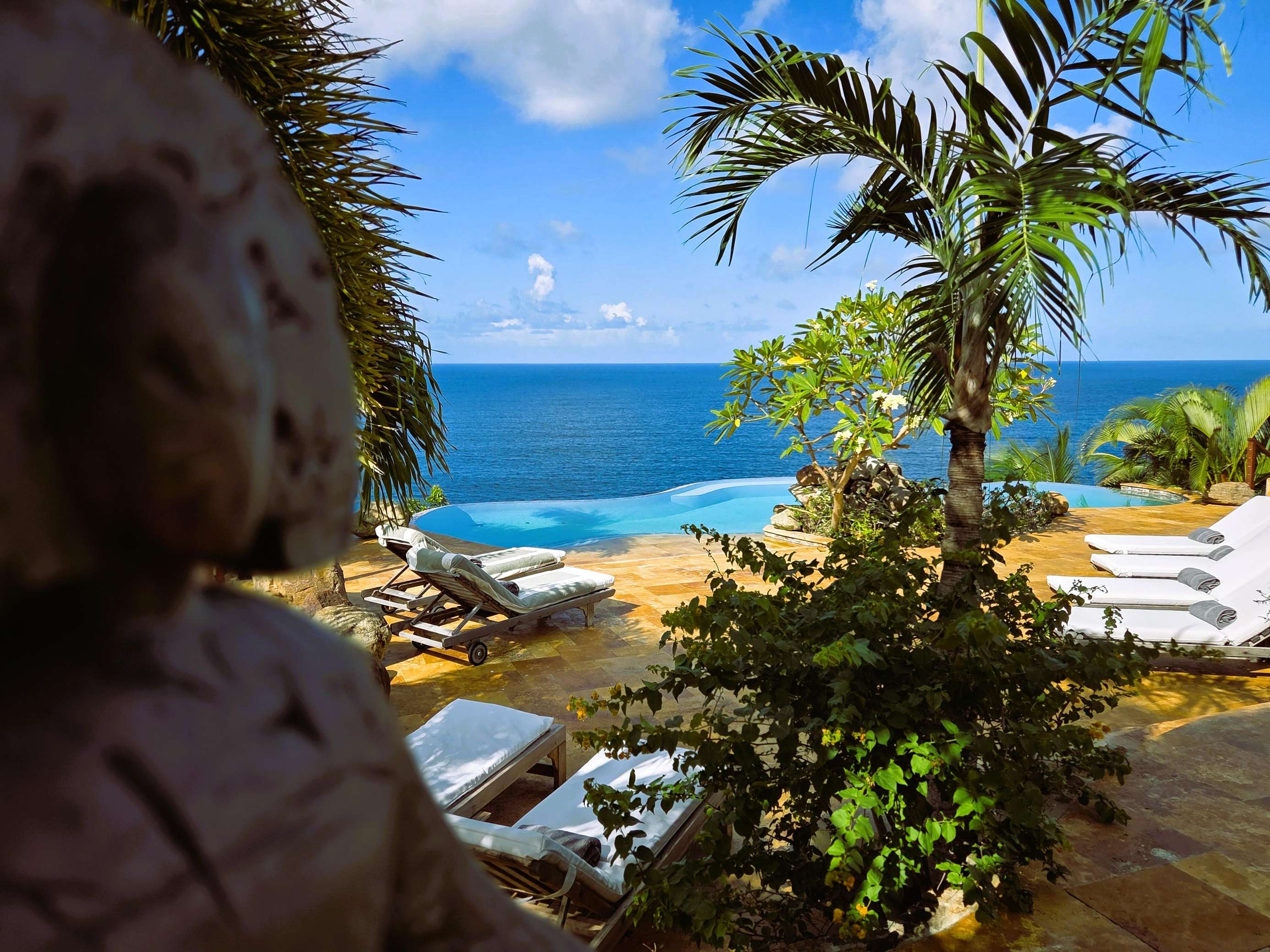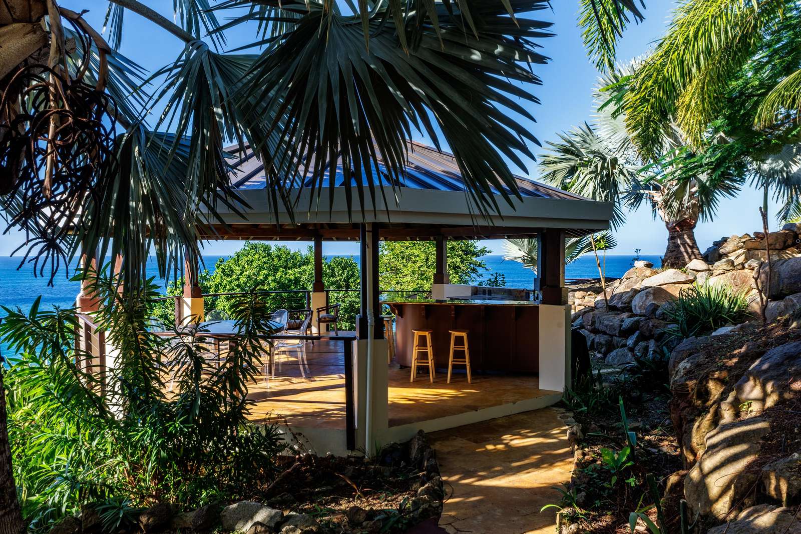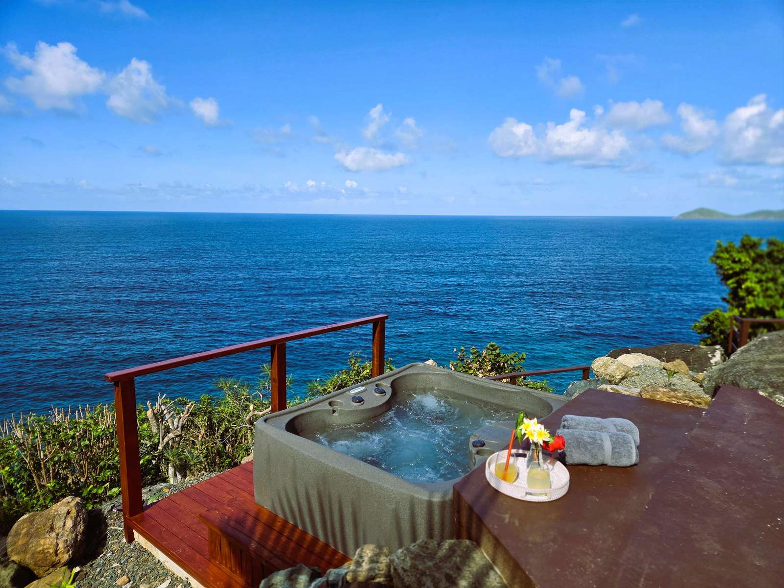 If you follow the winding paths around the beautifully landscaped tropical gardens, you’ll arrive at the 4th pavilion. This houses the outdoor kitchen with sun loungers and swinging seat. It’s a truly spectacular place to watch the sun sink below the horizon and set the sky alight. A short palm-fringed walk past it will take you to a hot-tub set into the rocks, right on the edge of the headland. What a spot to enjoy a sundowner.