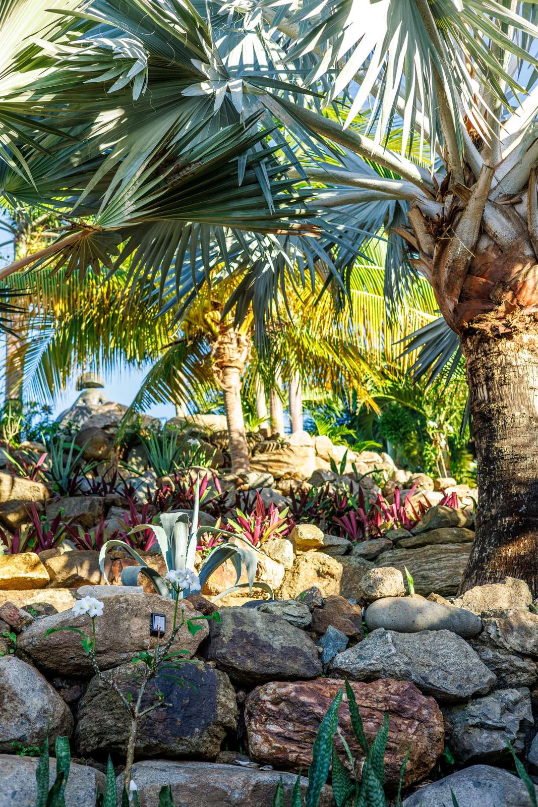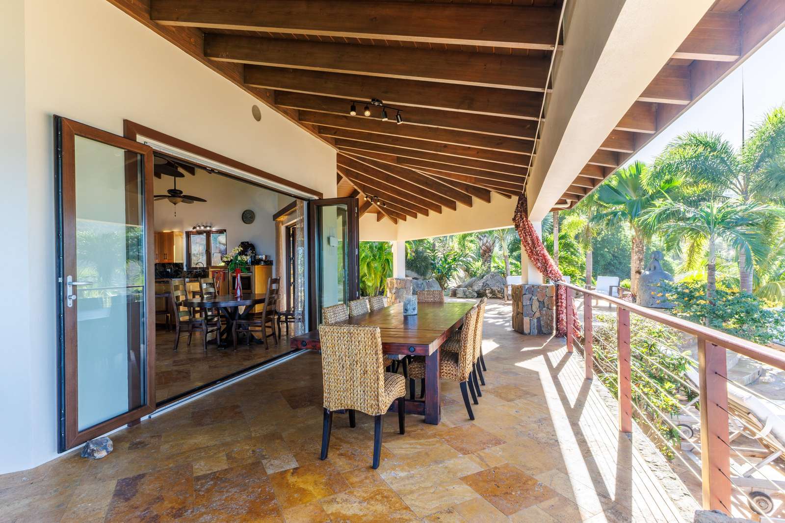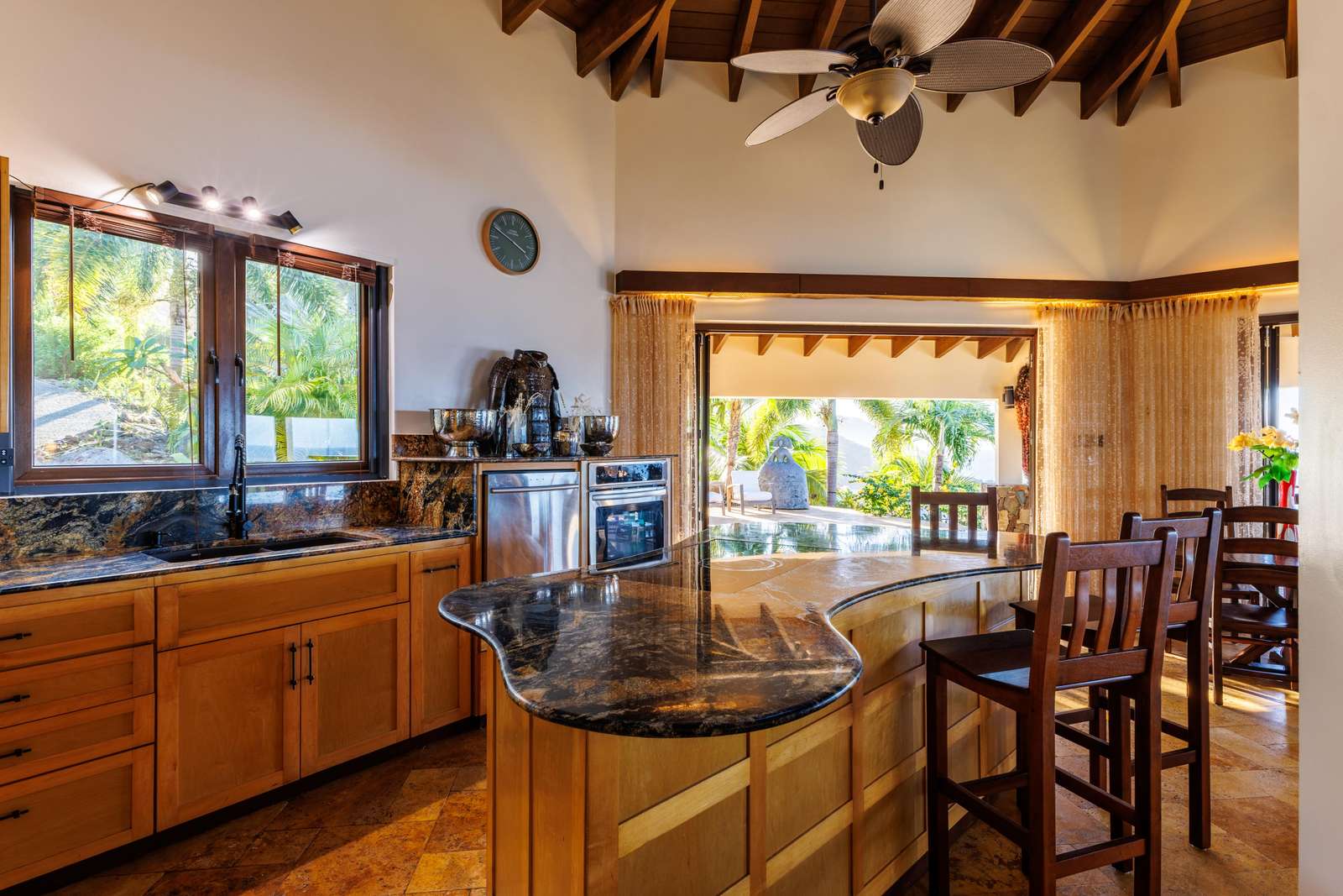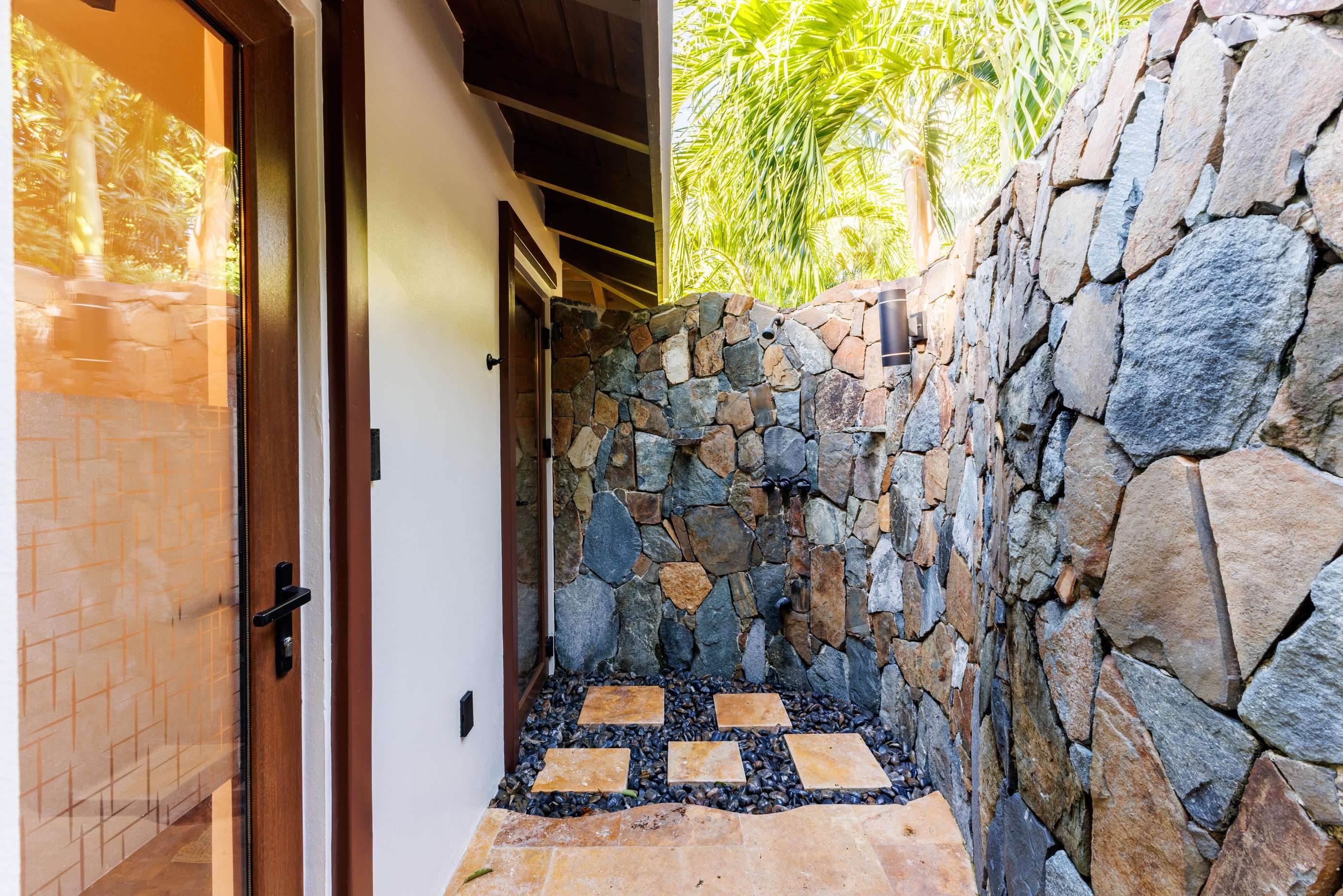 If you follow the winding paths around the beautifully landscaped tropical gardens, you’ll arrive at the 4th pavilion. This houses the outdoor kitchen with sun loungers and swinging seat. It’s a truly spectacular place to watch the sun sink below the horizon and set the sky alight. A short palm-fringed walk past it will take you to a hot-tub set into the rocks, right on the edge of the headland. What a spot to enjoy a sundowner.