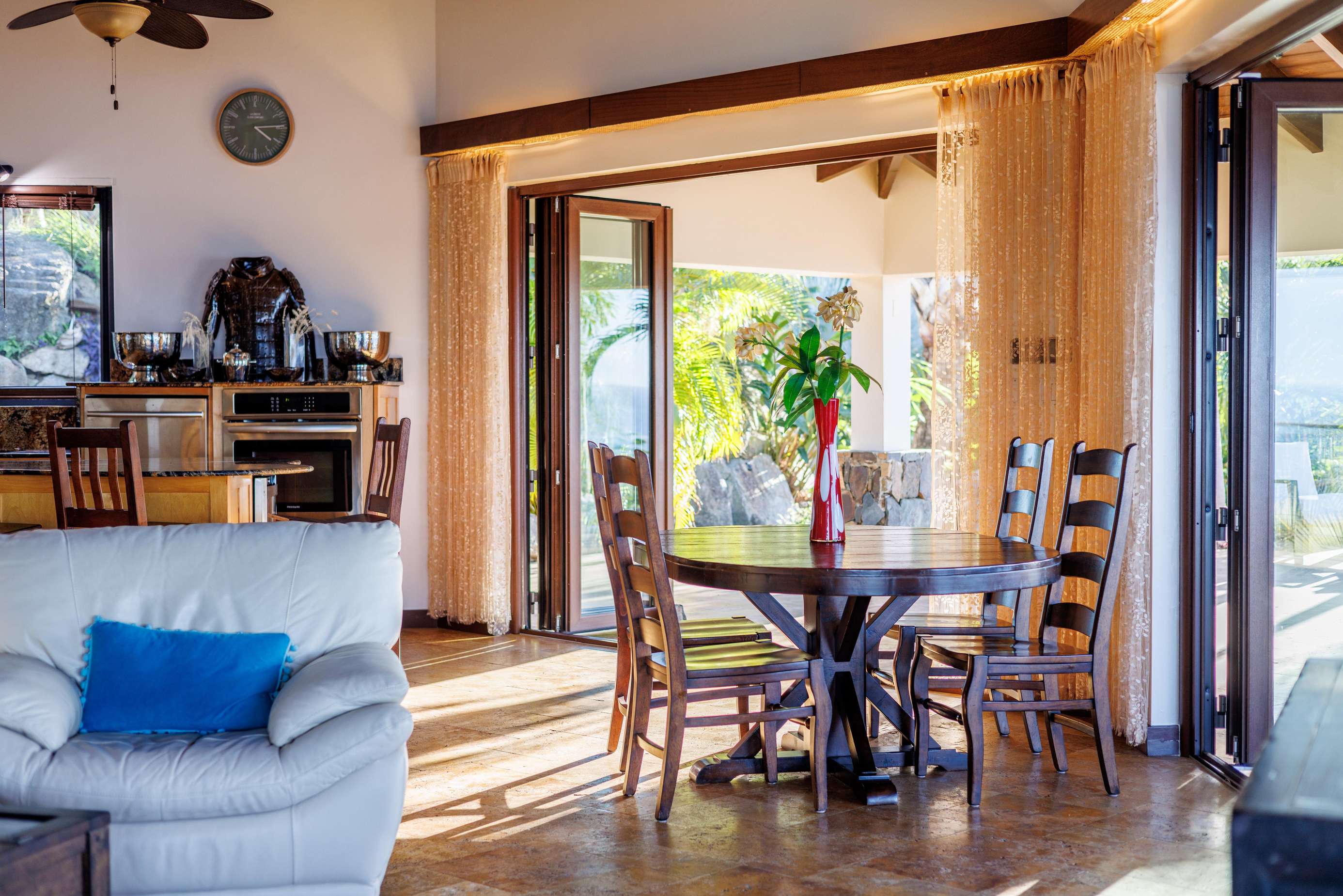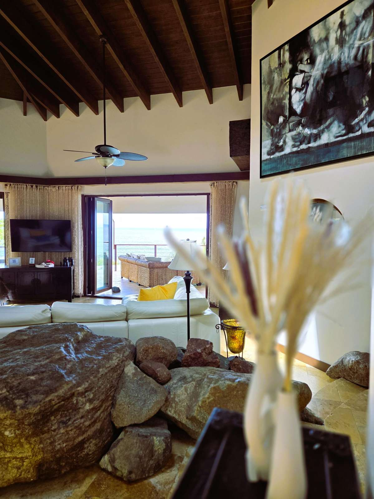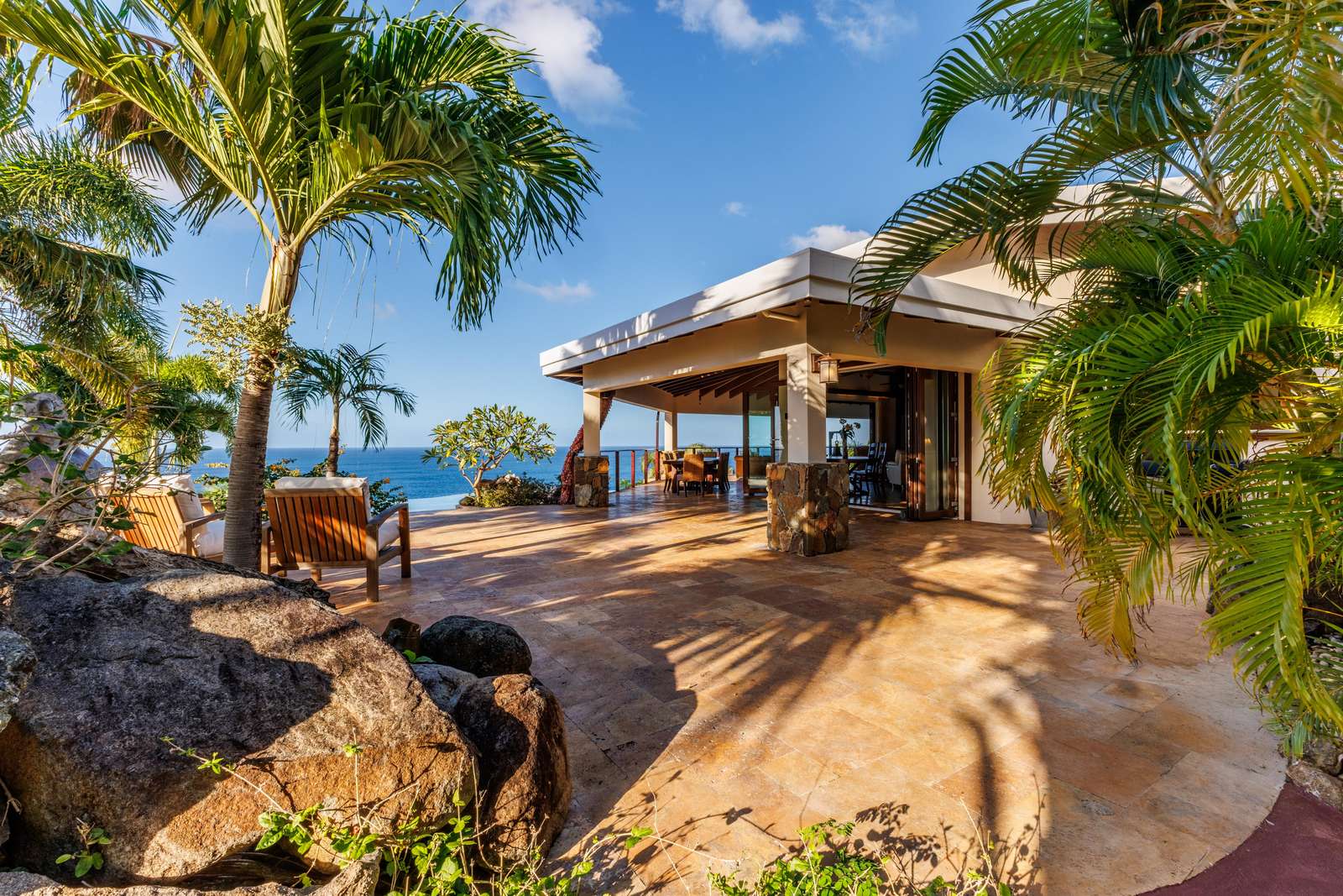The Main House consists of an open-plan living room and kitchen, an office, a laundry room and 3/ 6 bedrooms. The living room has plenty of comfy seating, a wall mounted TV (if you can bear to tear your eyes away from the view) and uniquely, large feature rock boulders. Floor to ceiling bifold doors open onto the panoramic ocean views and a spacious covered deck with a sociable and comfortable seating area and dining table for 12.
