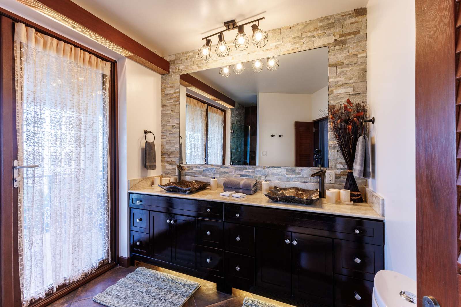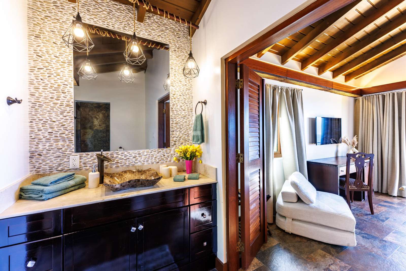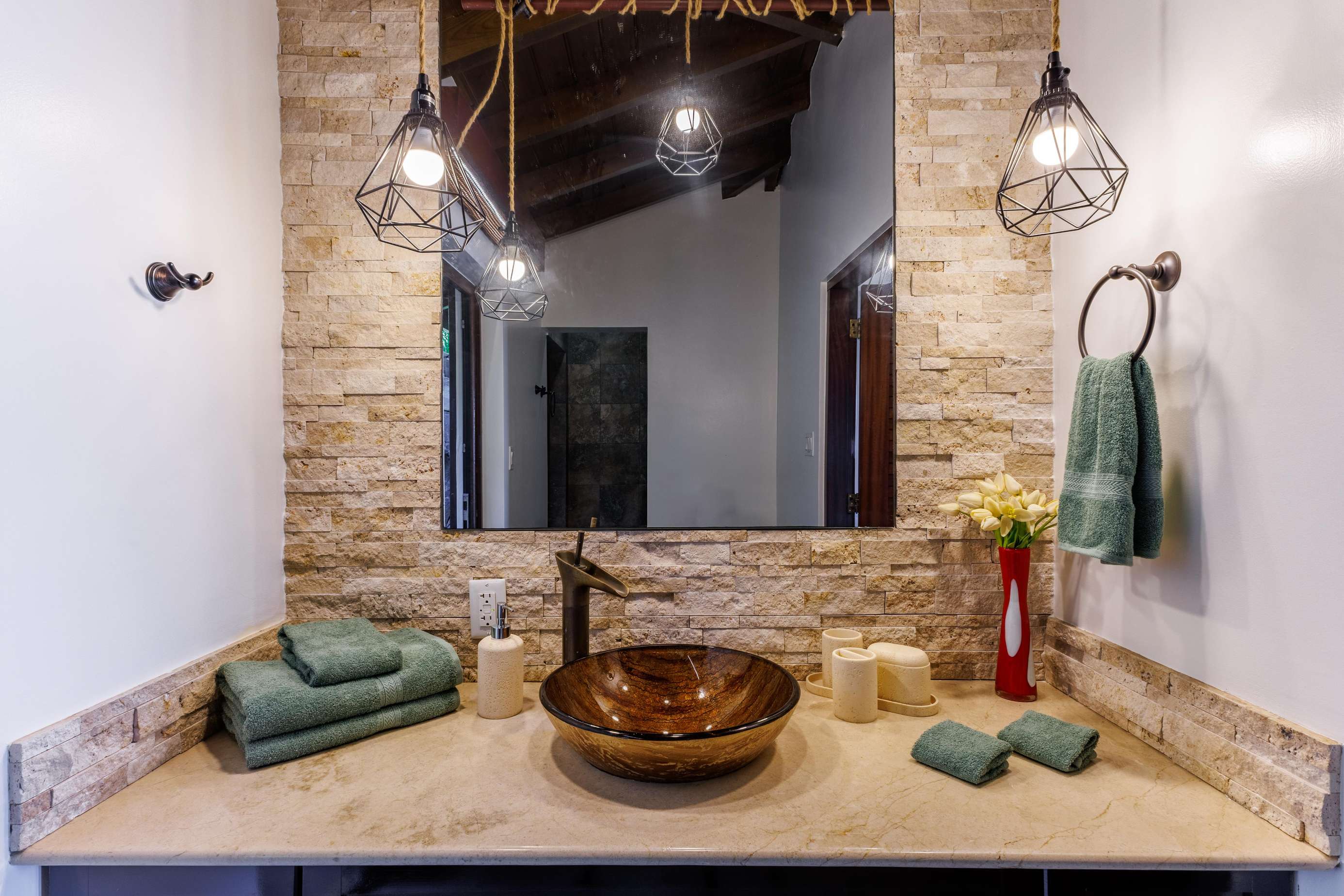 The Main House consists of an open-plan living room and kitchen, an office, a laundry room and 3/ 6 bedrooms. The living room has plenty of comfy seating, a wall mounted TV (if you can bear to tear your eyes away from the view) and uniquely, large feature rock boulders. Floor to ceiling bifold doors open onto the panoramic ocean views and a spacious covered deck with a sociable and comfortable seating area and dining table for 12.