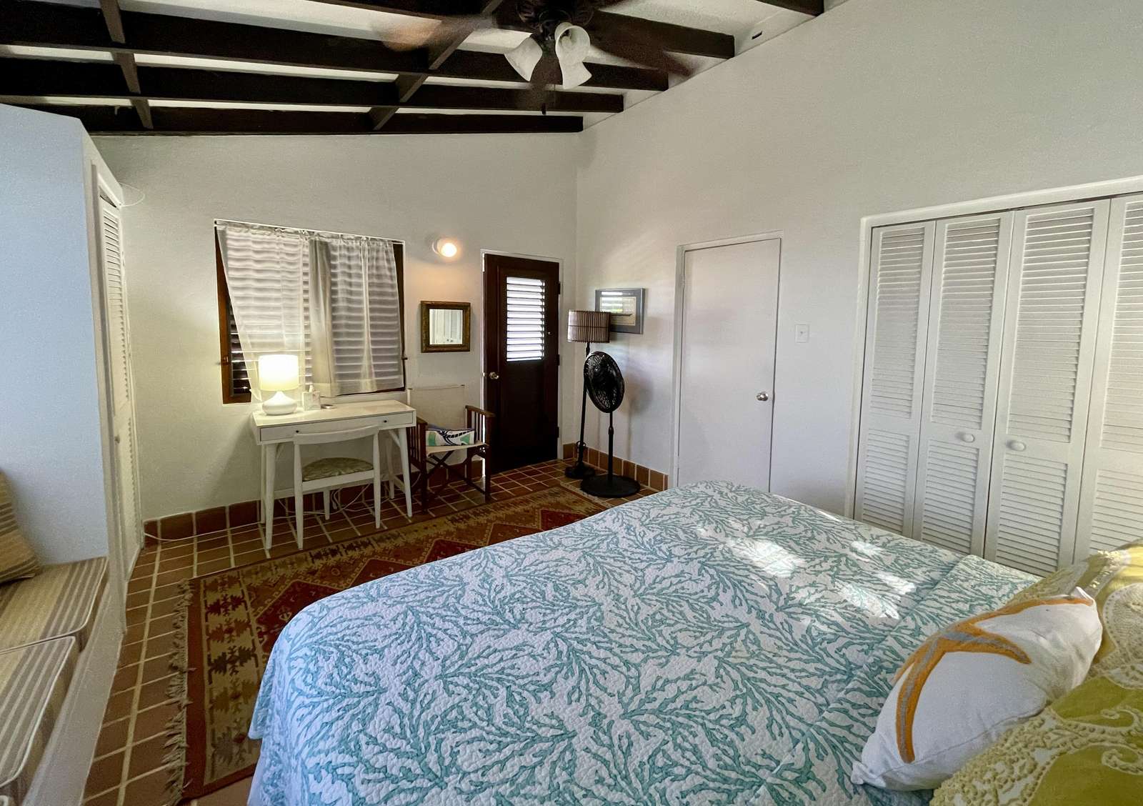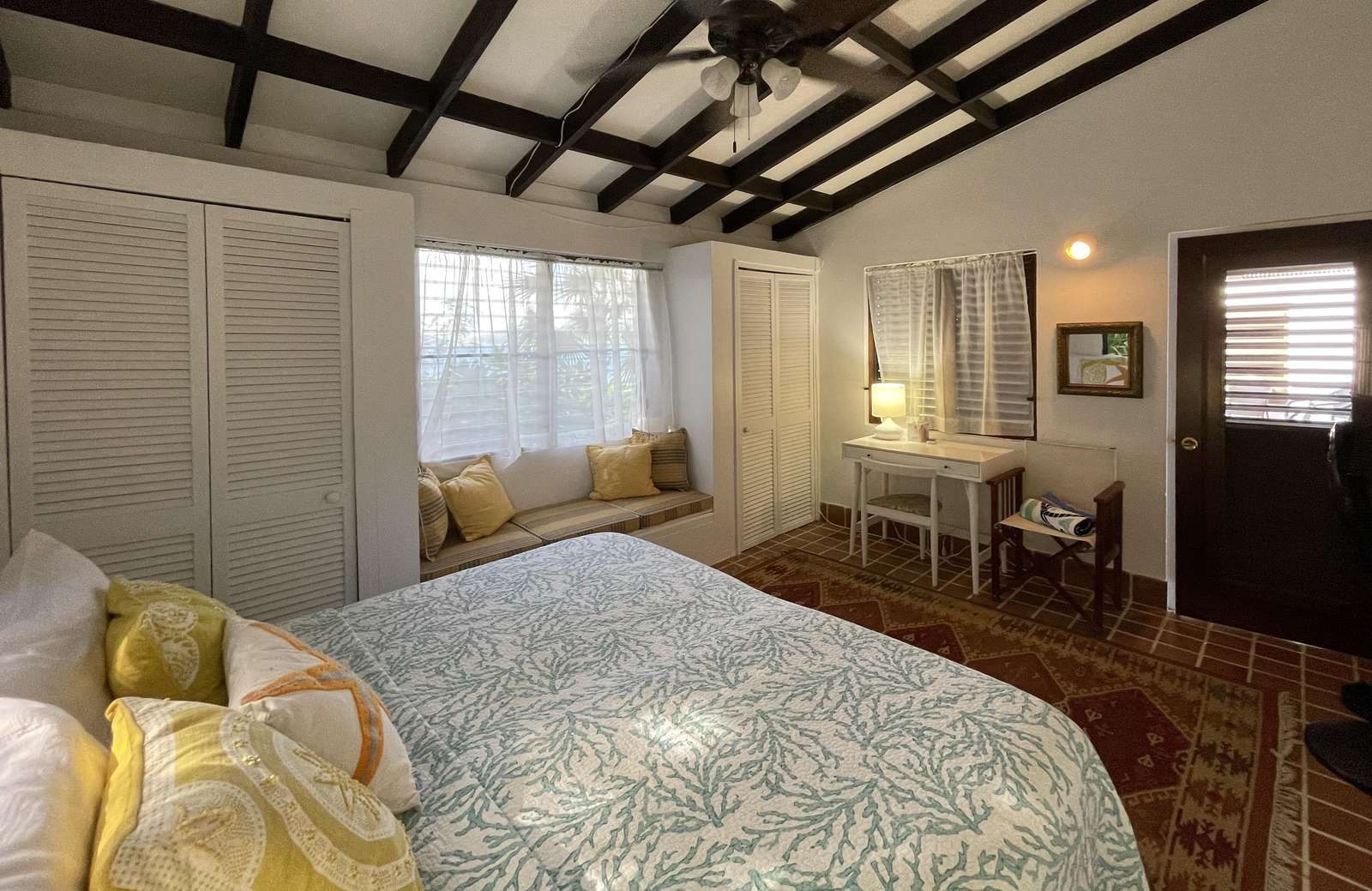 2) The 2nd bedroom is in the main building and also air-conditioned. The beds can be conveniently made up as 2 twins or a king. There is a window seat, closet and writing desk in this bedroom. There is a bathroom in the main building with shower.