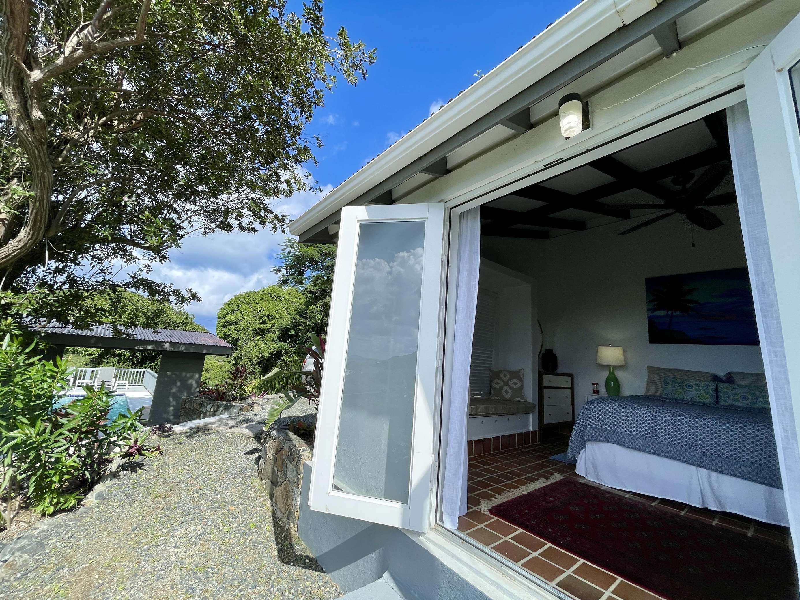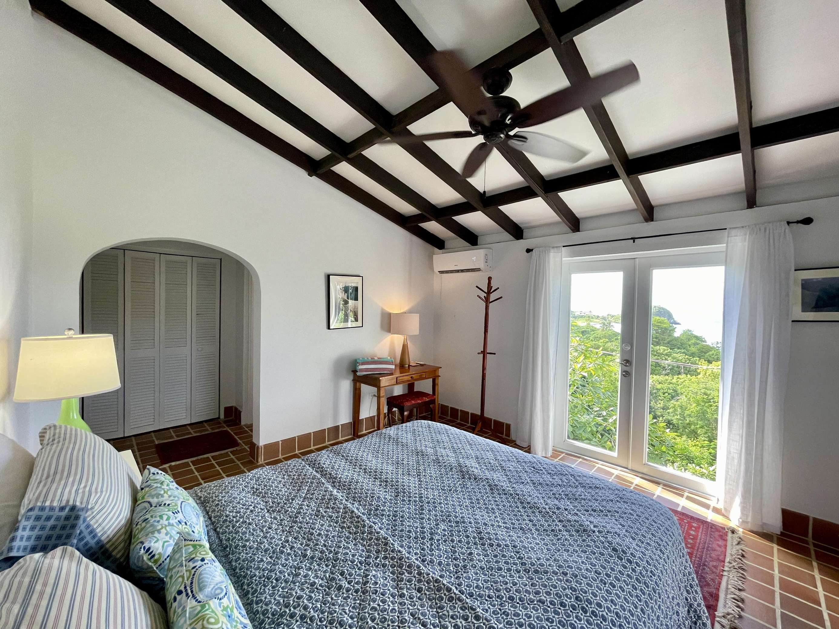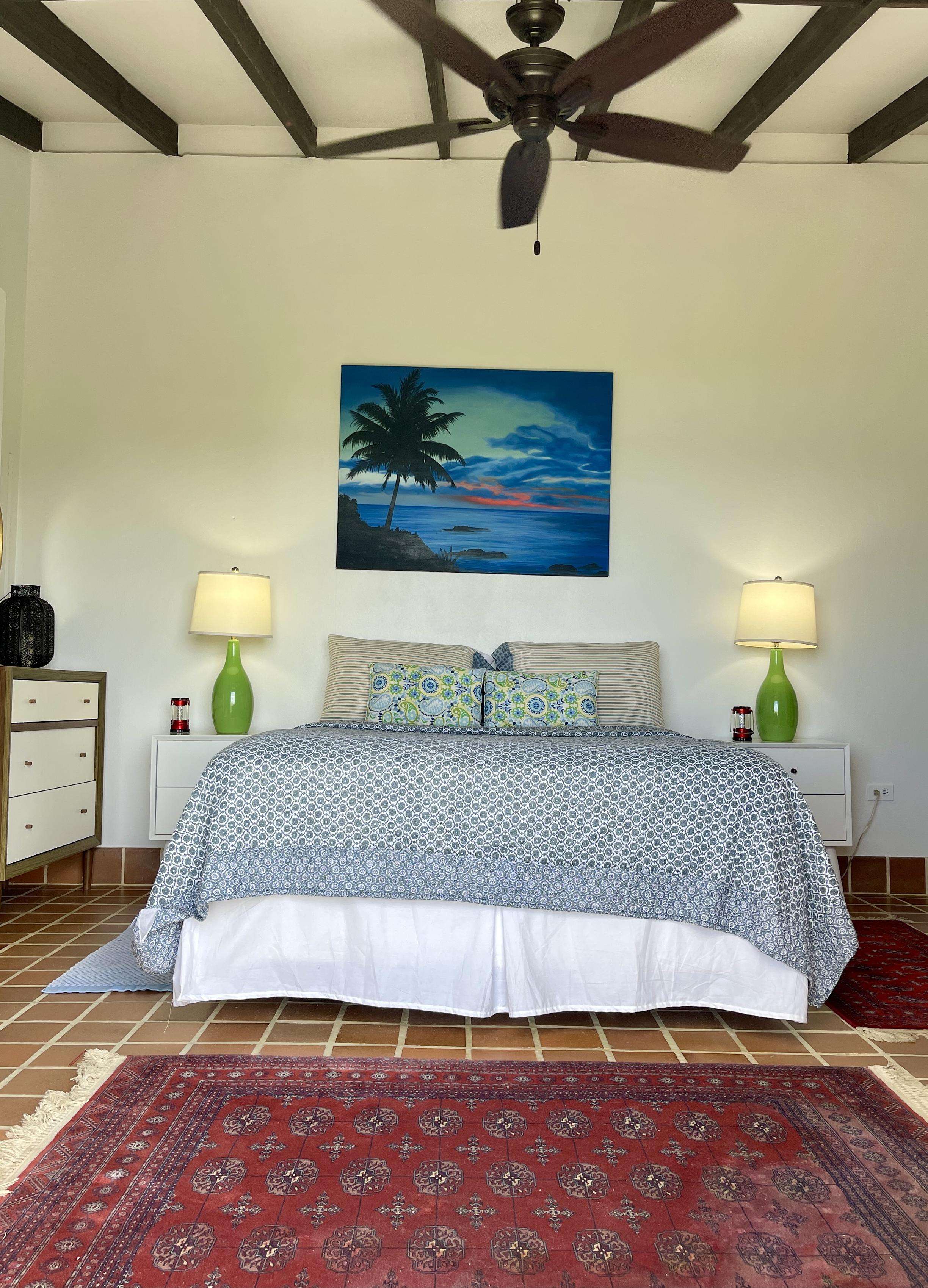 1)The primary bedroom is comfortably sized and offers AC, a king-size bed and glass doors at the end of the bed opening to reveal the gorgeous glimmering ocean view. It is a private suite, in a separate building to the main house and has an ensuite bathroom with shower.