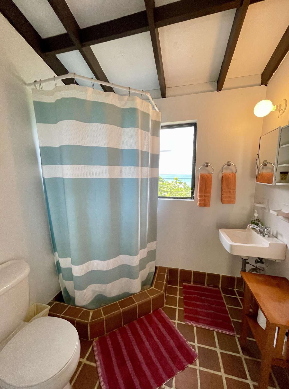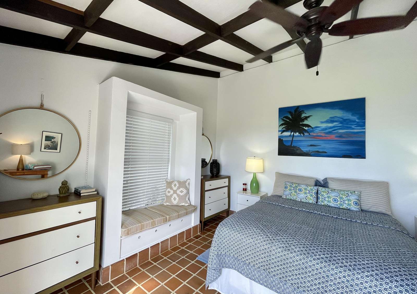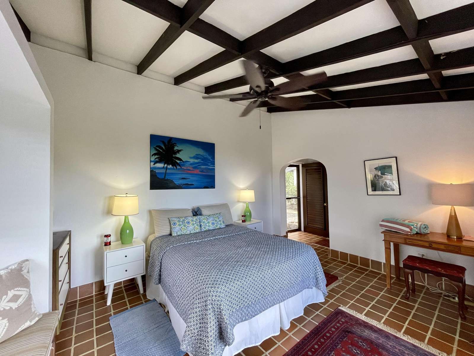 1)The primary bedroom is comfortably sized and offers AC, a king-size bed and glass doors at the end of the bed opening to reveal the gorgeous glimmering ocean view. It is a private suite, in a separate building to the main house and has an ensuite bathroom with shower.