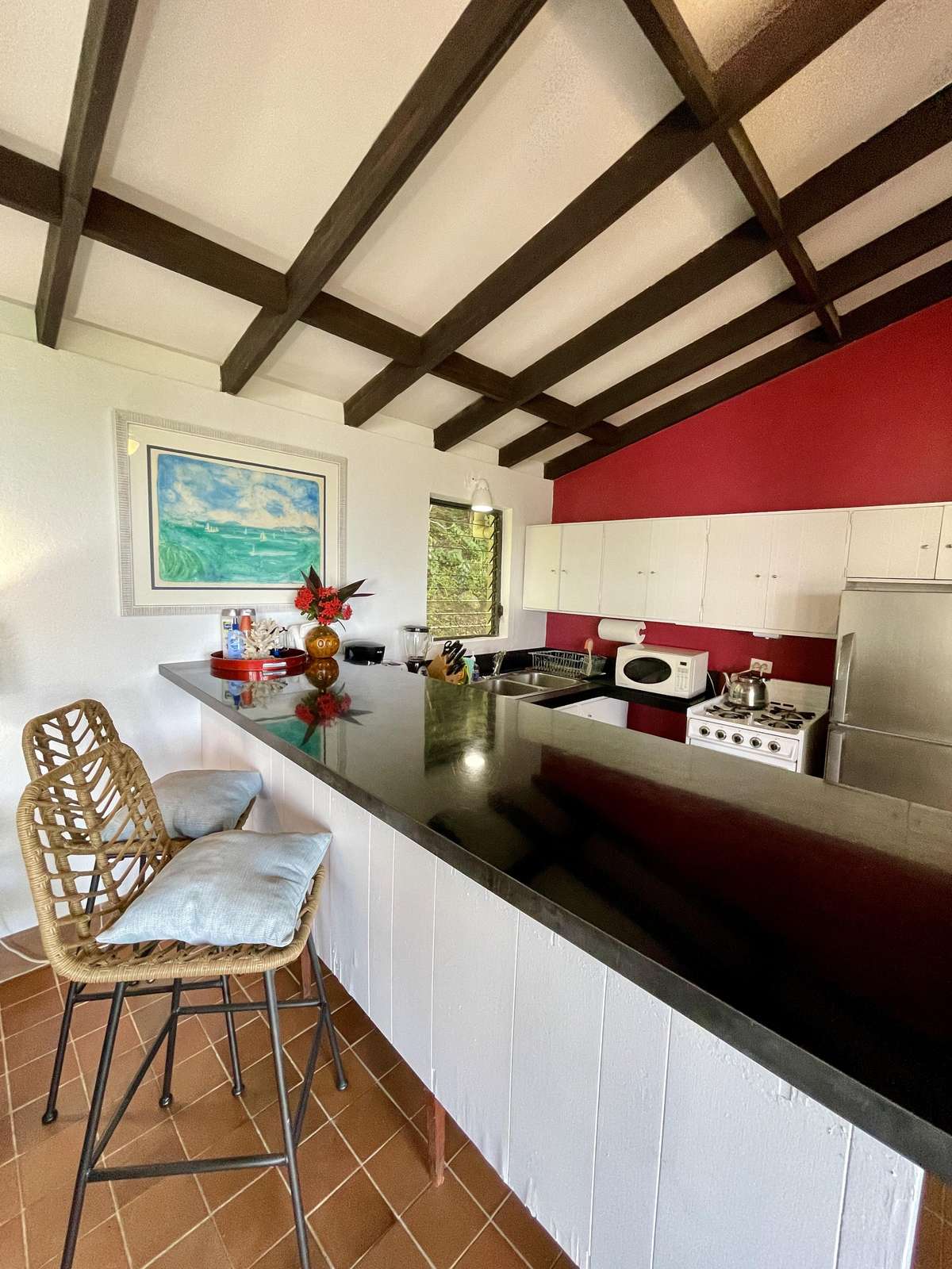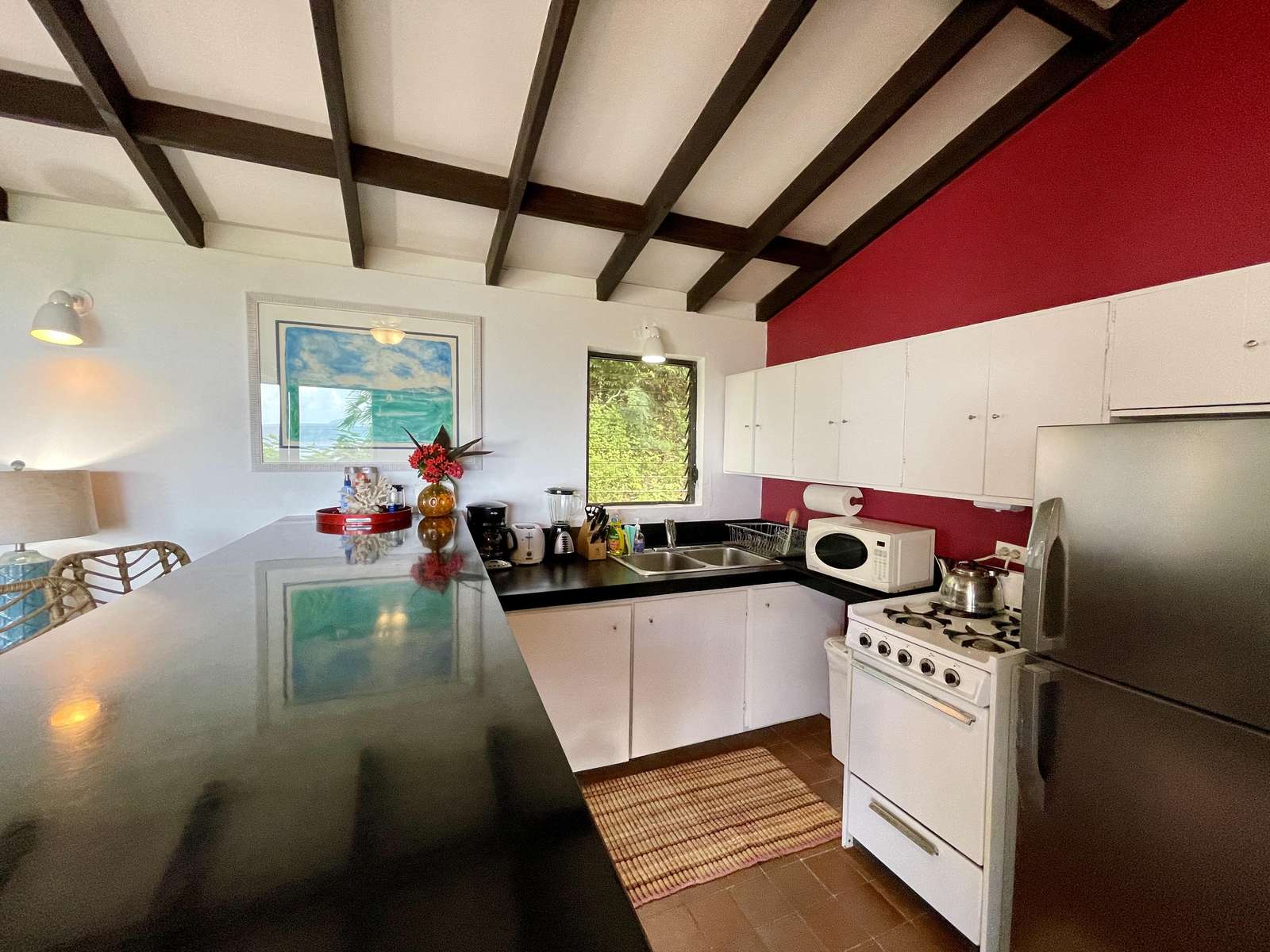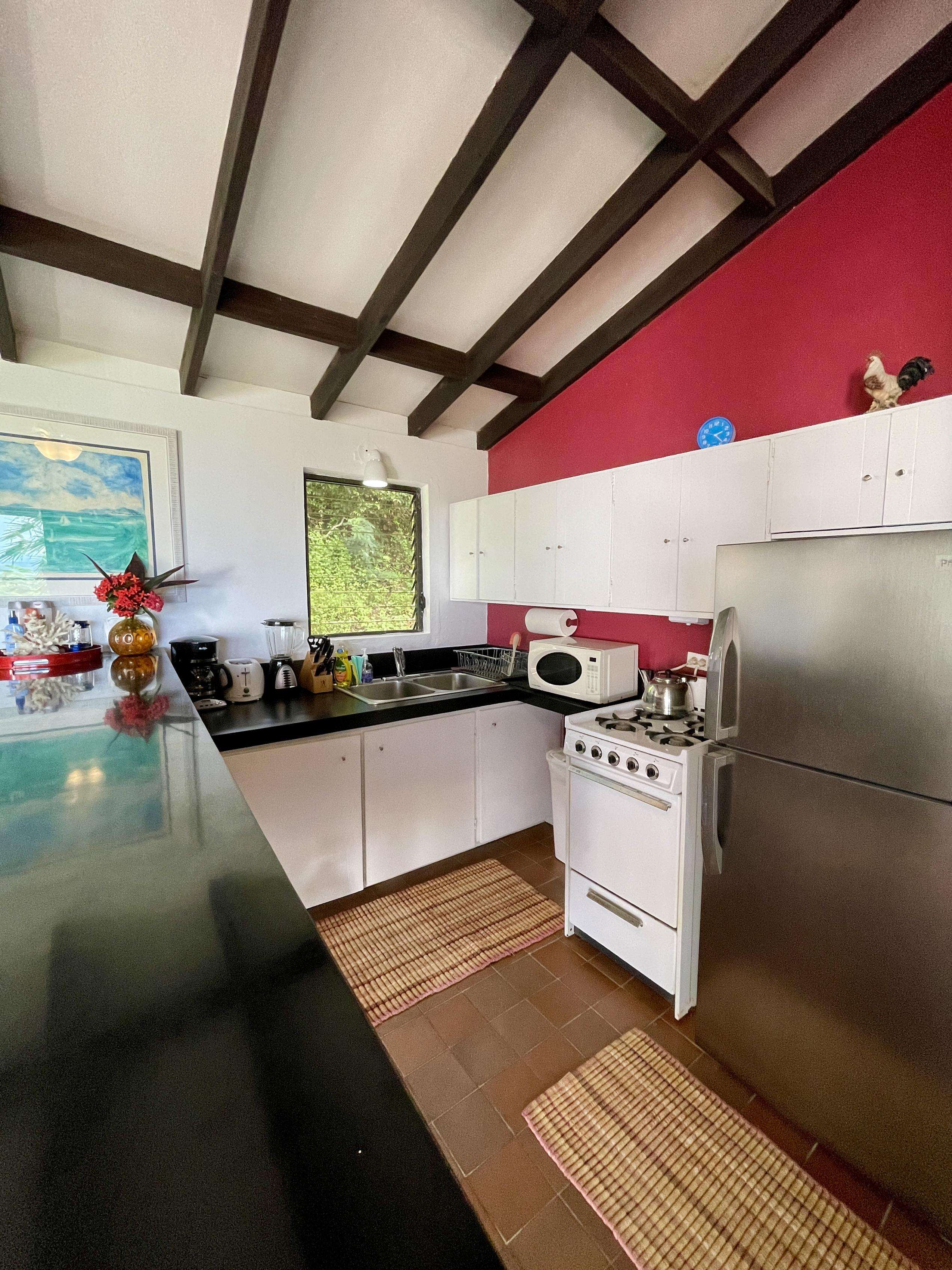 The bright and breezy open-plan living room and kitchen are sociable and convenient. The kitchen is well-equipped for self catering and has a full size fridge, gas stove, blender, toaster etc and is only separated from the living room by a breakfast bar. If you can bear to tear your eyes away from the ocean views, the comfy living room has a smartTV with Netflix (no cable or satellite). The living rooms glass doors are fully screened and open directly to the covered porch with dining table and gorgeous views any time of day.