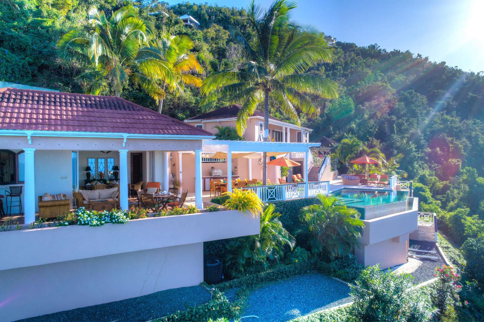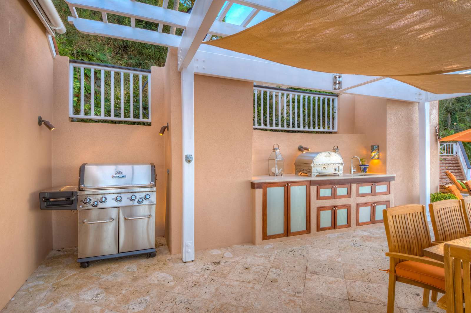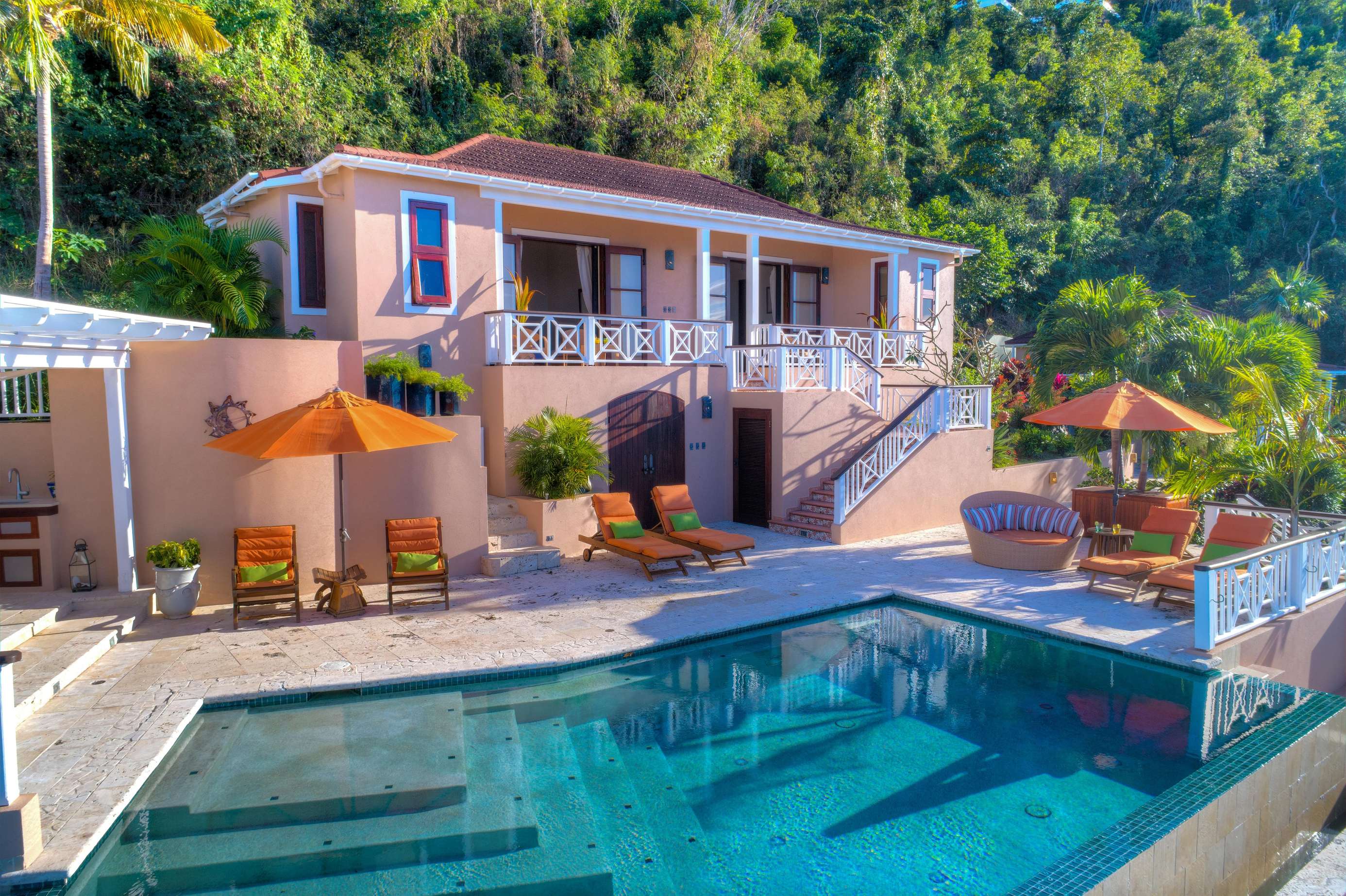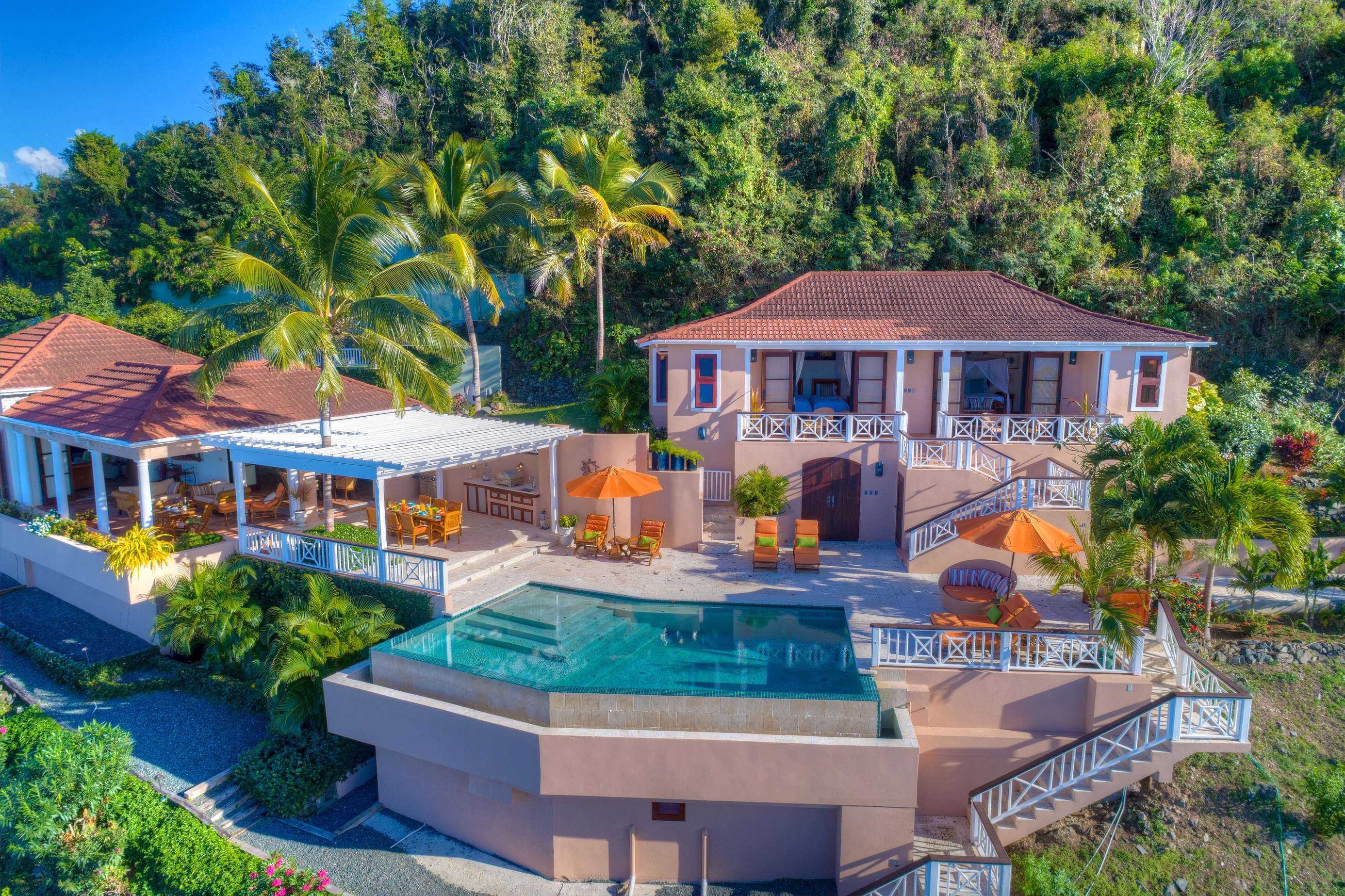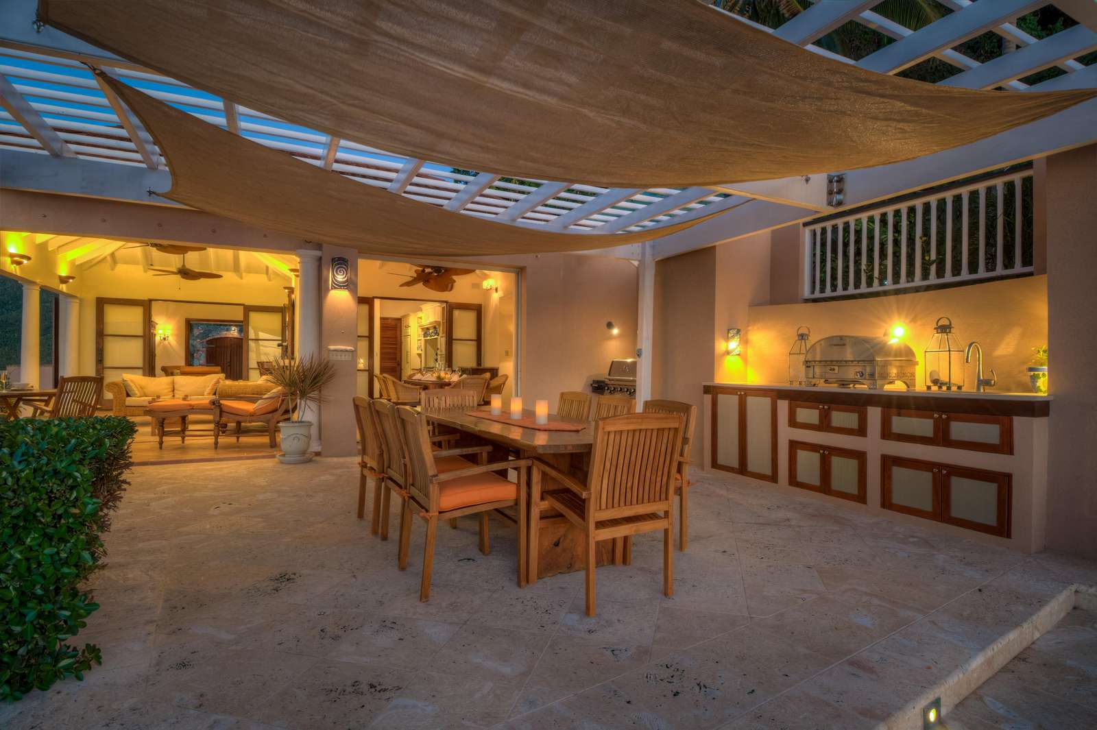The outside dining area overlooks the infinity edge pool and is a magical place to enjoy a meal with friends. The patio area is equipped with an outdoor kitchen with both gas fired BBQ and pizza oven, as well as an Indonesian hand crafted dining table set under a shaded pergola perfect for experiencing the outstanding Caribbean sunsets.