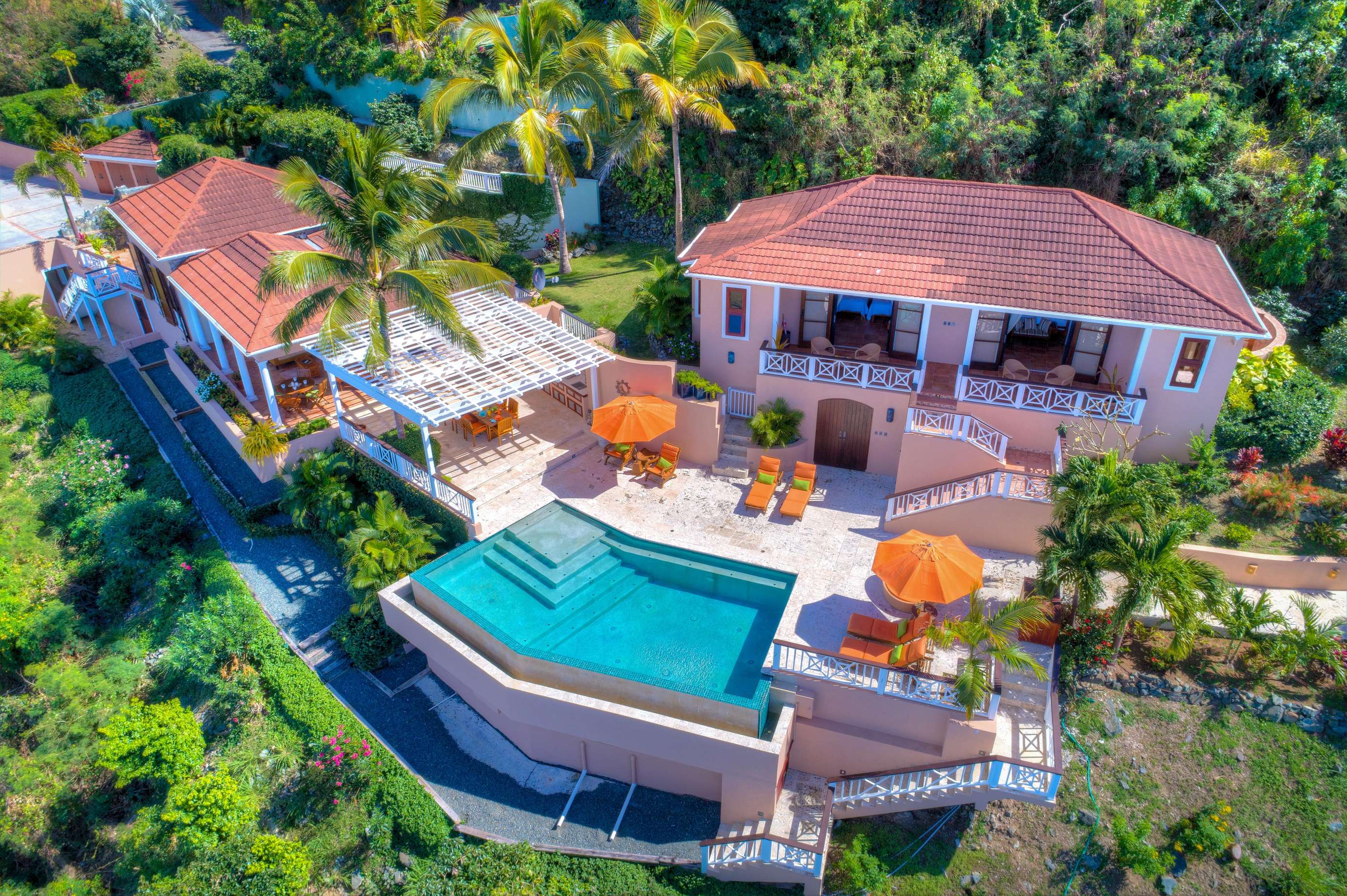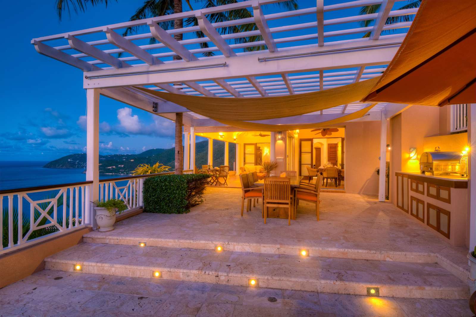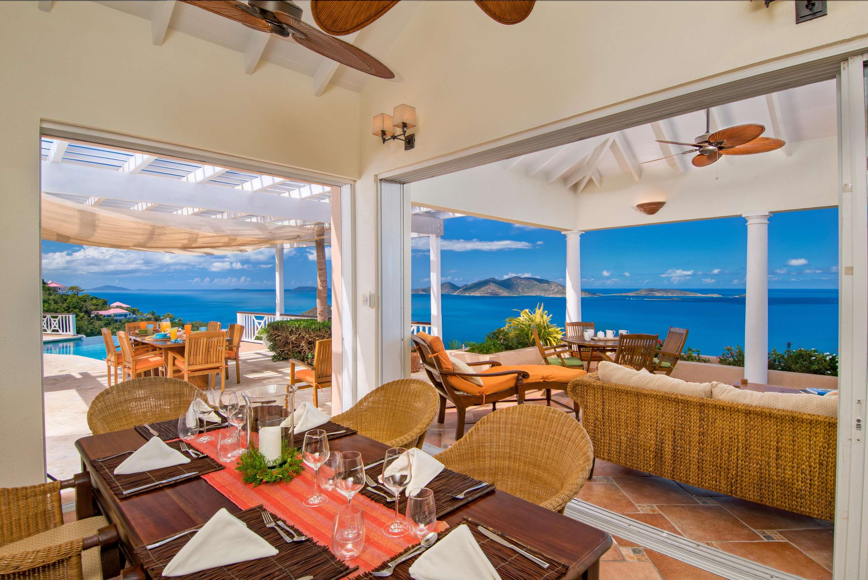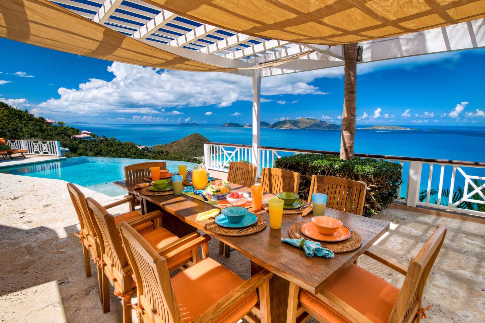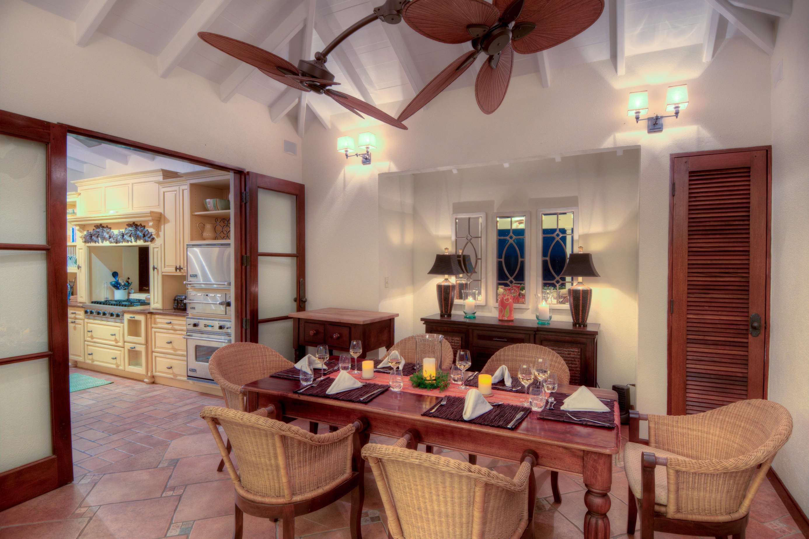 The outside dining area overlooks the infinity edge pool and is a magical place to enjoy a meal with friends. The patio area is equipped with an outdoor kitchen with both gas fired BBQ and pizza oven, as well as an Indonesian hand crafted dining table set under a shaded pergola perfect for experiencing the outstanding Caribbean sunsets.
