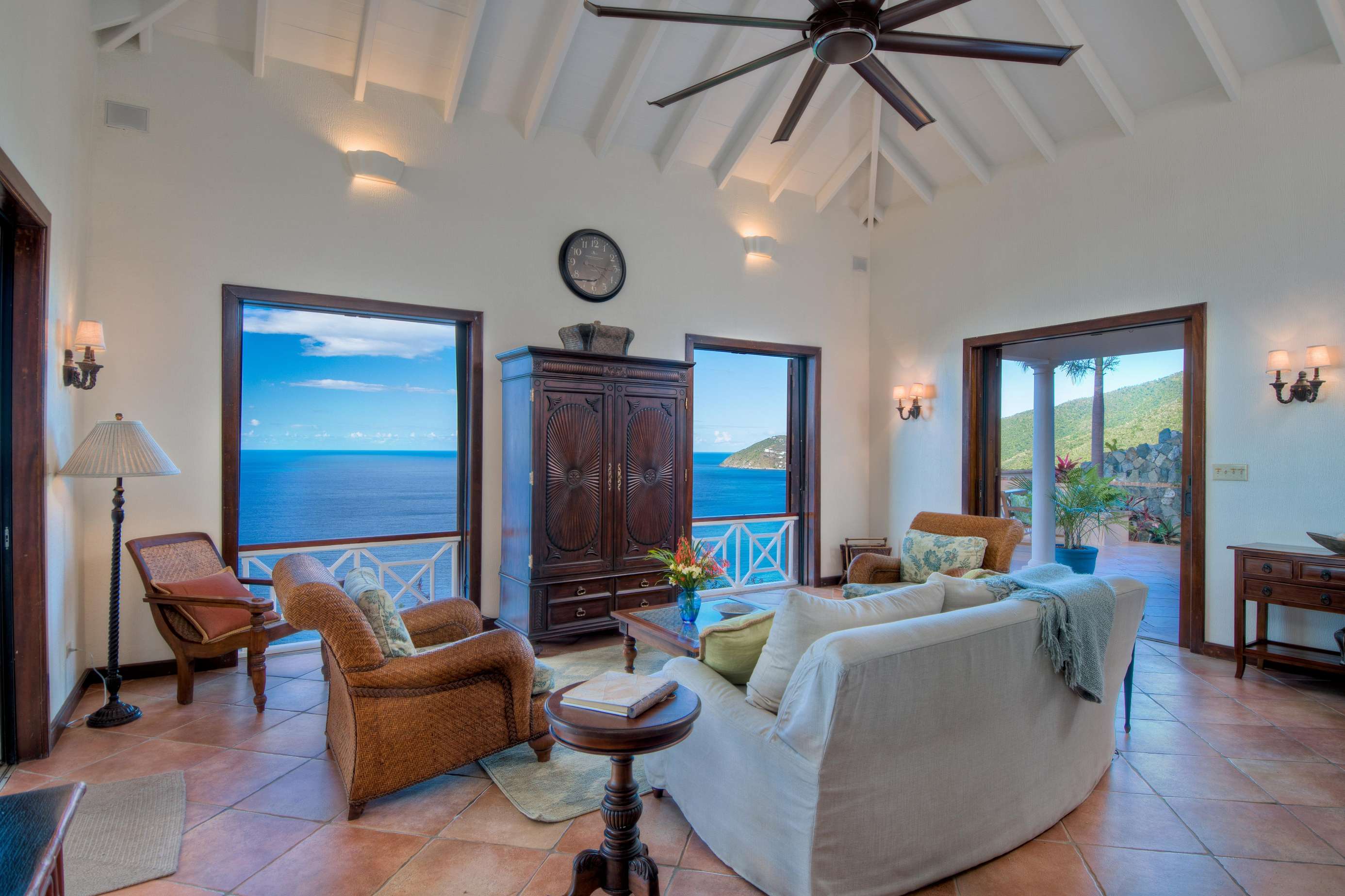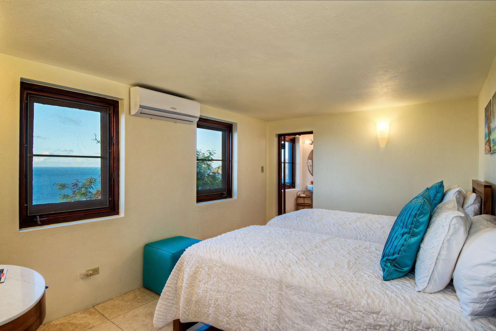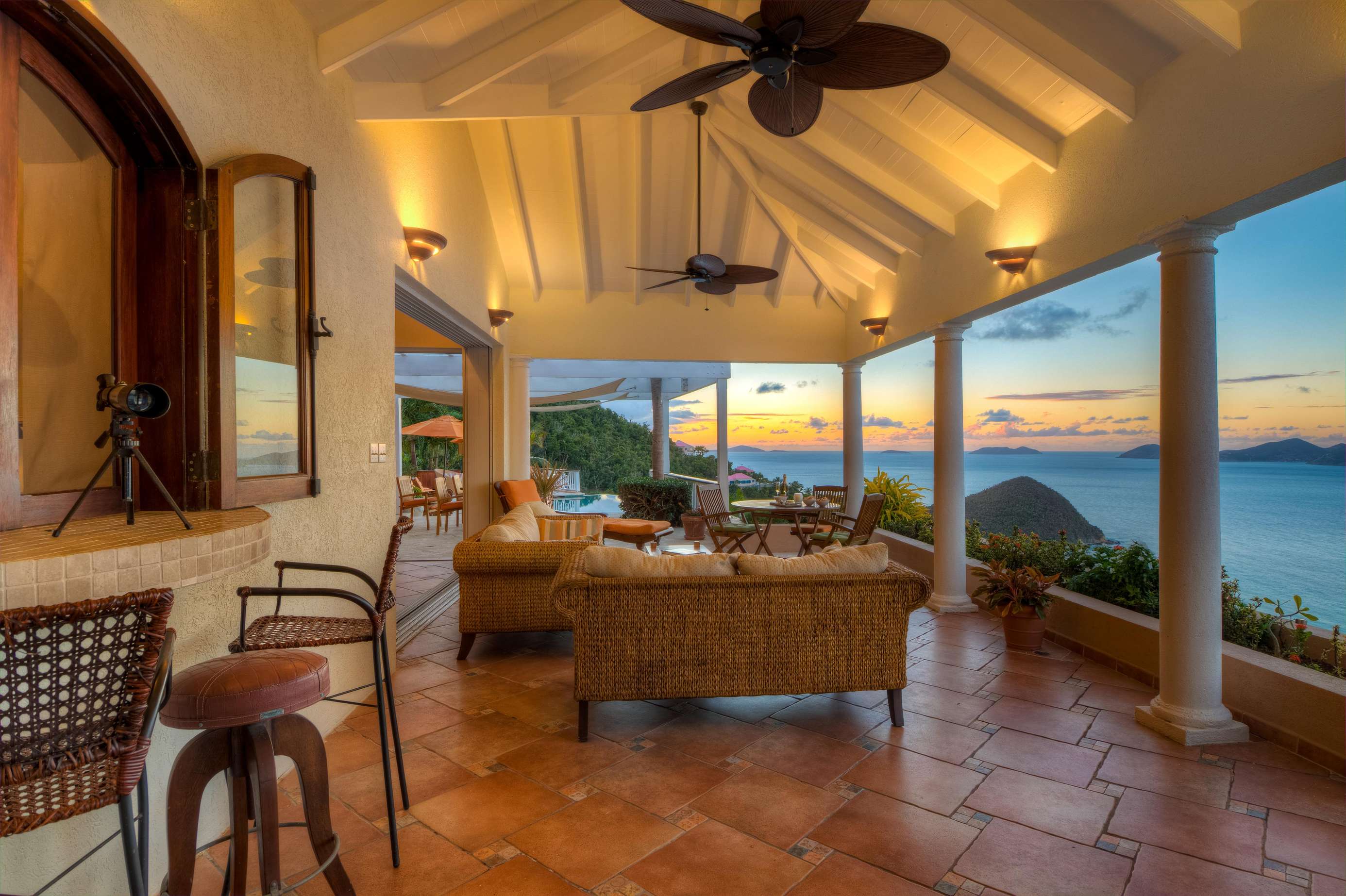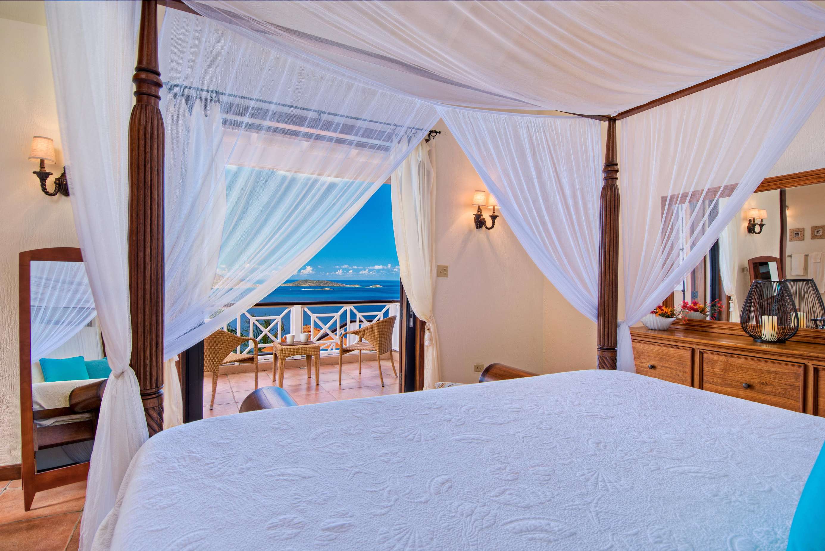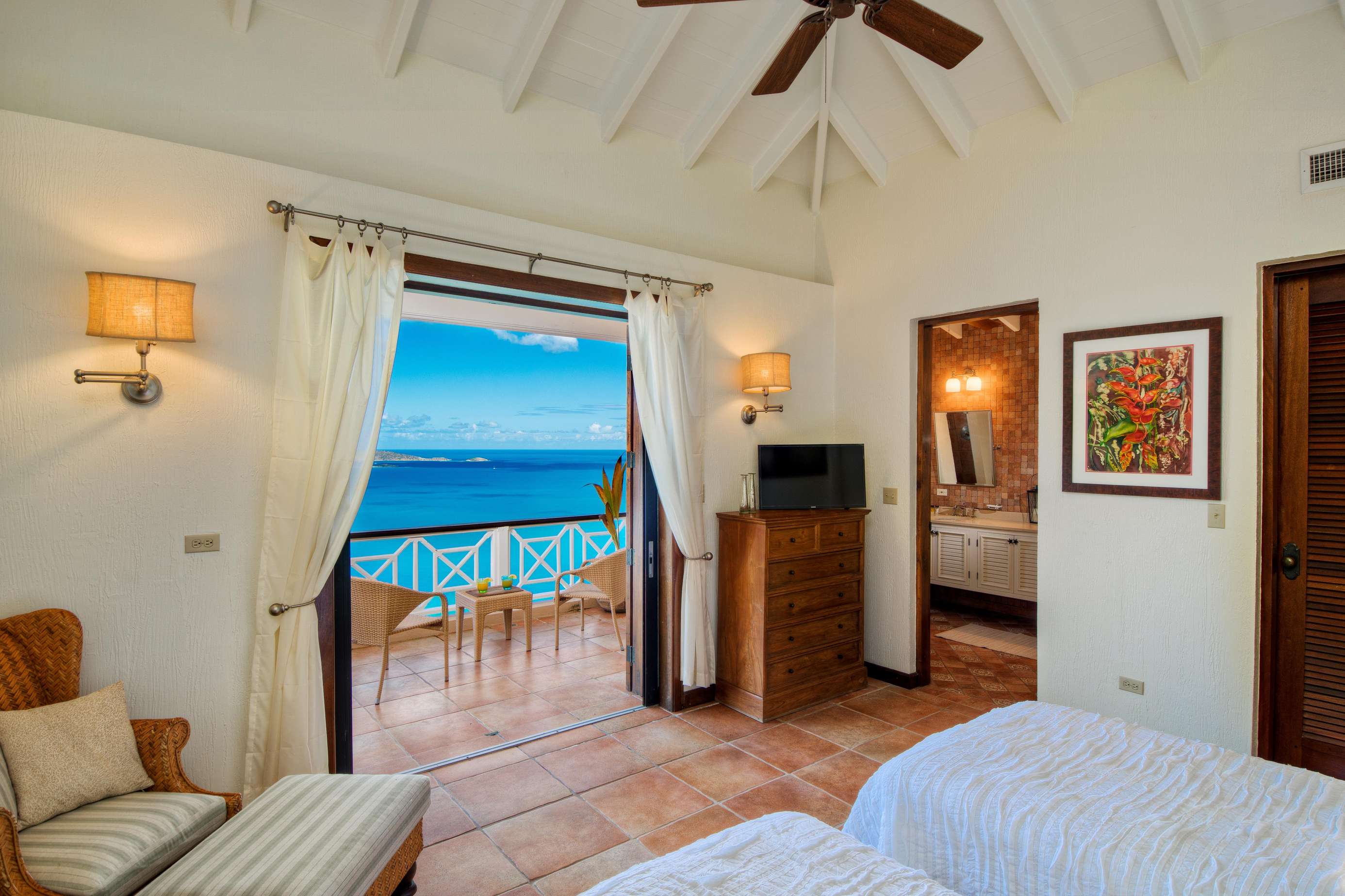 At the heart of the property is the Great House with large living space with both indoor and outdoor dining and living areas. Whether you choose to grab a sofa or bite to eat in either won’t affect your view as all have sweeping azure vistas. A gourmet kitchen with all the conveniences you would ever need (including a 6 burner viking stove, dishwasher, warming drawer and subzero refrigerator) connects the indoor formal dining area and living room.