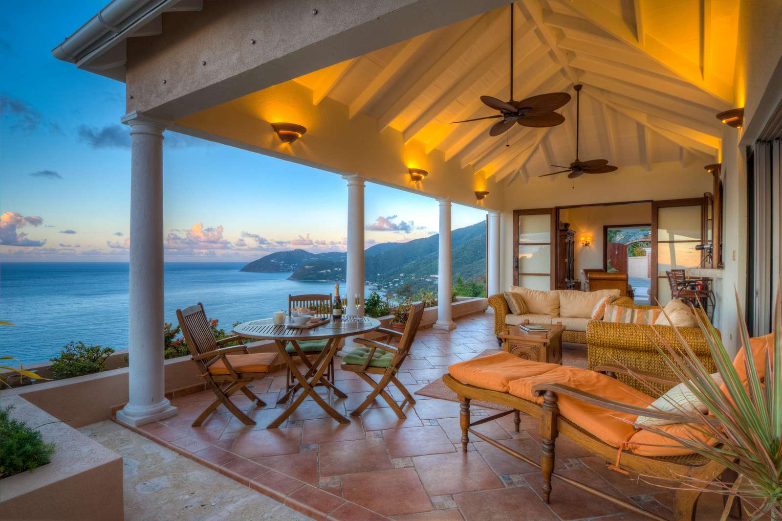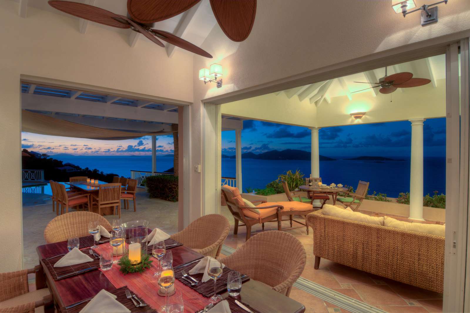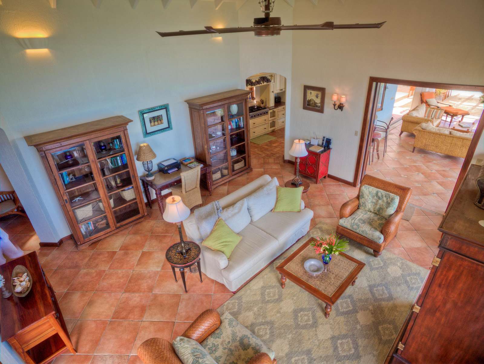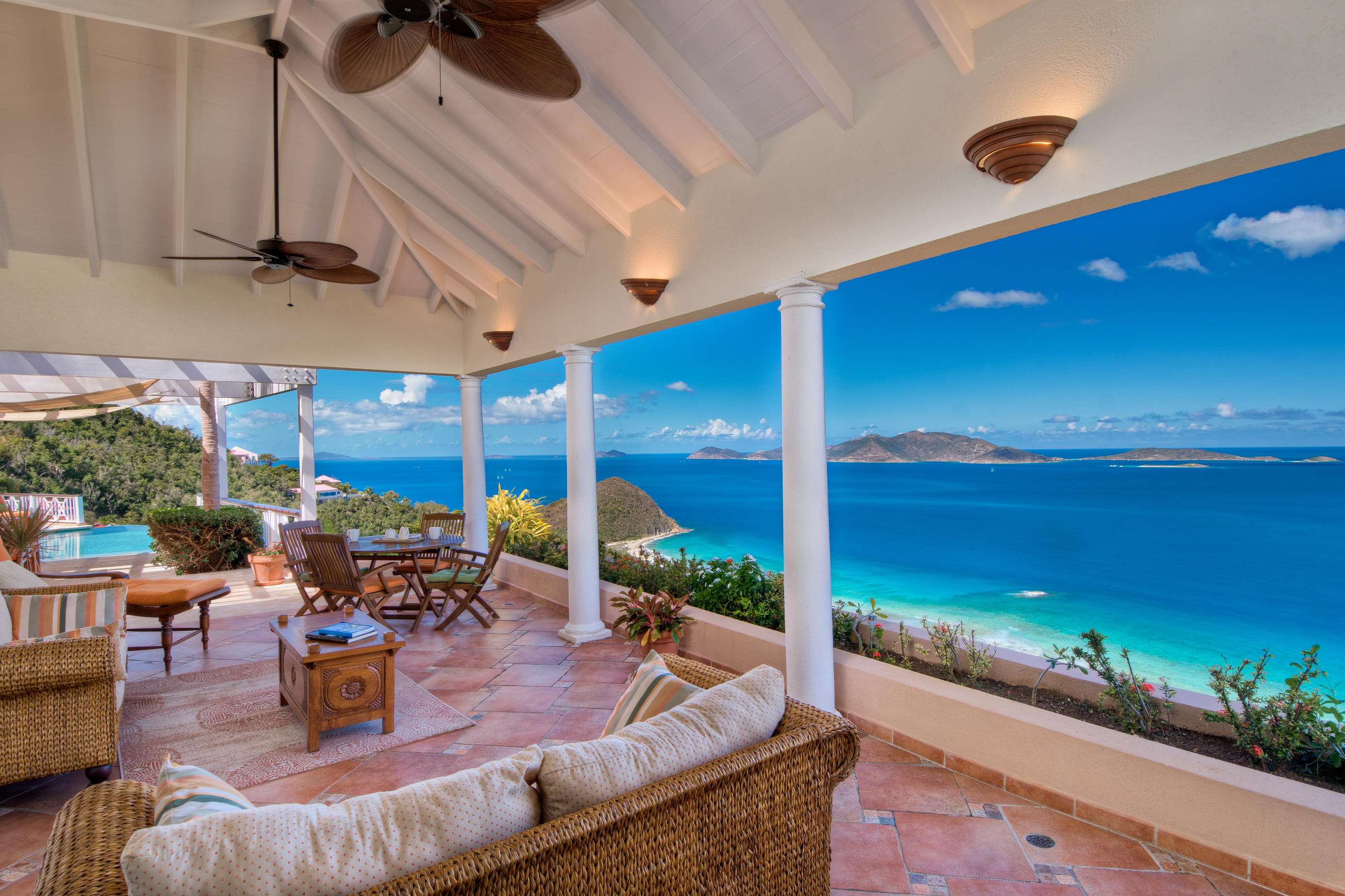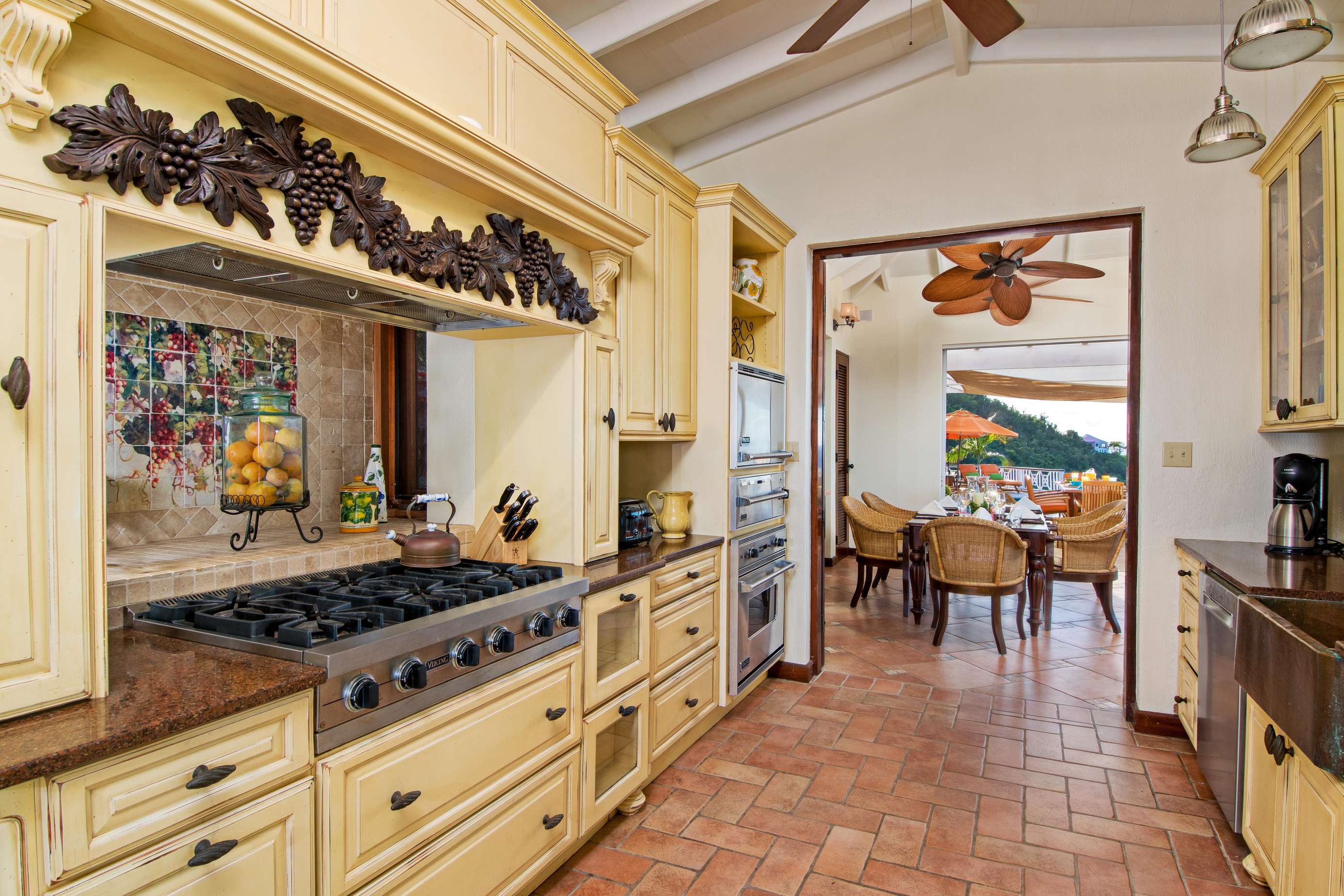 At the heart of the property is the Great House with large living space with both indoor and outdoor dining and living areas. Whether you choose to grab a sofa or bite to eat in either won’t affect your view as all have sweeping azure vistas. A gourmet kitchen with all the conveniences you would ever need (including a 6 burner viking stove, dishwasher, warming drawer and subzero refrigerator) connects the indoor formal dining area and living room.