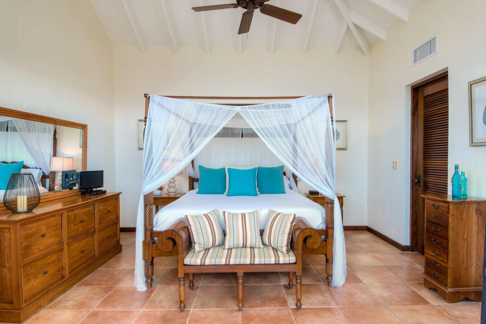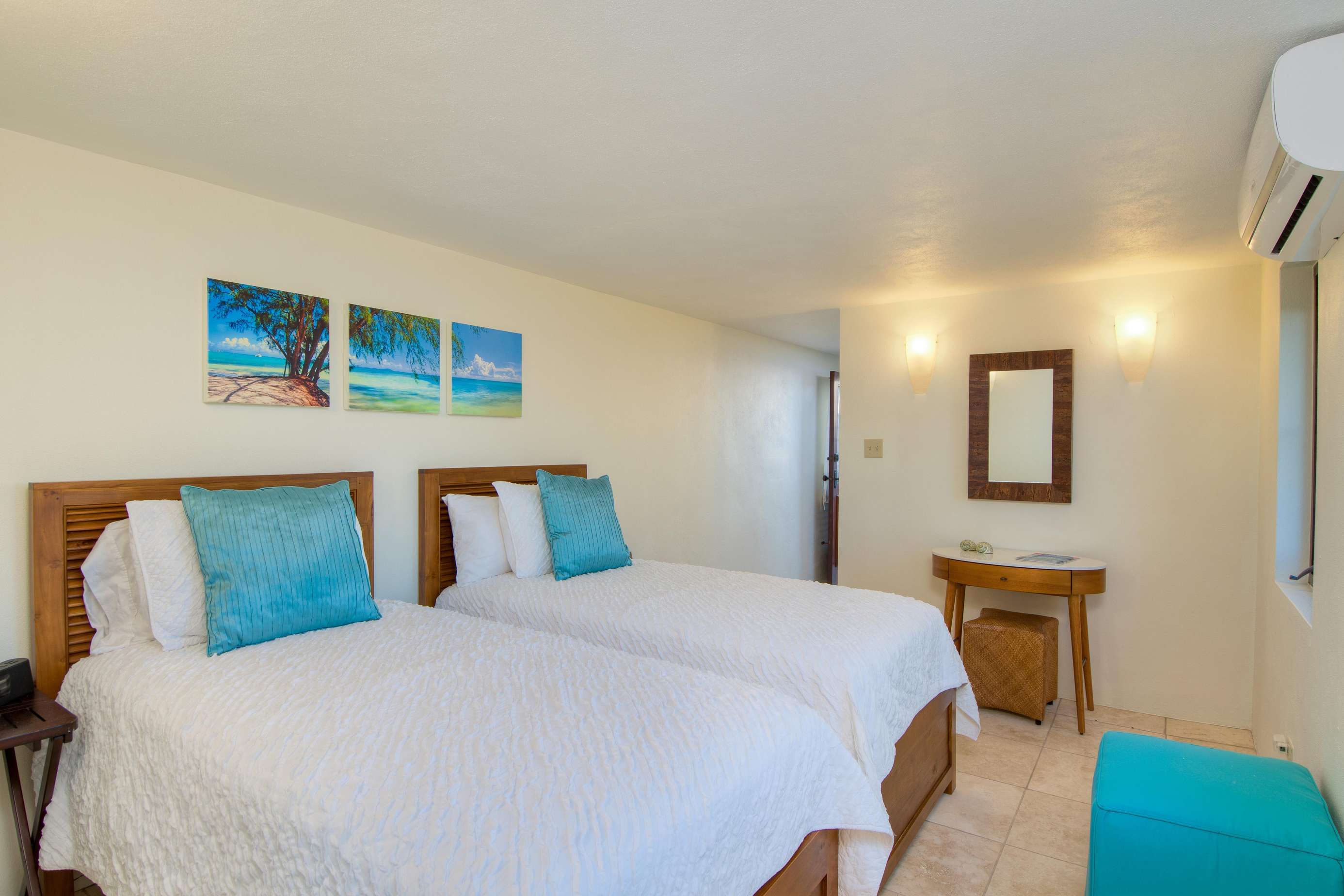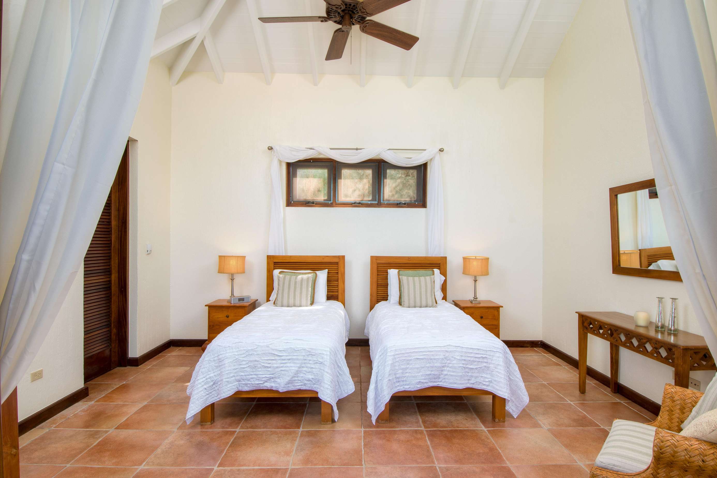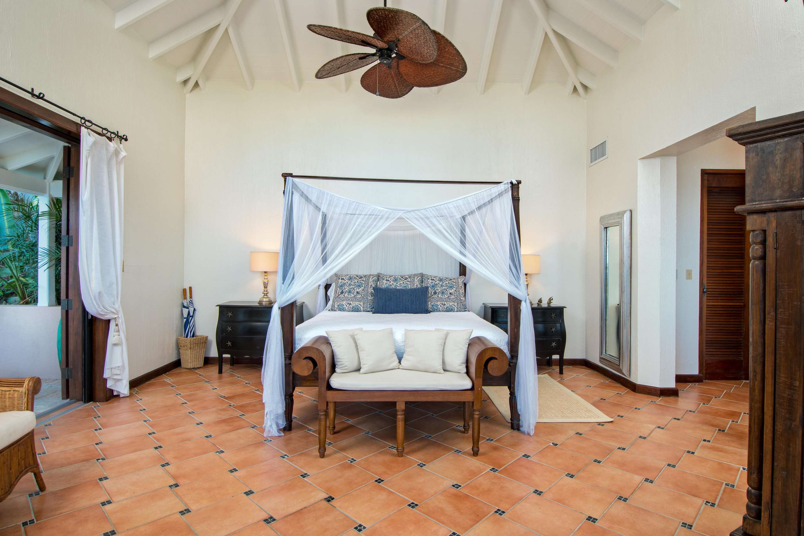 2&3) Two large and airy bedrooms lie at the heart of the estate in the Great House. In one bedroom there is a four poster king-sized bed with outdoor shower, the second bedroom has the convenience of two twin beds or a king sized bed with an indoor shower. These bedrooms both open onto a porch overlooking the infinity pool and the ocean view. The bedrooms can either be opened up to enjoy the sea breeze but also come with sliding screens and air-conditioning for those important cool down periods after enjoying the Caribbean sun.
