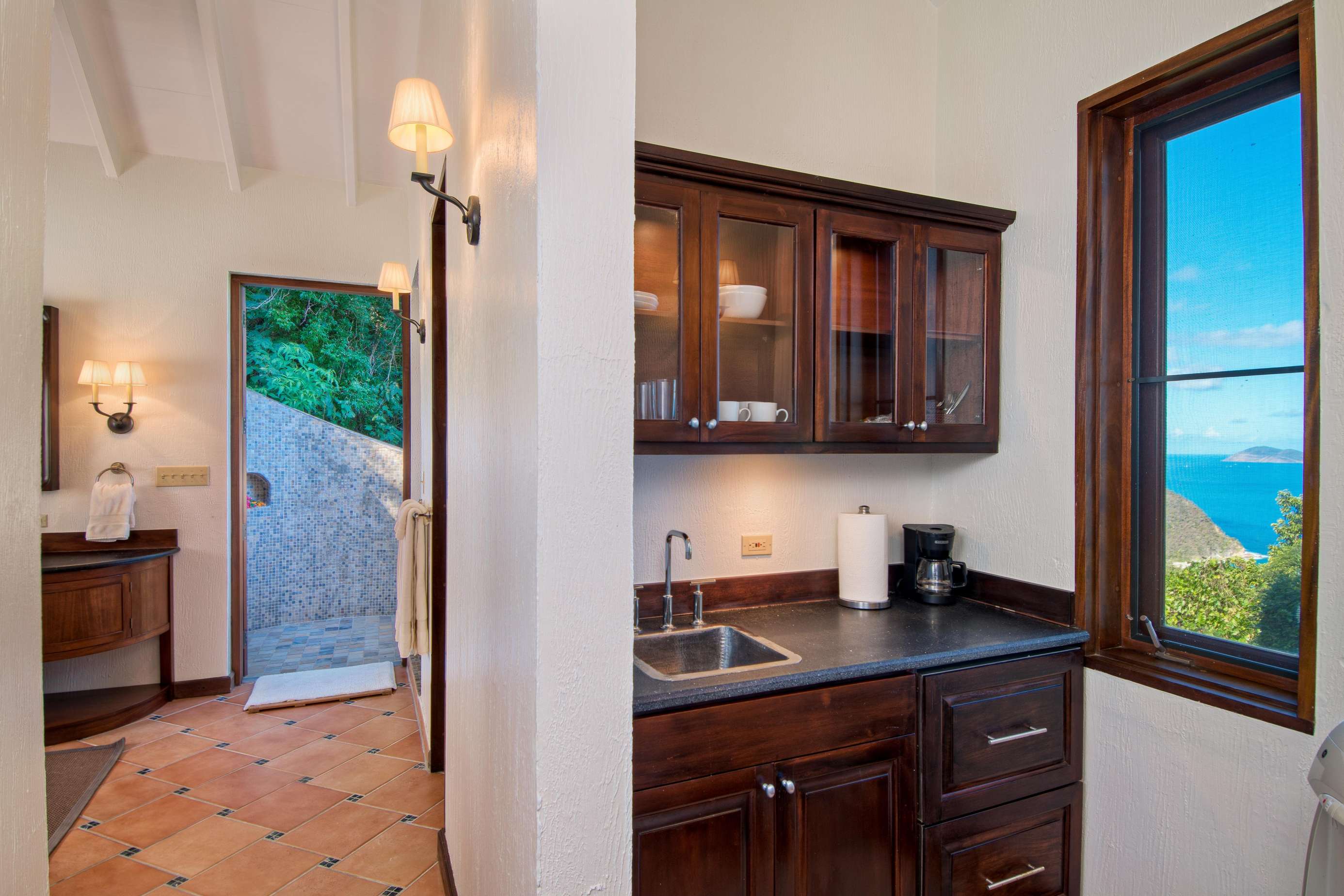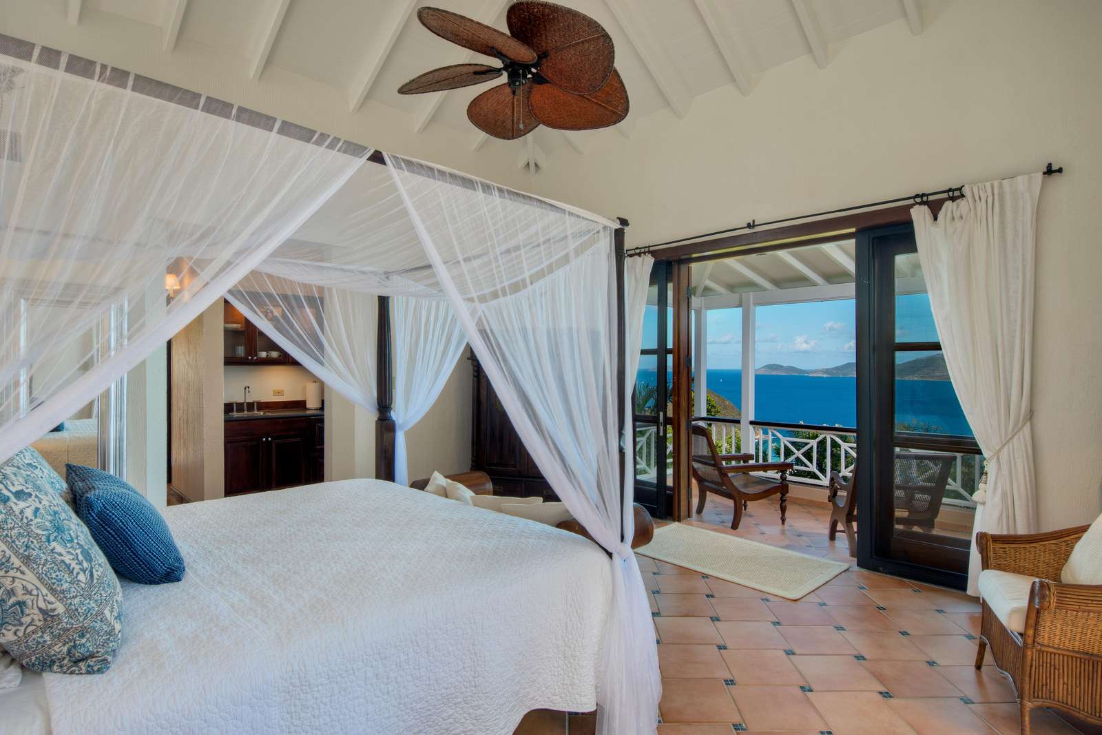 1) Vine cottage is a short sunlight-filled stroll past the pool and is the large primary suite with a king-sized four poster bed looking out onto the ocean and Jost Van Dyke. The ensuite includes both indoor and outdoor showers (showering with a soundscape of birds and tree frogs never gets old). There is a kitchenette and a private veranda overlooking the glimmering ocean making it a private and self-contained suite.