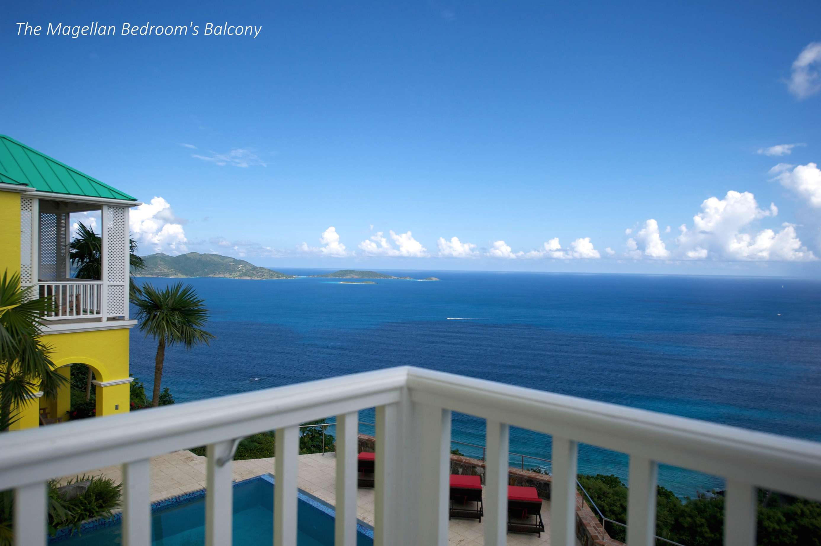 The MAGELLAN is on the upper level of main house and has a choice of king or two twin beds, and is ensuite with shower. There is a “Juliet balcony” overlooking pool with expansive views. It is at the opposite end of a hallway from the Marco Polo which makes it ideal for parents and younger children.