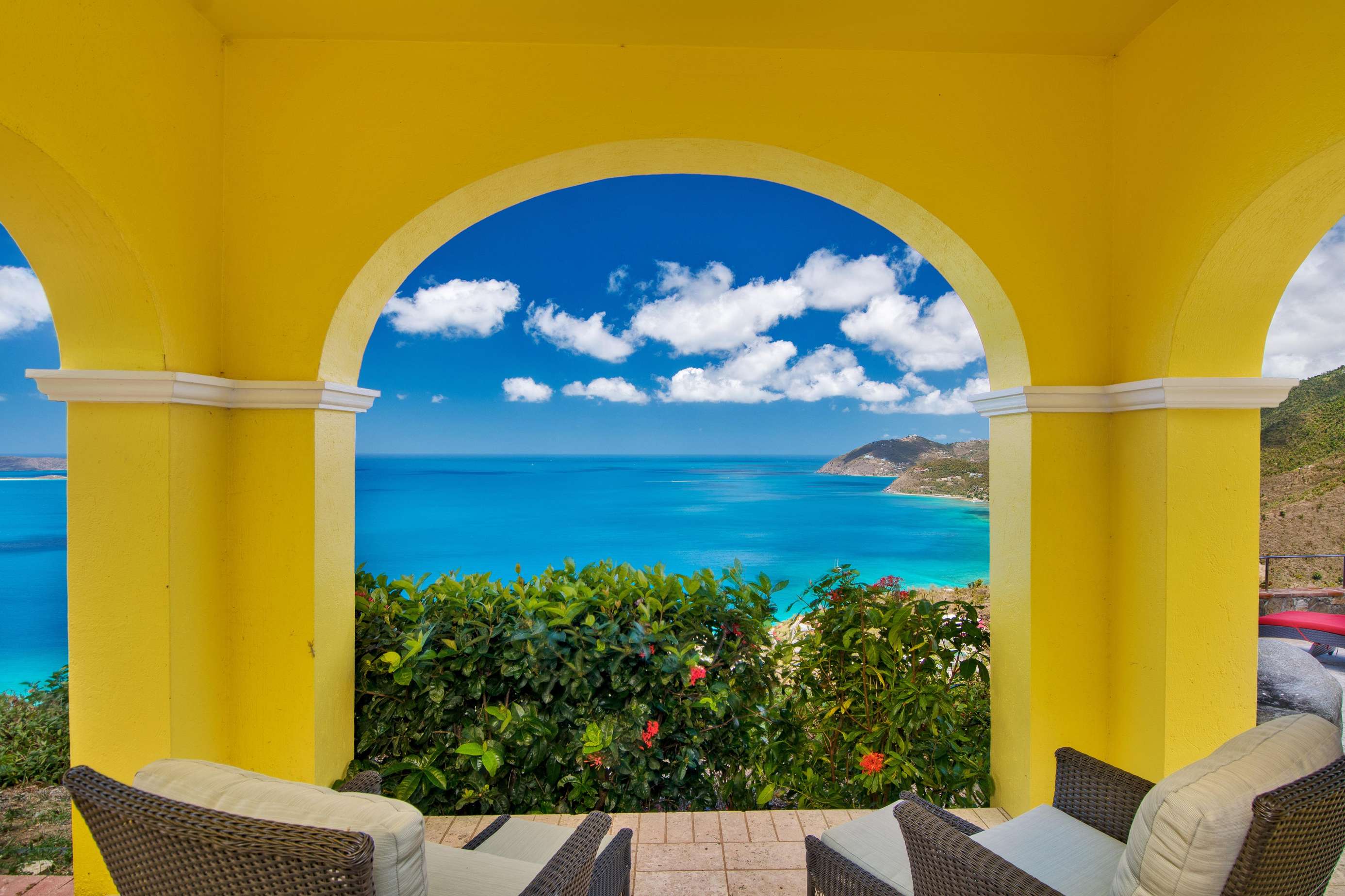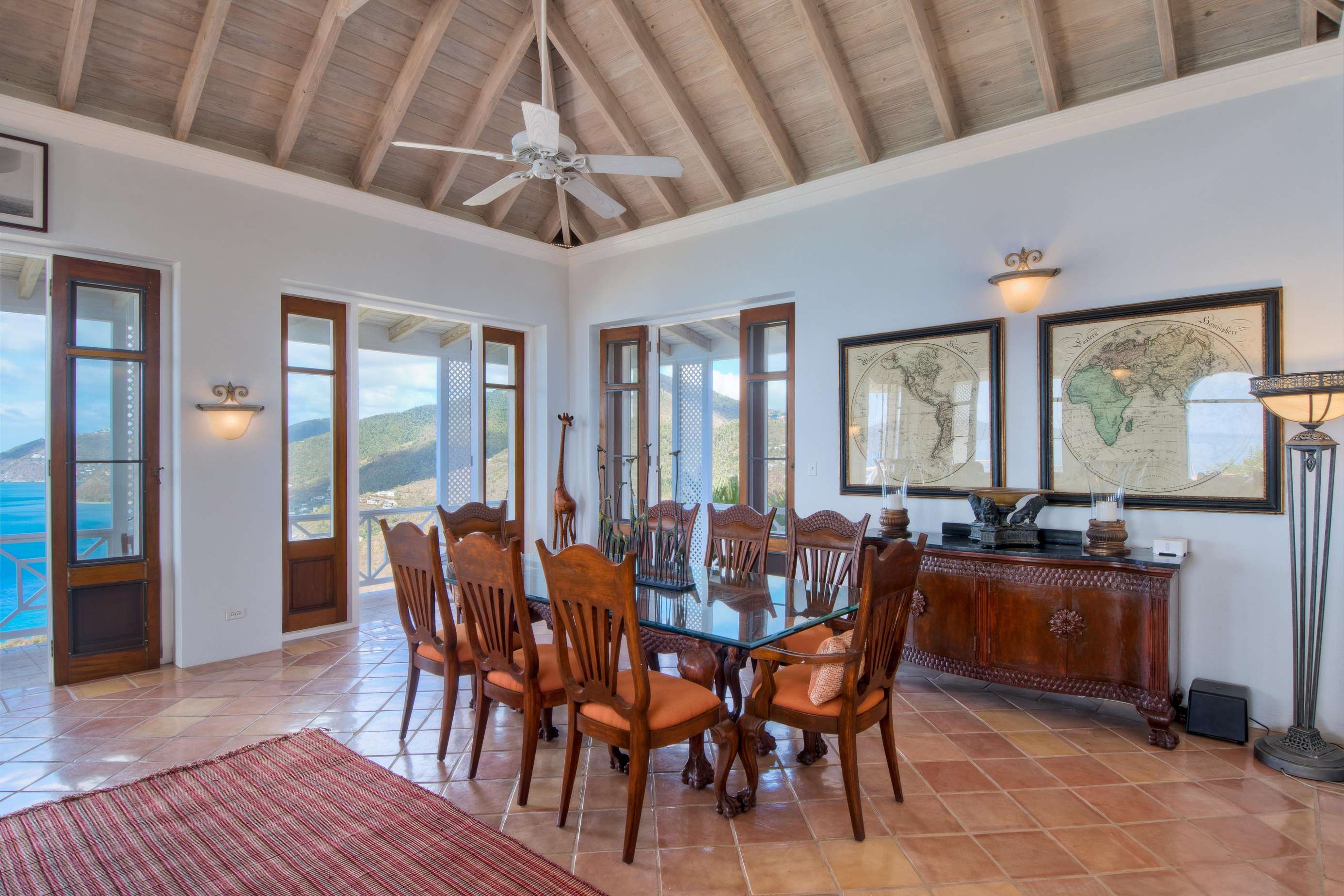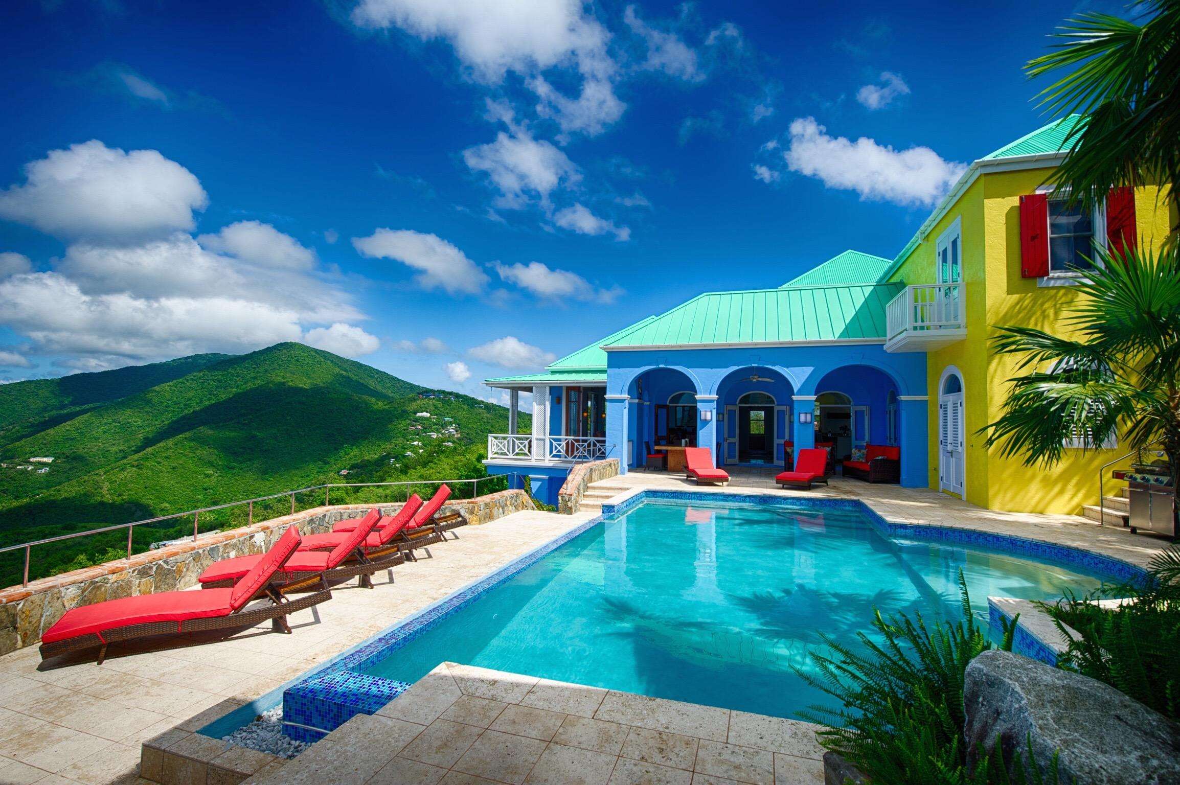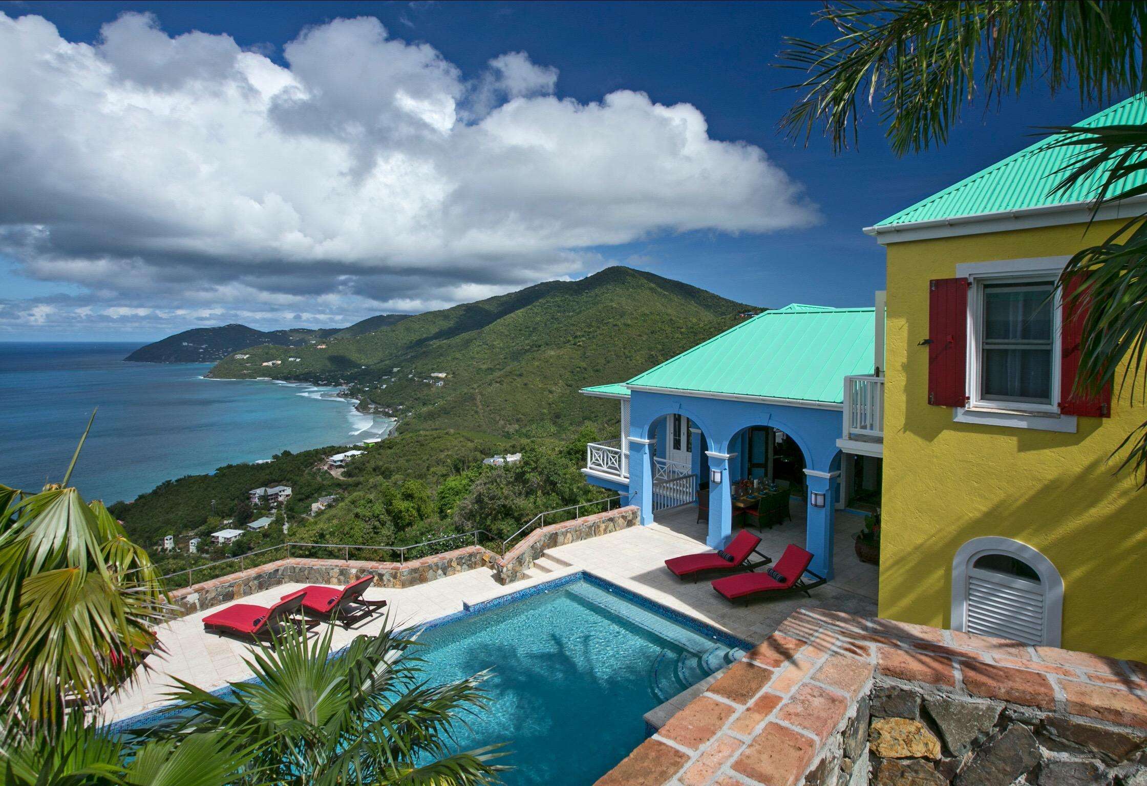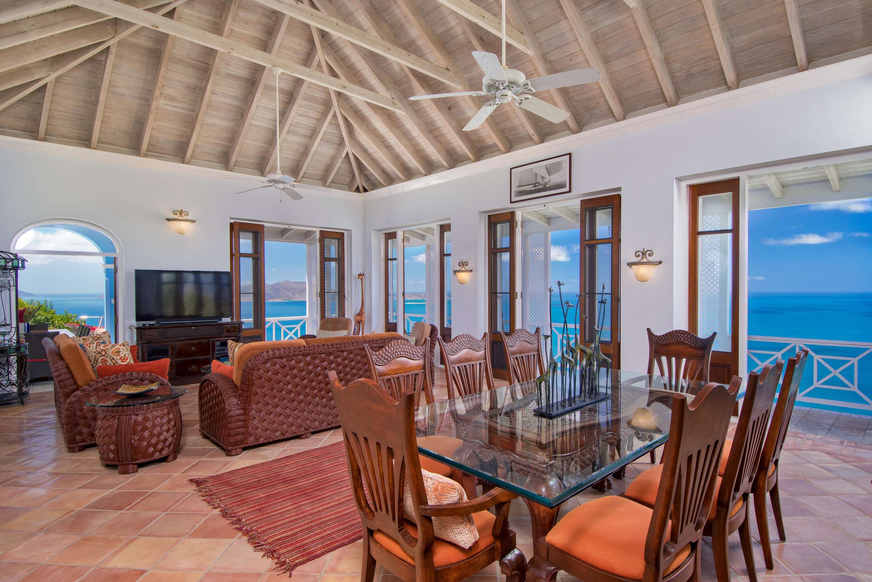 The first floors of the main house and guest house, the shaded veranda, the large pool, the guest bathroom and parking are all set on the same level, unusual on our mountainous island and perfect for socializing with a larger group. The main house contains the ballroom-sized Great Room and separate office. Enjoy the game on the big screen or your music on the Sonos sound system from the ample supply of comfortable seating. Packed with light & air, the living and dining areas feature six sets of 9' high French doors that open to the terrace running along three sides allowing indoor/outdoor living. The view from here is simply stunning.