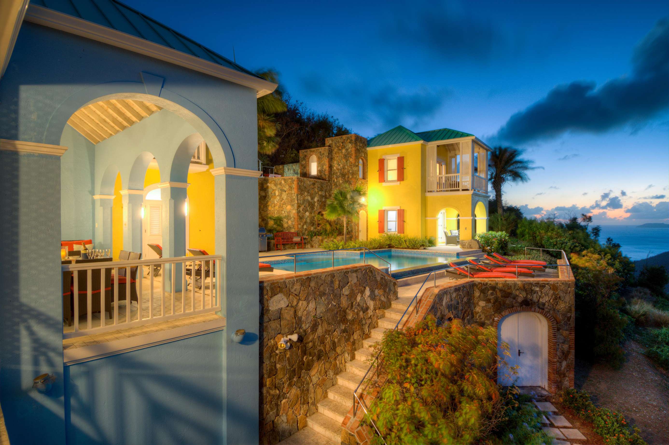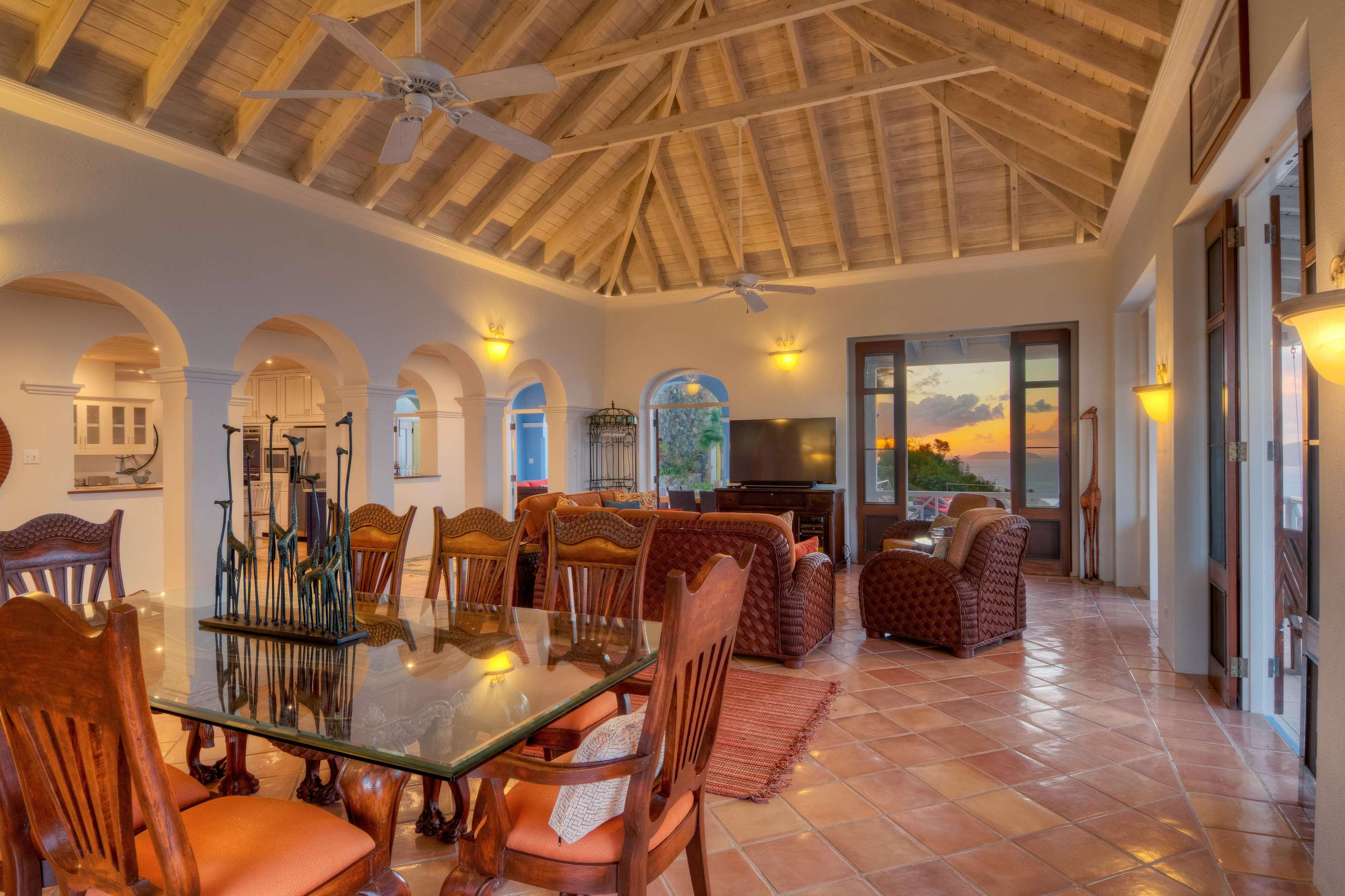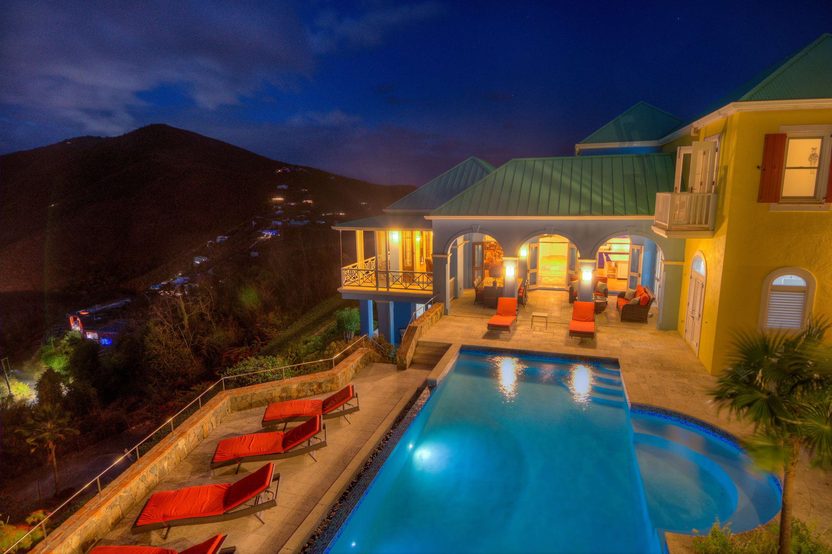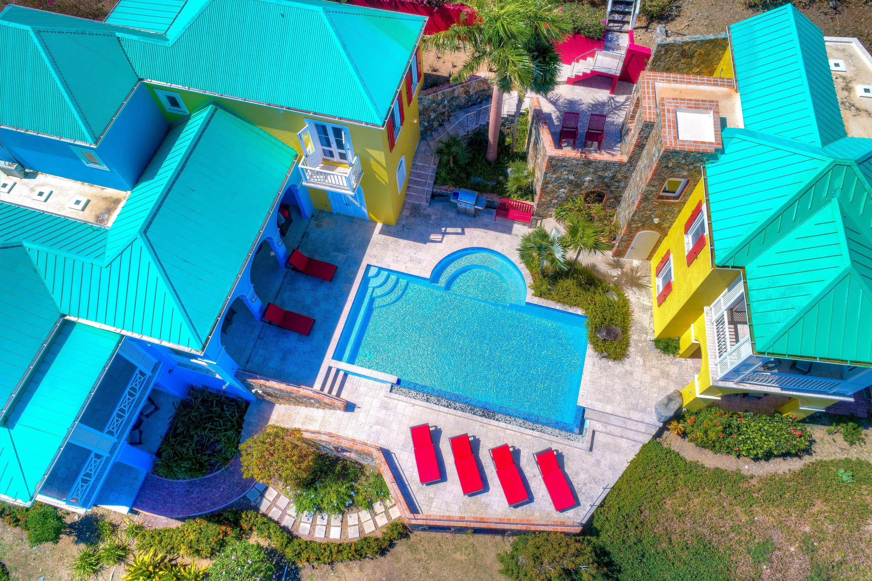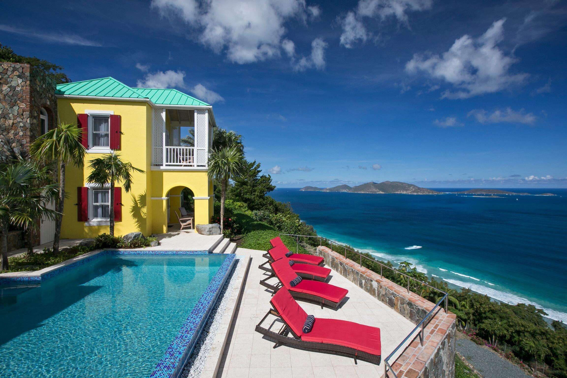 The first floors of the main house and guest house, the shaded veranda, the large pool, the guest bathroom and parking are all set on the same level, unusual on our mountainous island and perfect for socializing with a larger group. The main house contains the ballroom-sized Great Room and separate office. Enjoy the game on the big screen or your music on the Sonos sound system from the ample supply of comfortable seating. Packed with light & air, the living and dining areas feature six sets of 9' high French doors that open to the terrace running along three sides allowing indoor/outdoor living. The view from here is simply stunning.