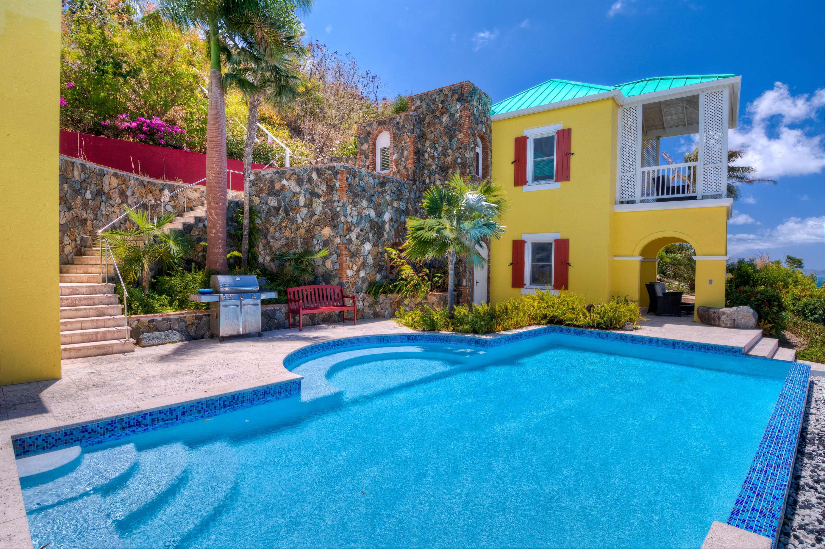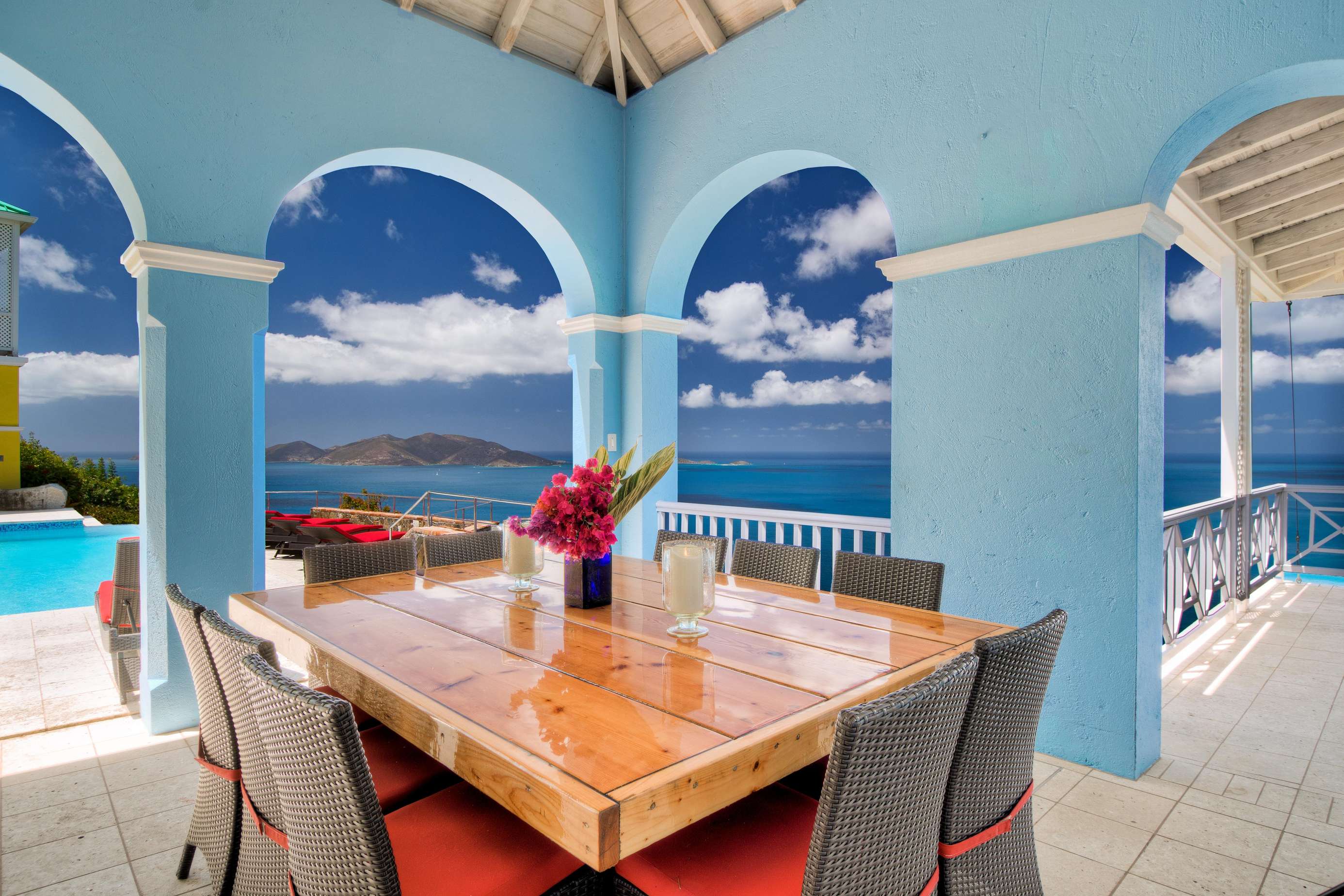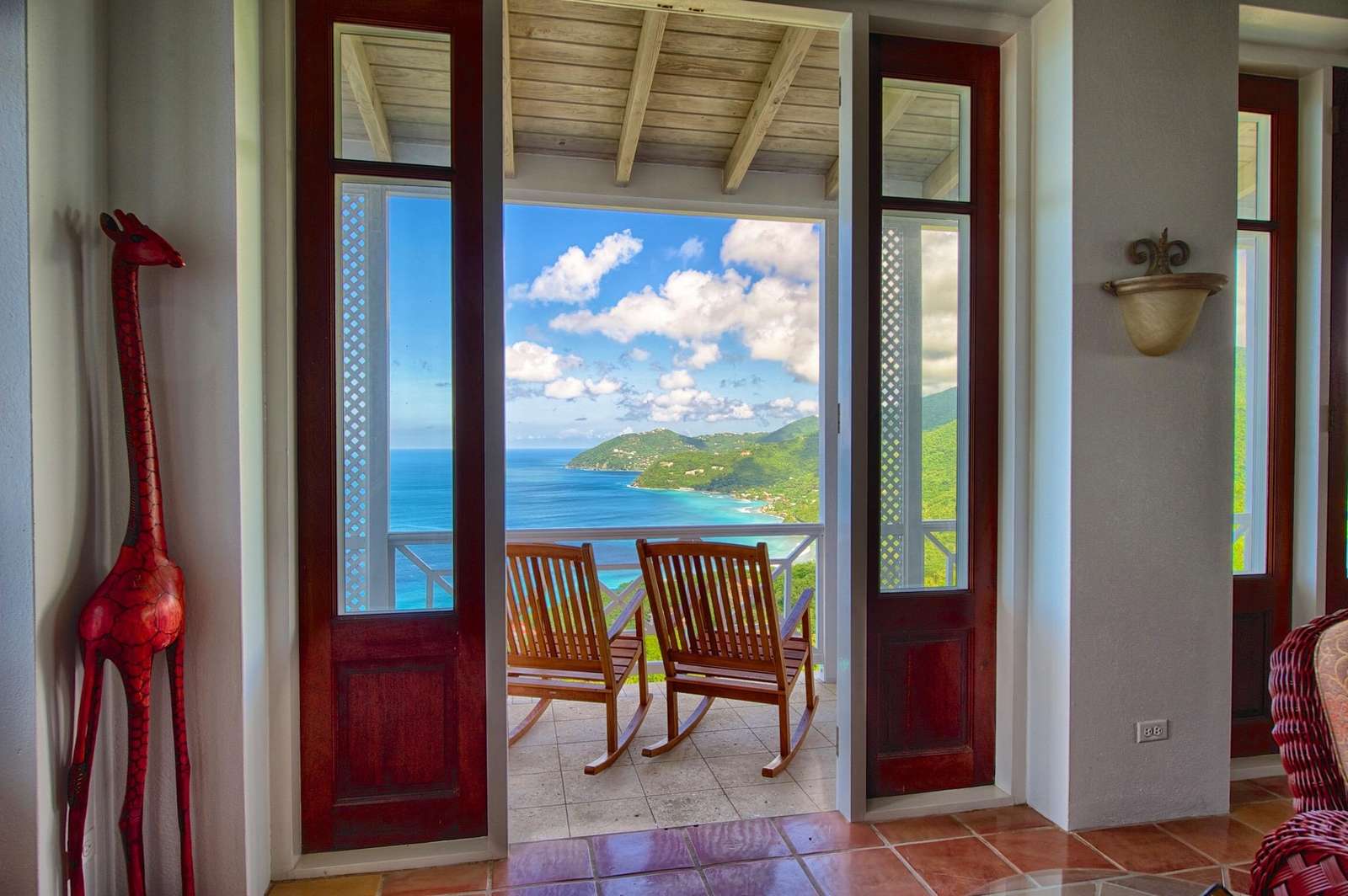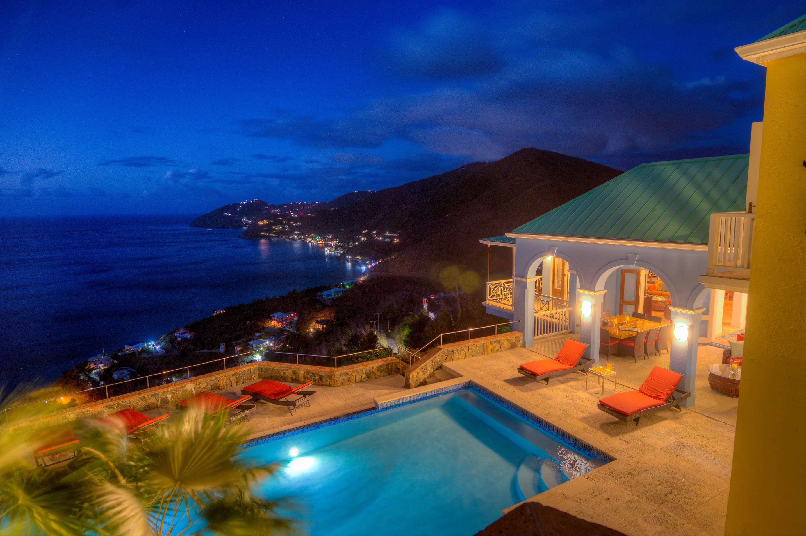 The first floors of the main house and guest house, the shaded veranda, the large pool, the guest bathroom and parking are all set on the same level, unusual on our mountainous island and perfect for socializing with a larger group. The main house contains the ballroom-sized Great Room and separate office. Enjoy the game on the big screen or your music on the Sonos sound system from the ample supply of comfortable seating. Packed with light & air, the living and dining areas feature six sets of 9' high French doors that open to the terrace running along three sides allowing indoor/outdoor living. The view from here is simply stunning.