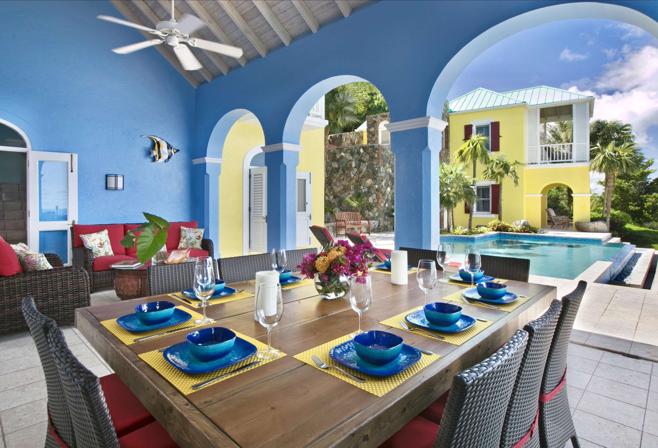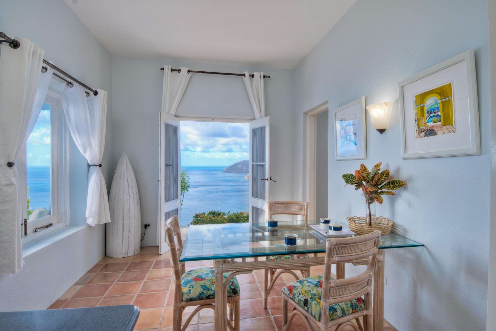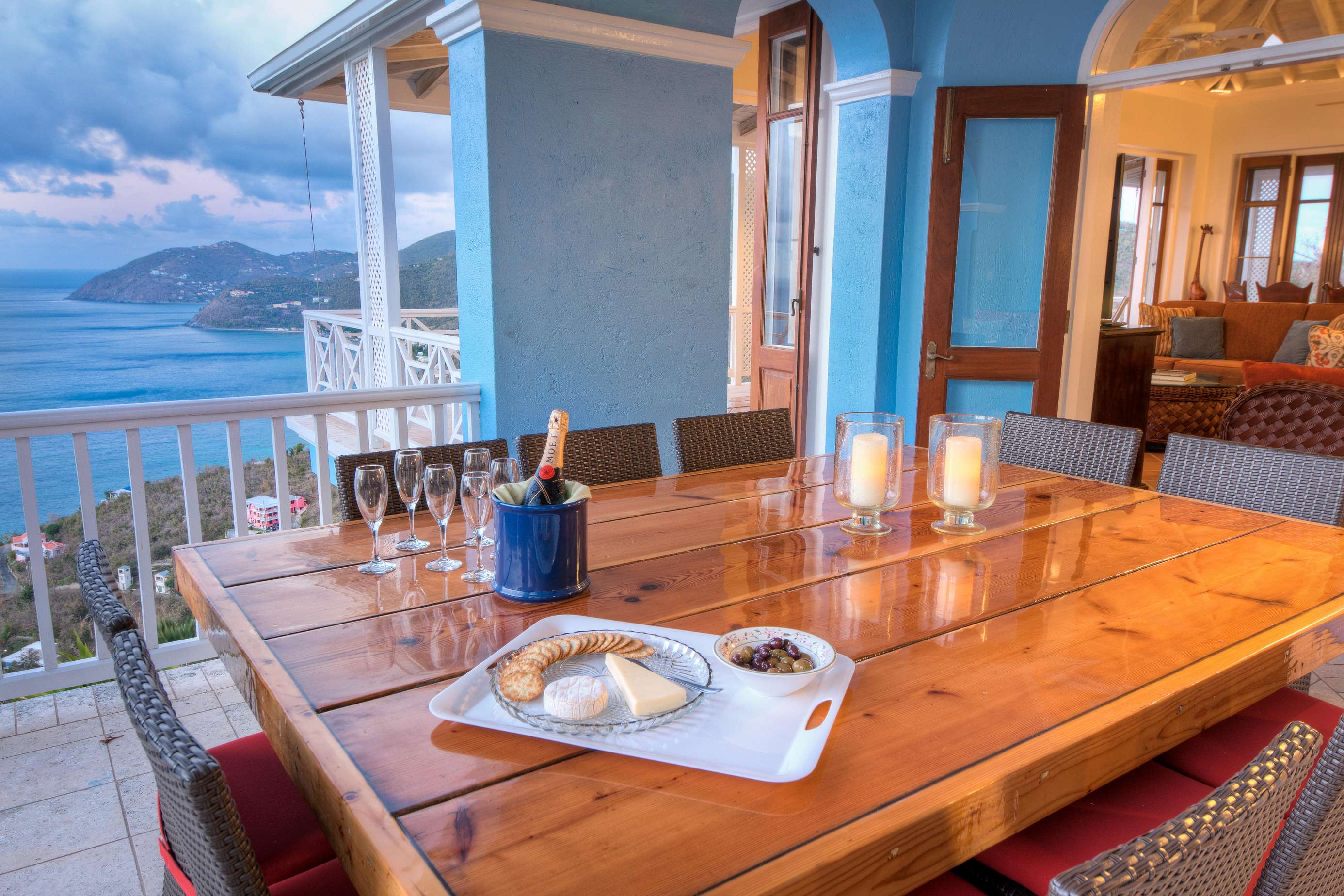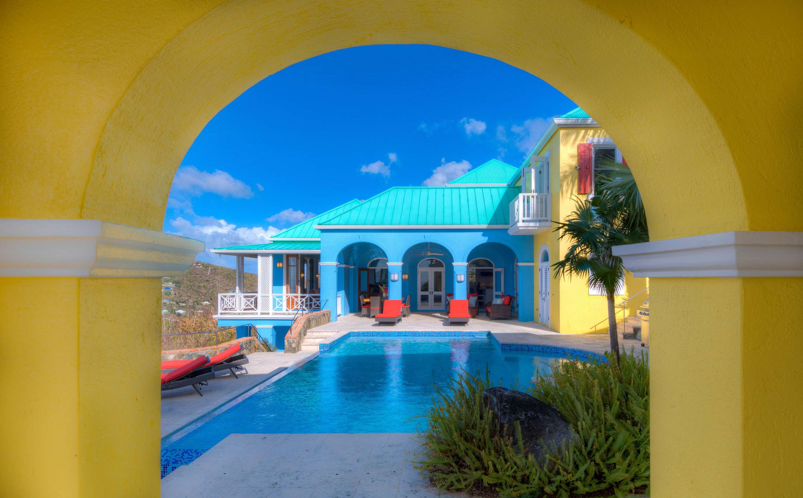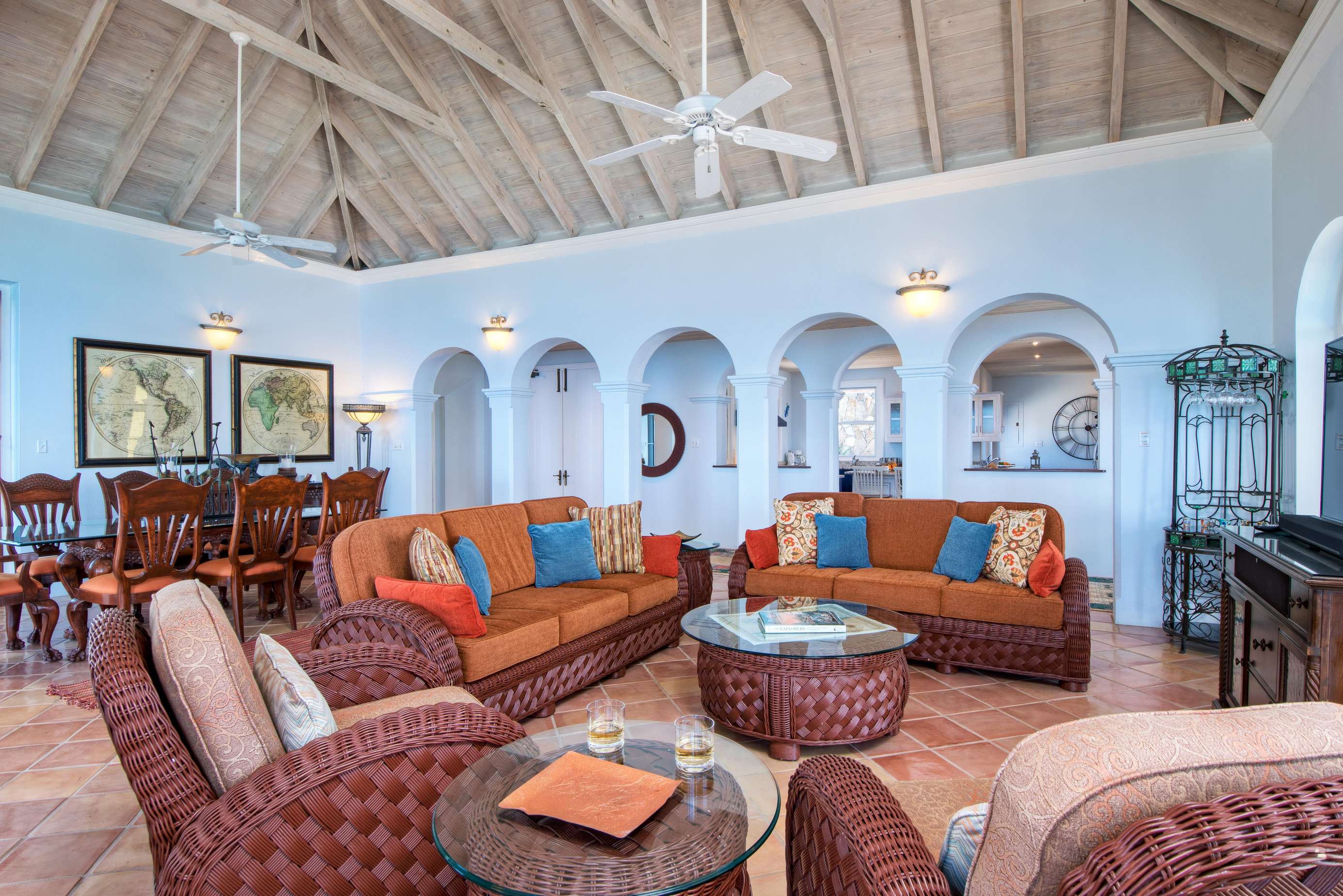 The first floors of the main house and guest house, the shaded veranda, the large pool, the guest bathroom and parking are all set on the same level, unusual on our mountainous island and perfect for socializing with a larger group. The main house contains the ballroom-sized Great Room and separate office. Enjoy the game on the big screen or your music on the Sonos sound system from the ample supply of comfortable seating. Packed with light & air, the living and dining areas feature six sets of 9' high French doors that open to the terrace running along three sides allowing indoor/outdoor living. The view from here is simply stunning.