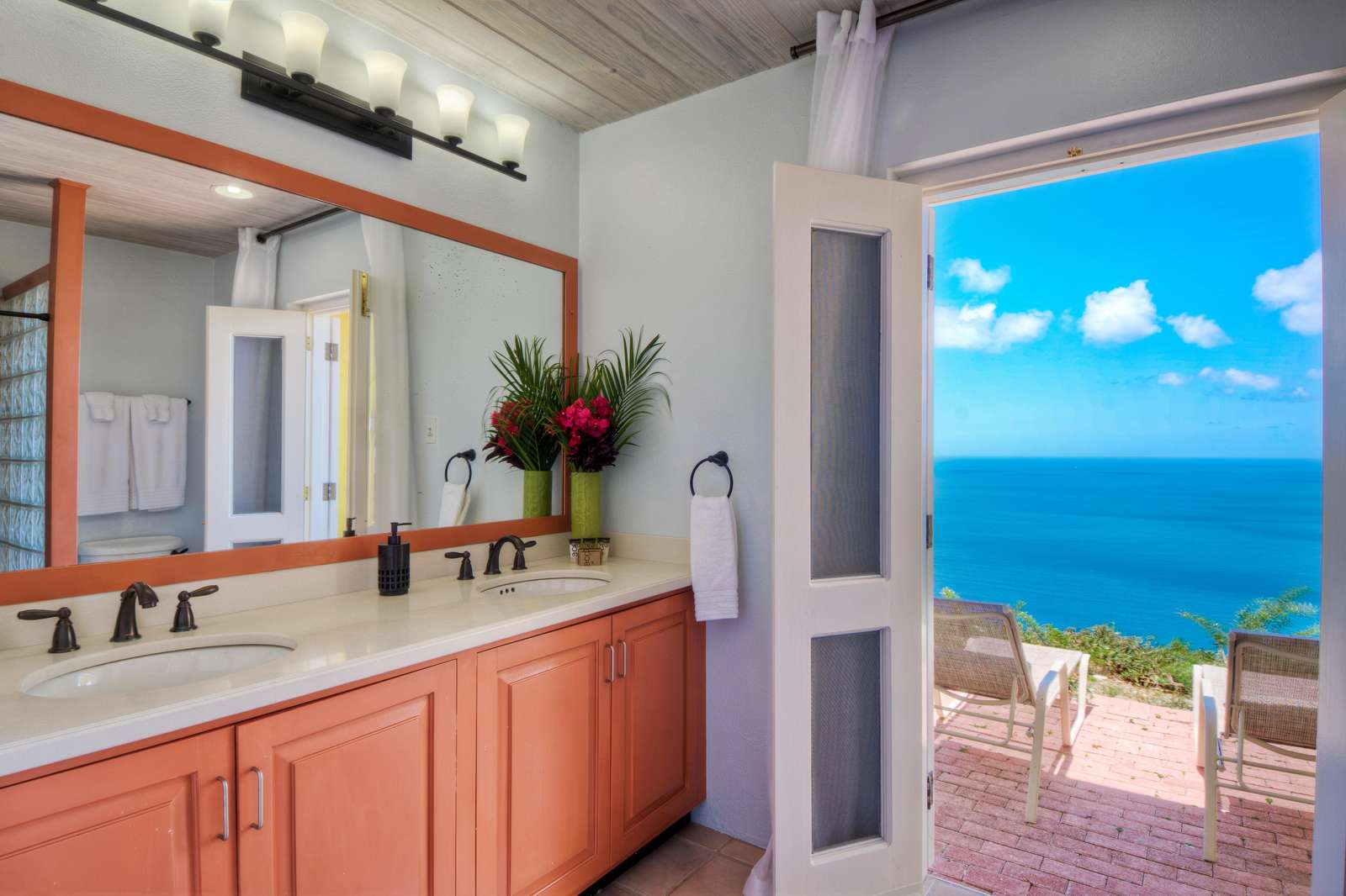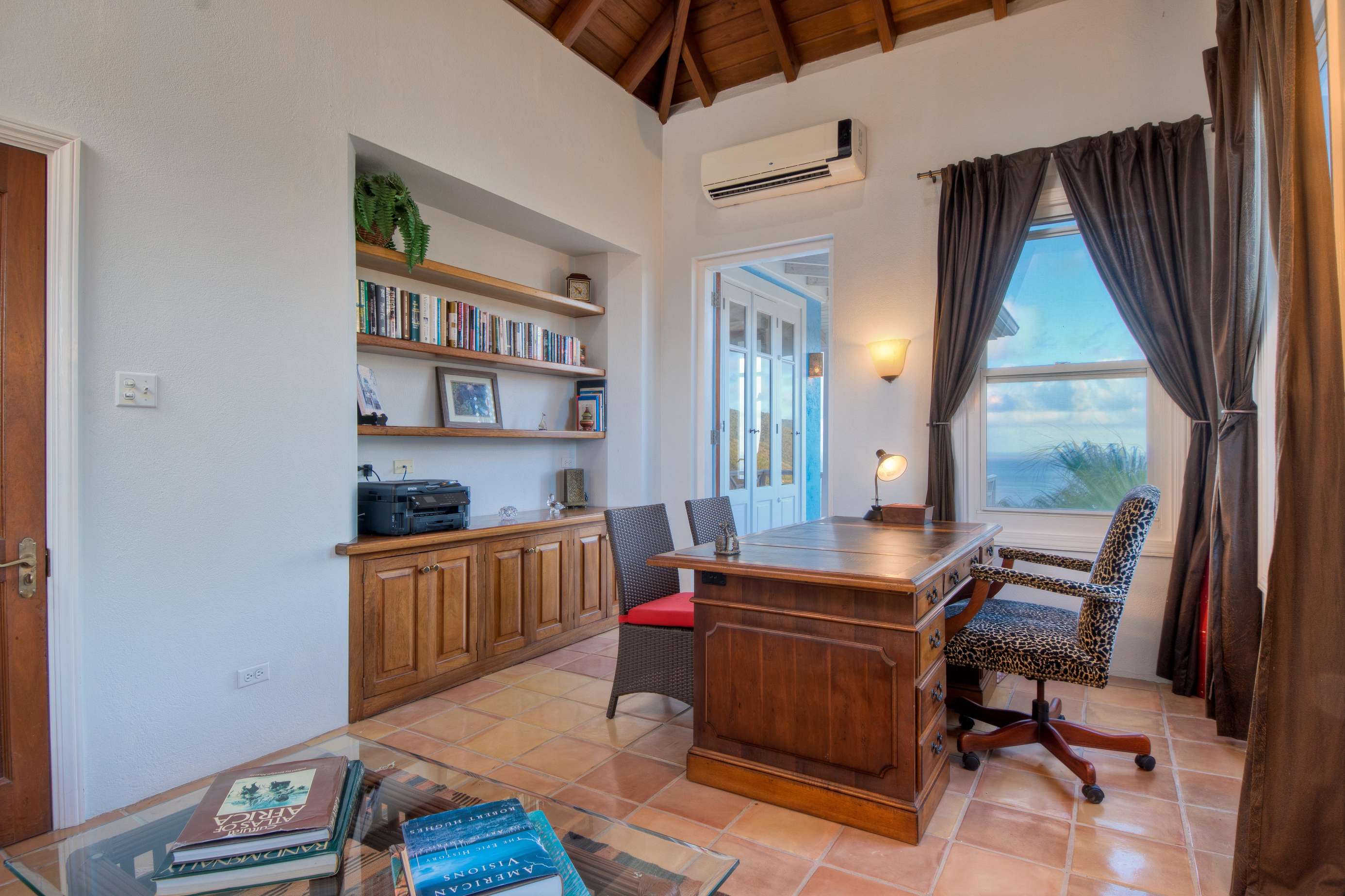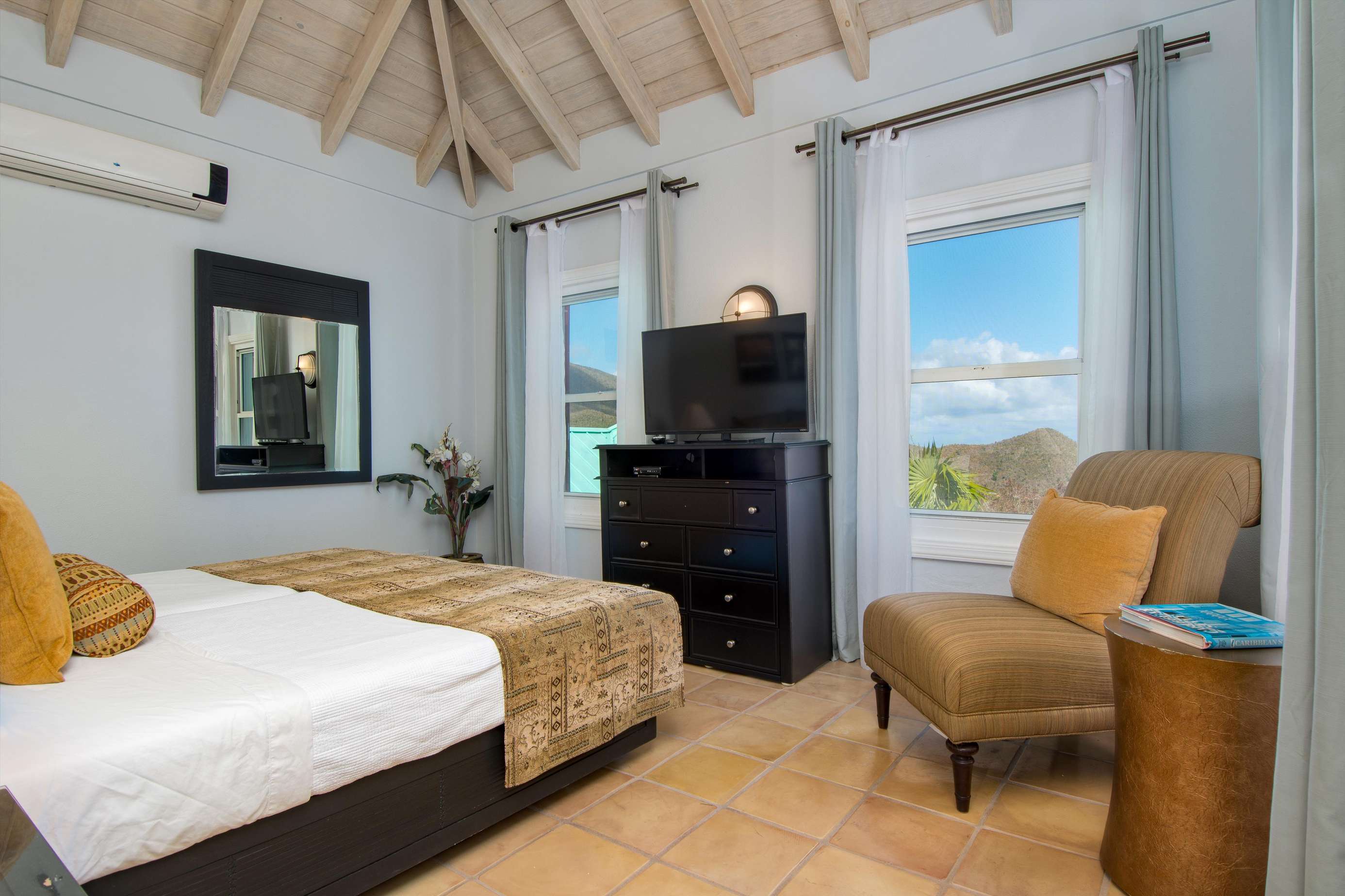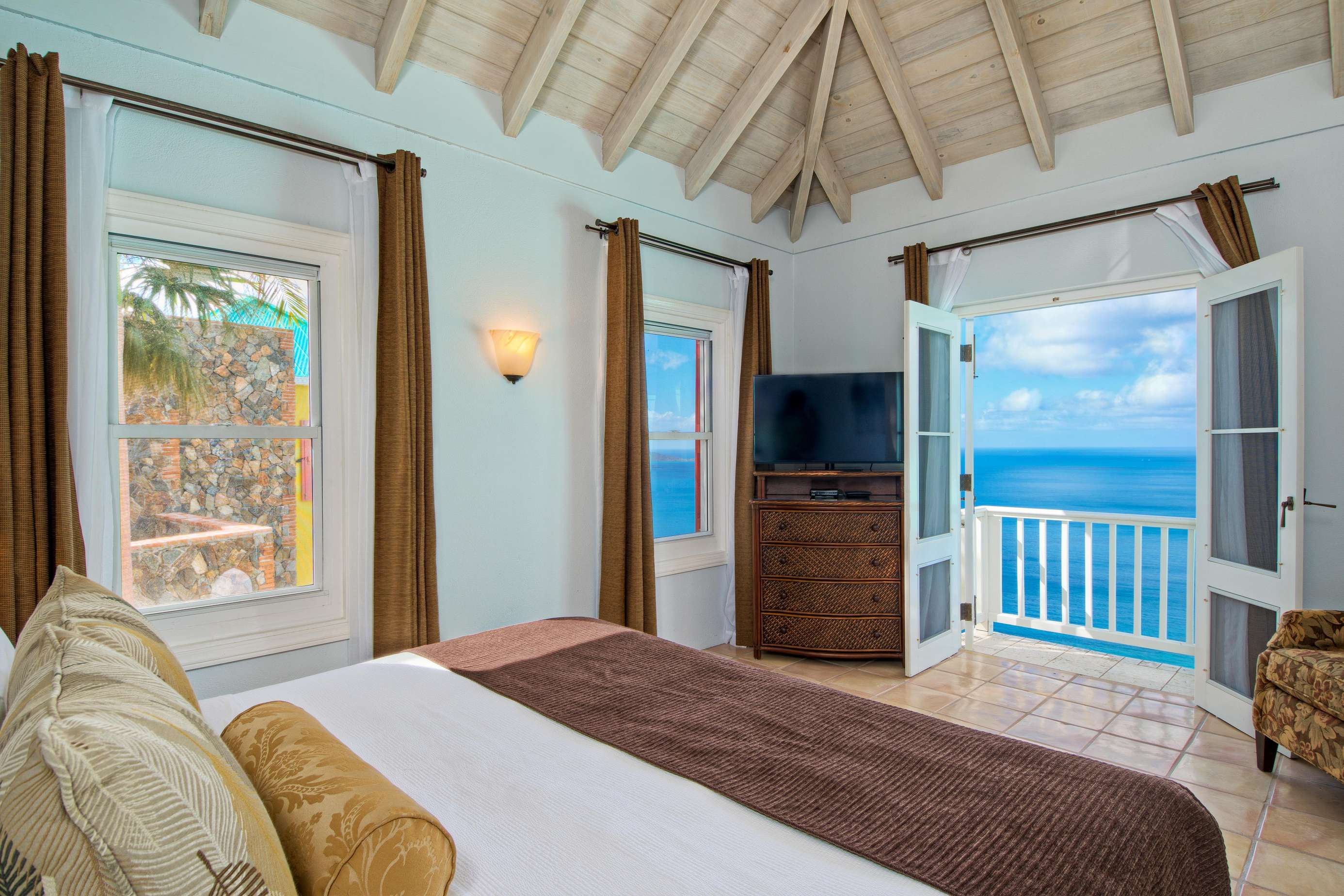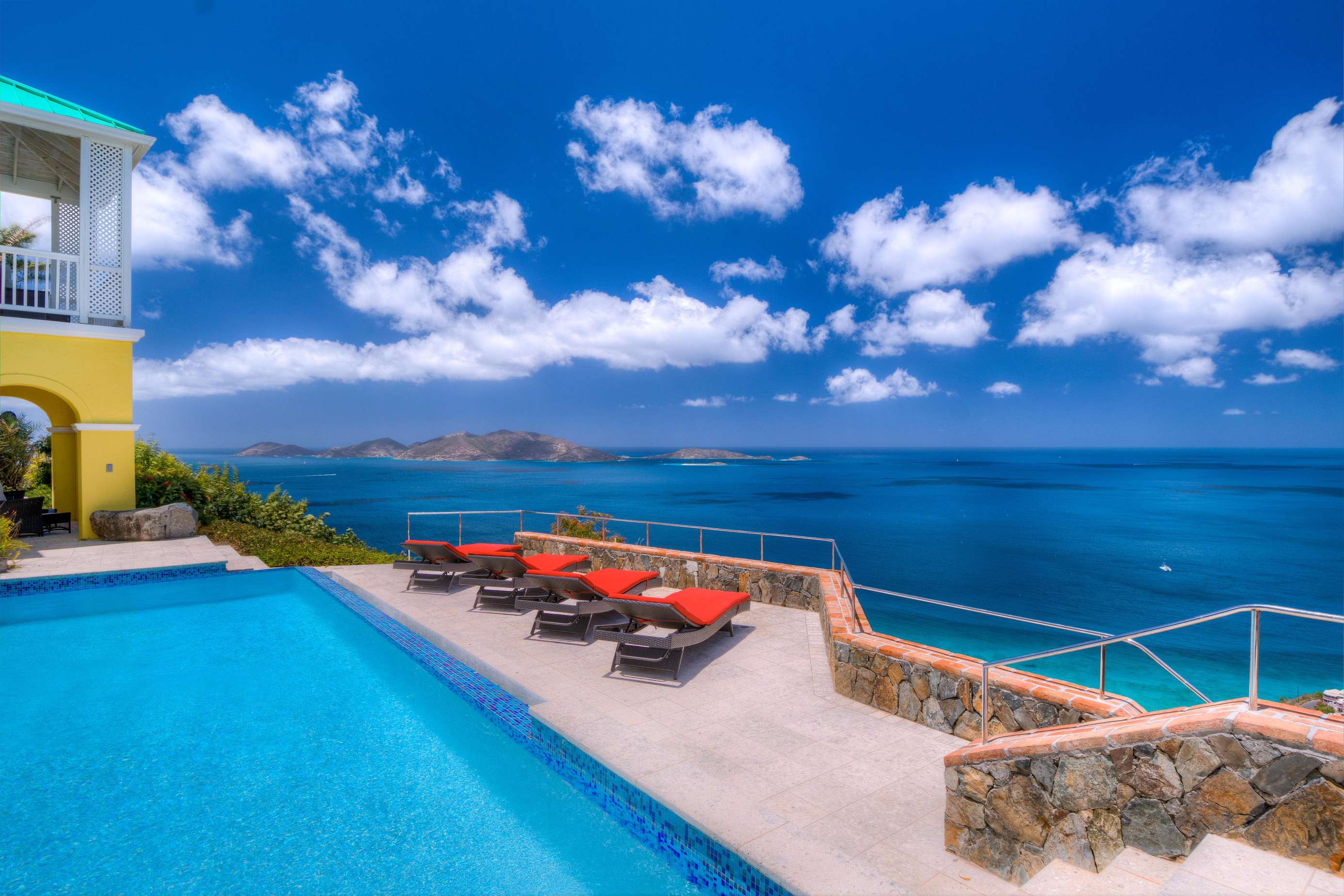 The first floors of the main house and guest house, the shaded veranda, the large pool, the guest bathroom and parking are all set on the same level, unusual on our mountainous island and perfect for socializing with a larger group. The main house contains the ballroom-sized Great Room and separate office. Enjoy the game on the big screen or your music on the Sonos sound system from the ample supply of comfortable seating. Packed with light & air, the living and dining areas feature six sets of 9' high French doors that open to the terrace running along three sides allowing indoor/outdoor living. The view from here is simply stunning.