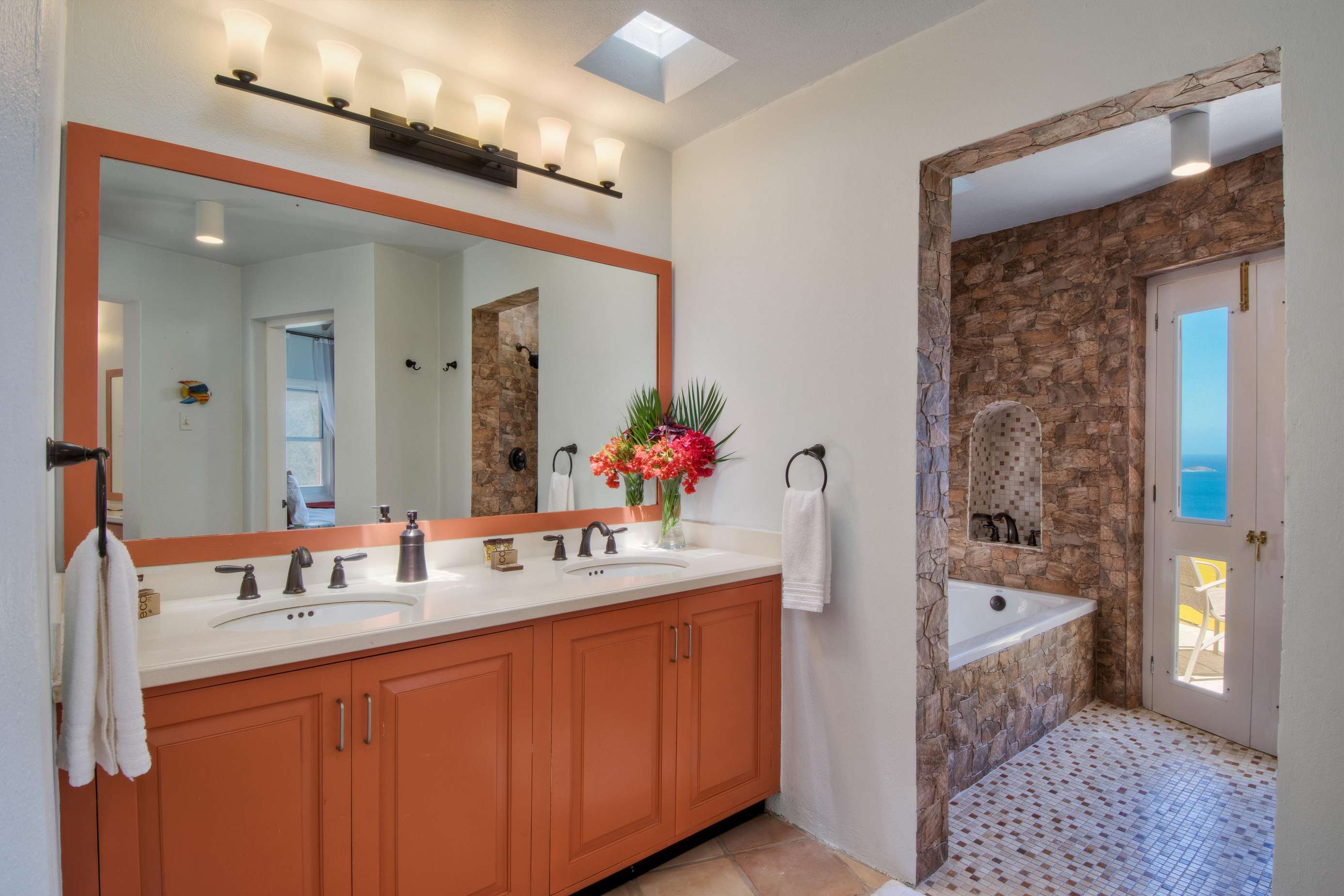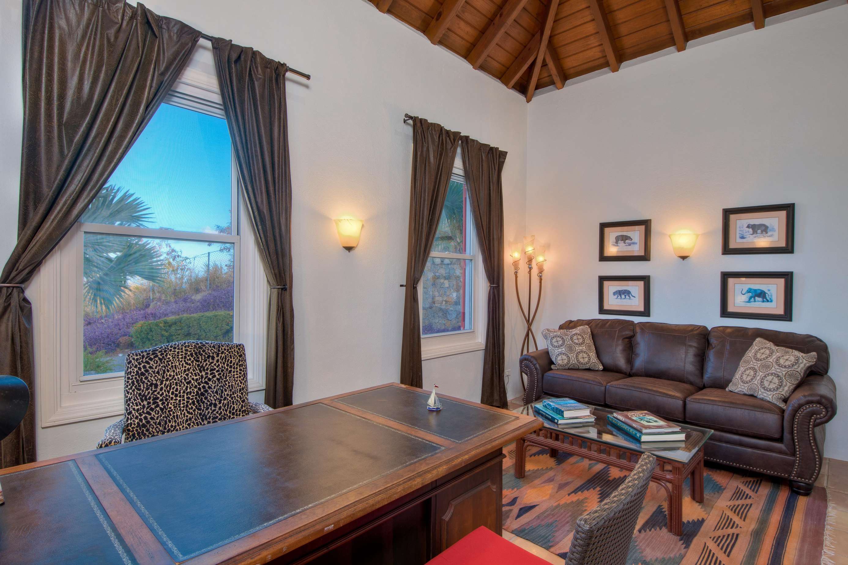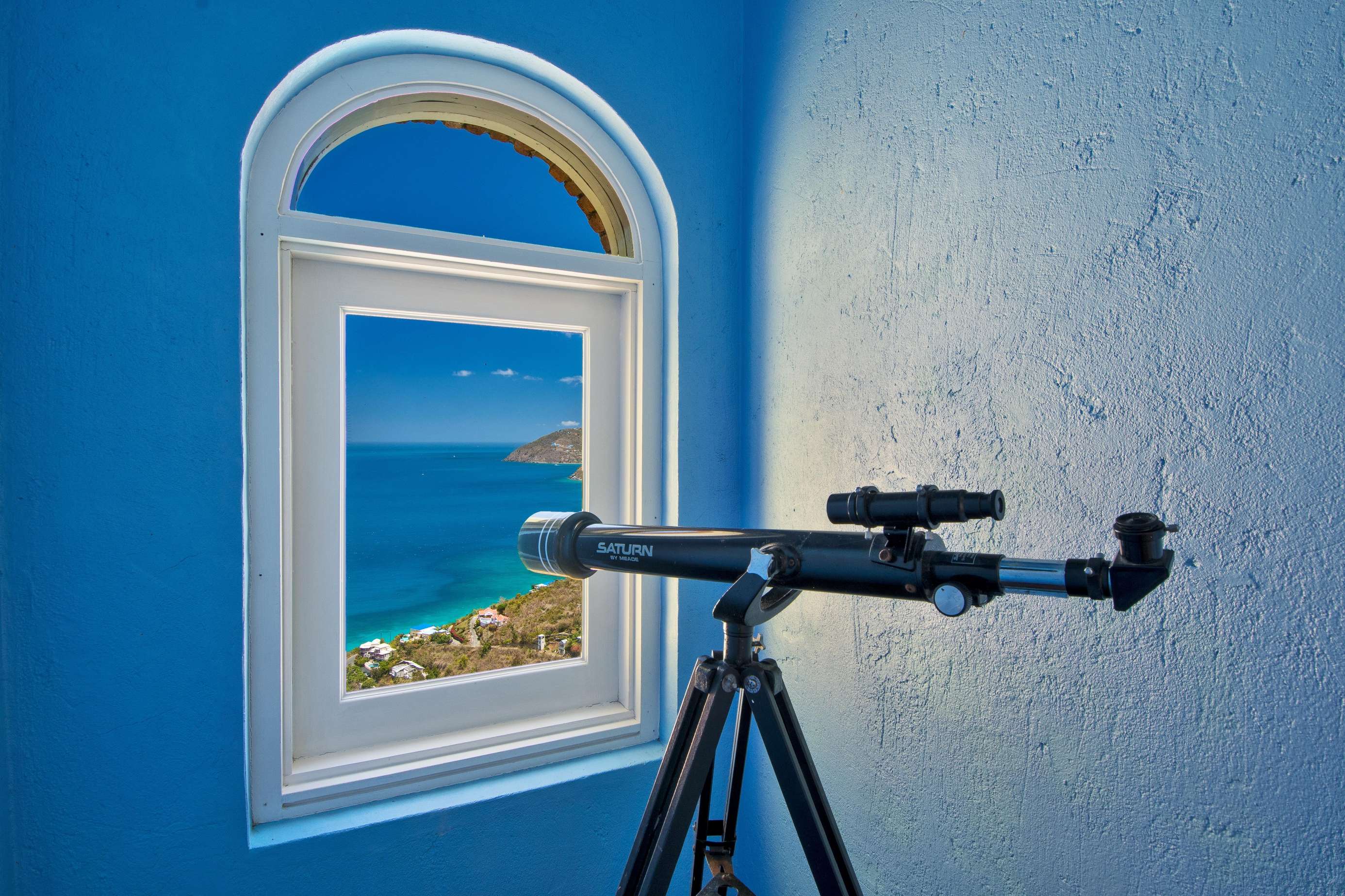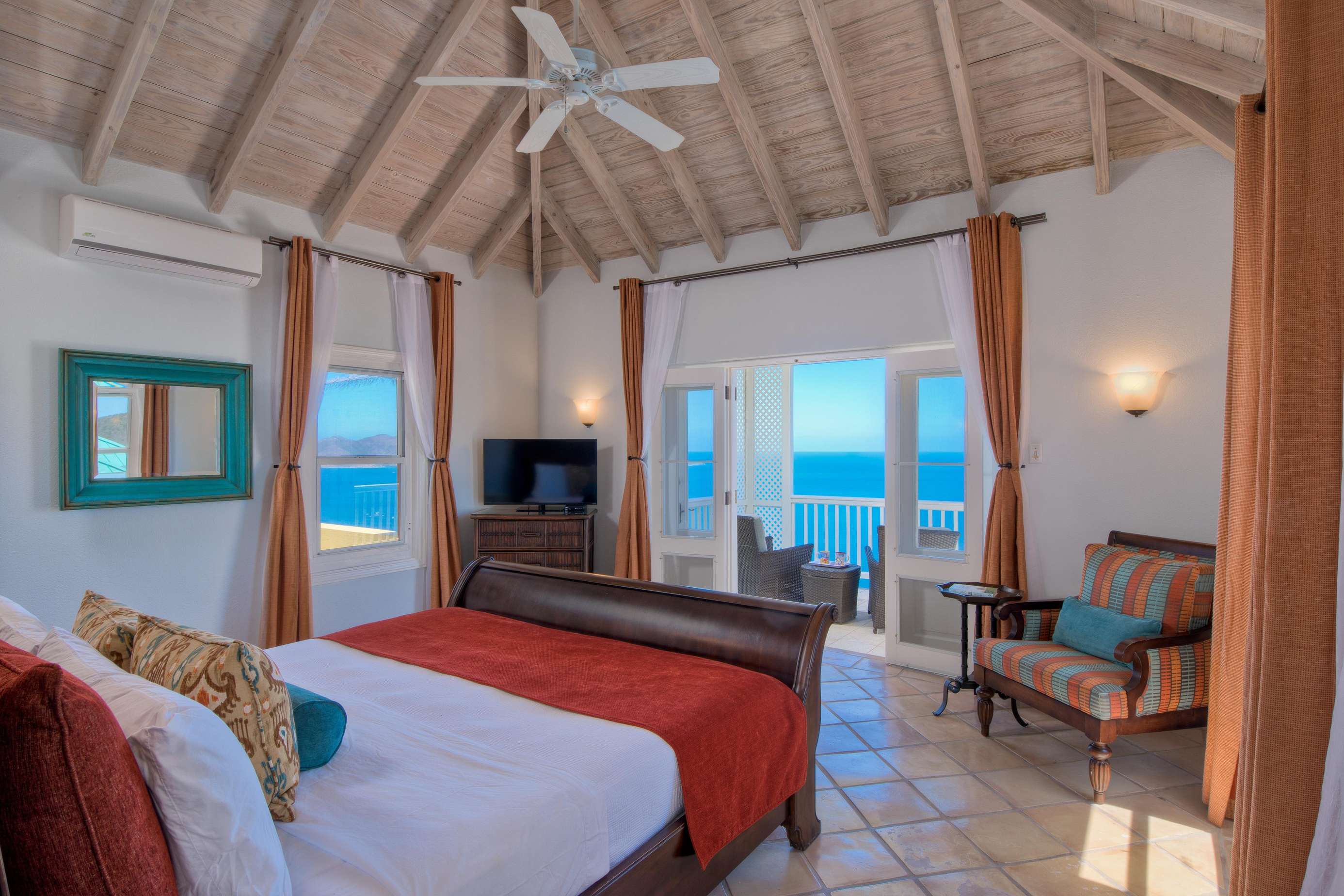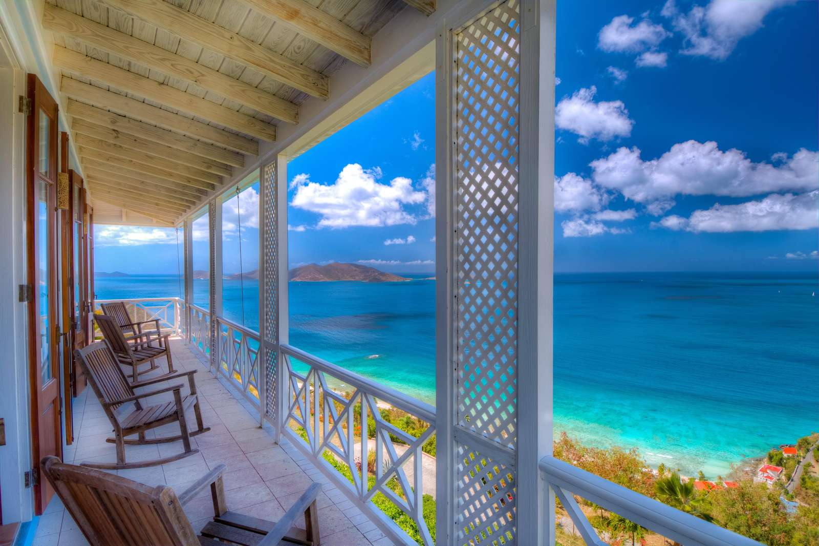 The first floors of the main house and guest house, the shaded veranda, the large pool, the guest bathroom and parking are all set on the same level, unusual on our mountainous island and perfect for socializing with a larger group. The main house contains the ballroom-sized Great Room and separate office. Enjoy the game on the big screen or your music on the Sonos sound system from the ample supply of comfortable seating. Packed with light & air, the living and dining areas feature six sets of 9' high French doors that open to the terrace running along three sides allowing indoor/outdoor living. The view from here is simply stunning.