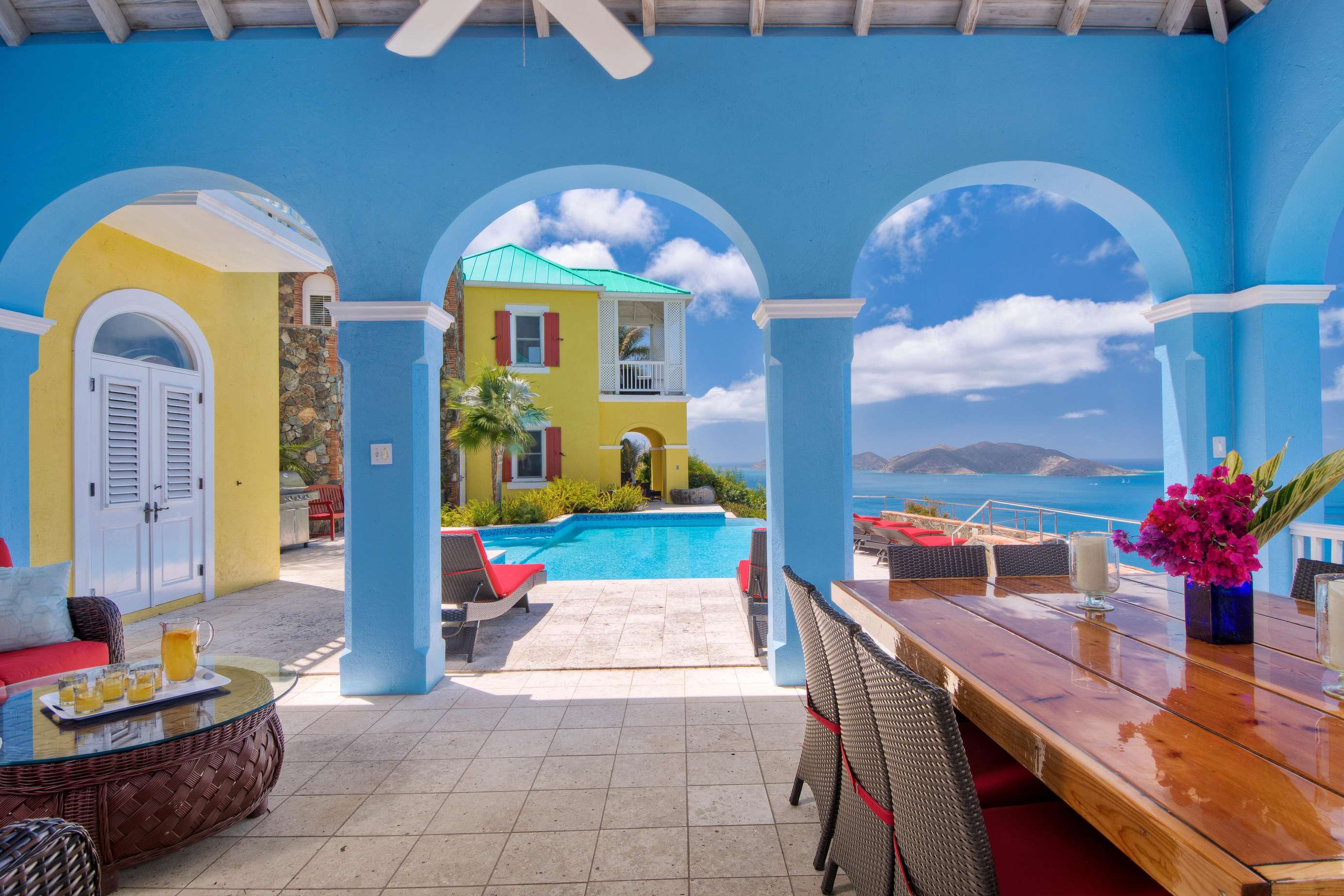 STEP OUTSIDE: Outside there is more than 2000 square ft of coral-tiled living space. Pull up a lounger and catch some rays on the expansive deck alongside the large infinity edge pool, or lounge in the shade of the veranda's spacious al fresco seating area. The convenient guest bathroom, changing room and shower is also just off the deck. You'll find a large propane BBQ poolside, which is perfect for grilling up a local Anegada lobster and enjoying it from the covered outdoor dining area. The views from here are just breathtaking - looking out along the coastline and across to Jost Van Dyke and its surrounding isles with a gentle ocean breeze is just blissful. It's a really magical spot to sit with friends & family and enjoy a meal together or listen to some music through the Sonos sound system.