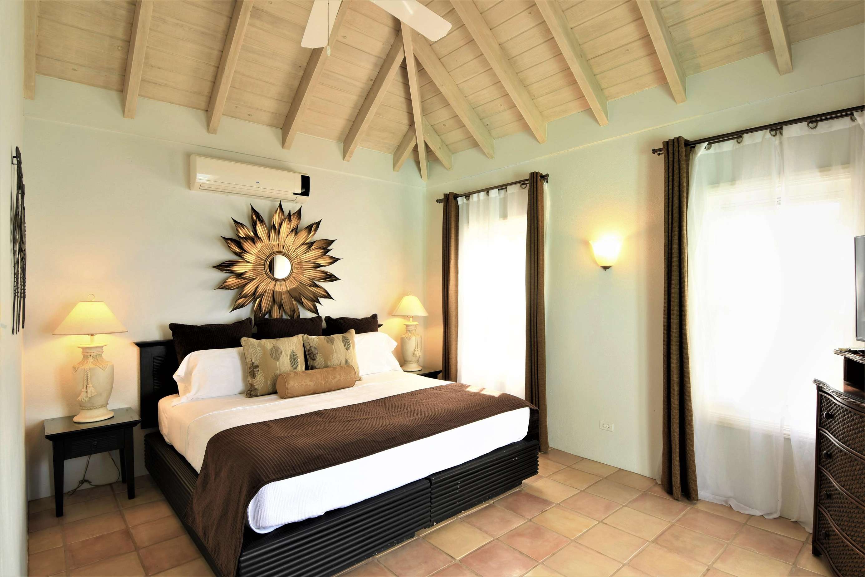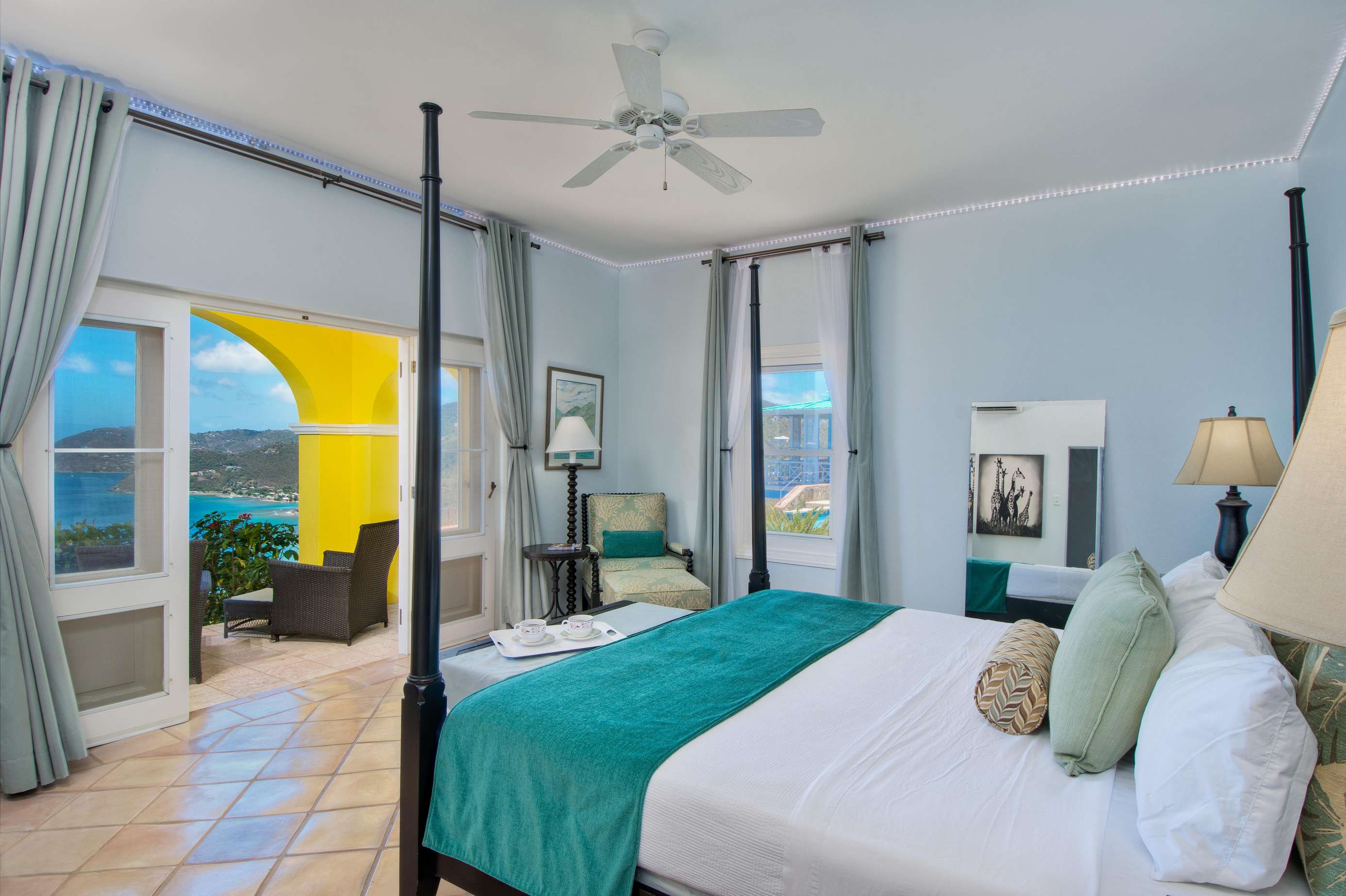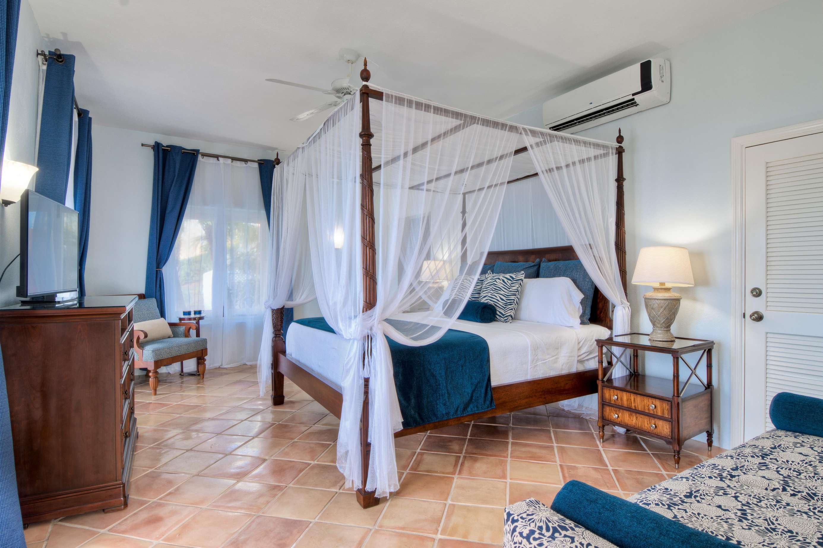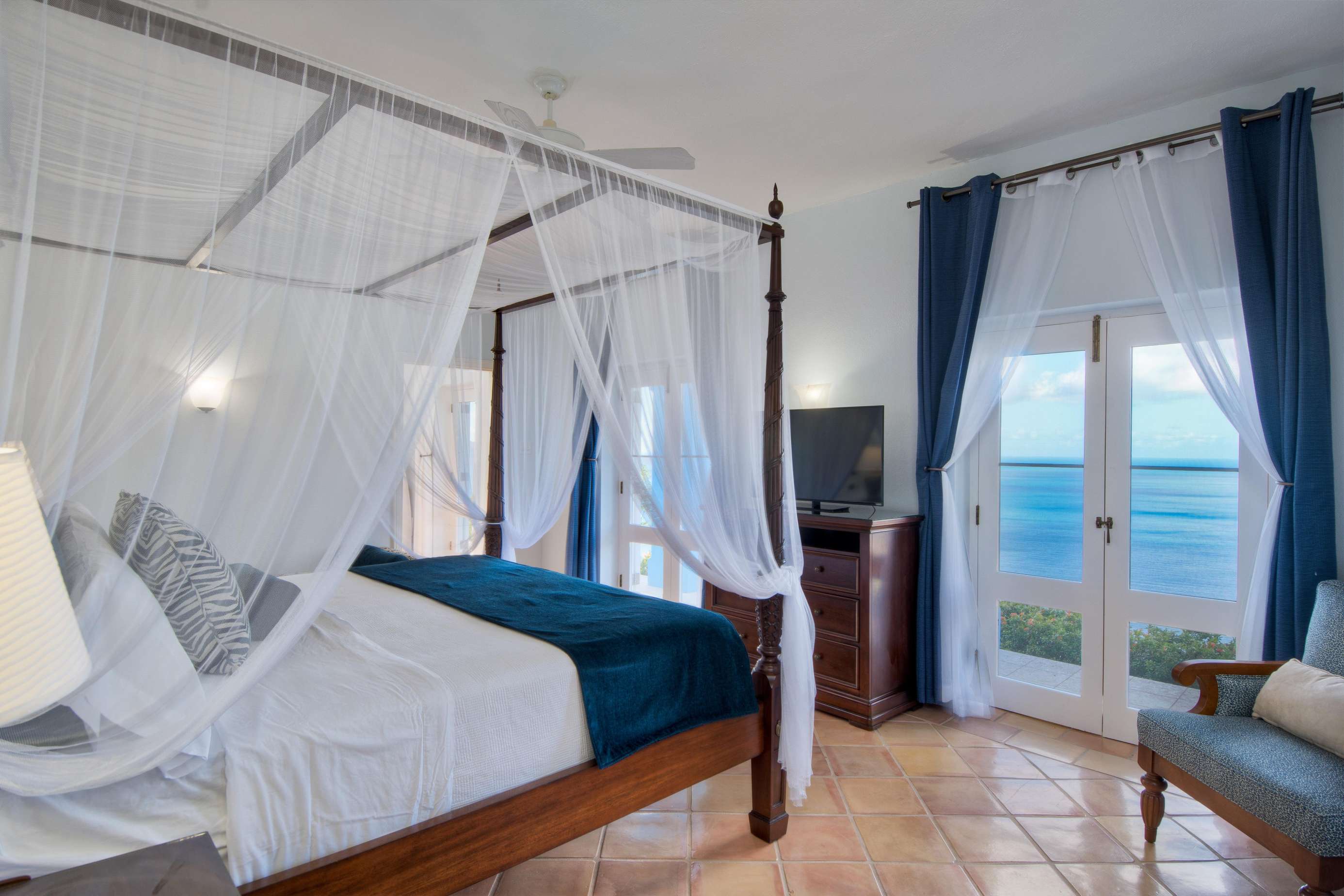 No arguing over bedrooms necessary, as all five of the luxuriously decorated bedrooms are large with high ceilings, large windows and patios or balconies that frame glimmering views of the Atlantic or Caribbean Sea. Named after famous colonial explorers, each provides a king-size bed (or alternatively up to two rooms can be converted to XL-twins), flat screen television & Google smart sound speaker. All bedrooms are separated from the others and all have en-suites. One even offers all the features of a self-sufficient apartment, including an eat-in kitchenette complete with stove, microwave and refrigerator.