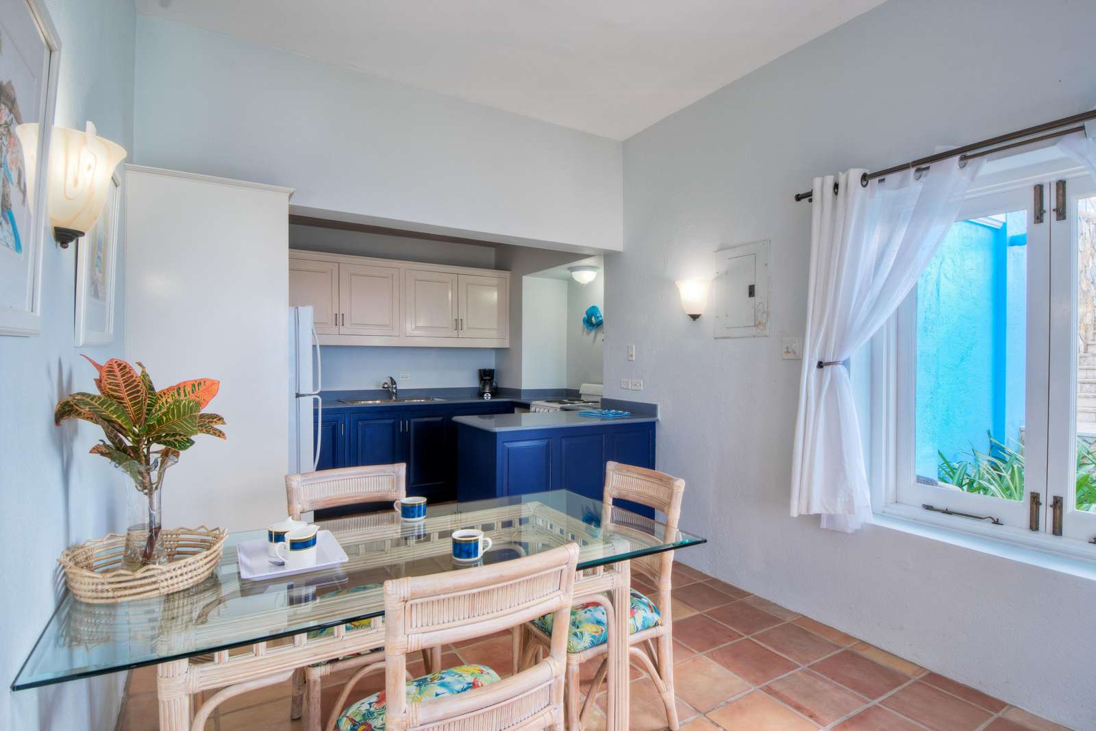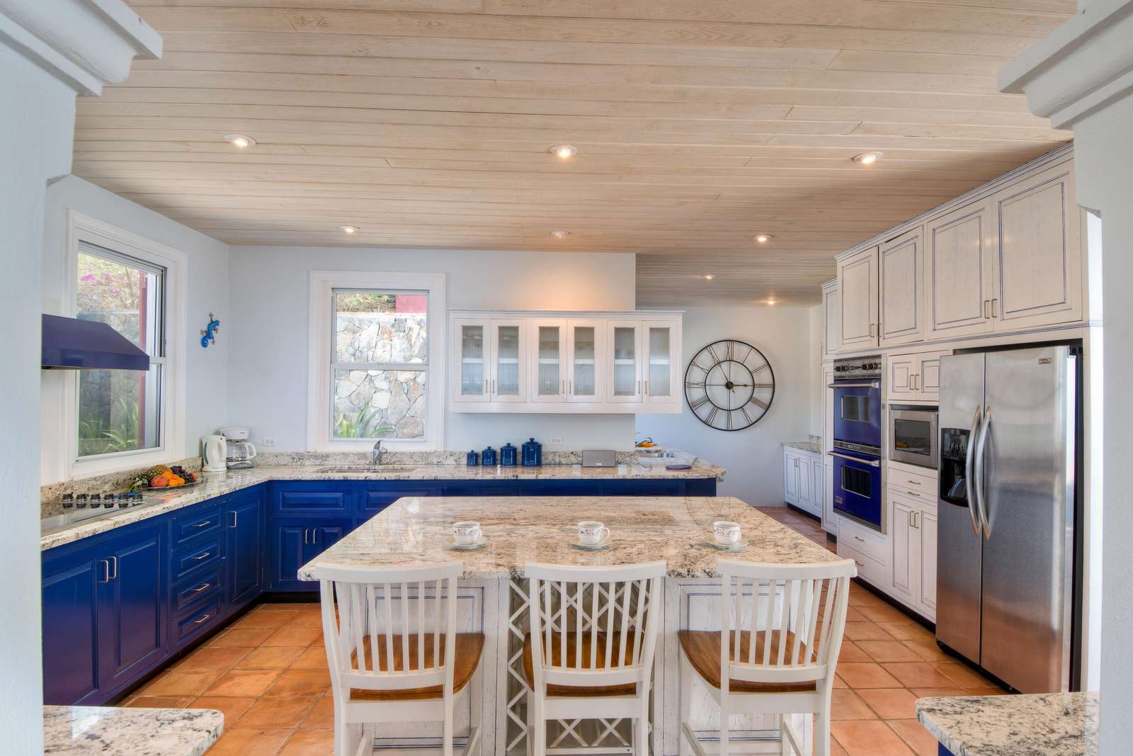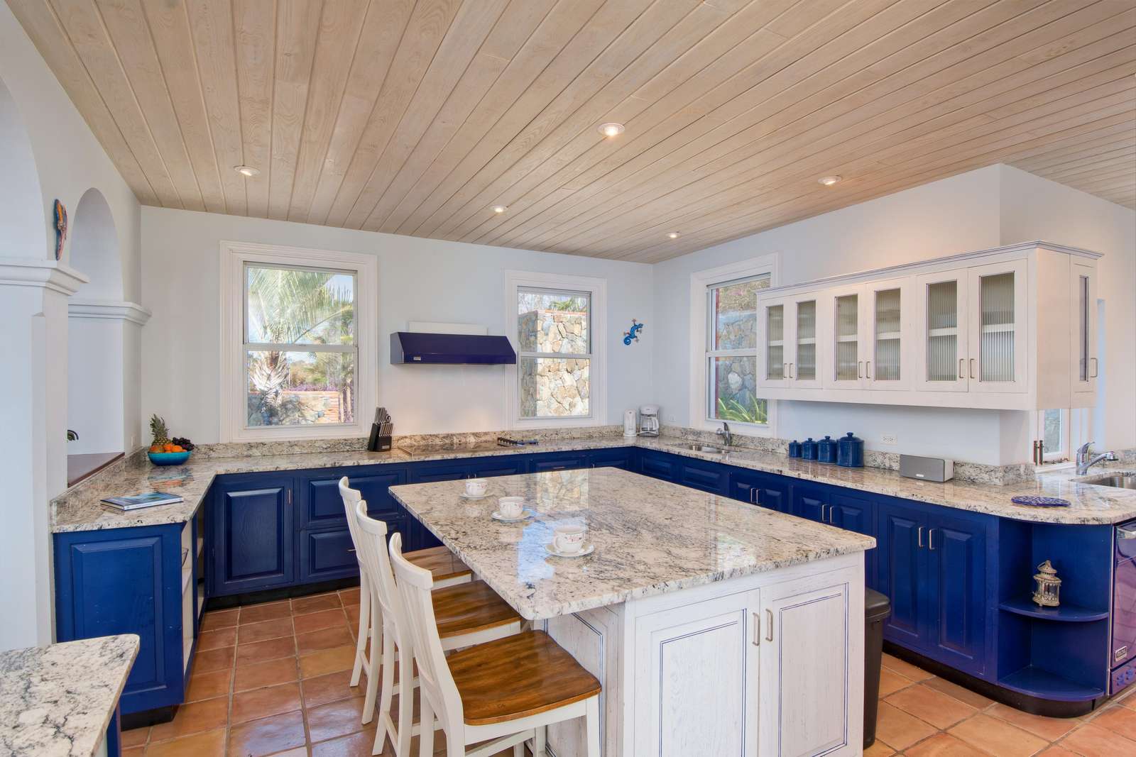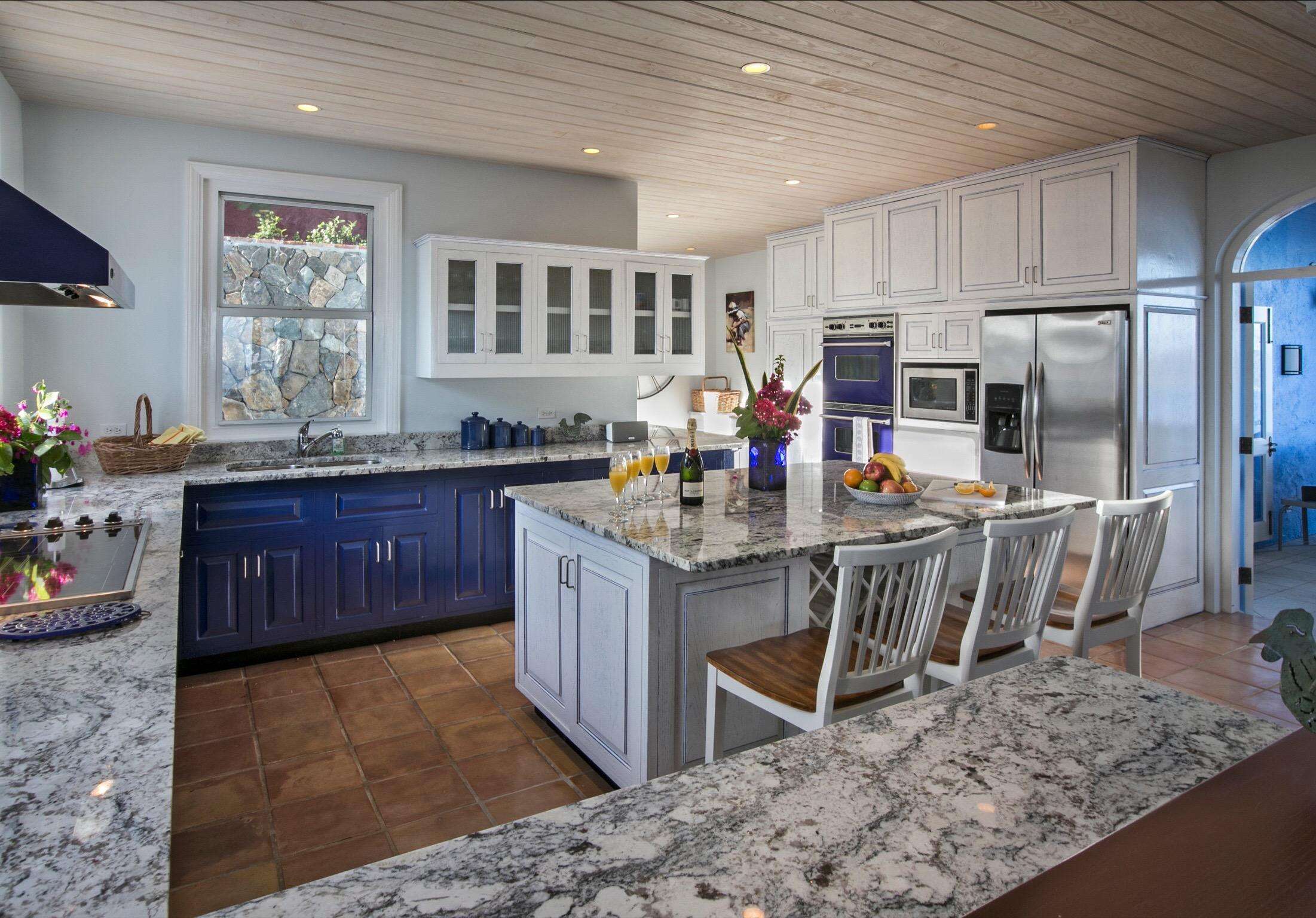 The Caribbean-tiled Great Room opens into the kitchen, appointed with stone counter tops, high quality Viking cooking appliances, and both a prep sink and separate cleanup sink next to the dishwasher. No need to shoo guest away. It is enormous and allows everyone to gather around the center island/breakfast bar for meal prep and cocktails. You'll find everything you need here for self-catering and more than enough workspace. Or choose our available chef for a fully catered affair.