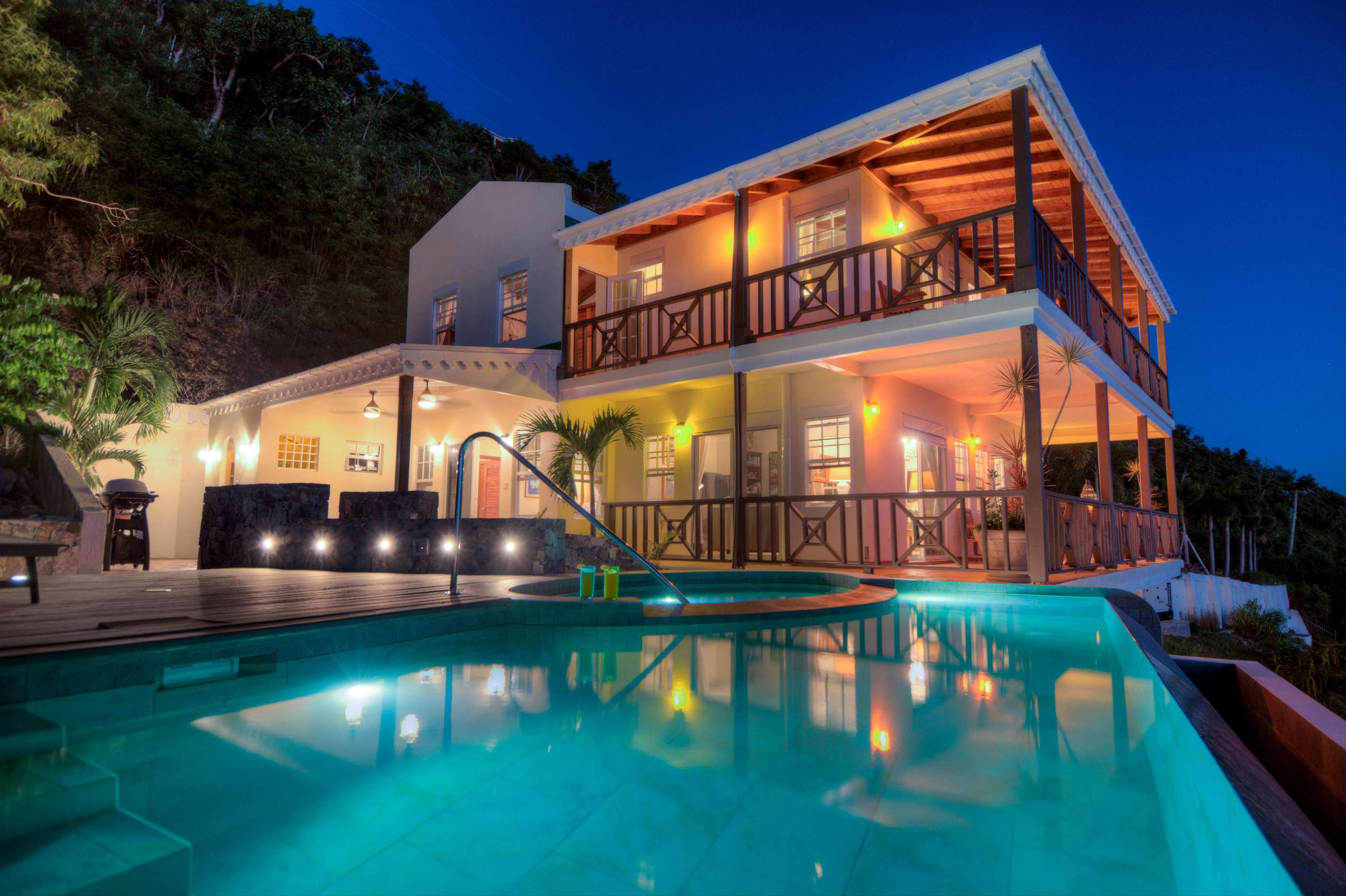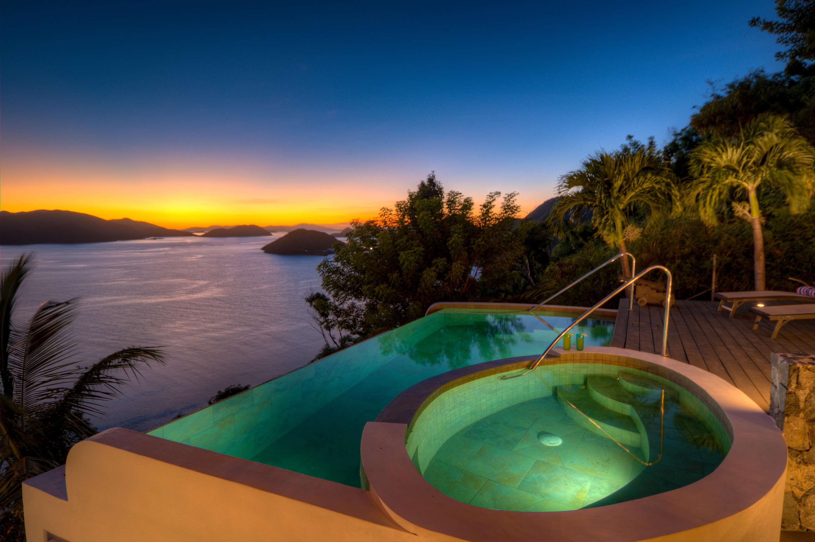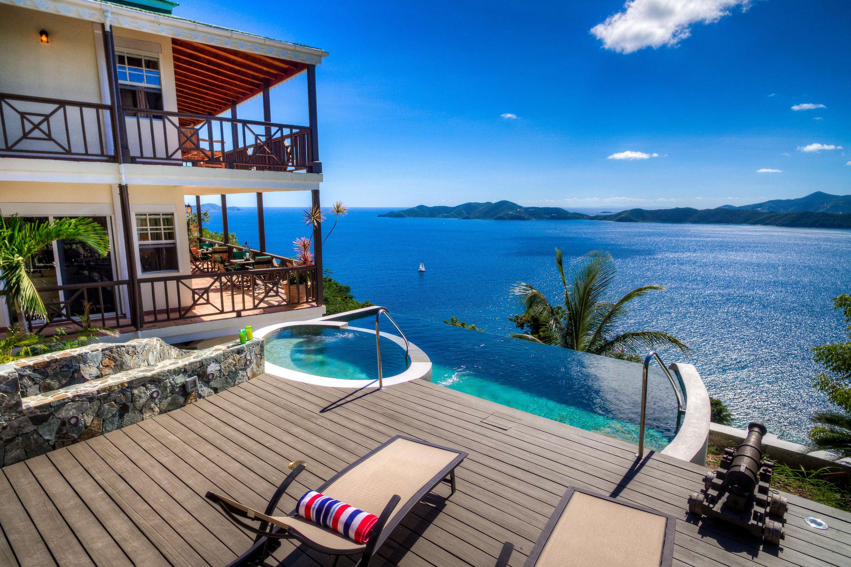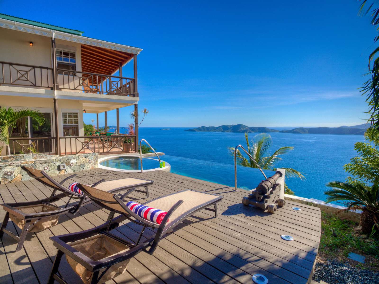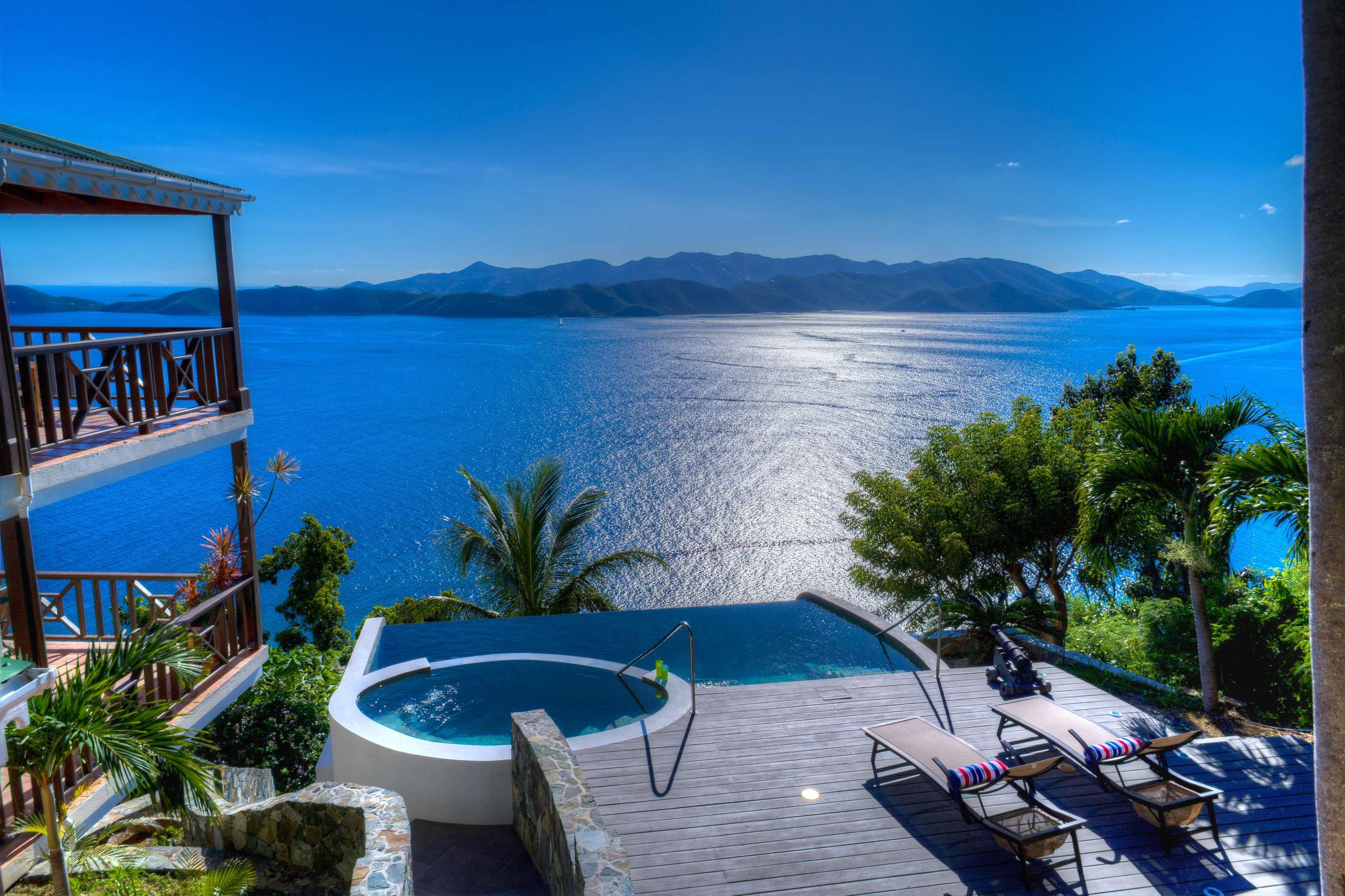 The grilling deck (both gas and charcoal BBQ’s available) is the perfect spot to grill up a local Anegada lobster as the sun sinks below the horizon. The infinity edge pool is an idyllic location for a cooling dip with a drink or a book at any time of the day. NOTE: The smaller oval part of the pool is NOT a jacuzzi or hot tub! We’ve said it before, but the views really are magnificent and these are the things that make ‘Sans Souci’ or ‘Without Worries’ the perfect name for this gorgeous villa.