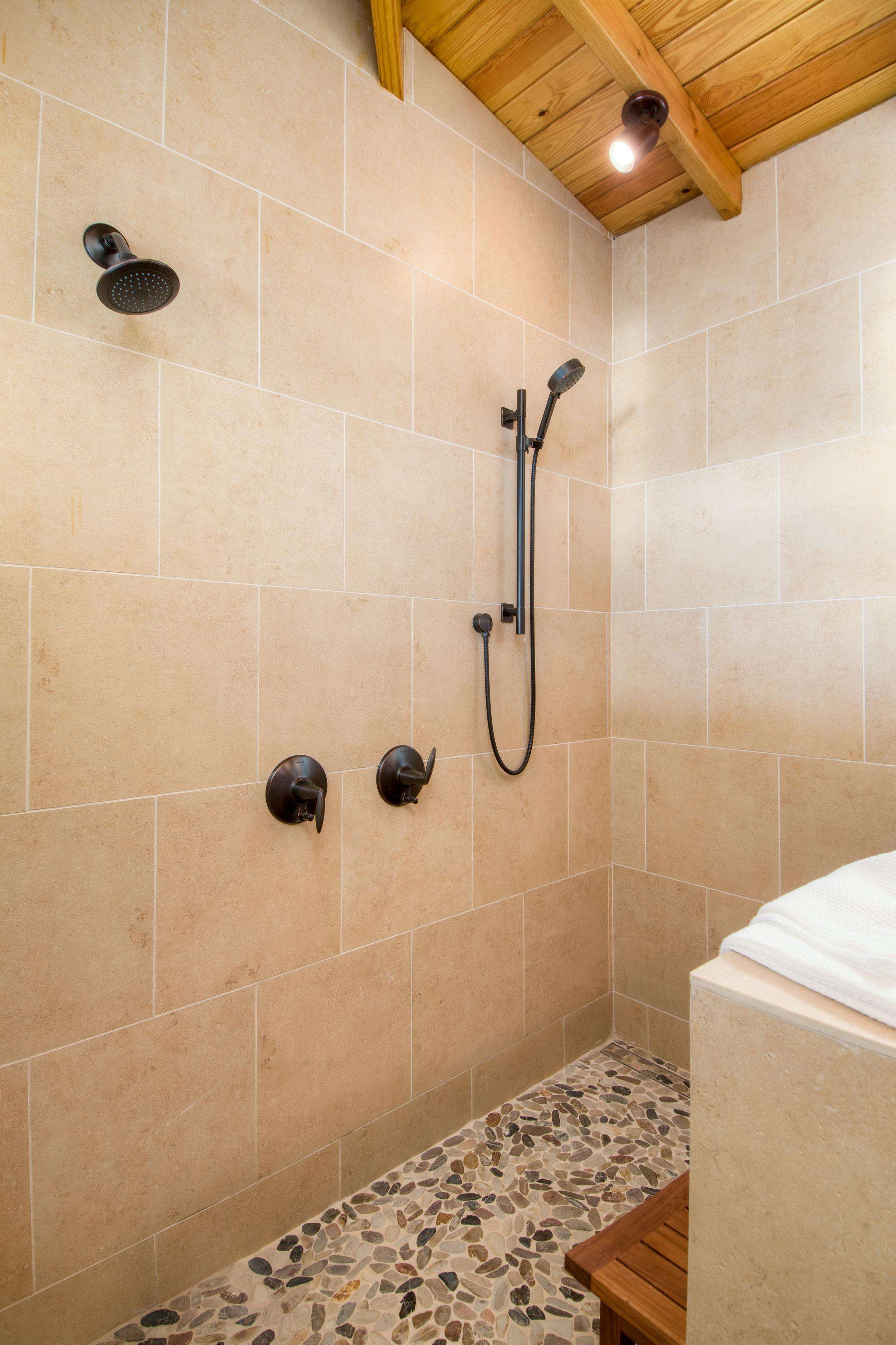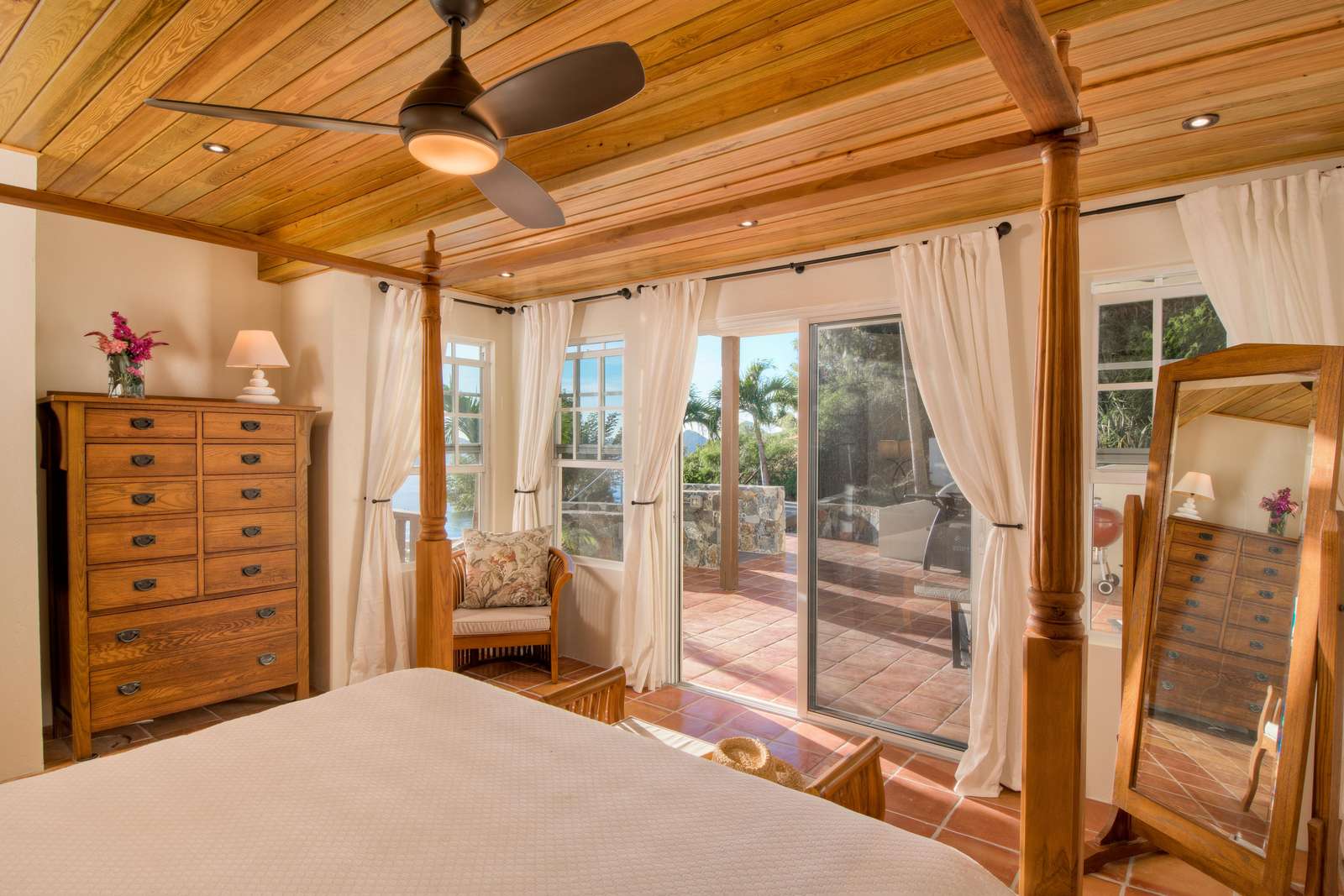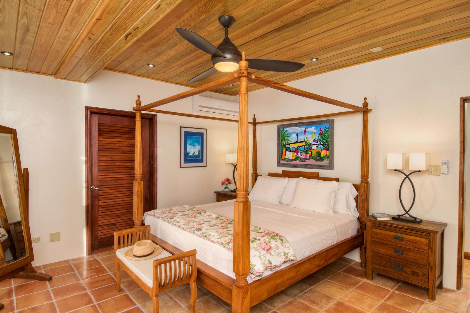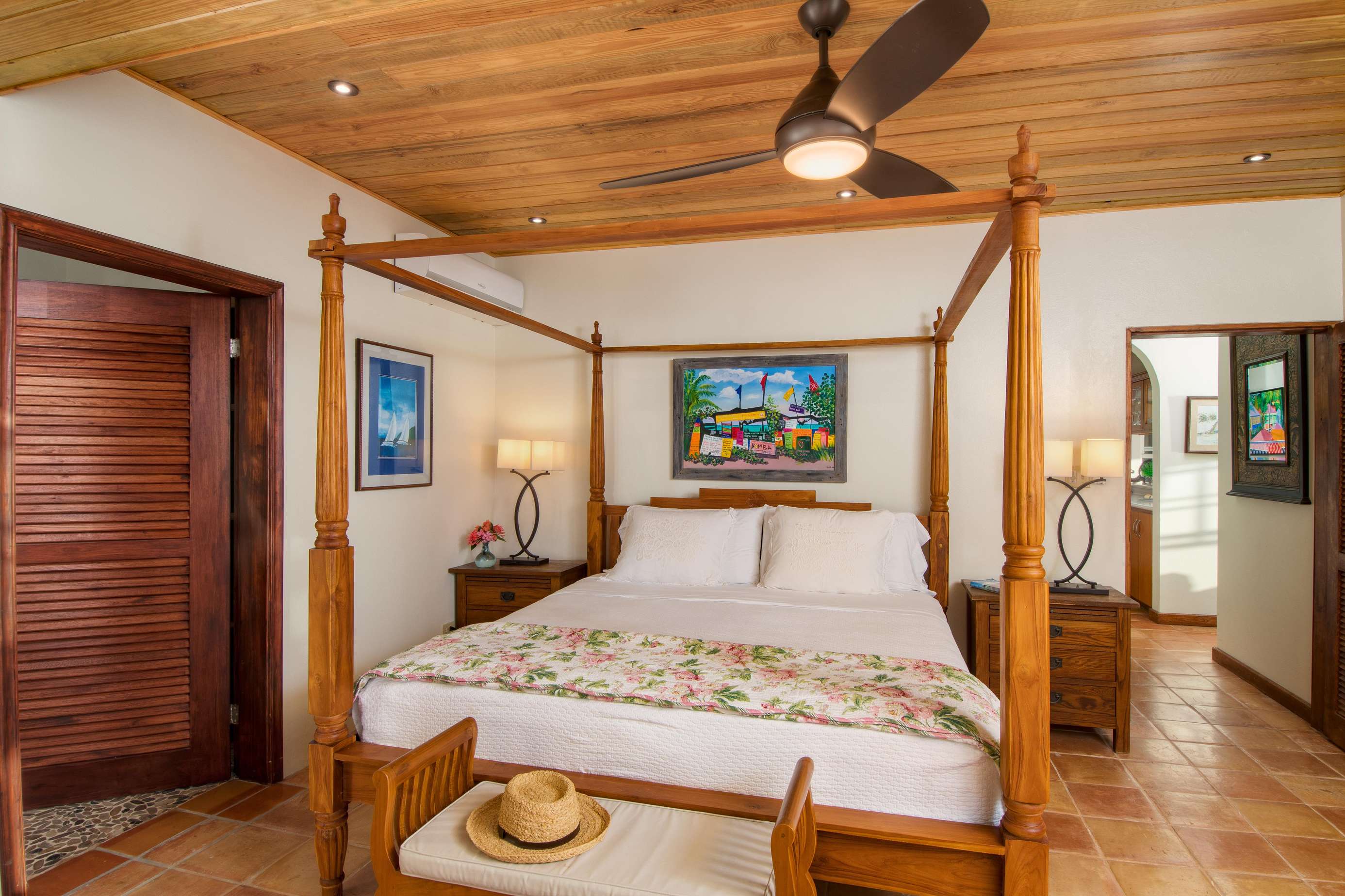 1) The new primary suite on the ground floor is a wonderful addition making this villa perfectly comfortable for just one couple without feeling overwhelmingly large. Everything about this suite is luxurious….from the king-size teak four-poster bed and built-in closets to the striking bathroom with double vanity and walk-in shower. Add to that the sliding doors at the foot of the bed that lead directly to the pool a few feet away…it’s got to be the best way to wake up there is!