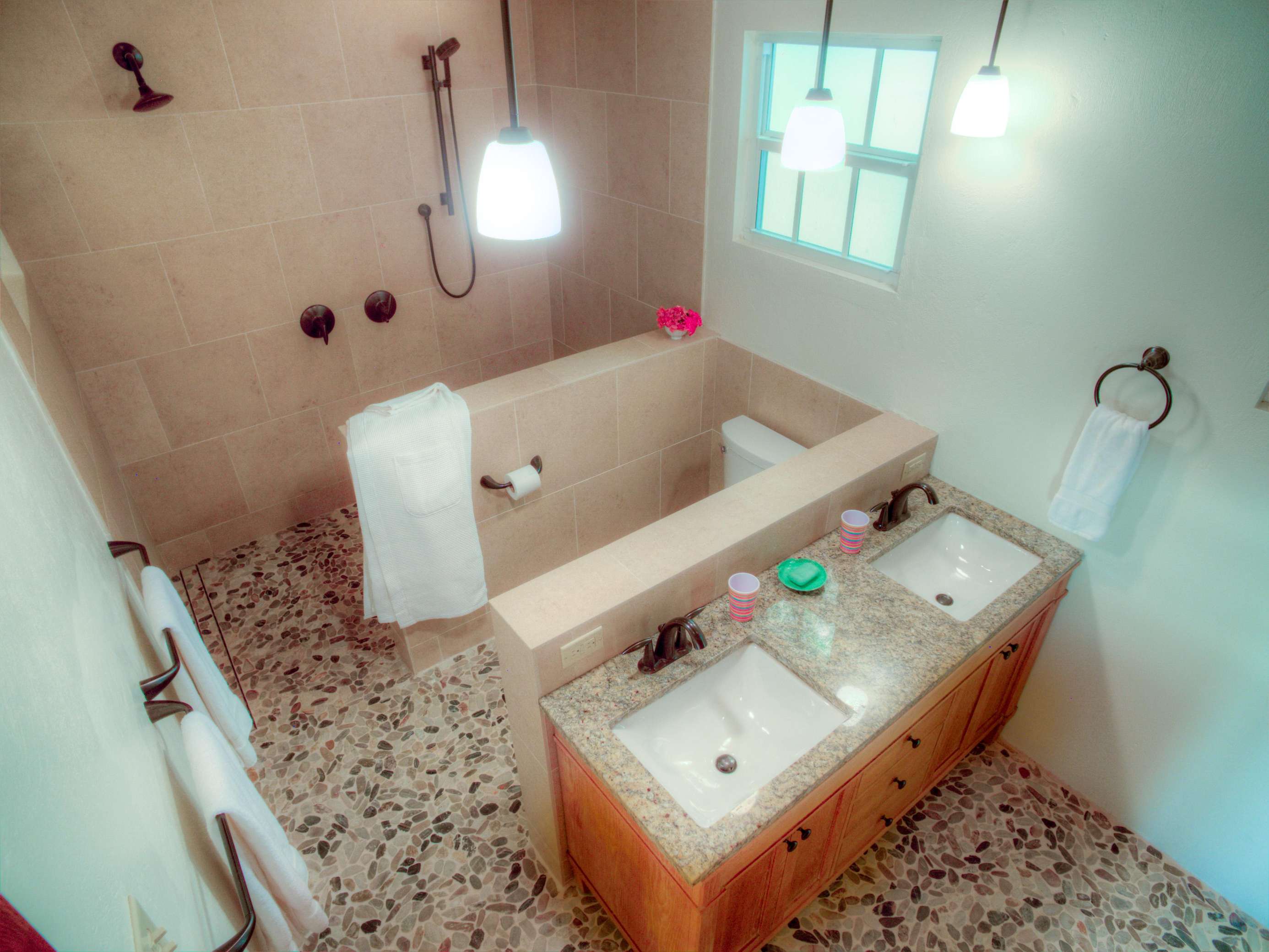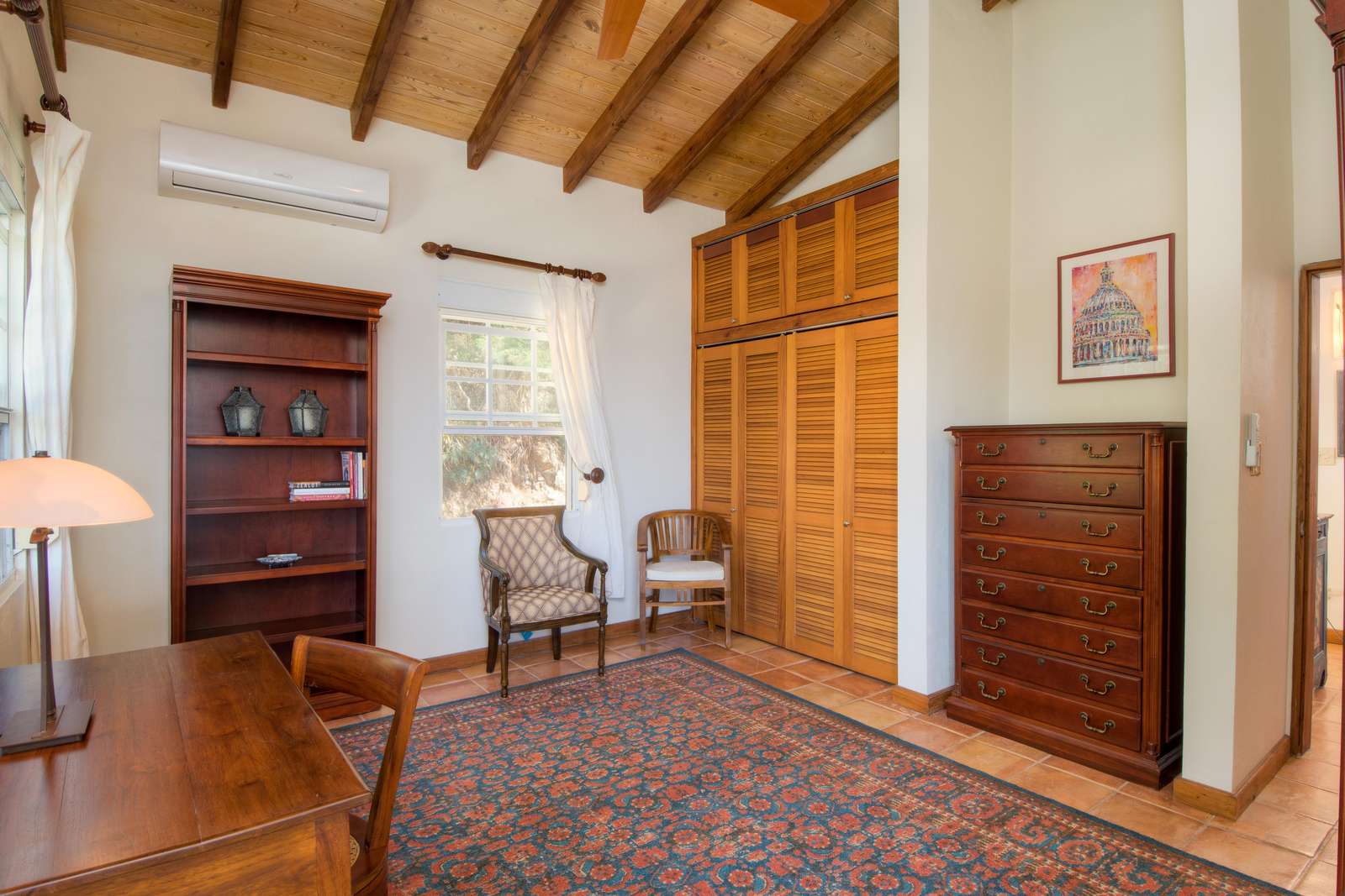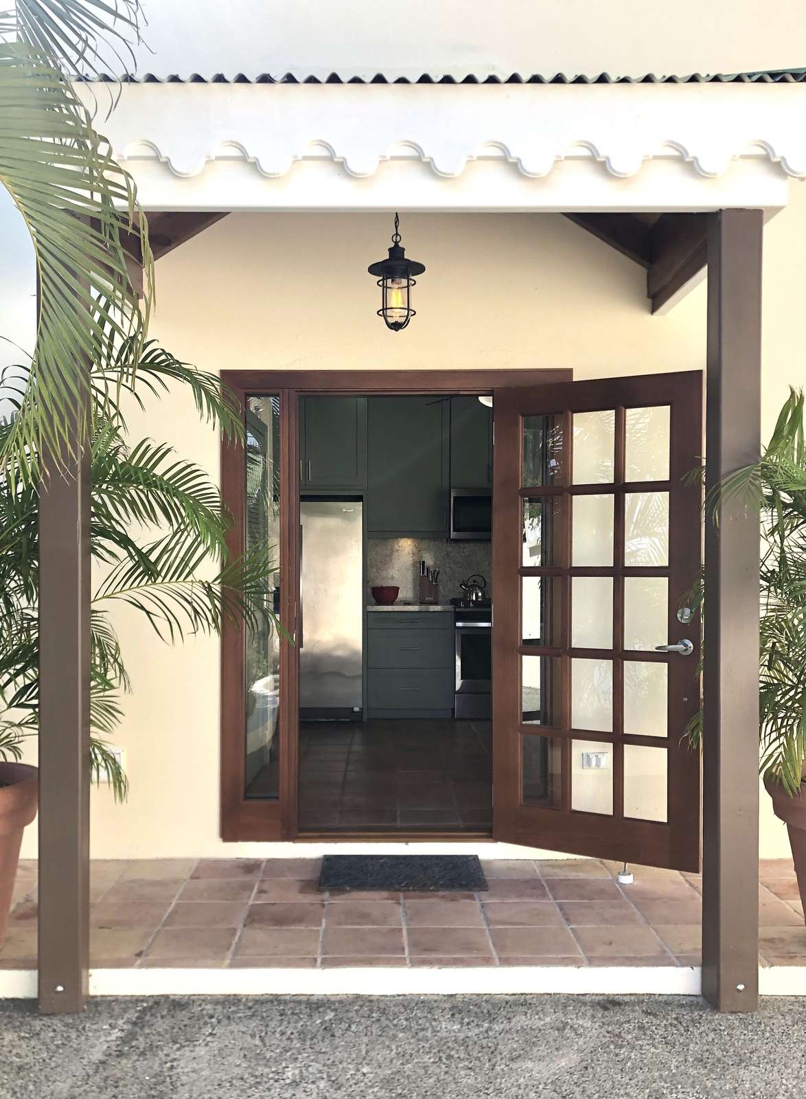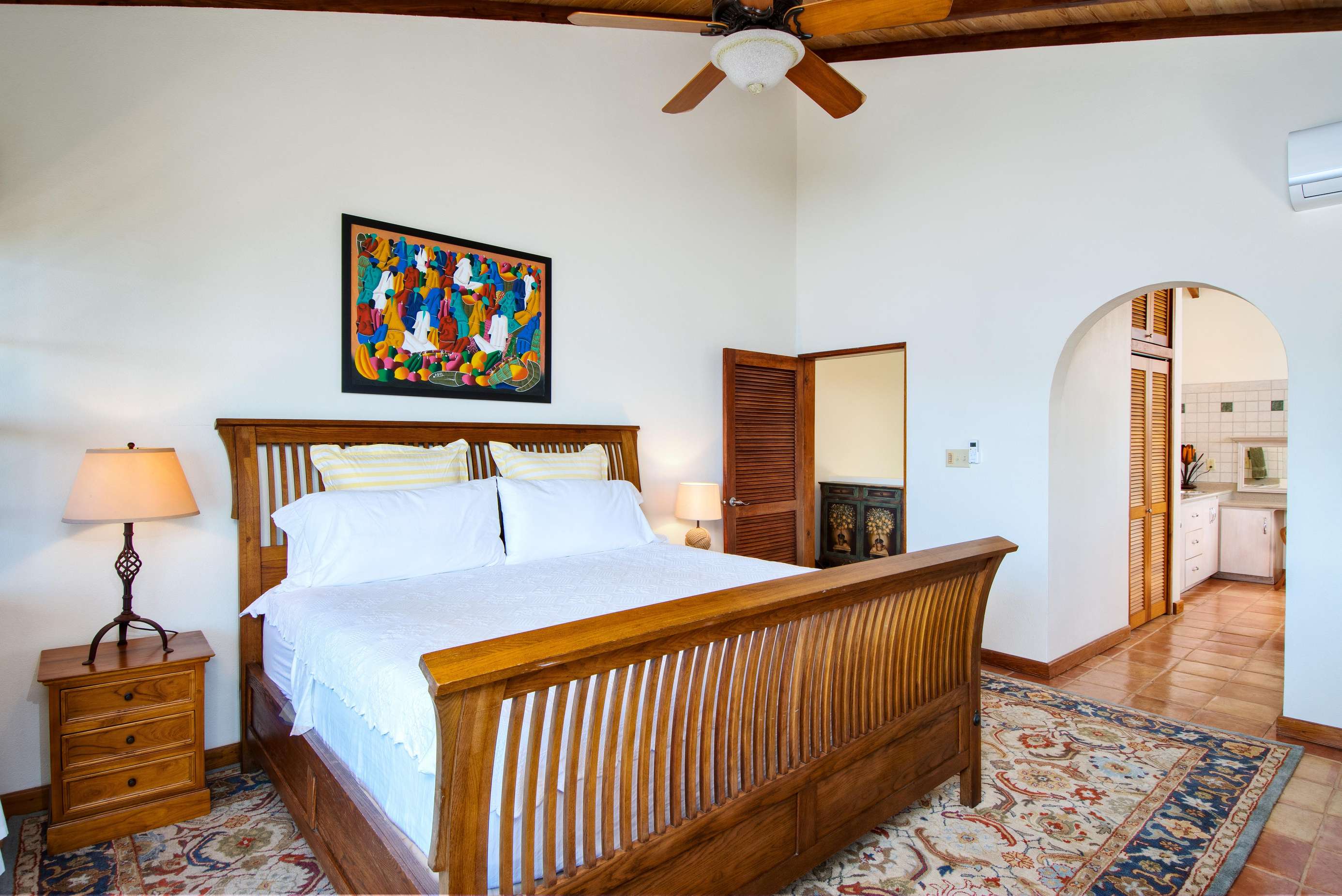 1) The new primary suite on the ground floor is a wonderful addition making this villa perfectly comfortable for just one couple without feeling overwhelmingly large. Everything about this suite is luxurious….from the king-size teak four-poster bed and built-in closets to the striking bathroom with double vanity and walk-in shower. Add to that the sliding doors at the foot of the bed that lead directly to the pool a few feet away…it’s got to be the best way to wake up there is!