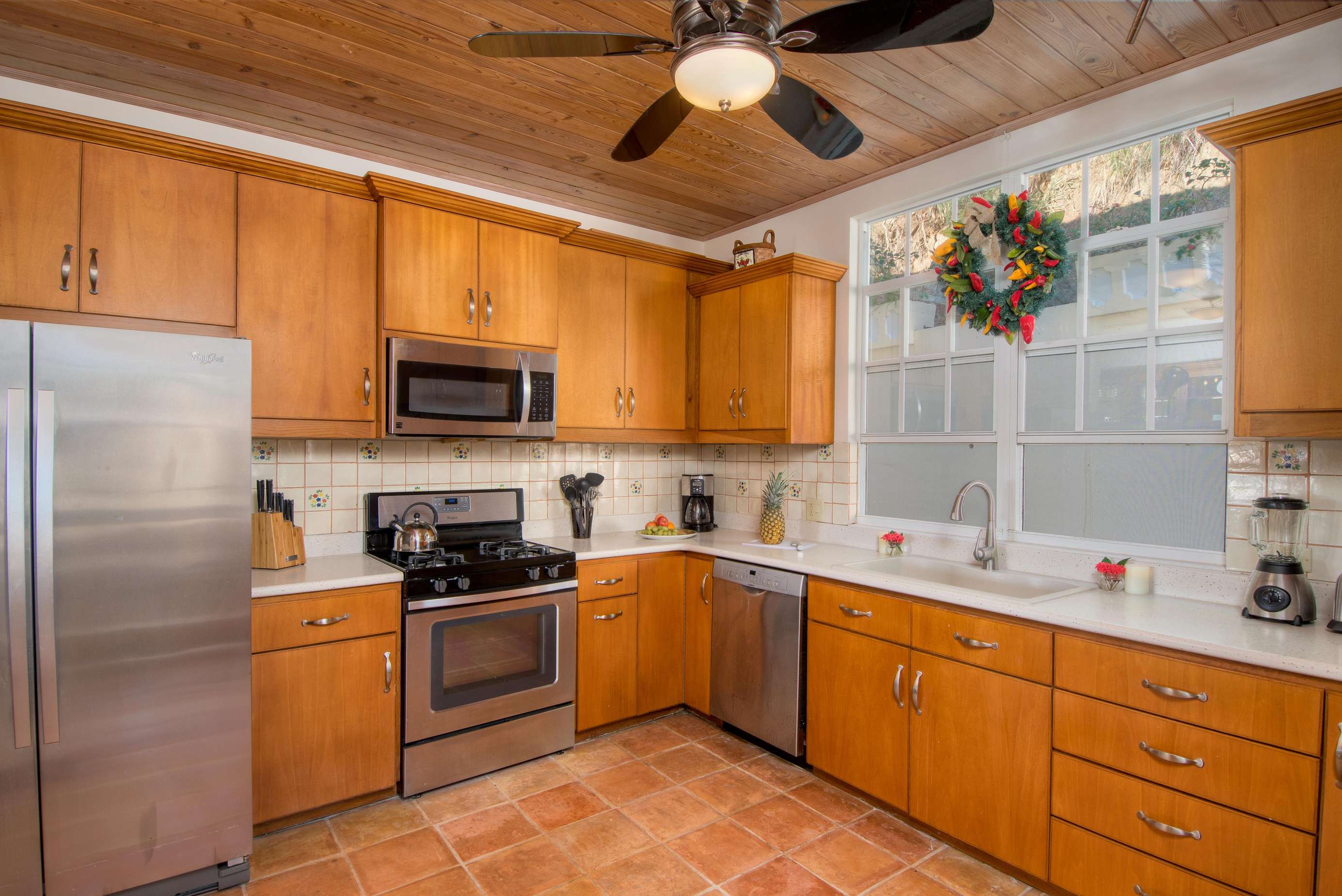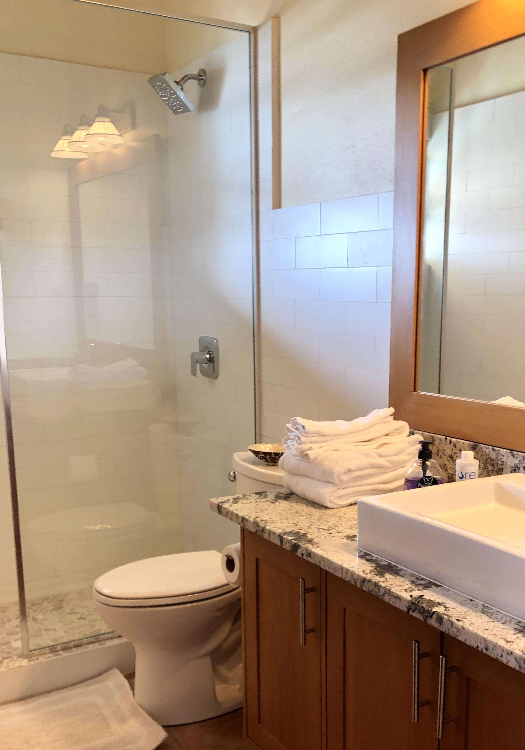 On the ground floor the remodeled kitchen is well equipped with stainless steel appliances, washer and dryer and all the gadgets you need. The Dining room offers seating for 8 and large sliding doors and screens on 2 walls providing light and breezes and the amazing ocean views. The living room has plenty of comfy seating, also has azure vistas and, if you can bear to tear your eyes away from them, a 55″ SmartTV with FLOW cable and DVD player for your entertainment needs.