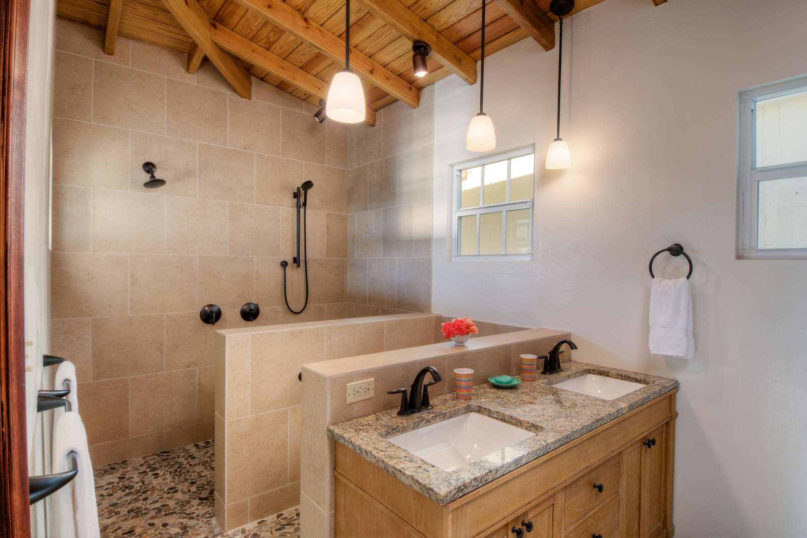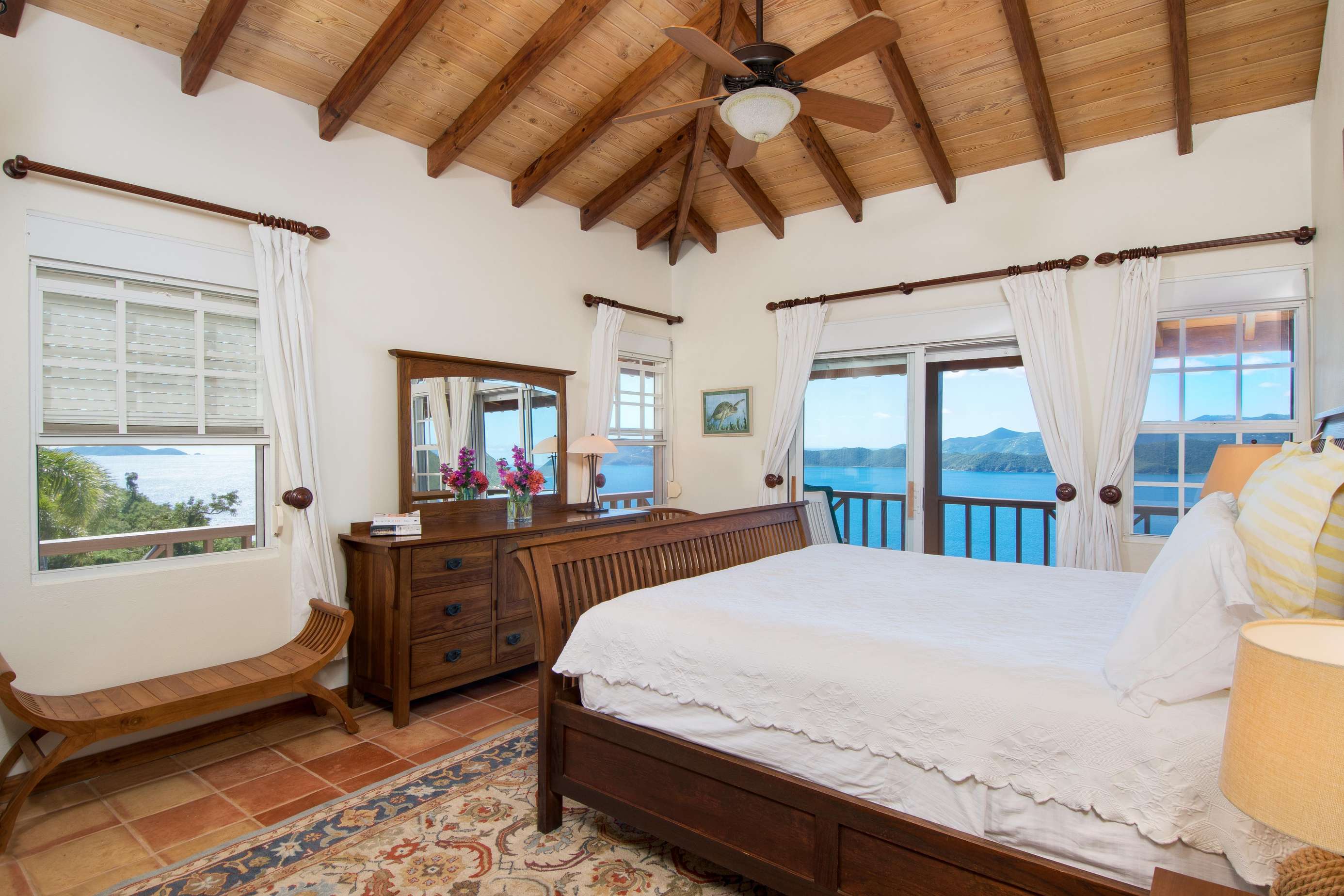 2) On the first floor you’ll find the remaining bedrooms. Sleep like royalty in the gorgeous teak sleigh bed in the spacious king suite with walk-in closet and large bathroom with double vanity and shower. Sliding doors led onto the upper wraparound deck with the same mesmerizing views.
