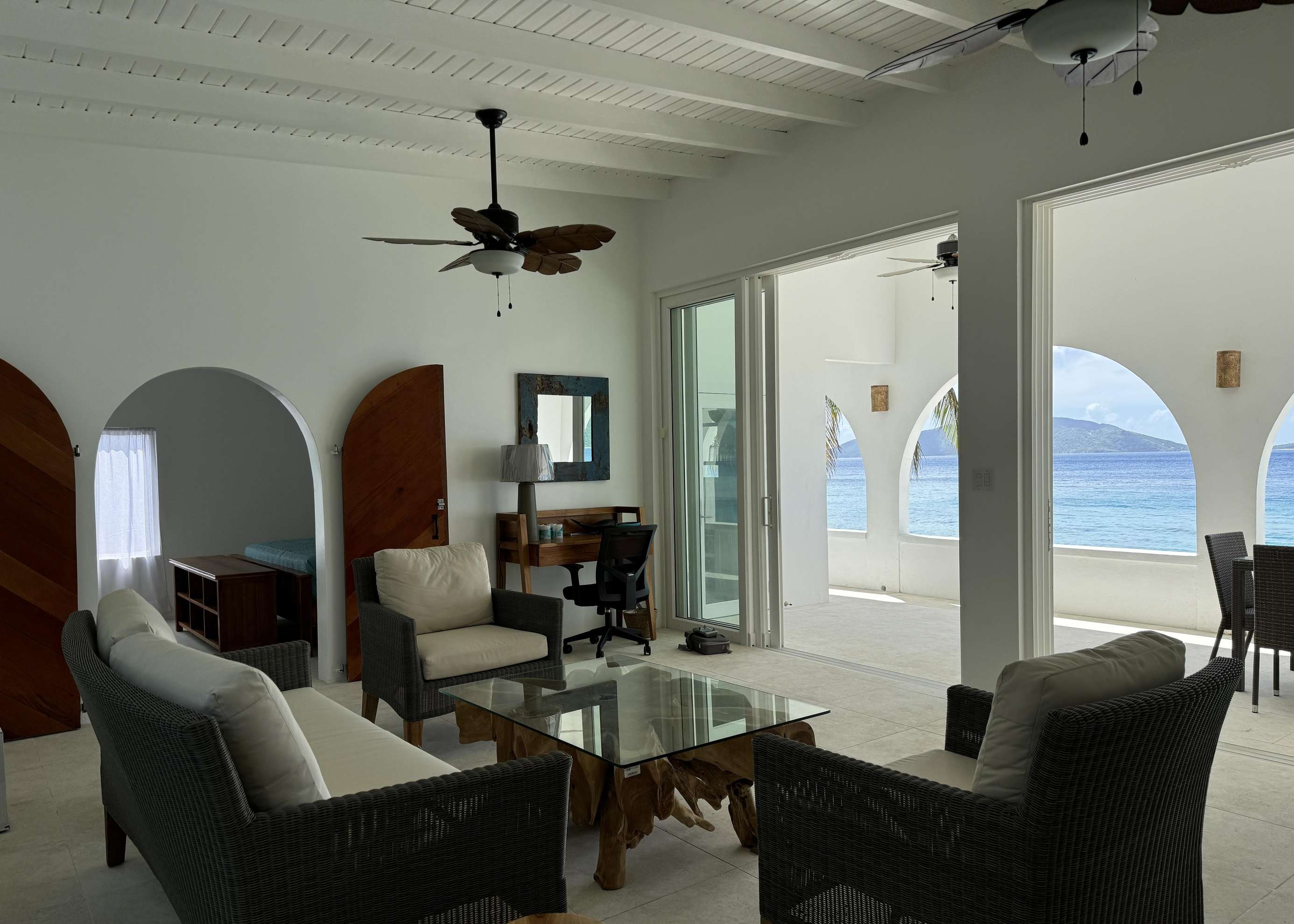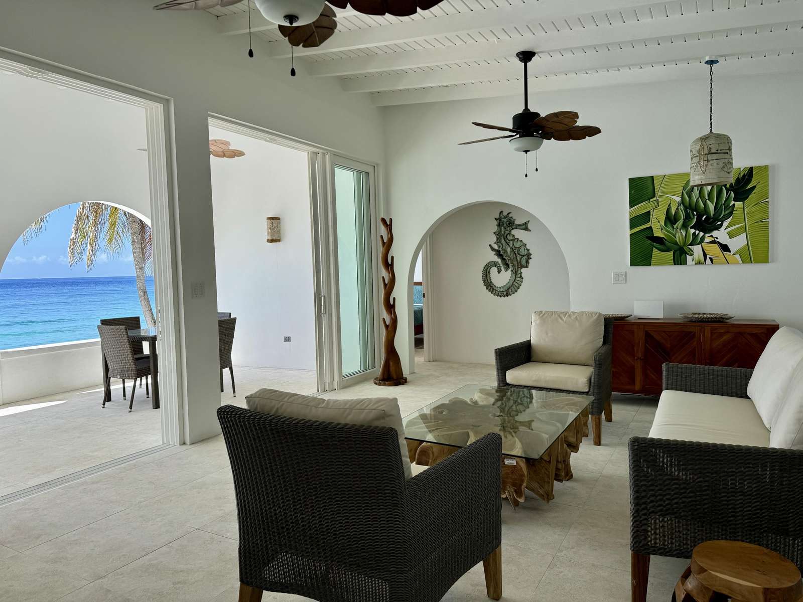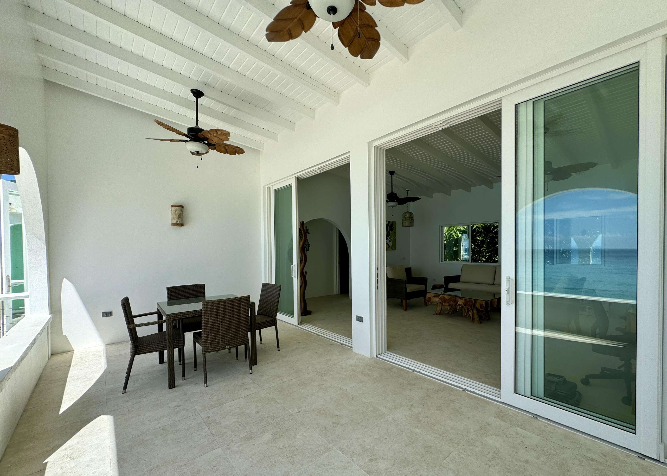 The main living area is flooded with light and air with high ceilings, fresh white walls and azure ocean views. Dark wood furniture contrasts the bright shell around it creating a chic island vibe. The living space is cool and comfortable with ceiling fans and those huge glass doors you can open to the breezes. You’ll also find a desk & desk chair in the living room (what a place to work from home) and a comfy sofa and chair set with coffee table which is the perfect place to kick back with a book or watch the pelicans diving for their dinner below.