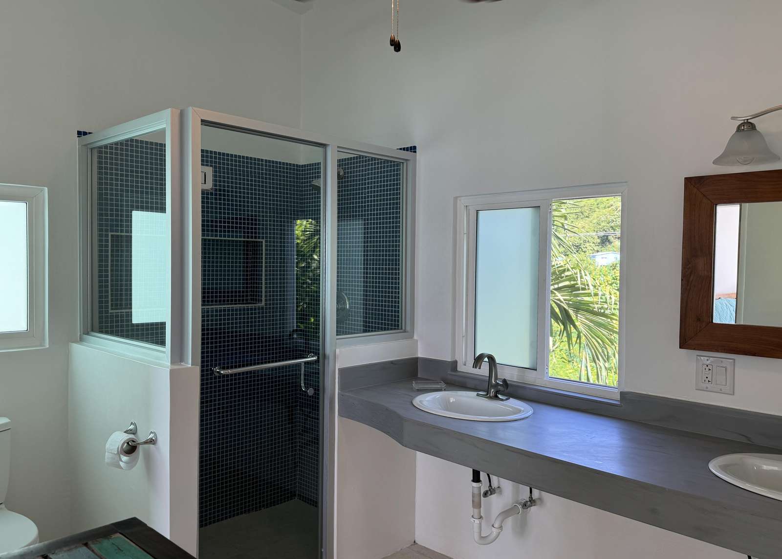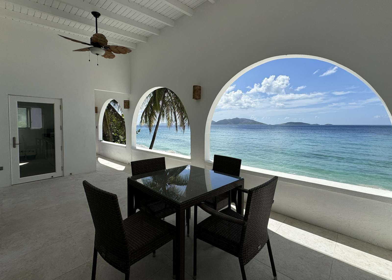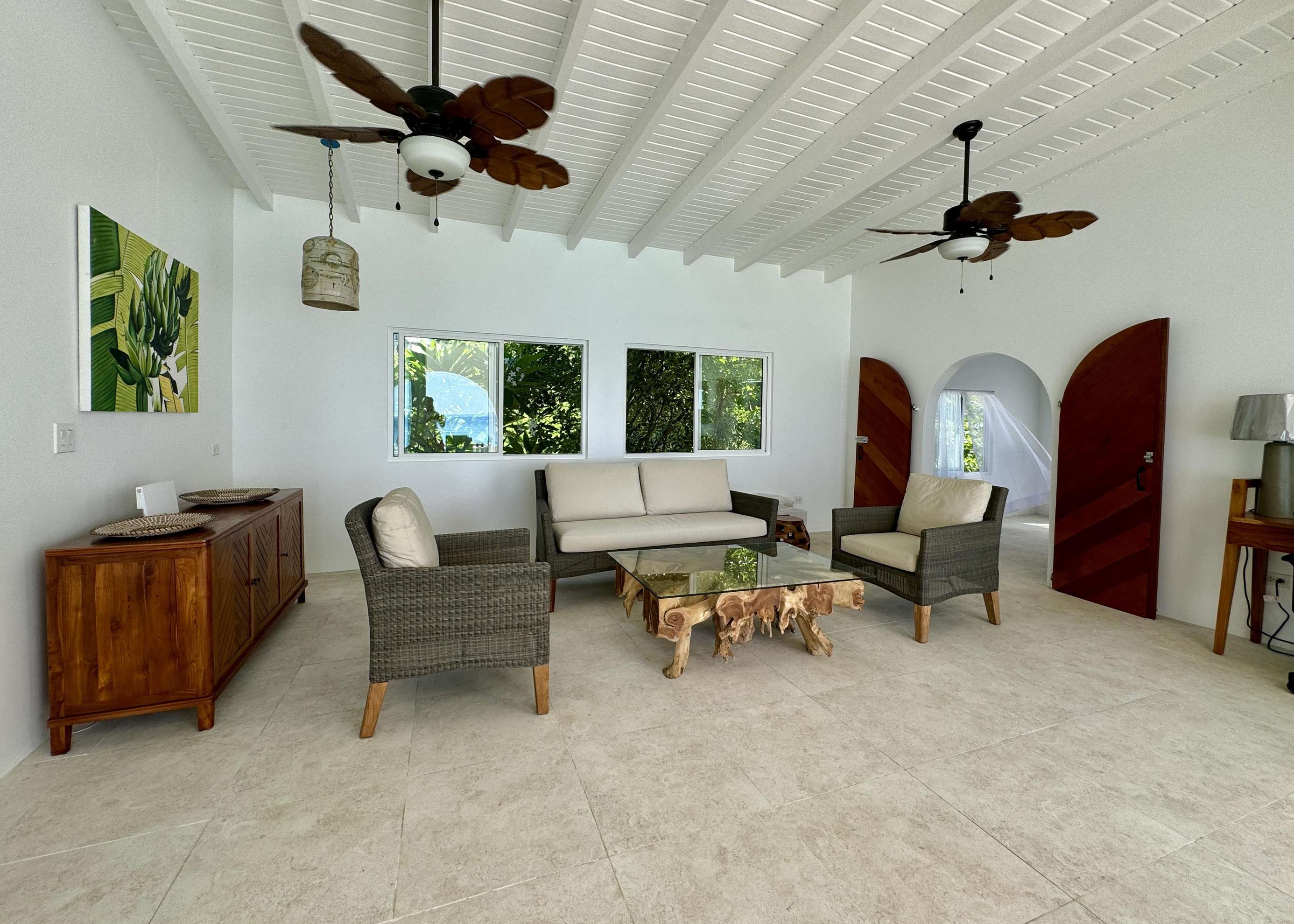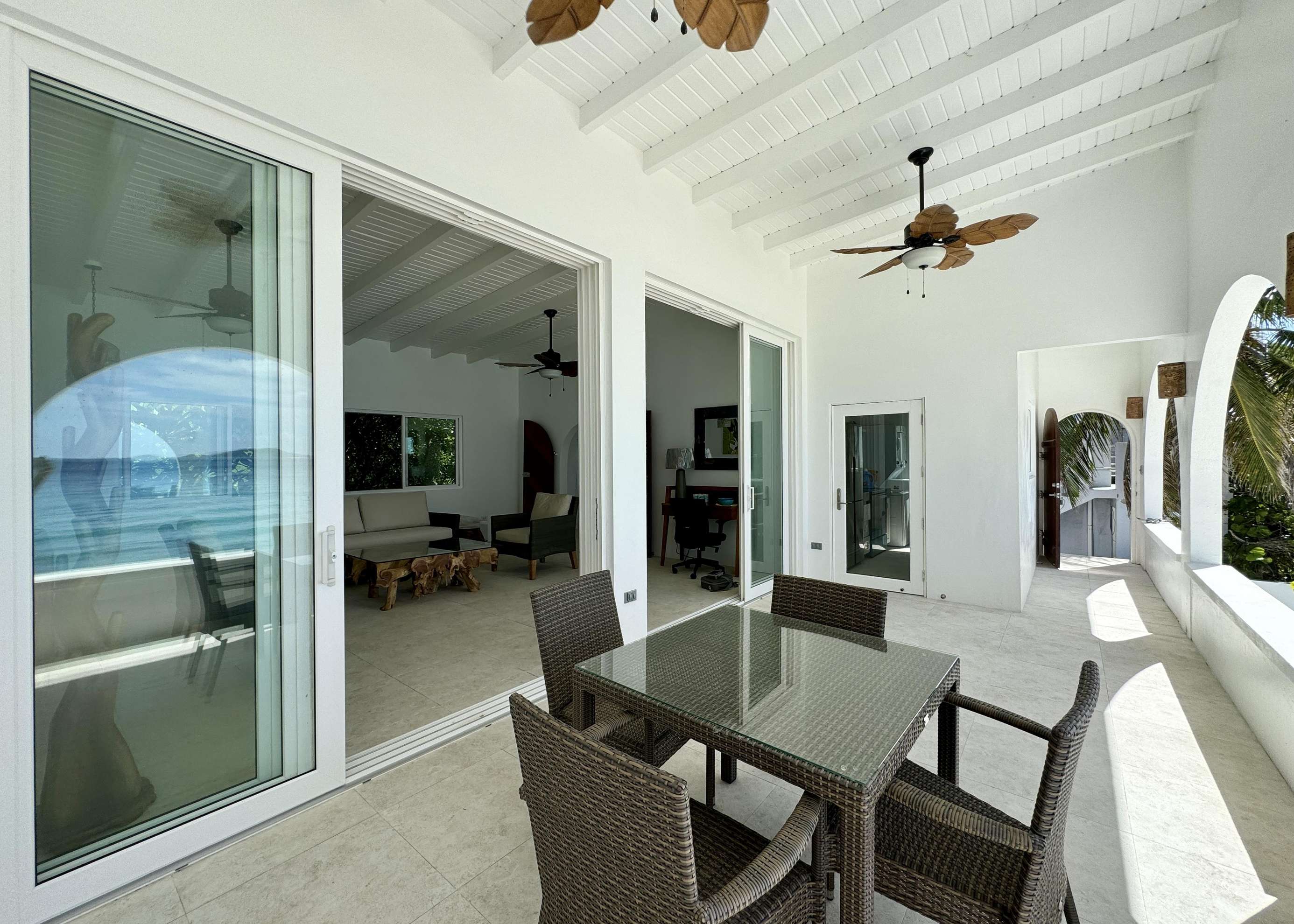 The main living area is flooded with light and air with high ceilings, fresh white walls and azure ocean views. Dark wood furniture contrasts the bright shell around it creating a chic island vibe. The living space is cool and comfortable with ceiling fans and those huge glass doors you can open to the breezes. You’ll also find a desk & desk chair in the living room (what a place to work from home) and a comfy sofa and chair set with coffee table which is the perfect place to kick back with a book or watch the pelicans diving for their dinner below.