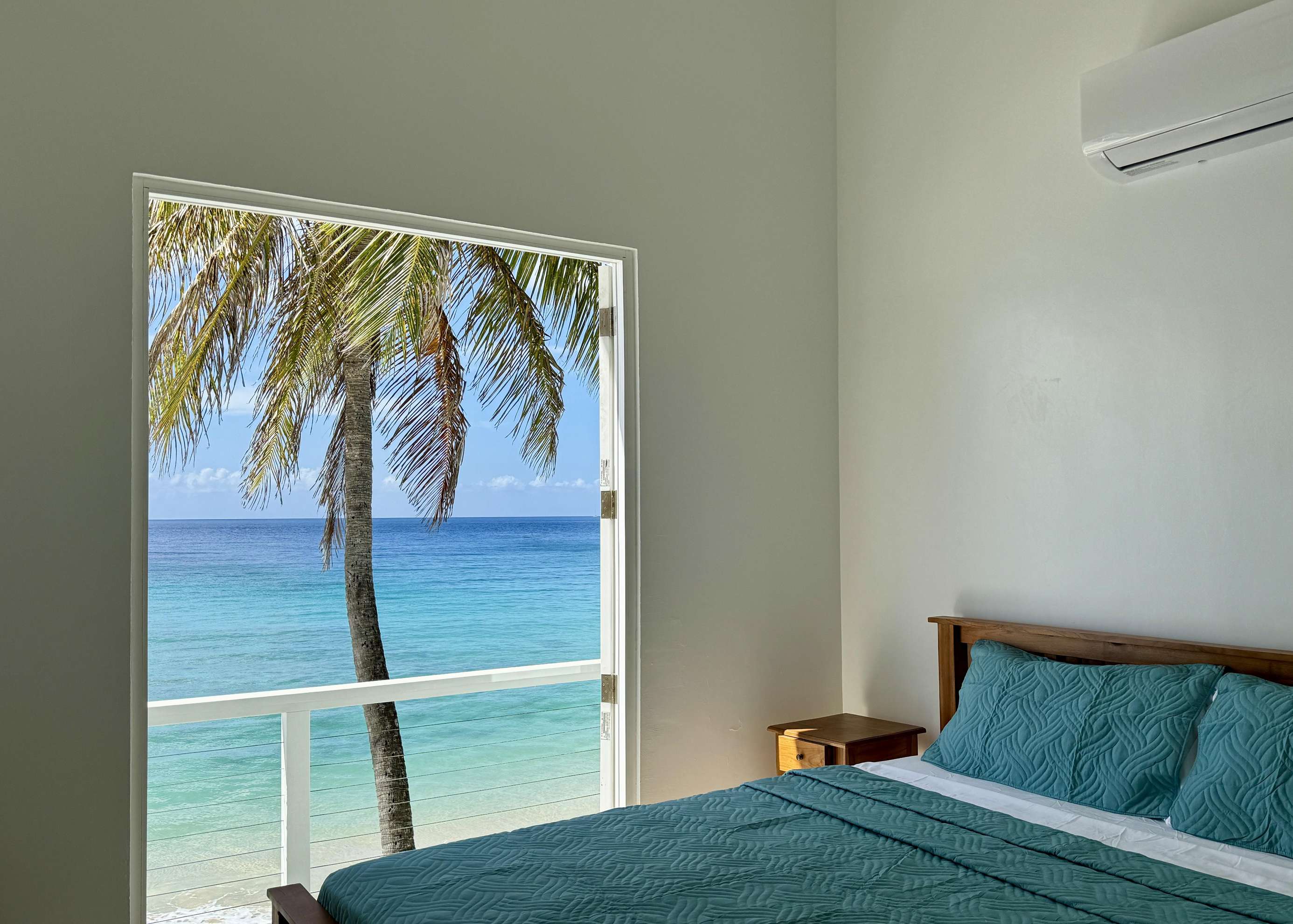 1) In the first bedroom, you won’t even have to leave your bed to enjoy the views out over the turquoise ocean and have a little private balcony to take them in with a morning coffee. You’ll also enjoy a walk-in closet with plenty of hanging and storage space, which leads through to the bathroom (shared with the second bedroom) with double sinks and large walk-in shower.