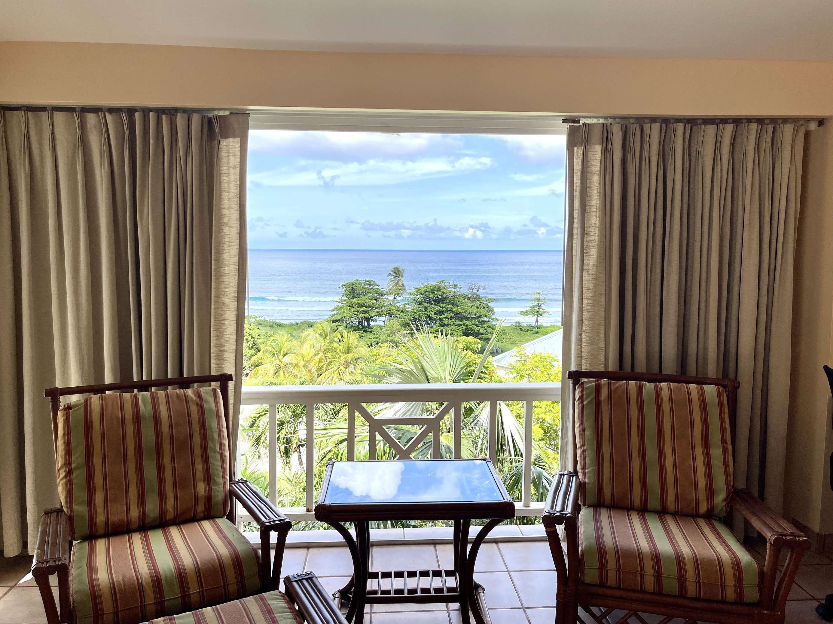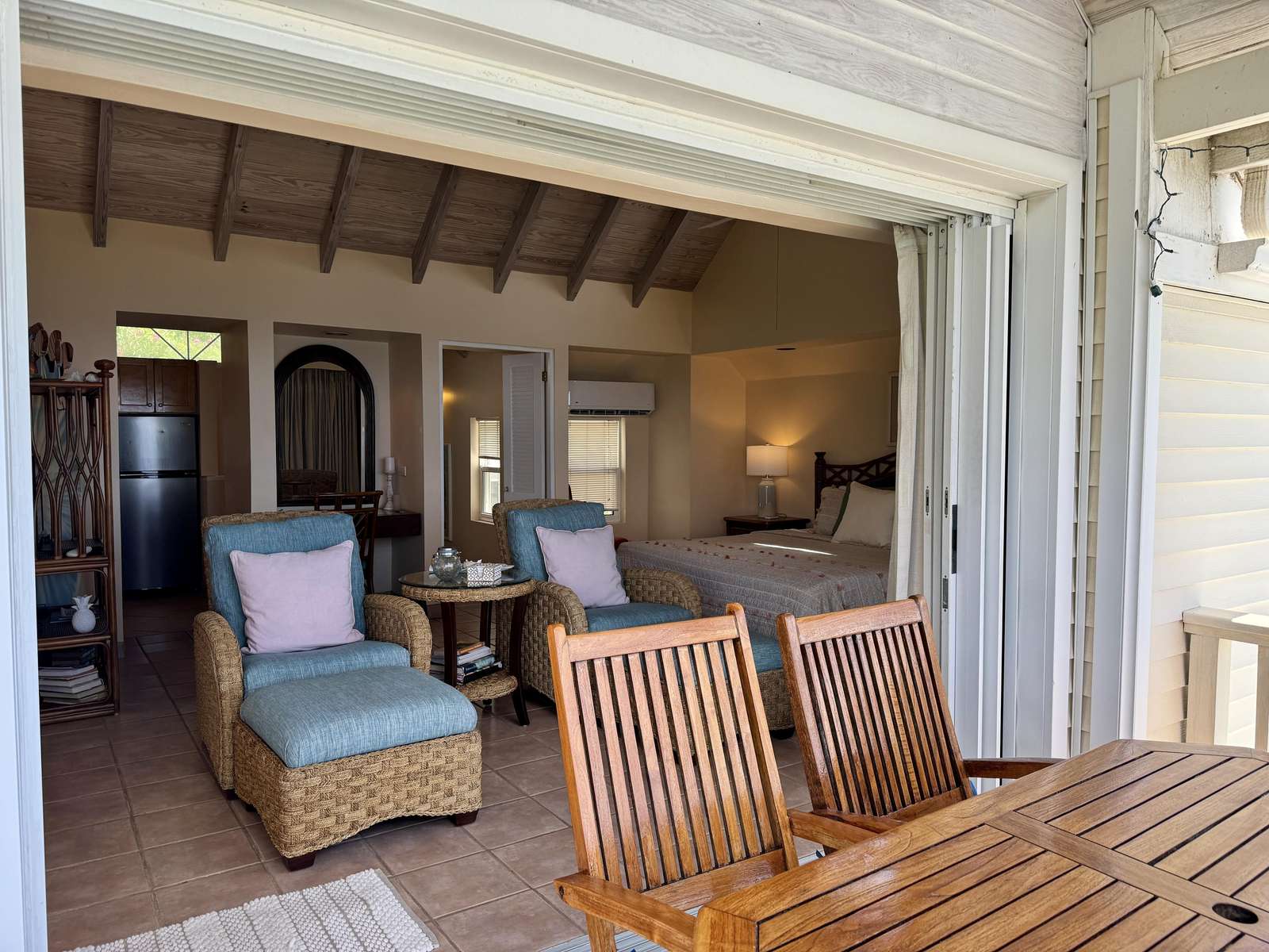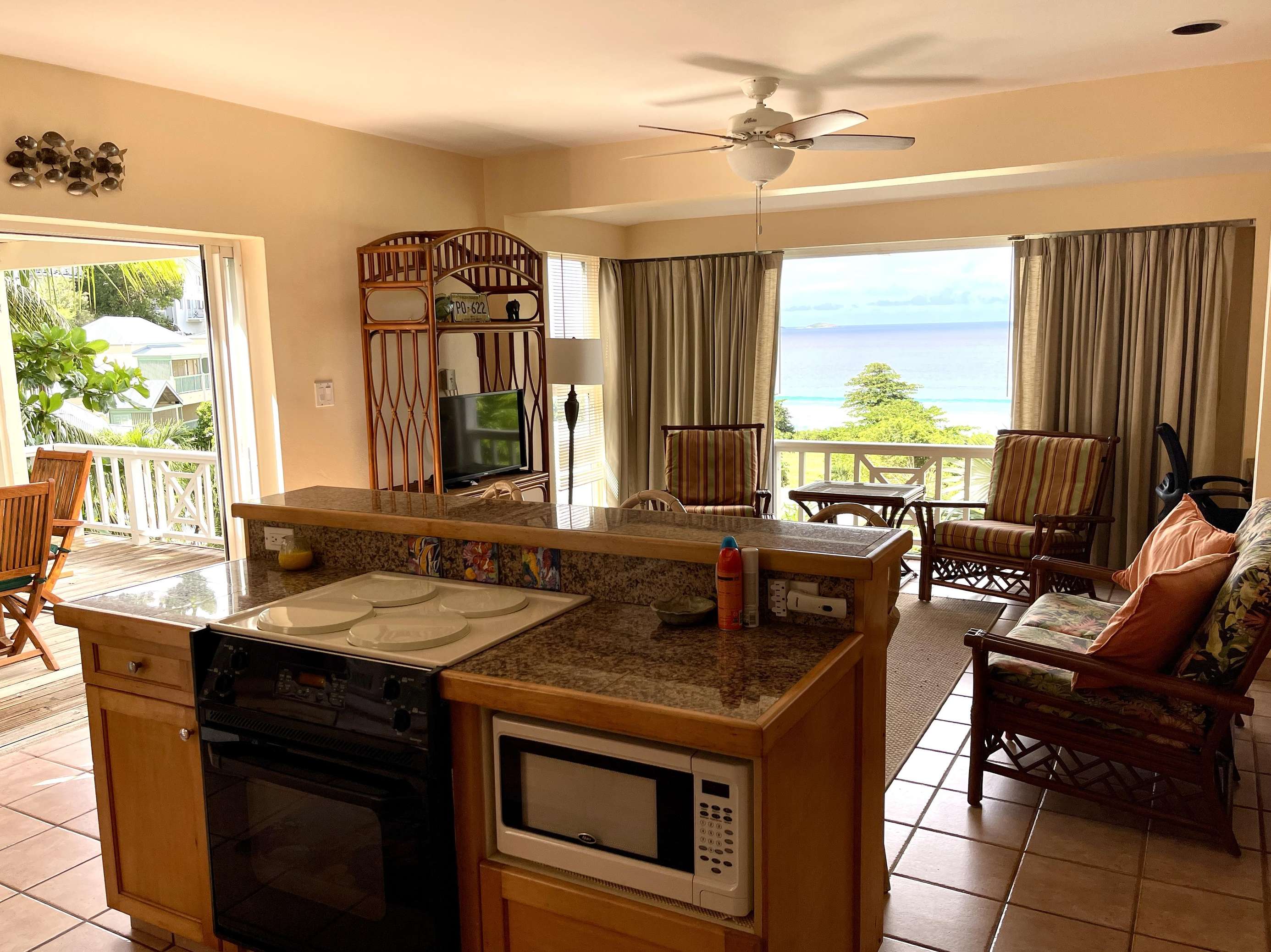 As you enter the property, you’ll be met by an airy open-plan kitchen and living room filled with sunlight and comfortable Caribbean furnishings, only separated by a sociable breakfast bar and island. The kitchen area has all the essentials for self-catering. The living room offers comfortable seating for those moments of downtime, ample work space and, if you can bear to tear your eyes away from the glistening ocean view, FLOW cable TV and hi-speed WIFI.