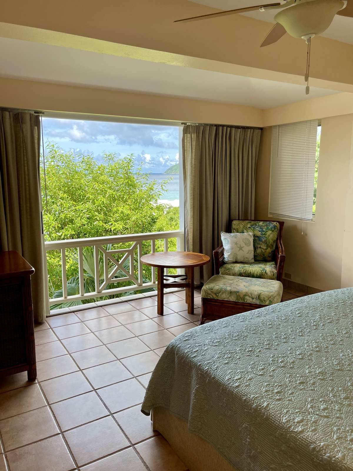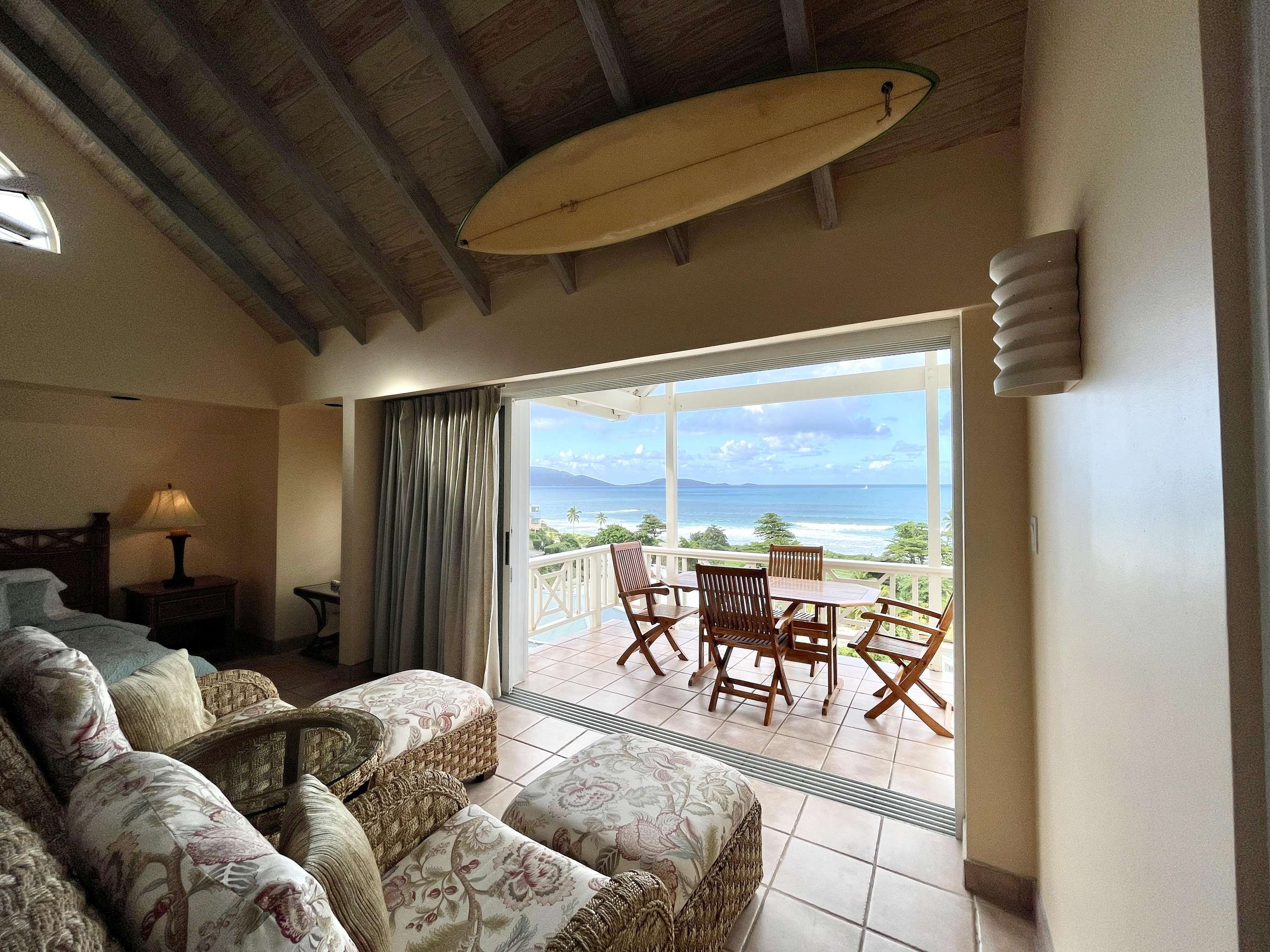 1)The downstairs bedroom and bathroom continue on with the light and breezy feeling of the villa, with plenty of space, a king-sized bed, AC, shower and closet space. Of course, you’ll be met with ocean views here too as the floor to ceiling window slides open wide to a Juliet balcony.