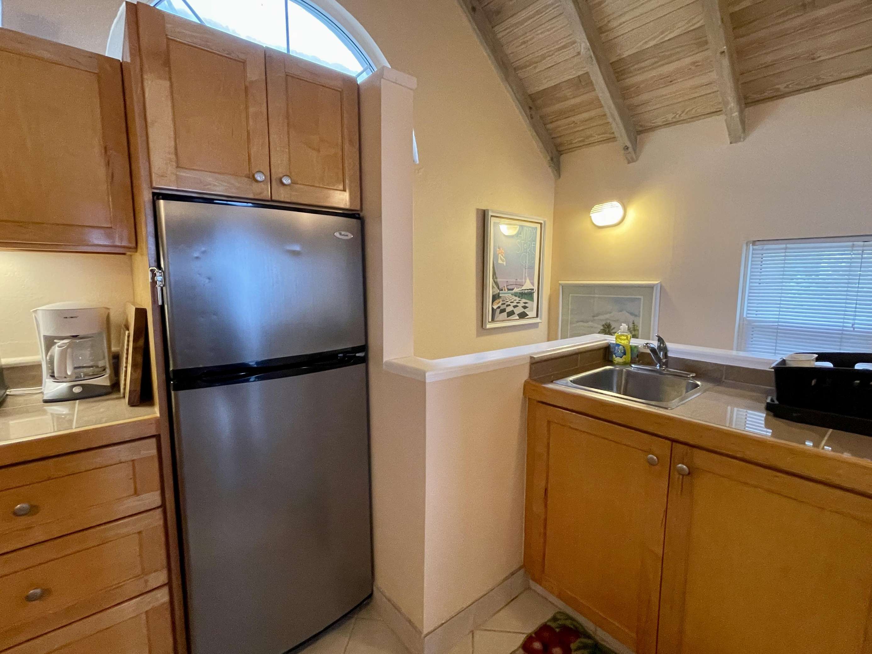 The compact kitchen in the Penthouse is fully equipped for speedy meals with built-in cooktop, microwave, coffee-maker, toaster oven, blender and refrigerator.