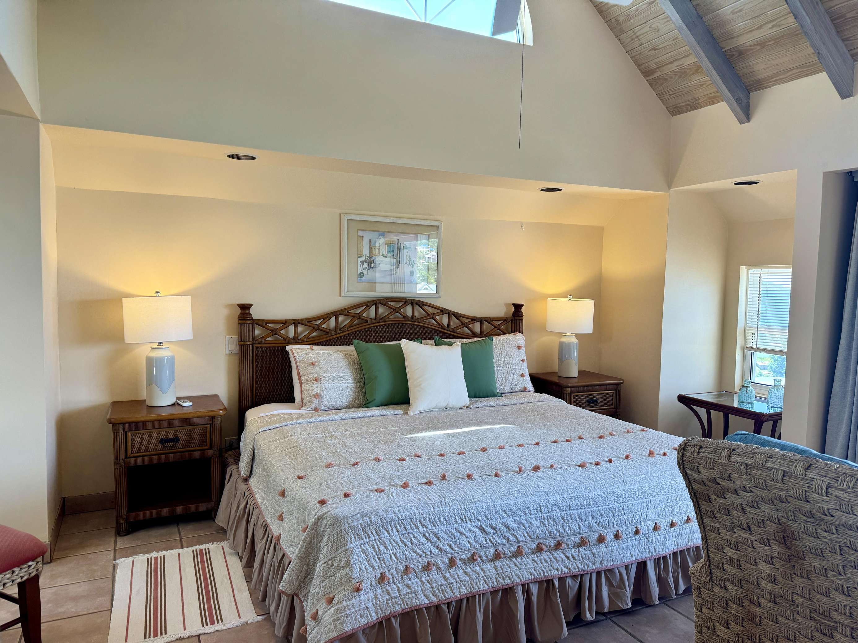 2)Upstairs, you’ll find the Penthouse suite. Airy and filled with sunlight, it has an open studio-style layout with a high vaulted ceiling. Equipped with a king-size bed, two comfortable lounge chairs, a small workspace, AC, cable TV and hi-speed WIFI, you’ll have all your home comforts but with a much better view! The bathroom is spacious and offers a large shower and a dressing area with dresser and hanging closet.