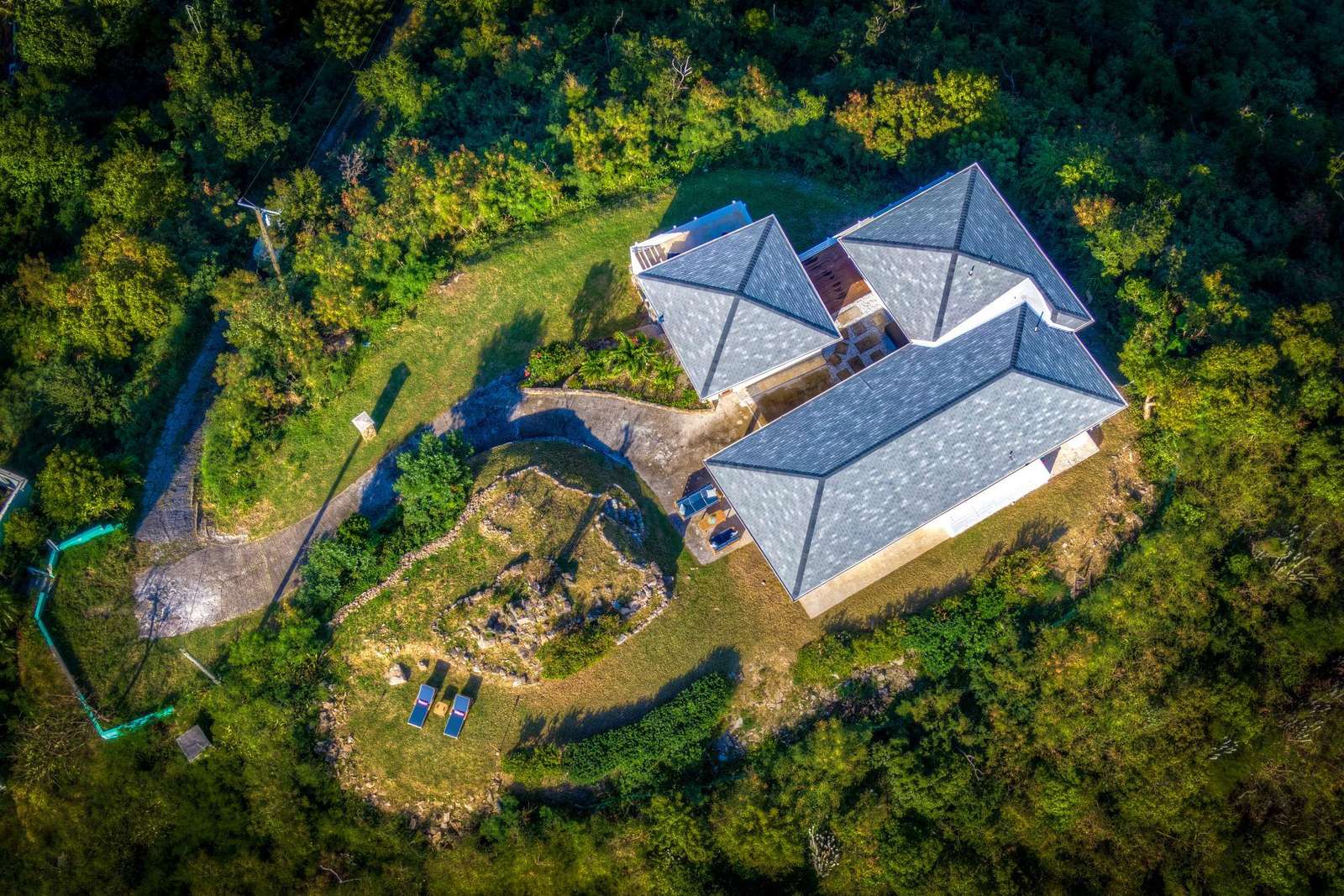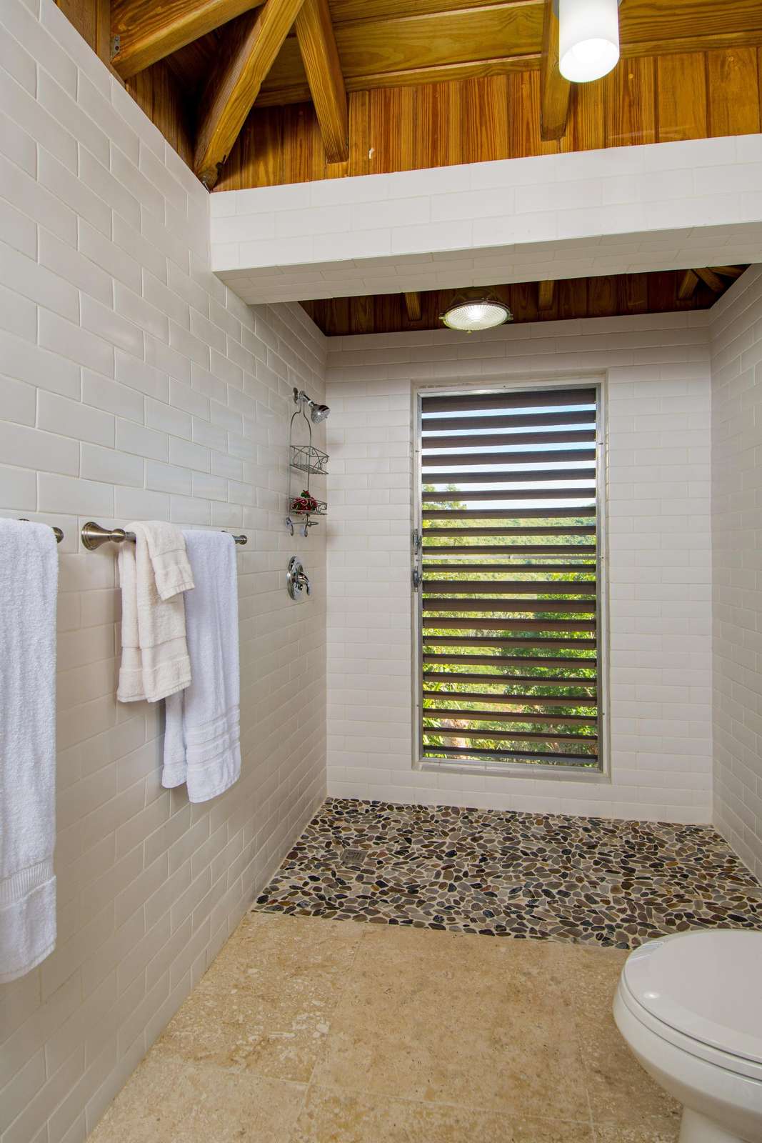 The three spacious air-conditioned bedrooms with ensuite bathrooms are impeccably finished with heavy glass sliding doors showcasing the views from sunrise to sunset, while the dark wood-louvred windows allow the hilltop breezes to flow while providing a private cooling shade