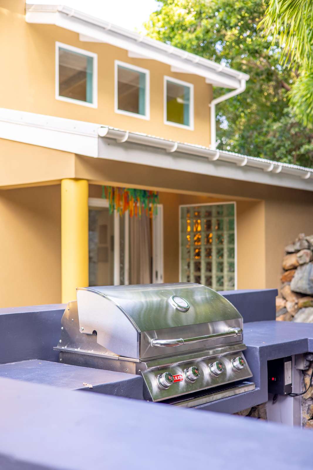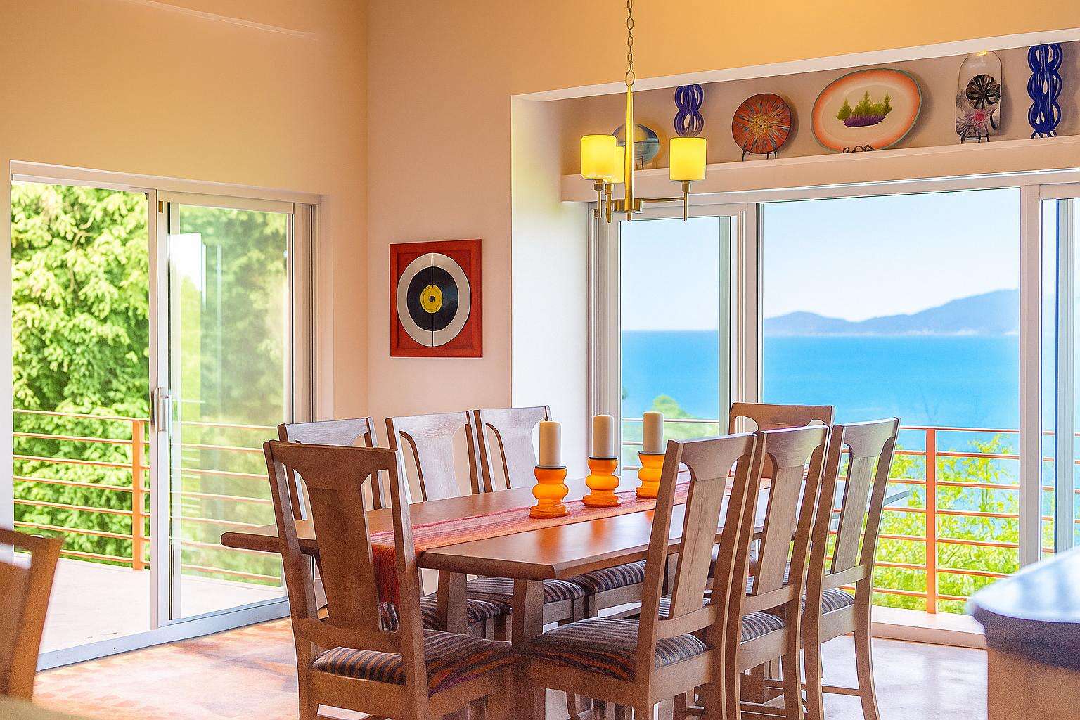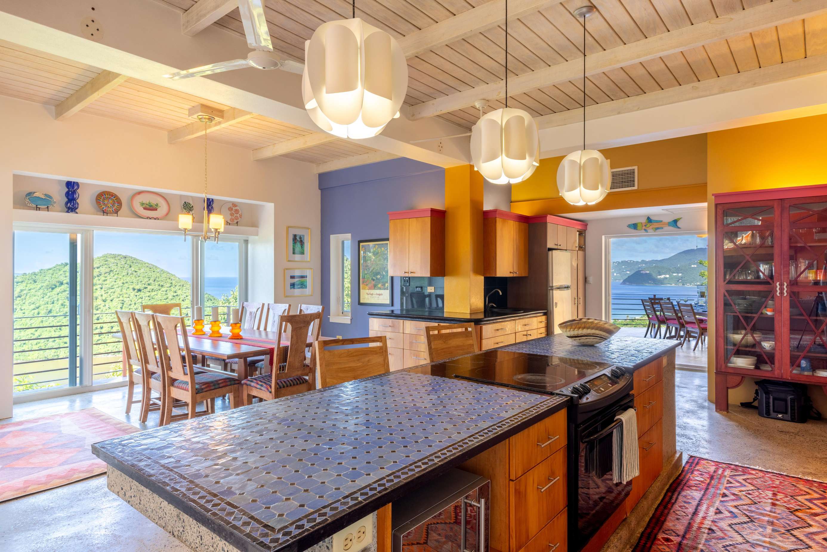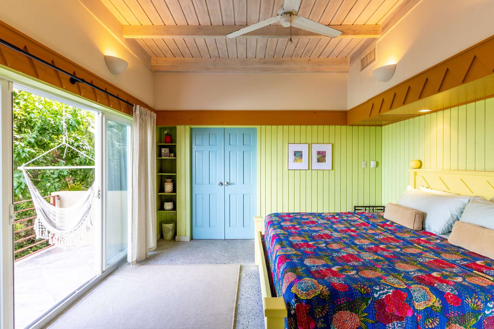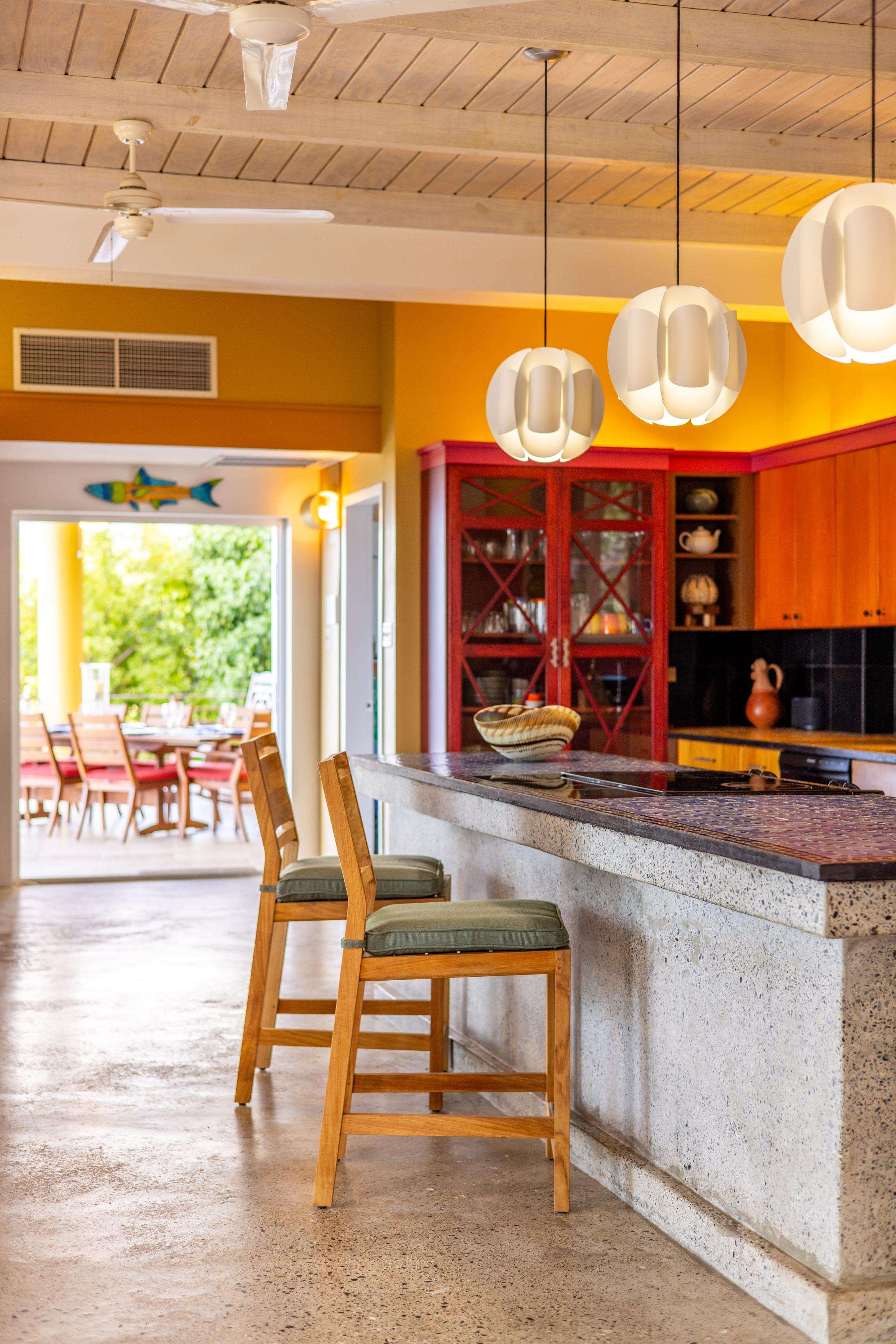 The main house consists of an air conditioned open-plan kitchen, dining & living room with a convenient half-bathroom. You’ll be immediately greeted with sweeping ocean views to the front. These combined with high cathedral ceilings, and its striking signature round window creates a room flooded with natural light & cool air flow. There’s more than enough room for you and your whole party to kick back and relax in and to your left as you enter you’ll find a generously sized L-shape sofa and 50 inch wall-mounted flat screen TV. Large glass sliding doors make up almost the entire of the front wall, not only allowing for glimmering azure vistas but also spacious front balconies to enjoy a morning coffee from. The kitchen area is equally generous in size and fully equipped, with a large delphinium blue tile-topped island running through the middle. This ample workspace also doubles up as a handy breakfast bar with high stools. A stainless-steel double fridge/freezer (plus another single fridge/freezer), built-in 4-ring stove, oven and dishwasher make for the perfect kitchen for catering for big groups. Finally, an indoor dining area with room for 8 overlooks neighbouring islands and if you catch a glimpse of candy-floss pink it may even be a flamingo grazing in Belmont Pond.