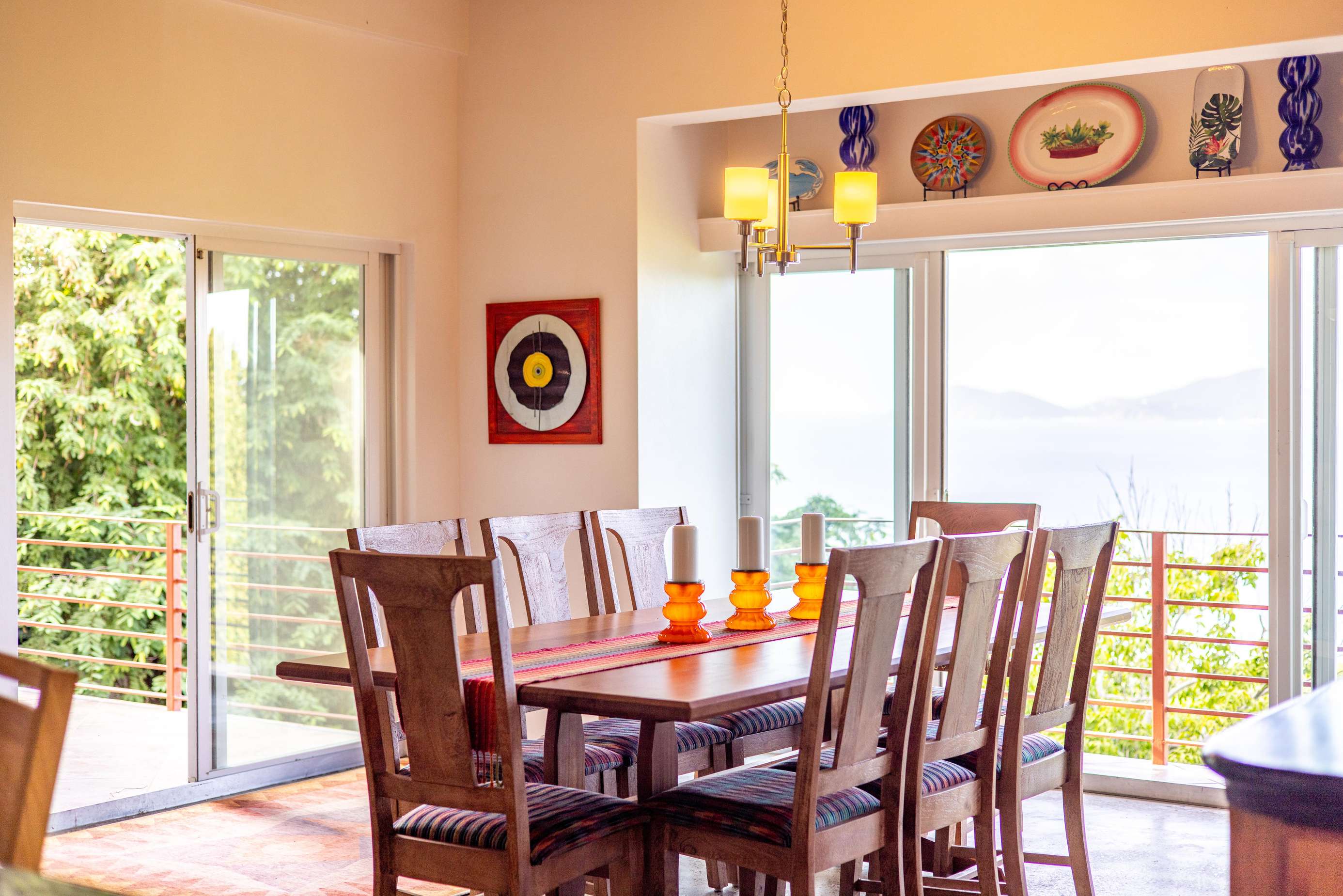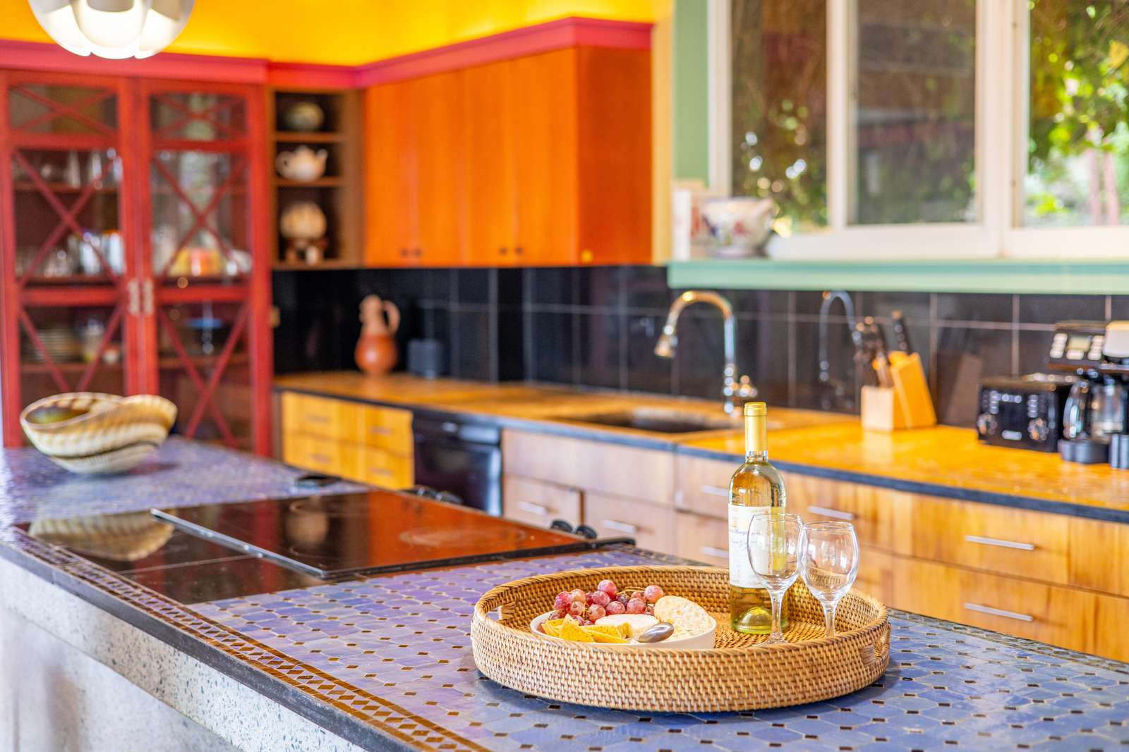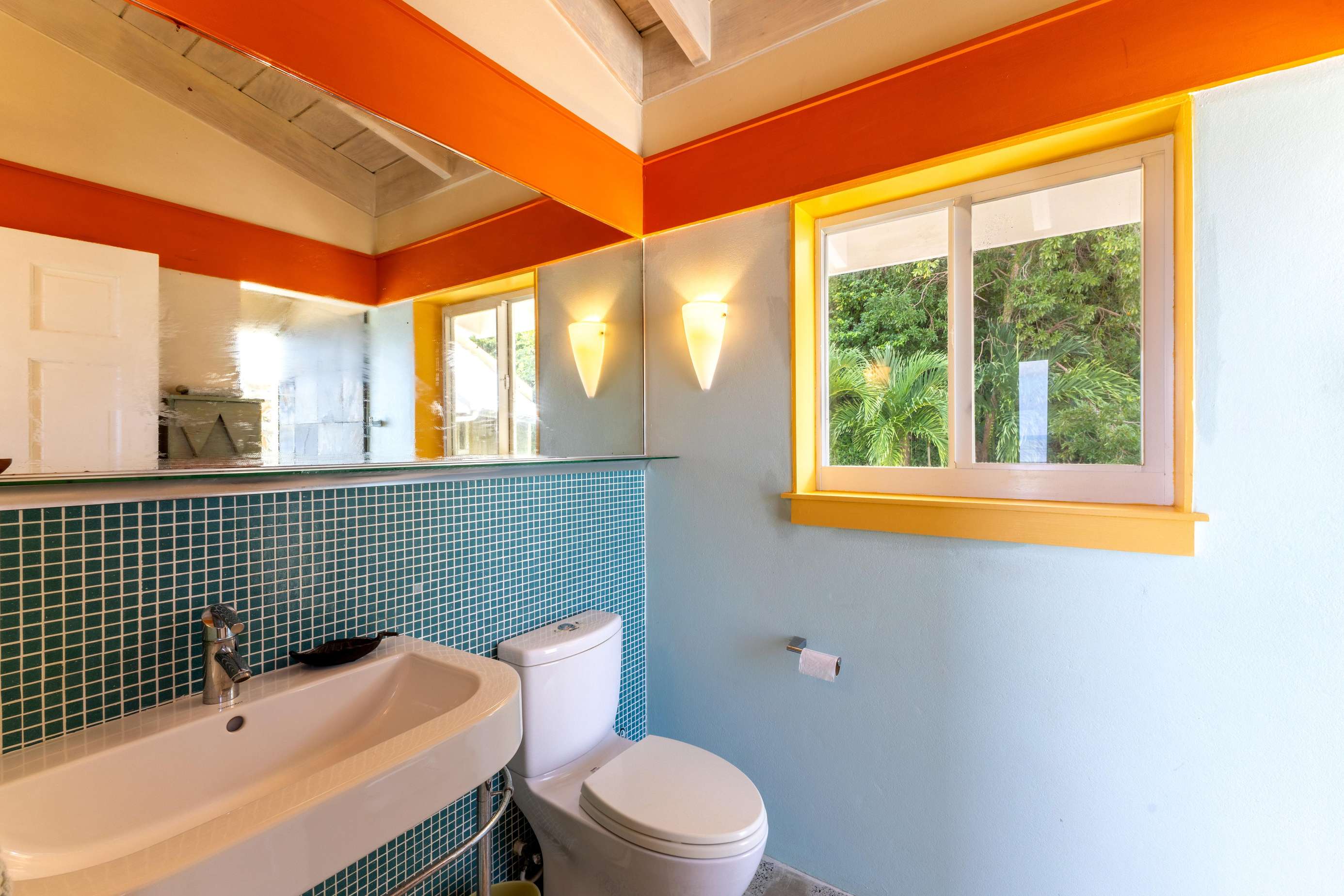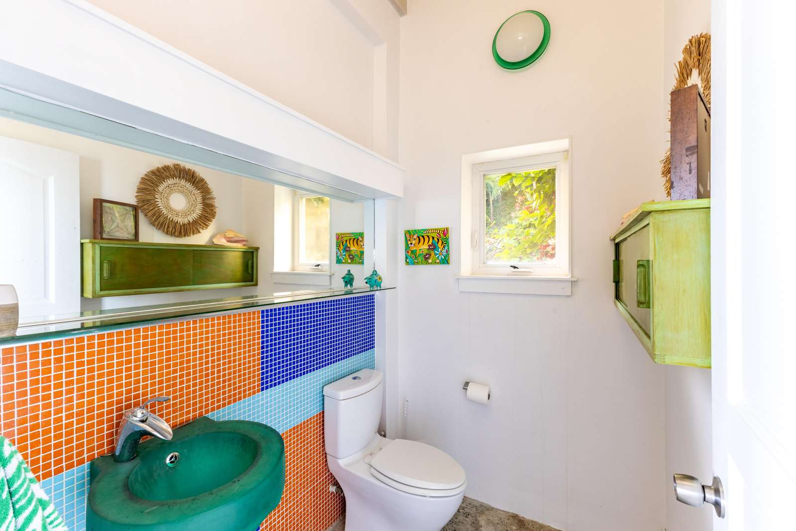The main house consists of an air conditioned open-plan kitchen, dining & living room with a convenient half-bathroom. You’ll be immediately greeted with sweeping ocean views to the front. These combined with high cathedral ceilings, and its striking signature round window creates a room flooded with natural light & cool air flow. There’s more than enough room for you and your whole party to kick back and relax in and to your left as you enter you’ll find a generously sized L-shape sofa and 50 inch wall-mounted flat screen TV. Large glass sliding doors make up almost the entire of the front wall, not only allowing for glimmering azure vistas but also spacious front balconies to enjoy a morning coffee from. The kitchen area is equally generous in size and fully equipped, with a large delphinium blue tile-topped island running through the middle. This ample workspace also doubles up as a handy breakfast bar with high stools. A stainless-steel double fridge/freezer (plus another single fridge/freezer), built-in 4-ring stove, oven and dishwasher make for the perfect kitchen for catering for big groups. Finally, an indoor dining area with room for 8 overlooks neighbouring islands and if you catch a glimpse of candy-floss pink it may even be a flamingo grazing in Belmont Pond.
