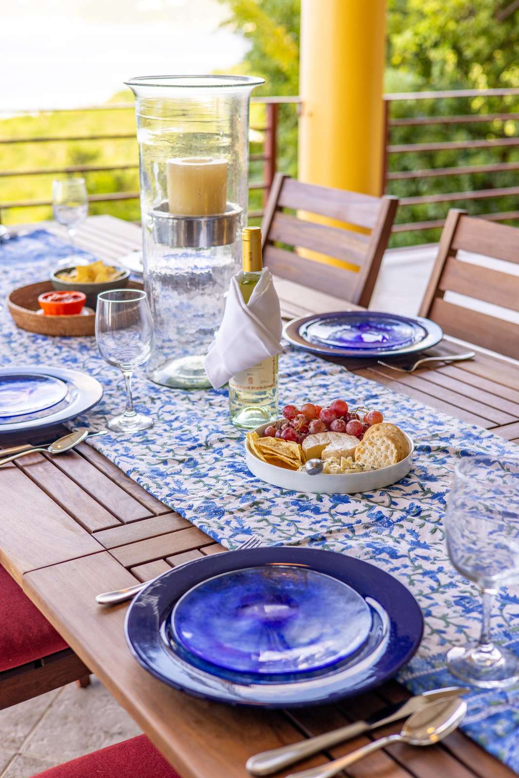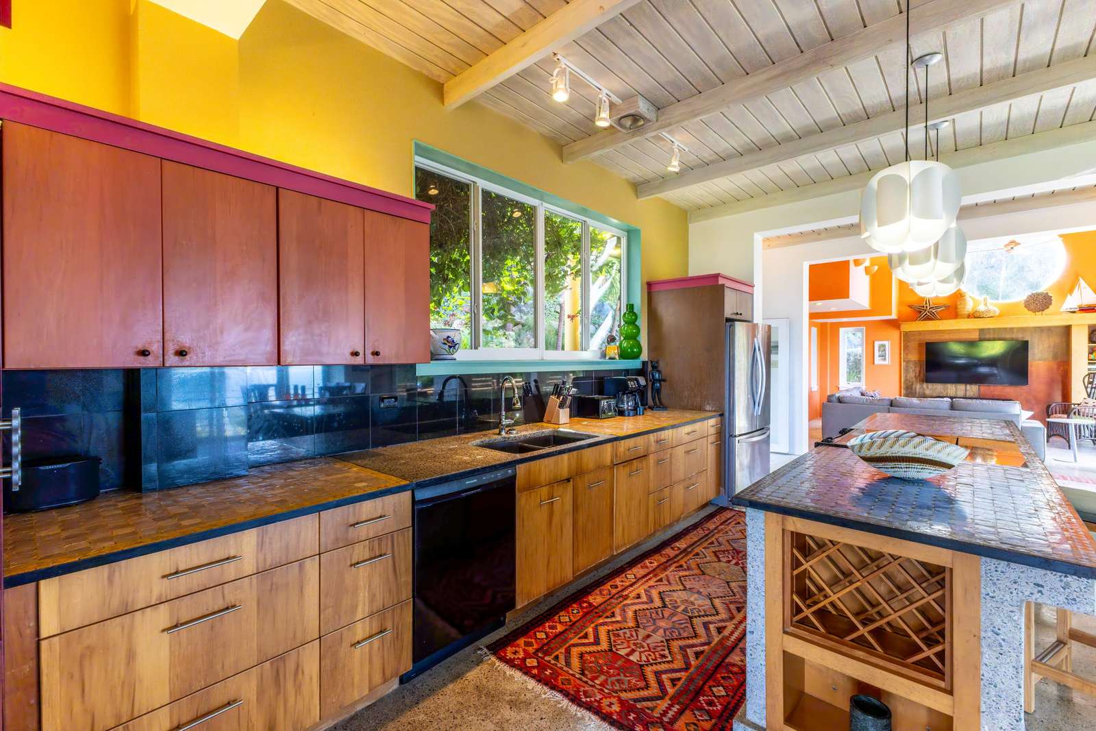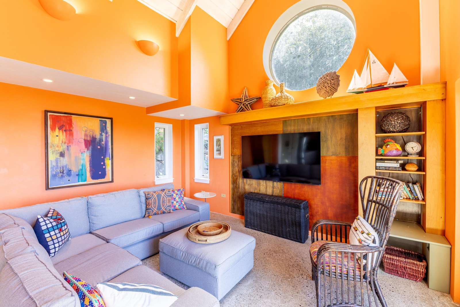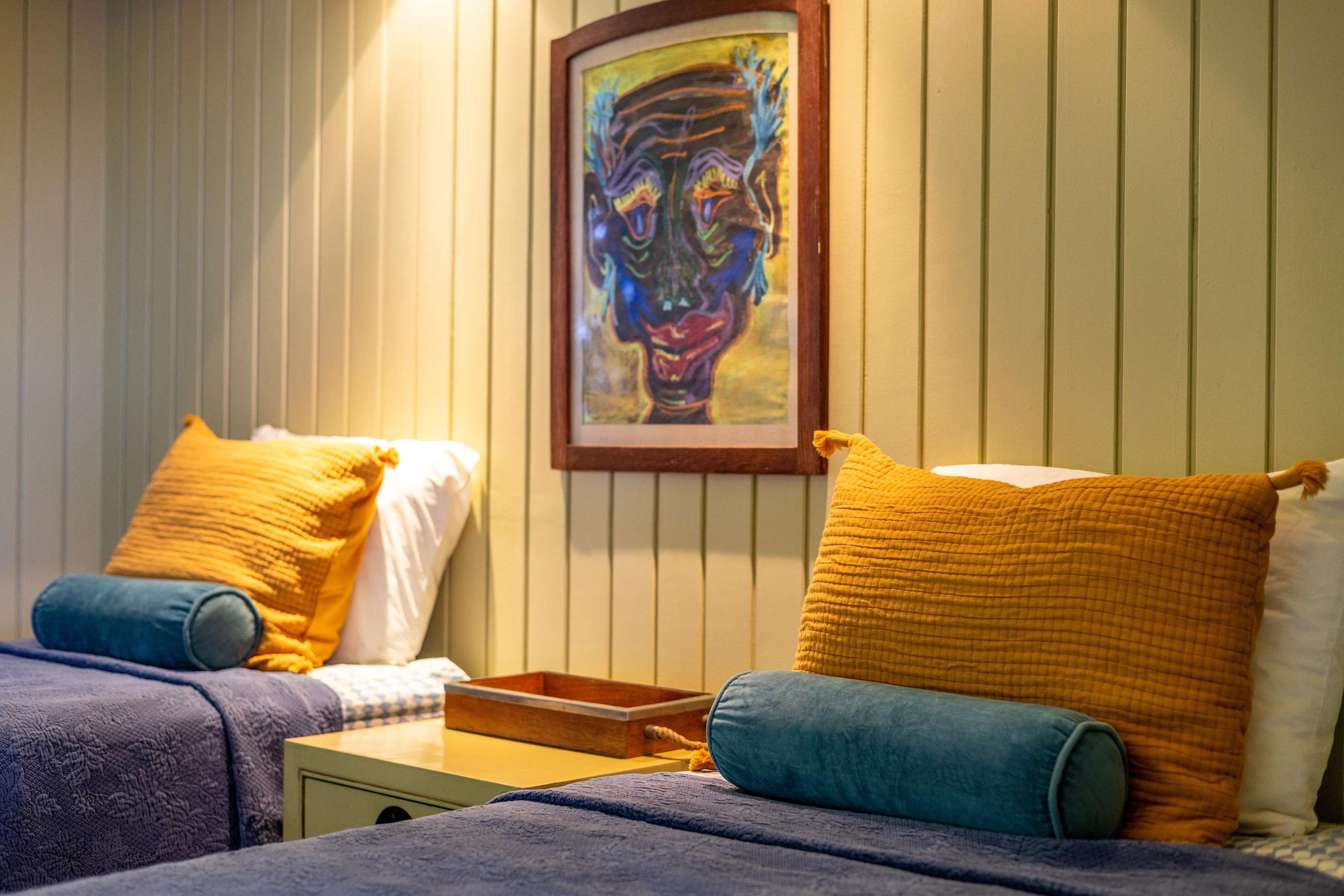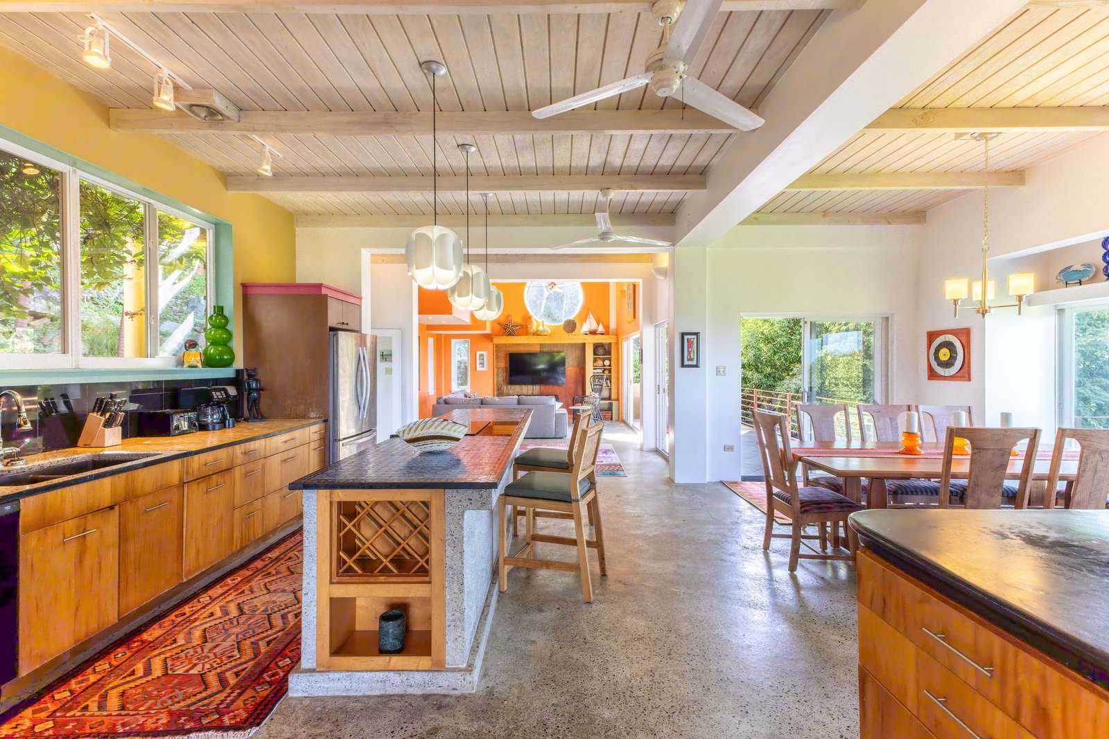 The main house consists of an air conditioned open-plan kitchen, dining & living room with a convenient half-bathroom. You’ll be immediately greeted with sweeping ocean views to the front. These combined with high cathedral ceilings, and its striking signature round window creates a room flooded with natural light & cool air flow. There’s more than enough room for you and your whole party to kick back and relax in and to your left as you enter you’ll find a generously sized L-shape sofa and 50 inch wall-mounted flat screen TV. Large glass sliding doors make up almost the entire of the front wall, not only allowing for glimmering azure vistas but also spacious front balconies to enjoy a morning coffee from. The kitchen area is equally generous in size and fully equipped, with a large delphinium blue tile-topped island running through the middle. This ample workspace also doubles up as a handy breakfast bar with high stools. A stainless-steel double fridge/freezer (plus another single fridge/freezer), built-in 4-ring stove, oven and dishwasher make for the perfect kitchen for catering for big groups. Finally, an indoor dining area with room for 8 overlooks neighbouring islands and if you catch a glimpse of candy-floss pink it may even be a flamingo grazing in Belmont Pond.