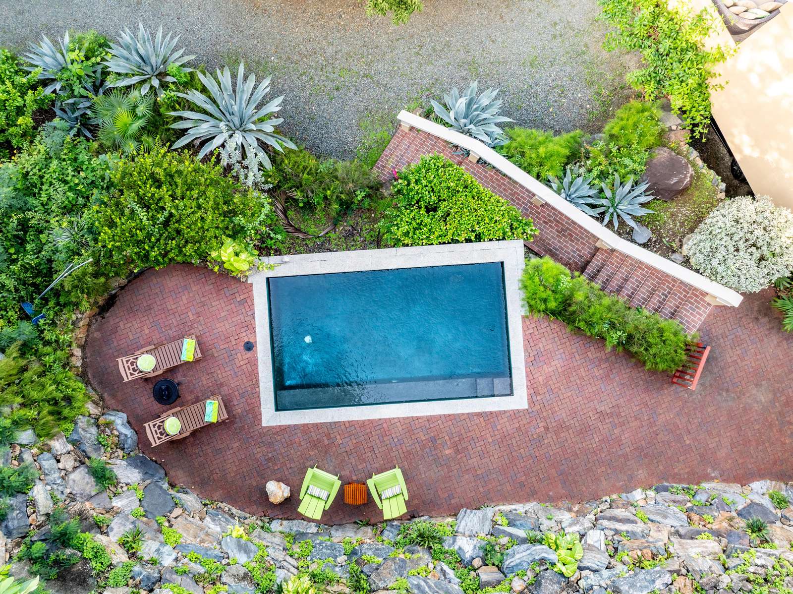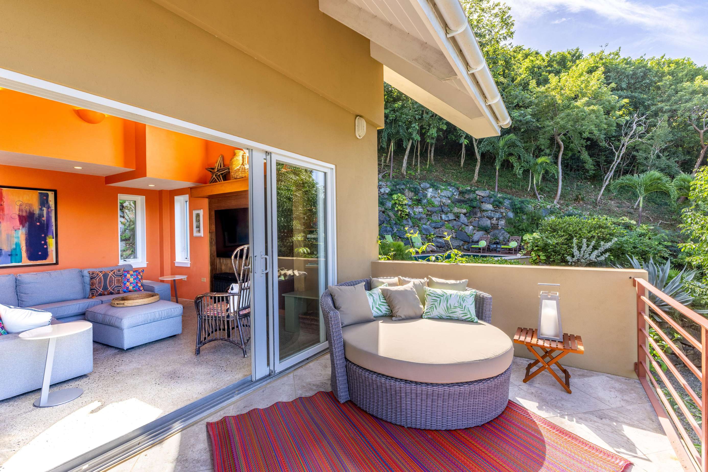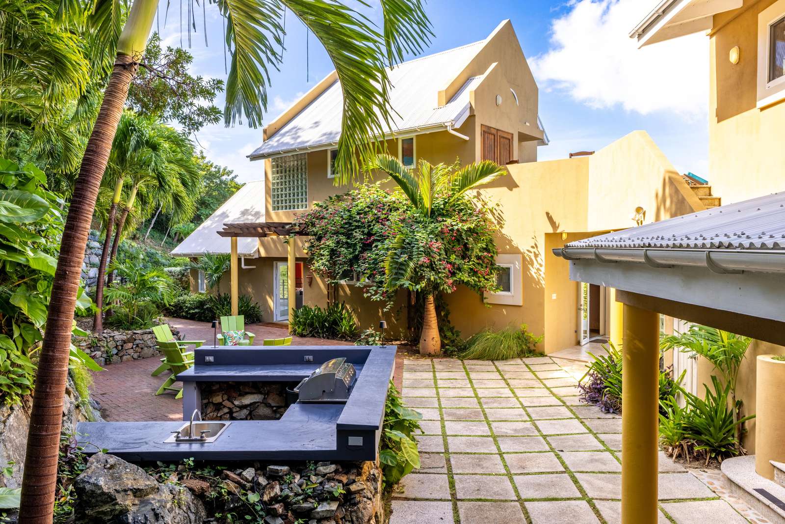 Like any great vacation villa, the outdoor areas are just as important as the indoors at Stargazer. Upon entry from the driveway, you’ll reach a cooling turquoise pool. Surrounded by nothing but the song of the birds and & the rustling of lush tropical greenery, the pool area is a true oasis. Chill on the loungers & catch some rays or enjoy a glass of something cold while dipping your toes in. A really special part of this villa is the amazing patio at the back of the house. A purpose built bar with built-in gas BBQ, outdoor sink & bar stools create an amazing entertaining area. This coupled with a set of Adirondak chairs & coffee table make for the perfect place to grill up a local Anegada lobster under the stars. This area is conveniently right by the kitchen & downstairs covered dining terrace complete with custom-made mahogany dining table. Dinner with an ocean view never gets old! The upstairs sun terrace is another great place for chilling – with sun loungers & a great vantage point, you’ll find it hard to leave!