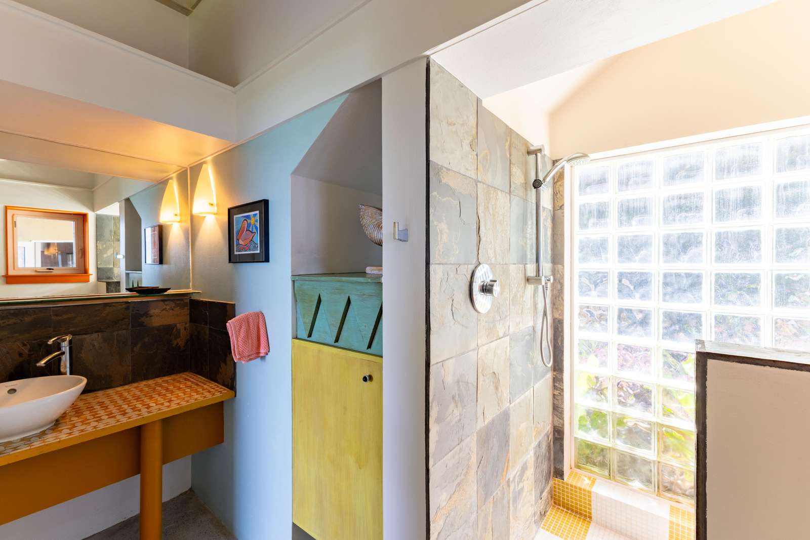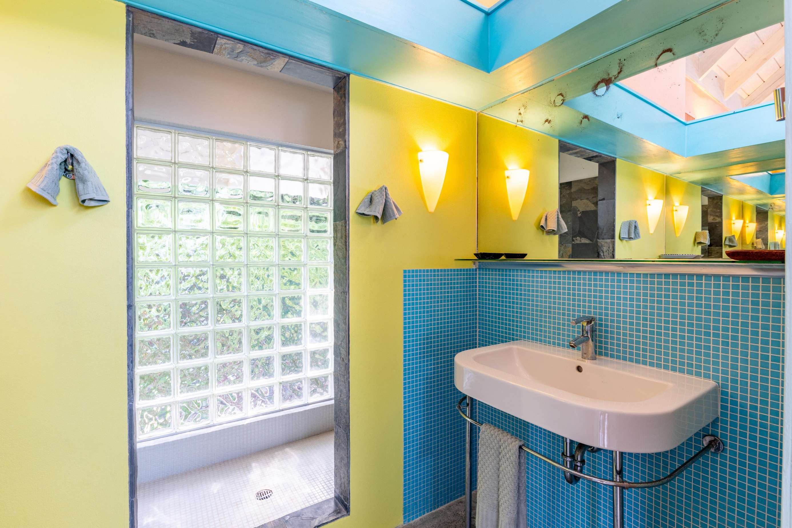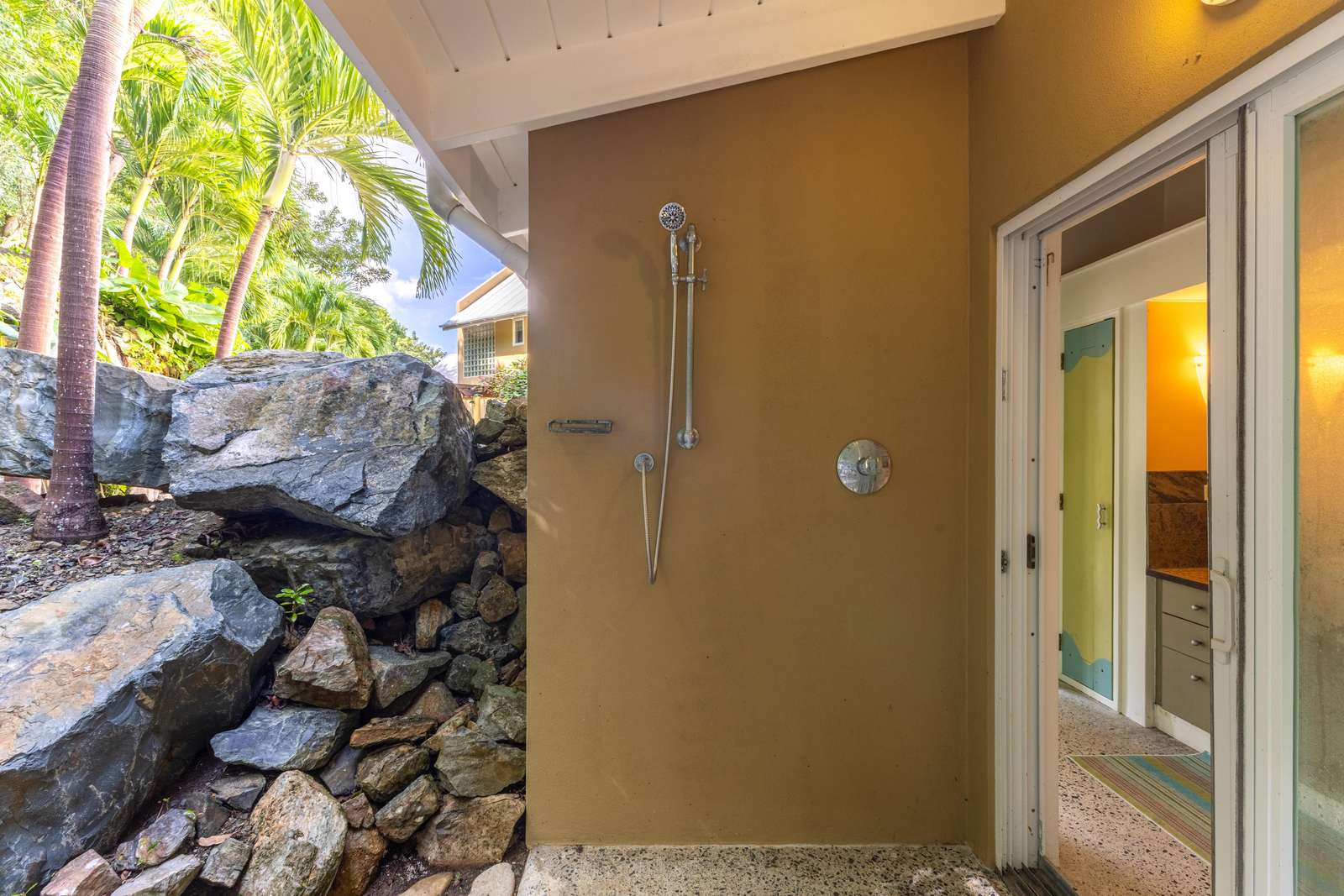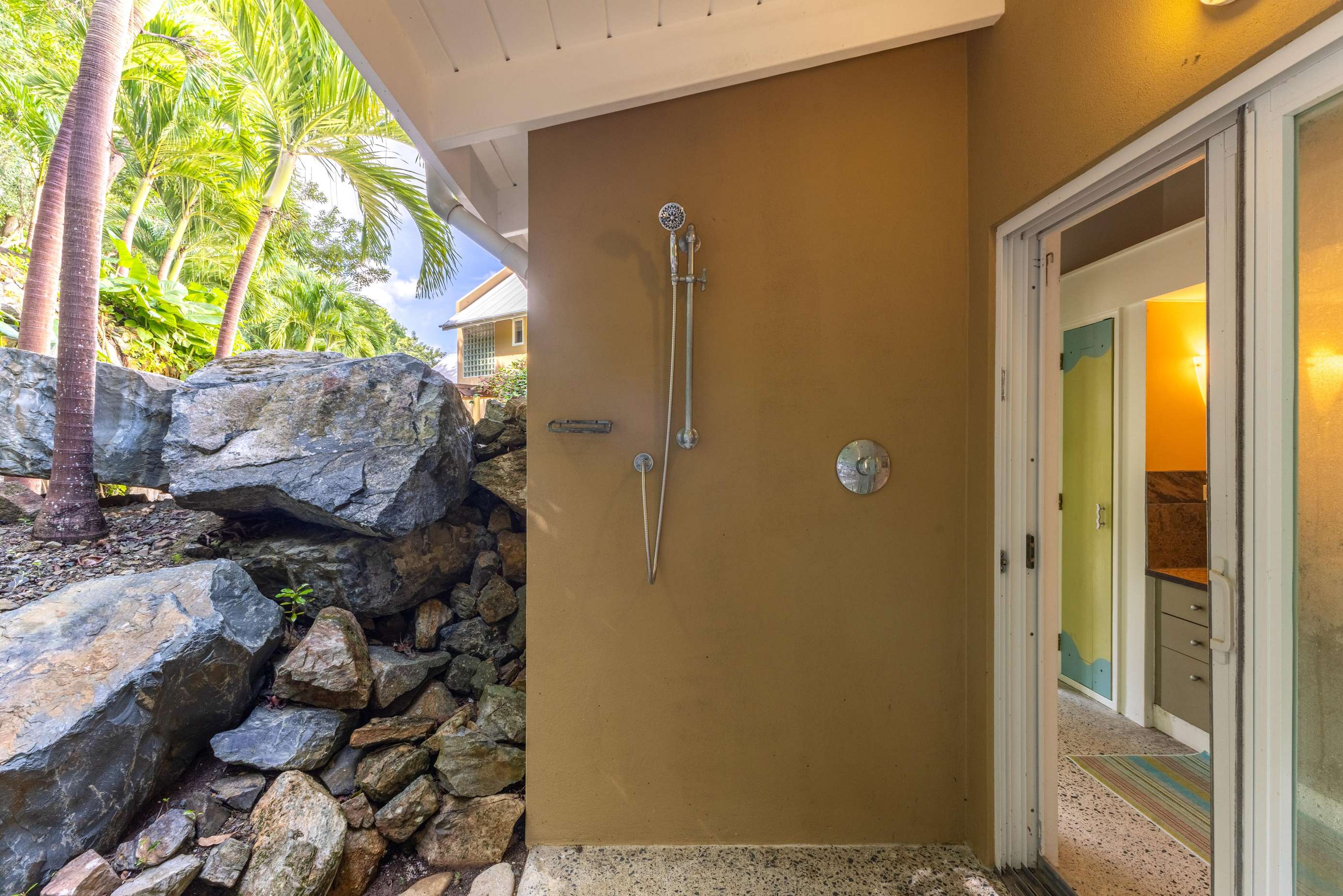 1) A short sunlight-filled stroll across the terrace from the kitchen will lead you to the two bedrooms on the ground floor. The first you’ll reach has a king-bed & spacious ensuite bathroom with glass-tiled walk-in shower letting in the Caribbean sunshine.
