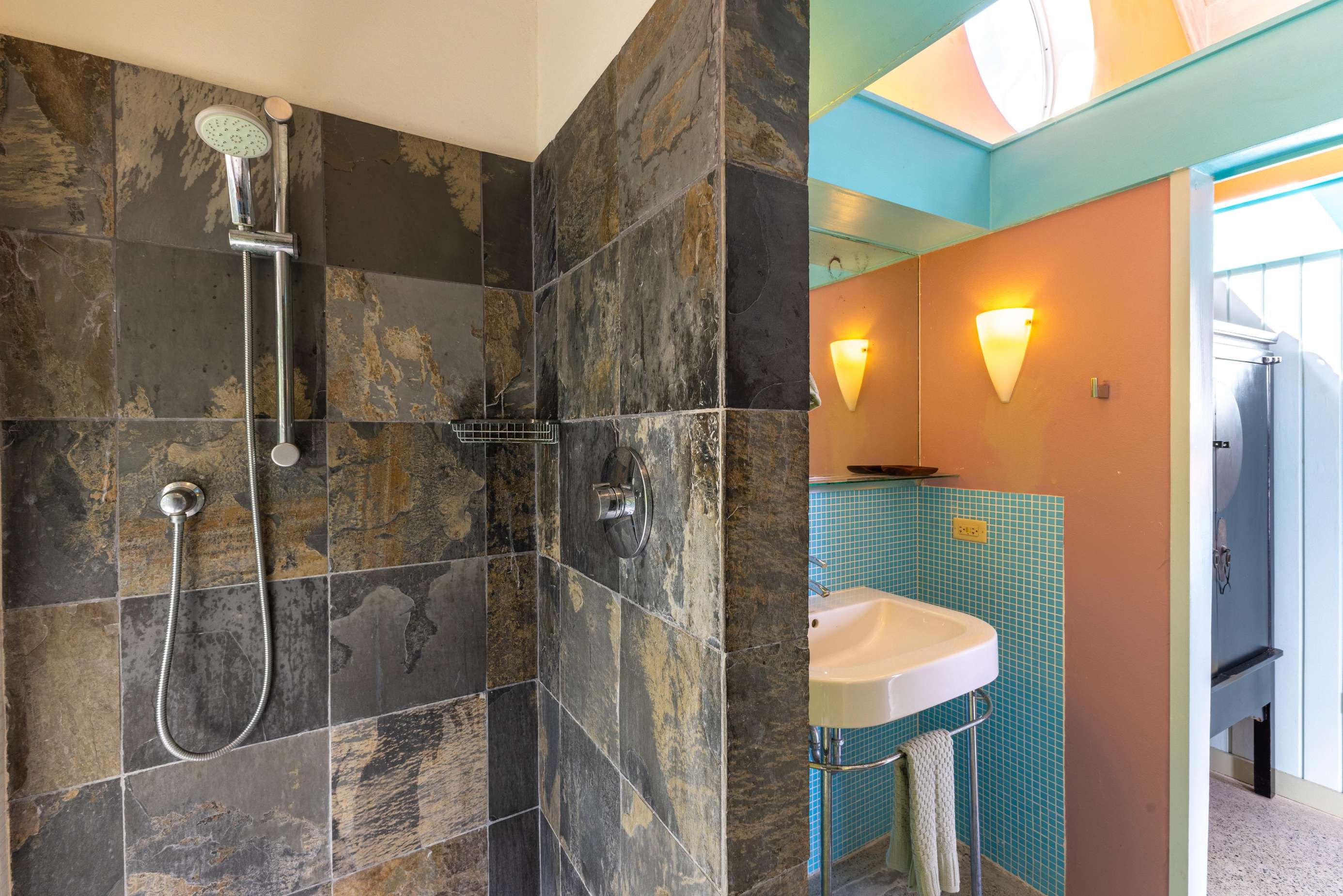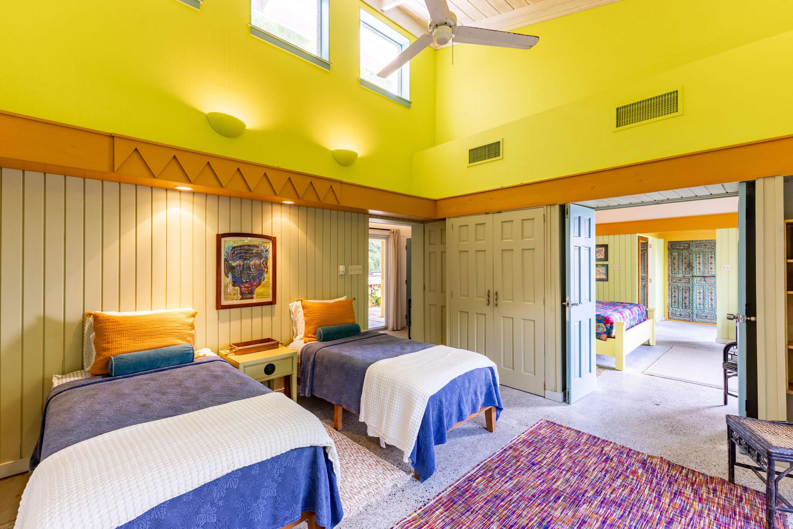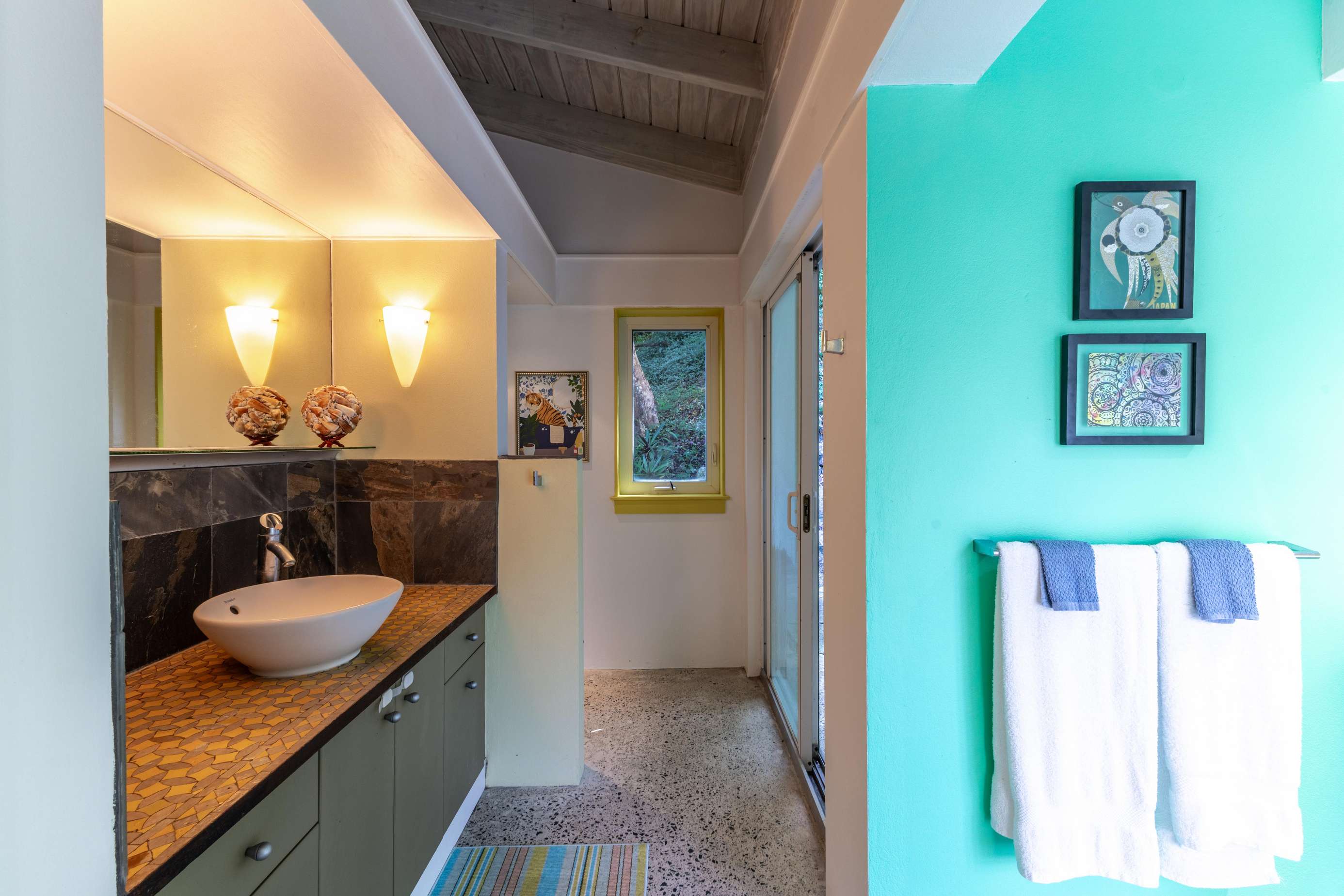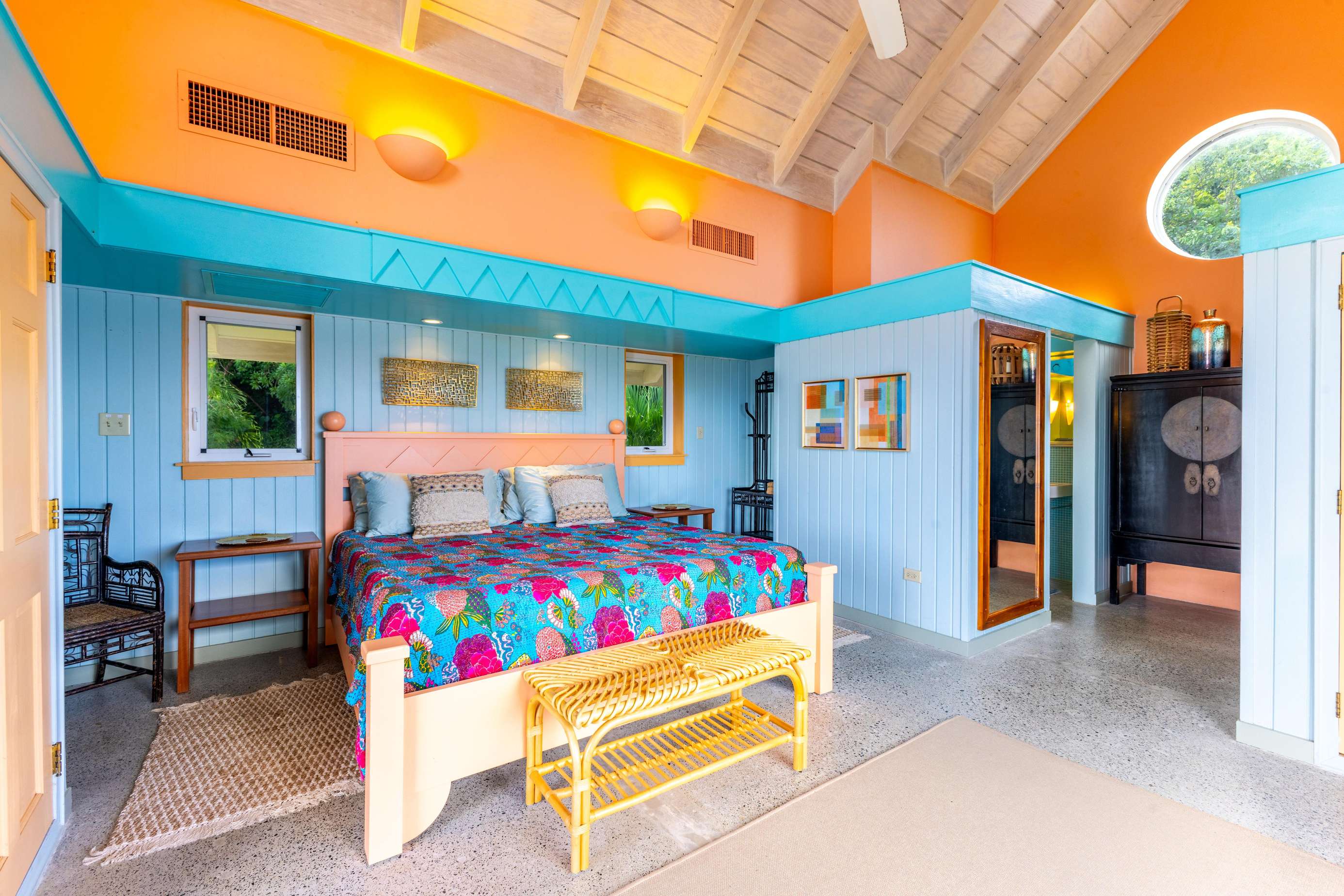 3) A quick hop up the external stairs (accessed from the very spacious outdoor patio to the rear of the house) will take you up to the top 2 bedrooms & next huge outdoor terrace! A second king suite/primary greets you to your left, complete with high vaulted ceilings, playful artwork, access to a little balcony to the front with those gorgeous ocean views & ensuite bathroom with glass tiled walk-in shower.