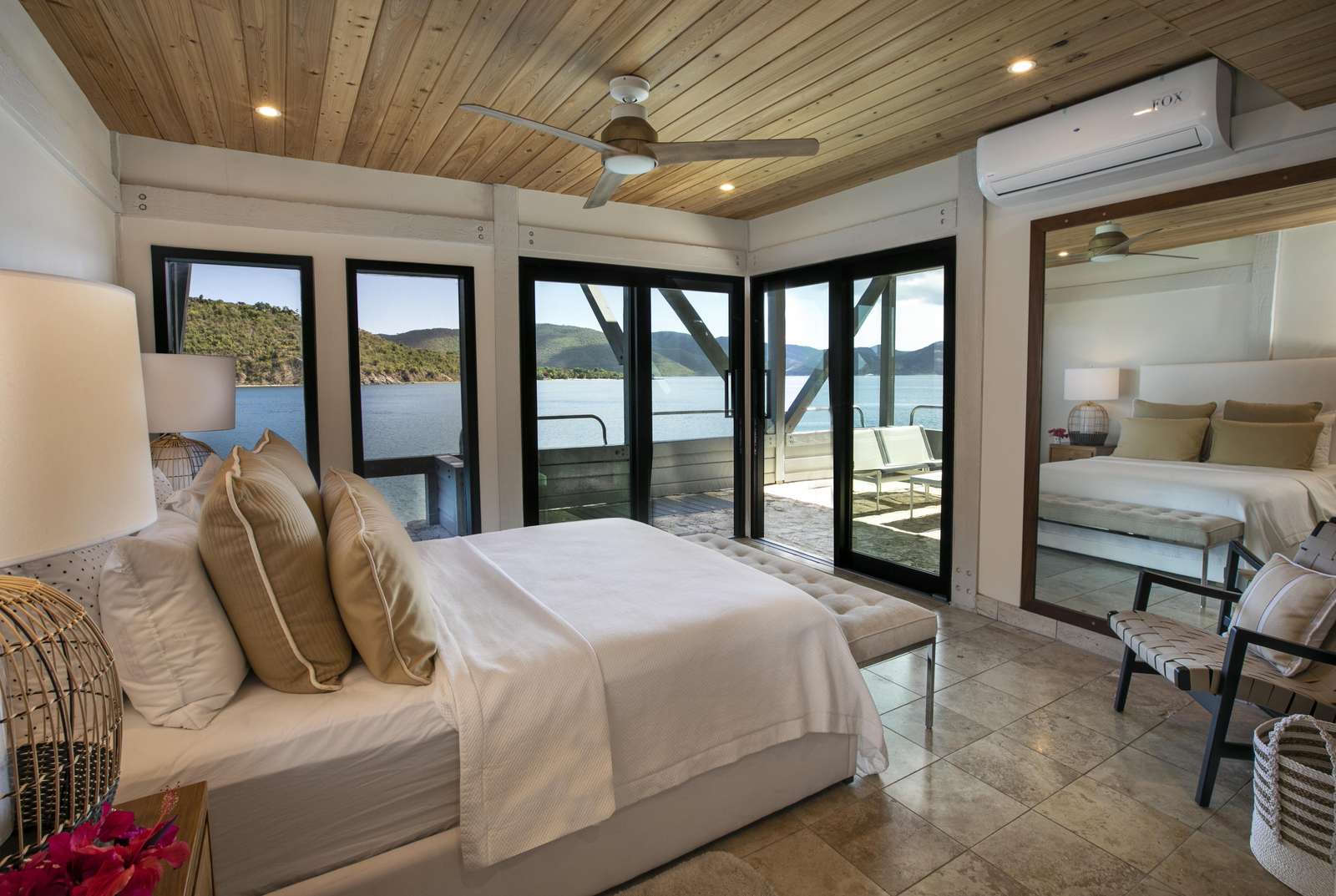 There are five beautiful cool and airy bedrooms each with their own bath facilities. Some have their own private verandahs and all enjoy a unique vista of the turquoise sea outside. Everything inside is pale and calm so as not to take away from the glory of the surrounding views which are framed by the floor to ceiling windows at every level.