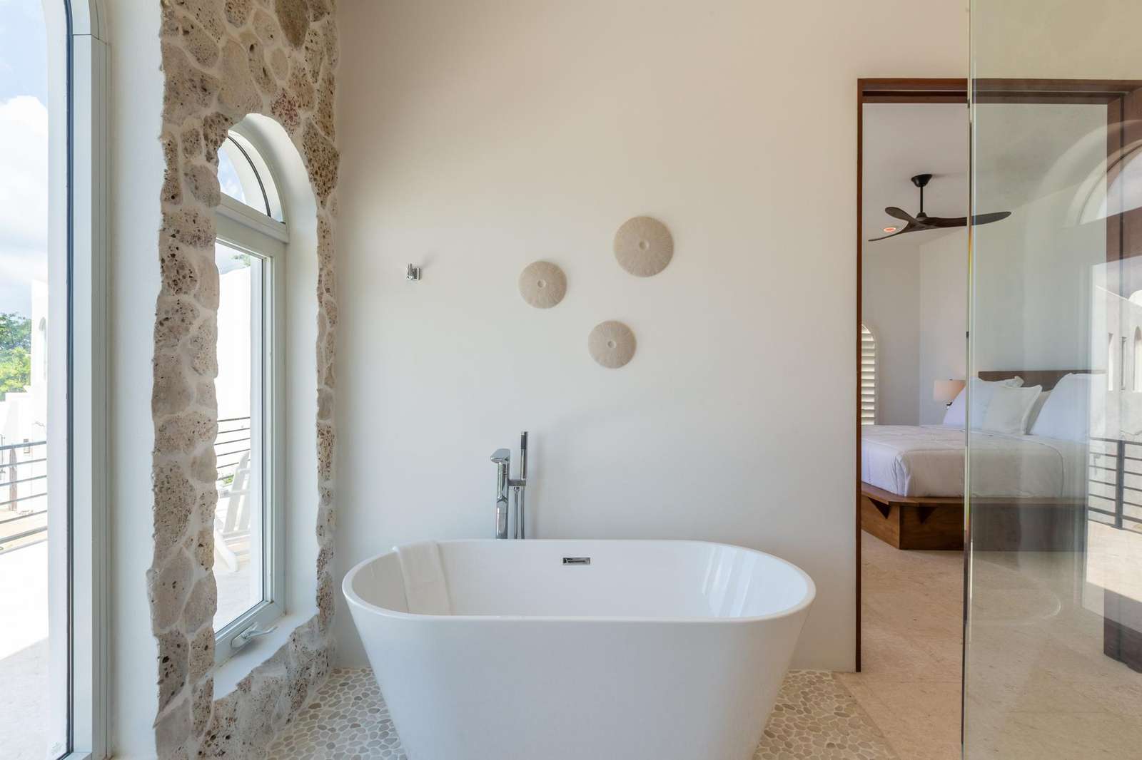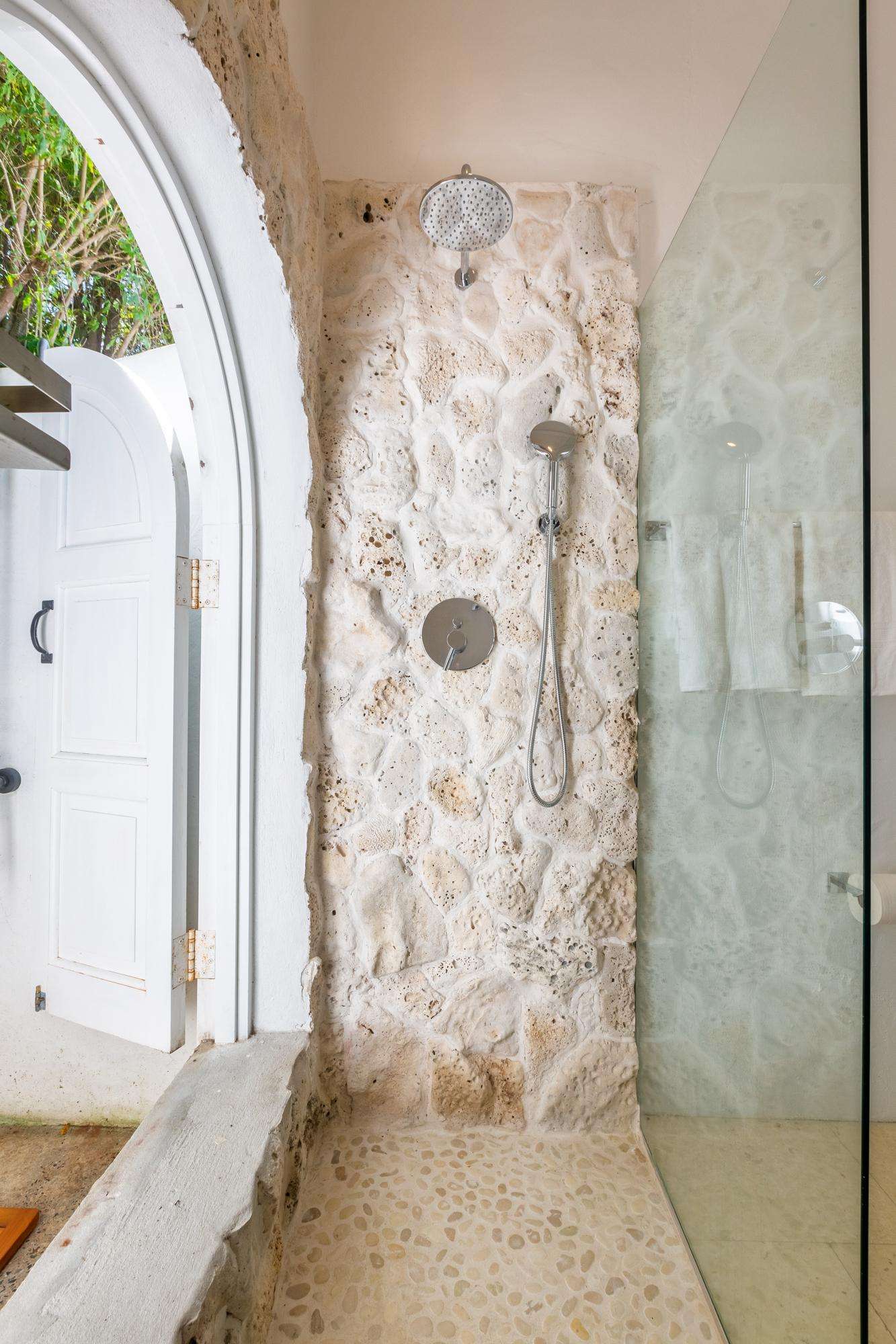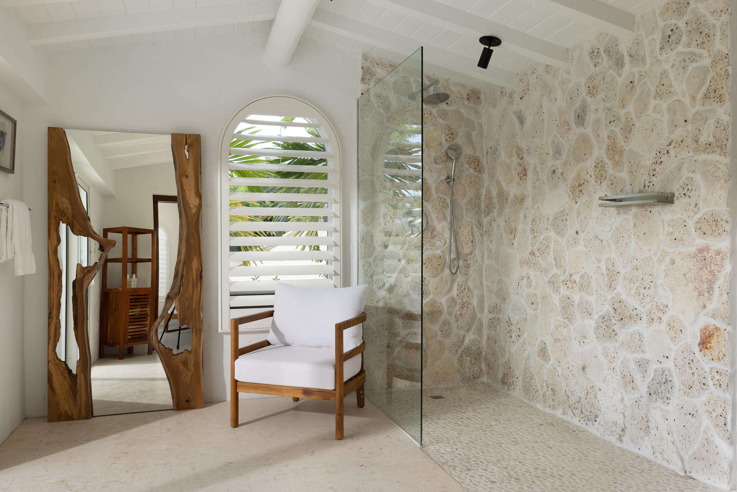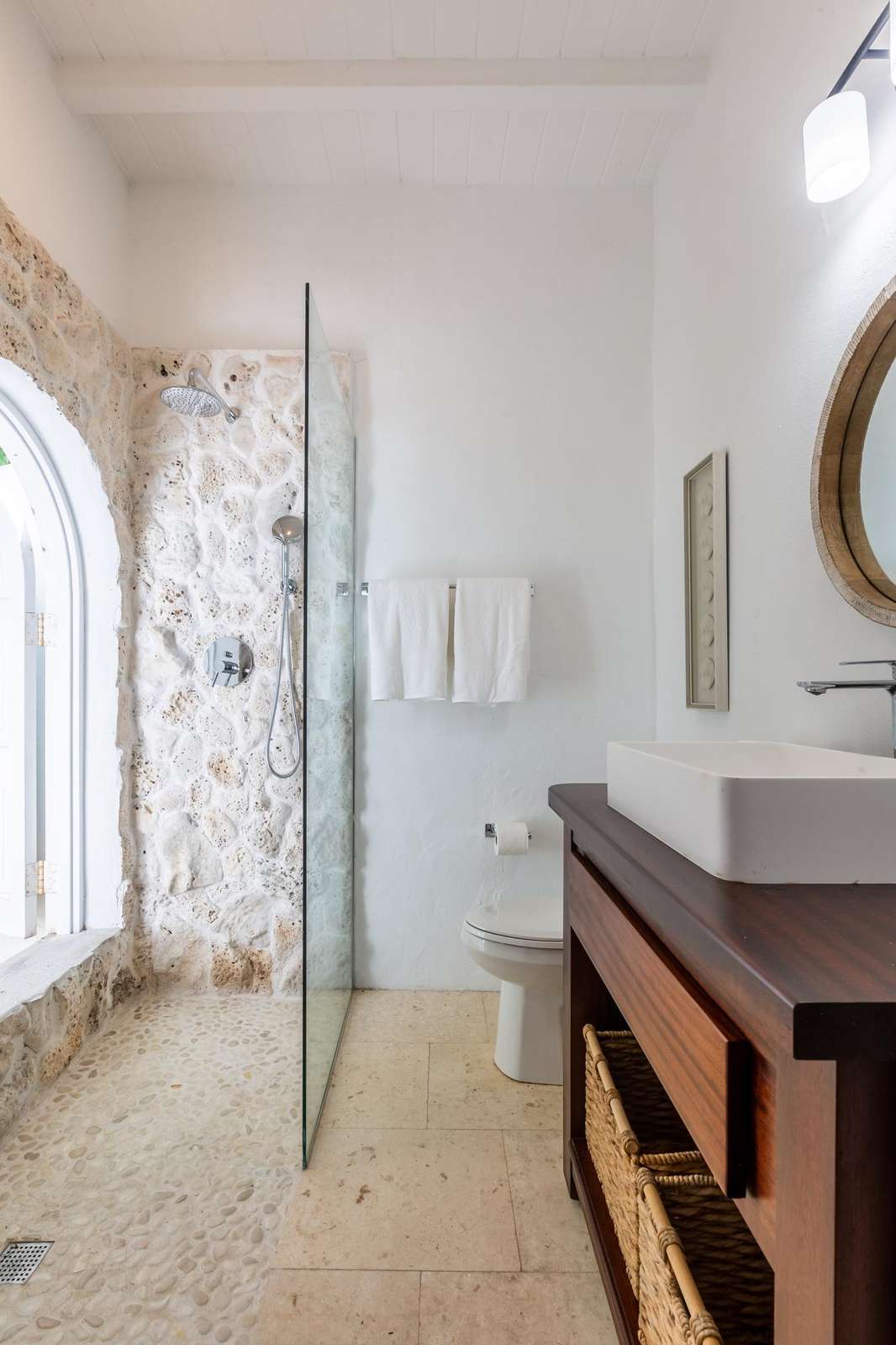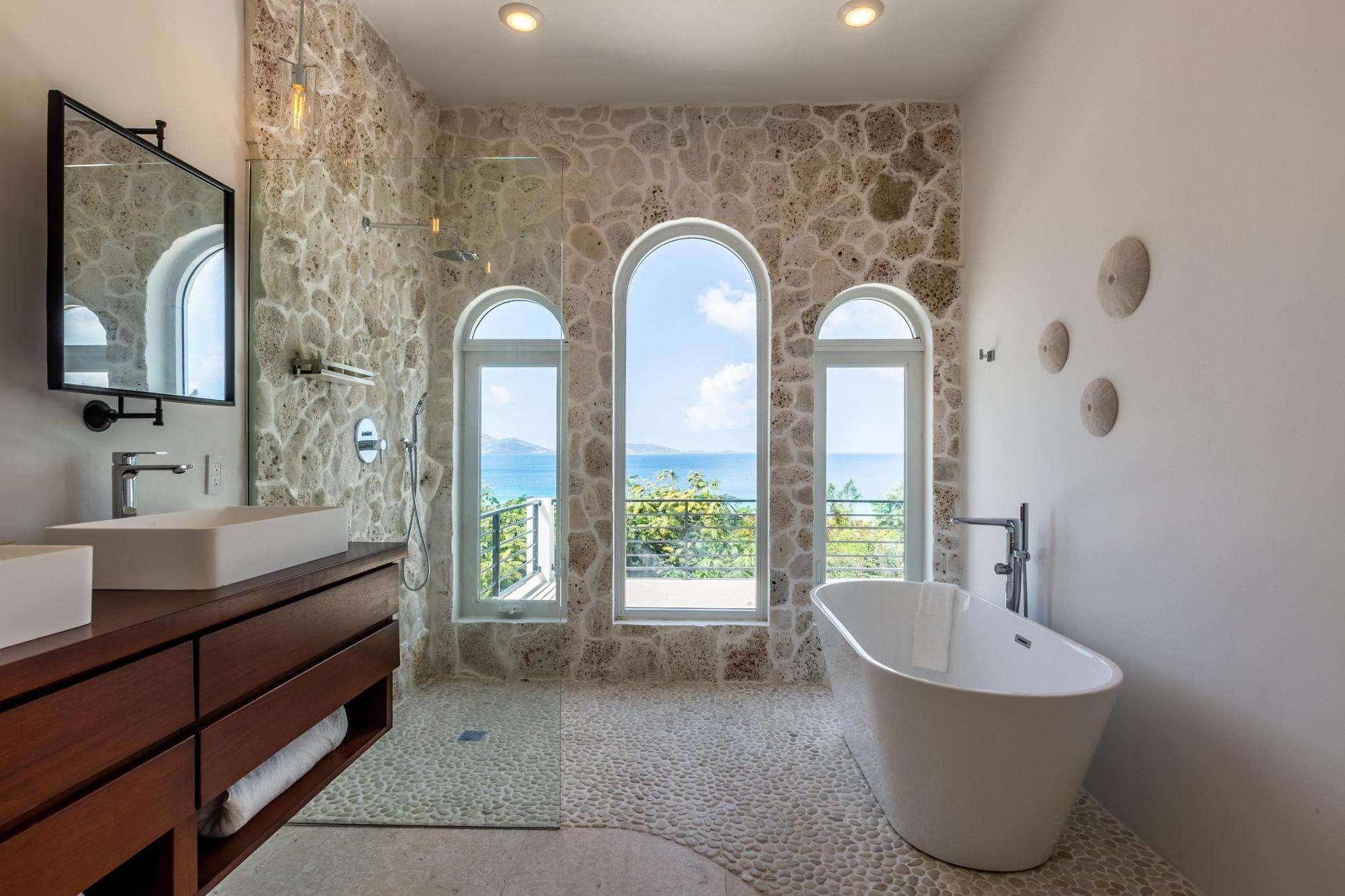 4) The Primary Suite is just spectacular. Another private paradise, it’s located in the 3rd bedroom a short stroll away from the main house. A very generous size, you’ll find the same luxurious amenities as the other bedrooms (King sized bed, AC , ceiling fans, large walk in closet, 65” flat-screen SmartTV) and a huge private porch with stunning ocean views – an idyllic spot for a morning coffee made with the drip-style coffee maker in your room. The ensuite bathroom is another work of art, with grand stone walk-in shower, bathtub, double vanity all of which is lit up by the soft light coming through a huge arched window framing the azure vistas.