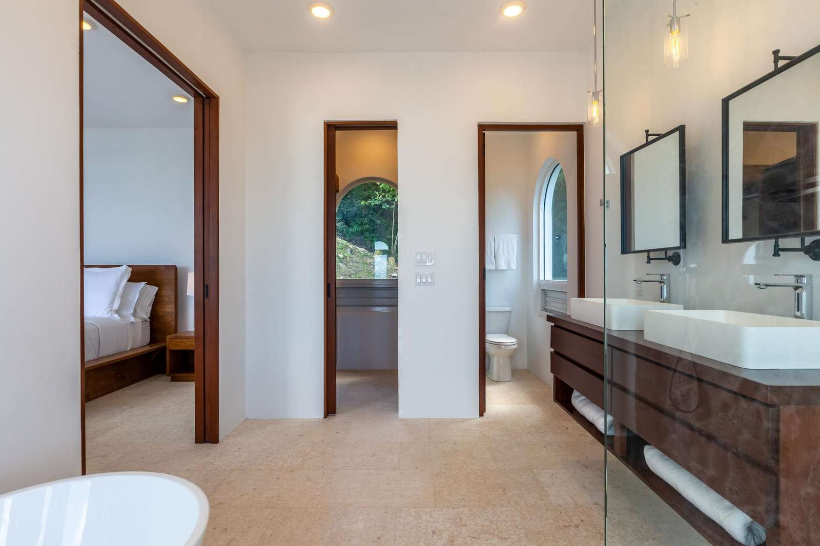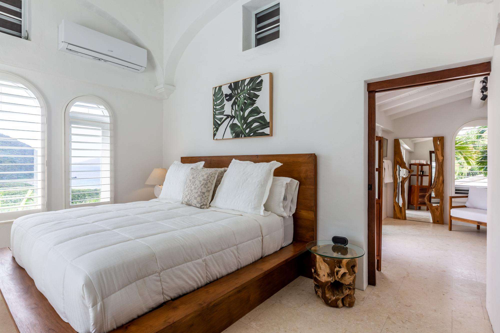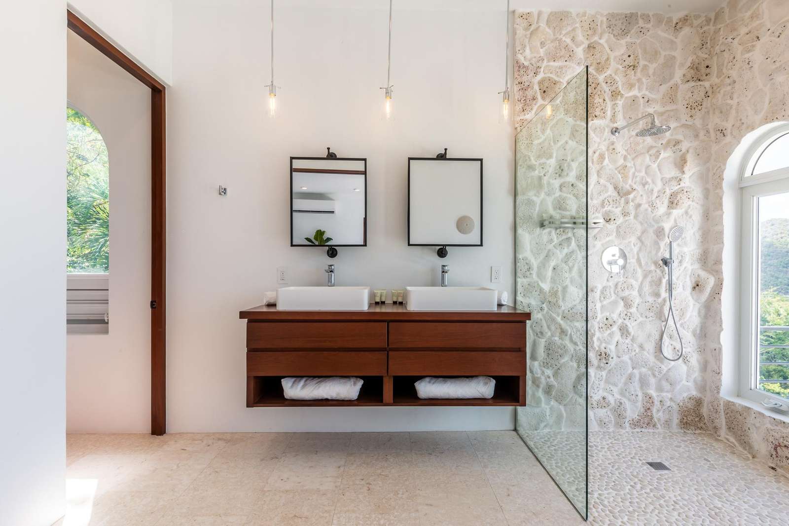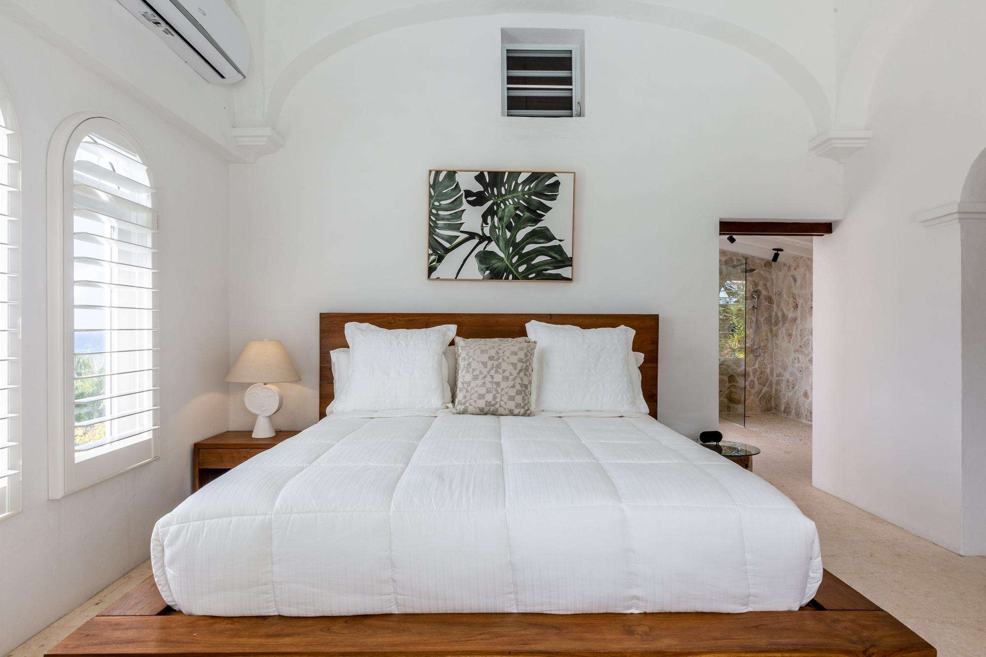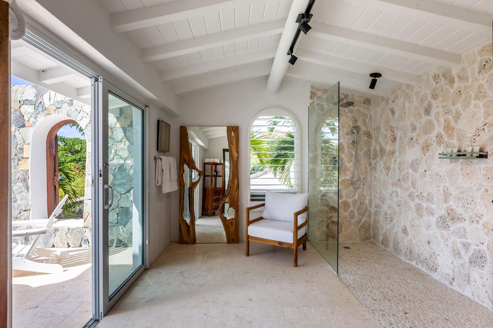 4) The Primary Suite is just spectacular. Another private paradise, it’s located in the 3rd bedroom a short stroll away from the main house. A very generous size, you’ll find the same luxurious amenities as the other bedrooms (King sized bed, AC , ceiling fans, large walk in closet, 65” flat-screen SmartTV) and a huge private porch with stunning ocean views – an idyllic spot for a morning coffee made with the drip-style coffee maker in your room. The ensuite bathroom is another work of art, with grand stone walk-in shower, bathtub, double vanity all of which is lit up by the soft light coming through a huge arched window framing the azure vistas.