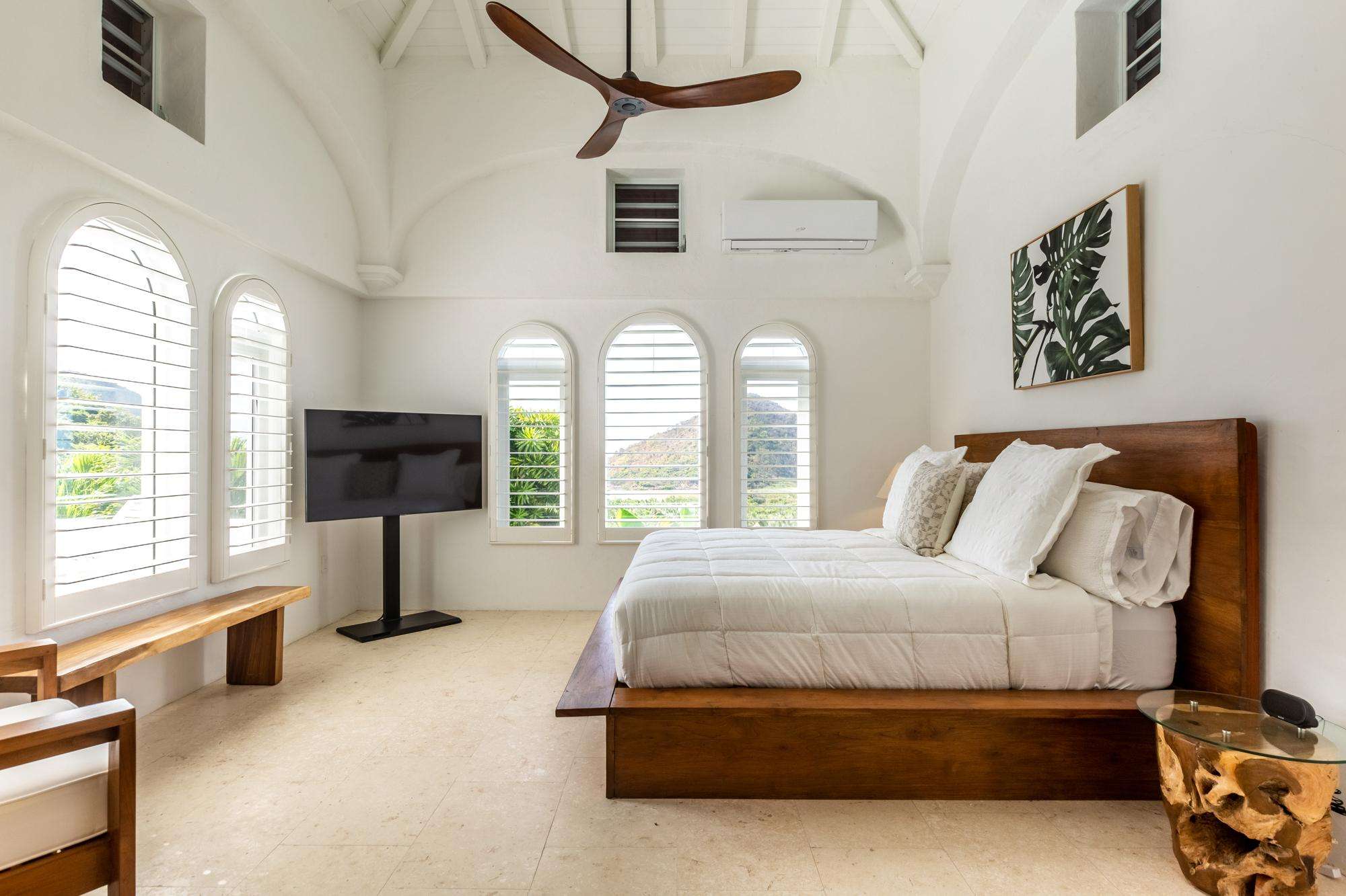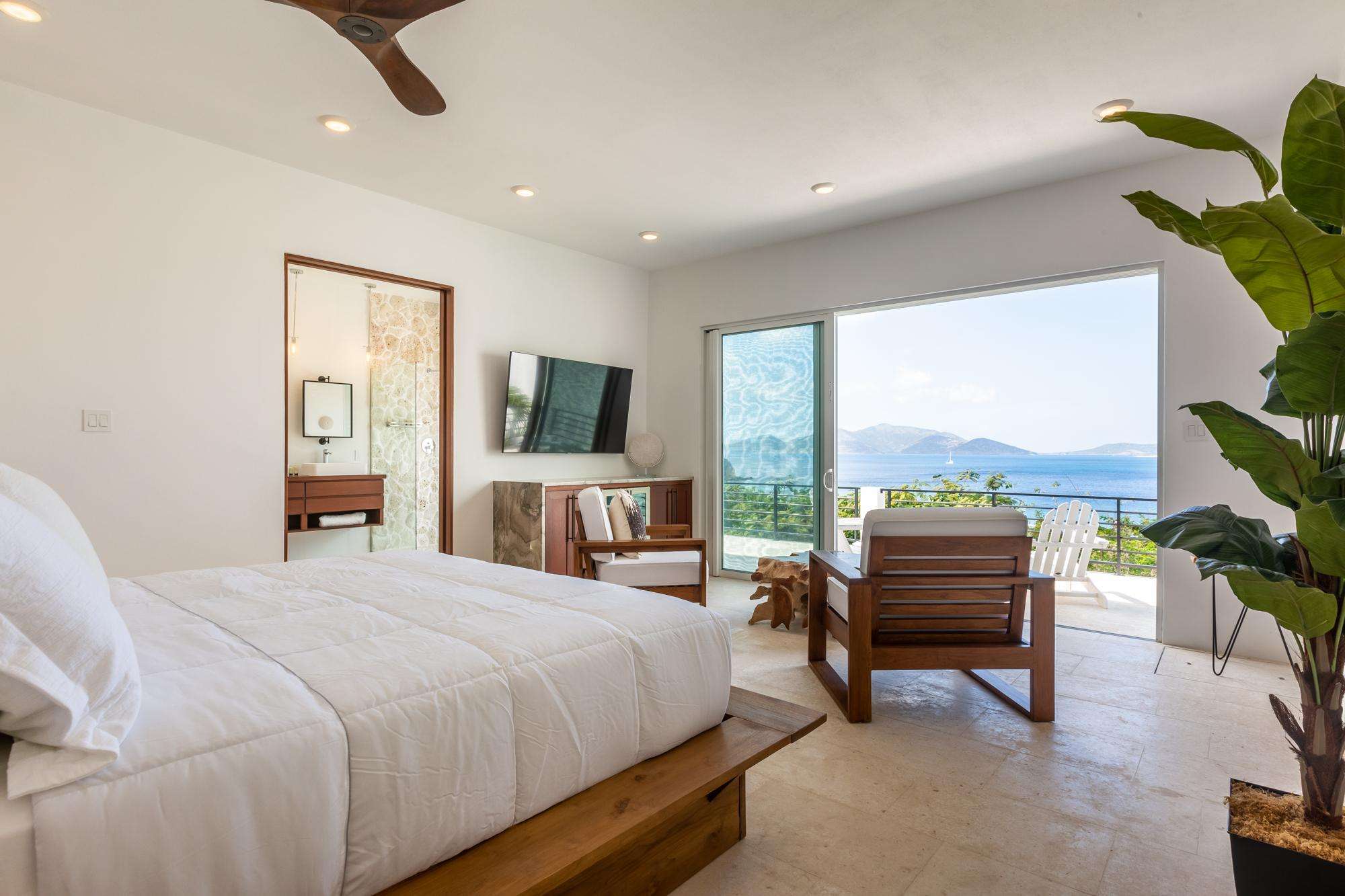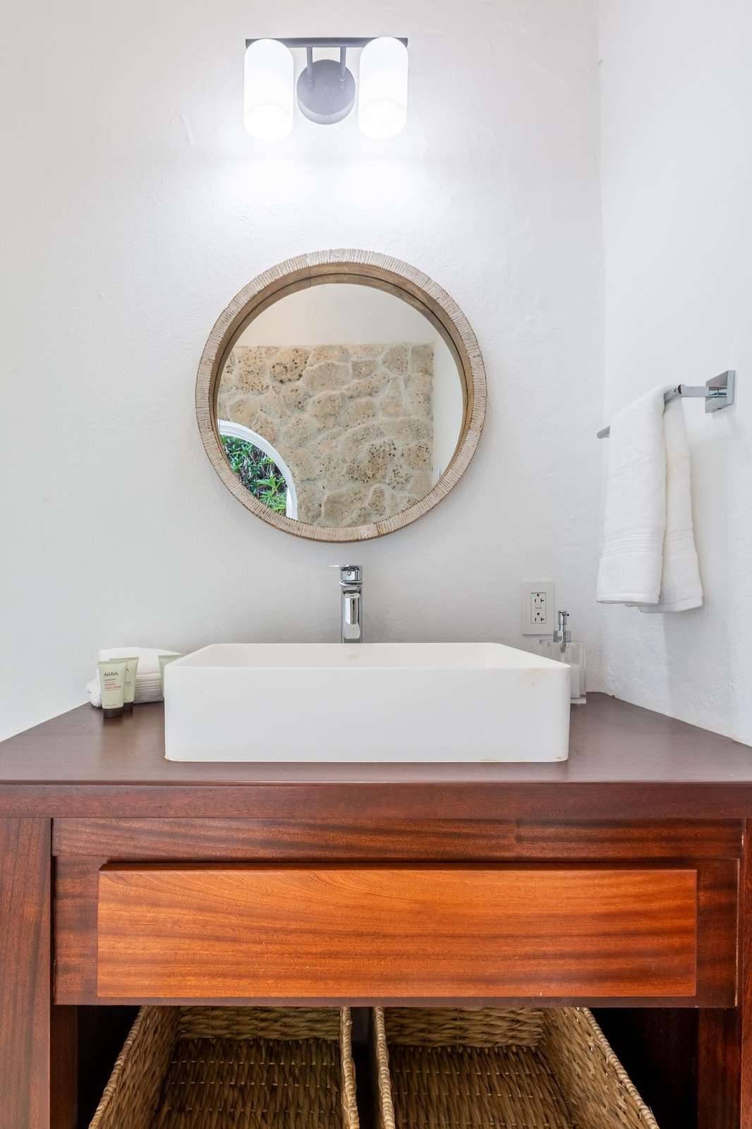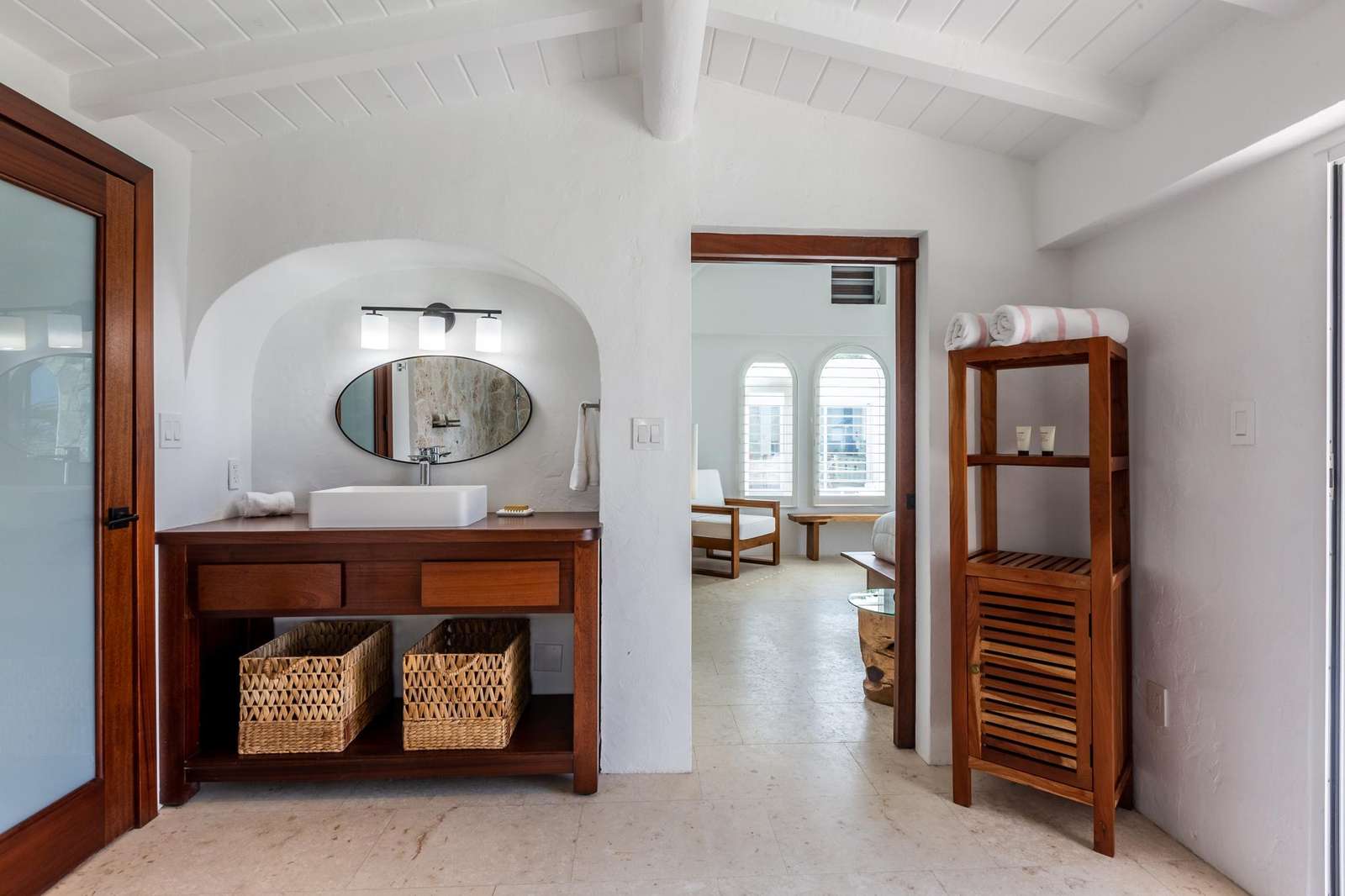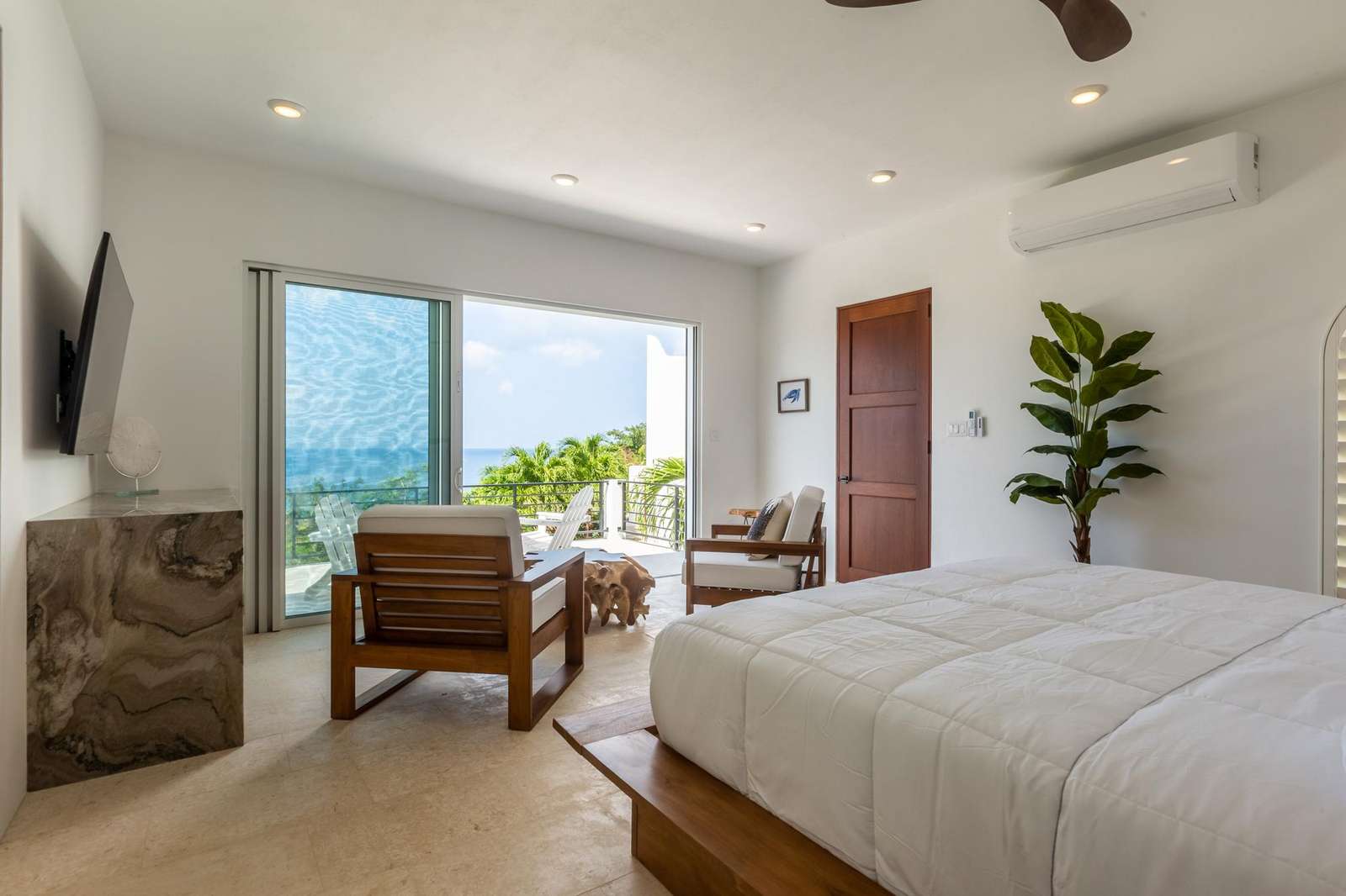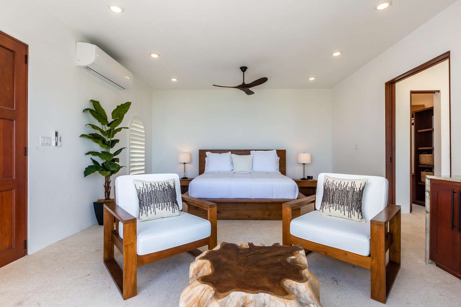 4) The Primary Suite is just spectacular. Another private paradise, it’s located in the 3rd bedroom a short stroll away from the main house. A very generous size, you’ll find the same luxurious amenities as the other bedrooms (King sized bed, AC , ceiling fans, large walk in closet, 65” flat-screen SmartTV) and a huge private porch with stunning ocean views – an idyllic spot for a morning coffee made with the drip-style coffee maker in your room. The ensuite bathroom is another work of art, with grand stone walk-in shower, bathtub, double vanity all of which is lit up by the soft light coming through a huge arched window framing the azure vistas.